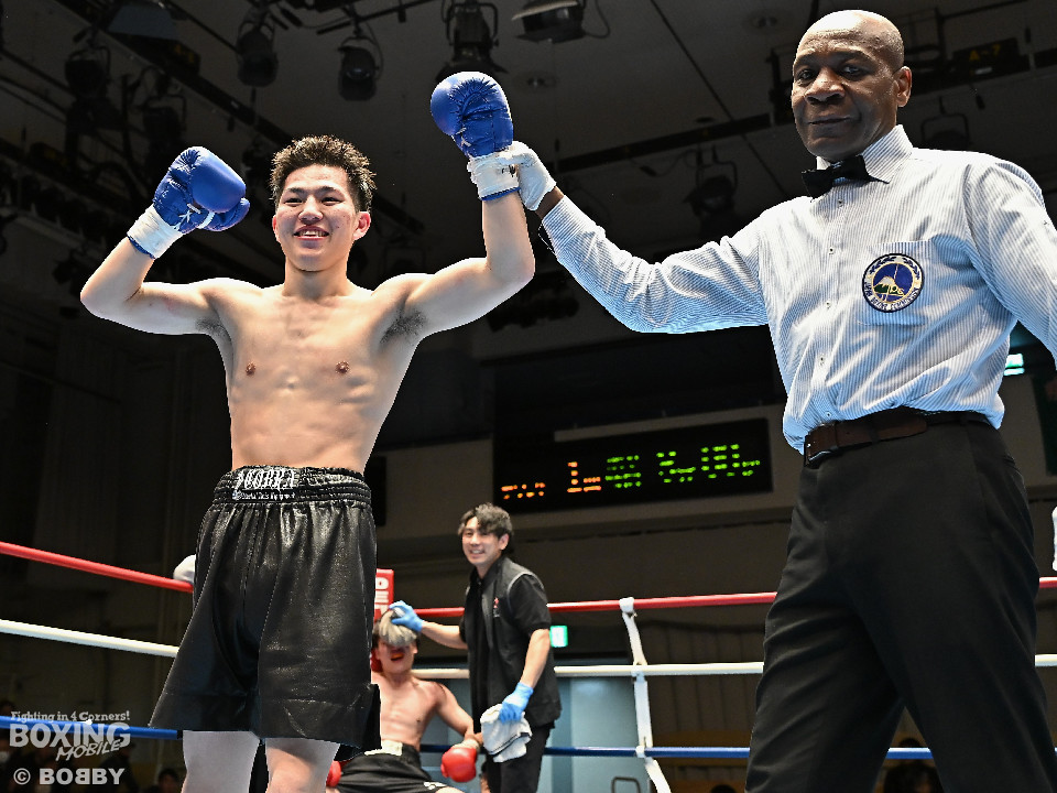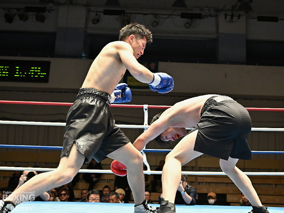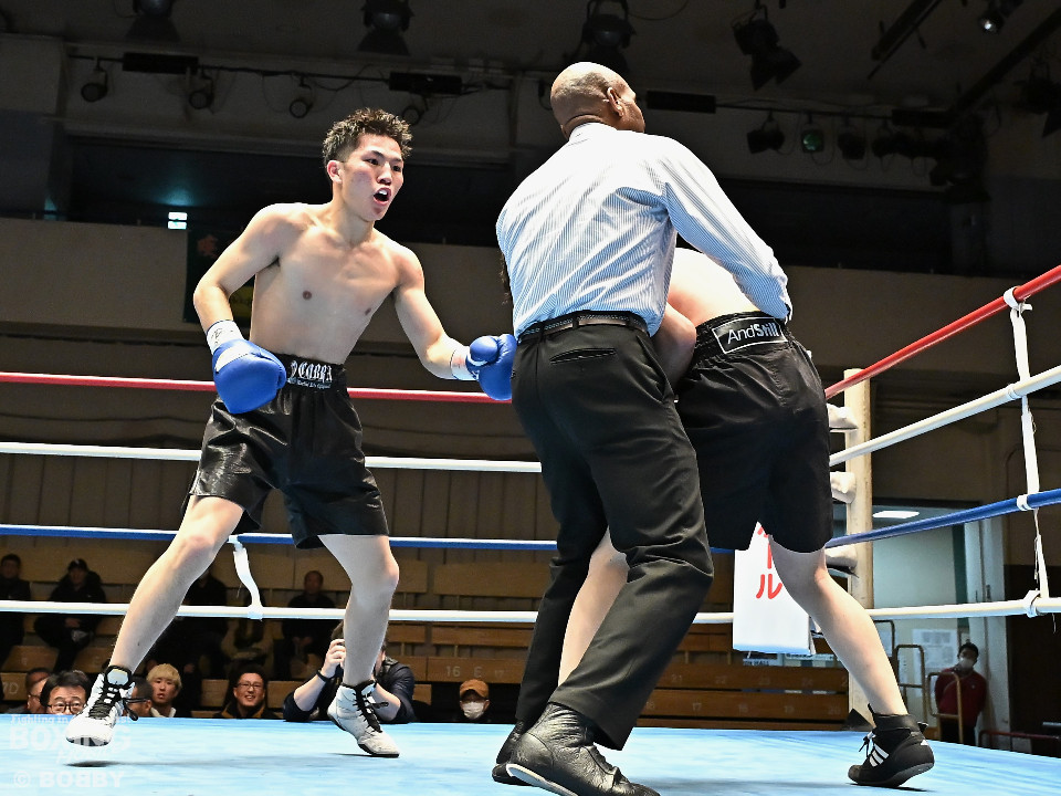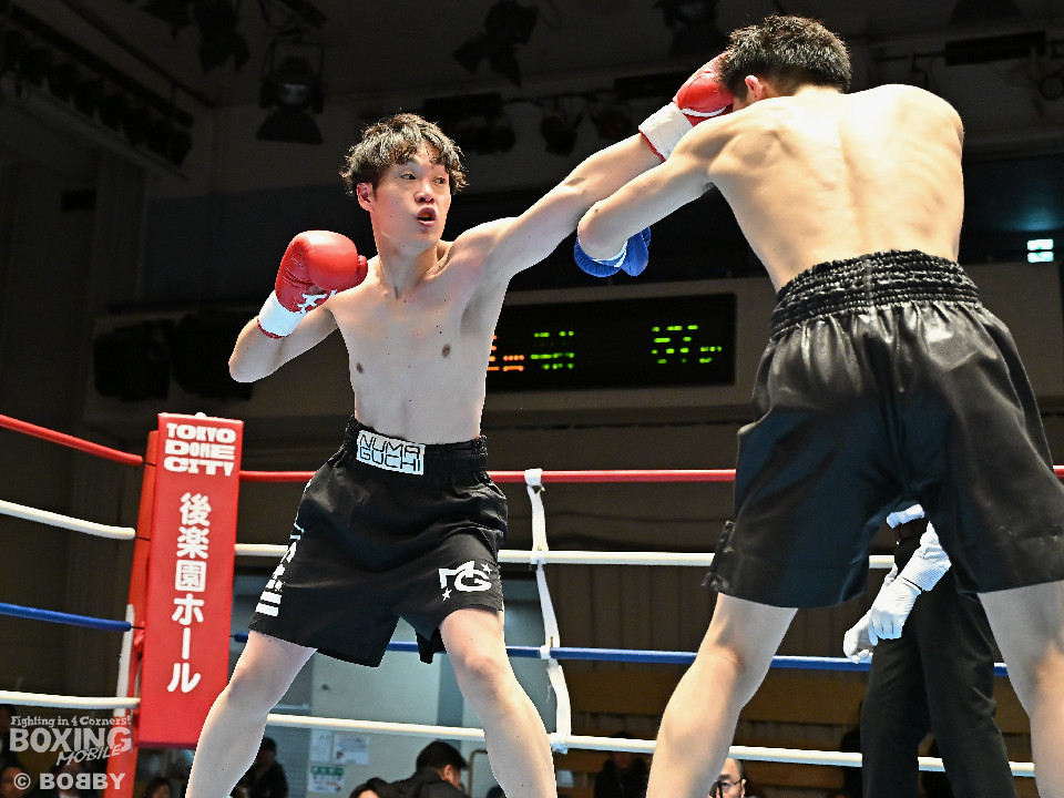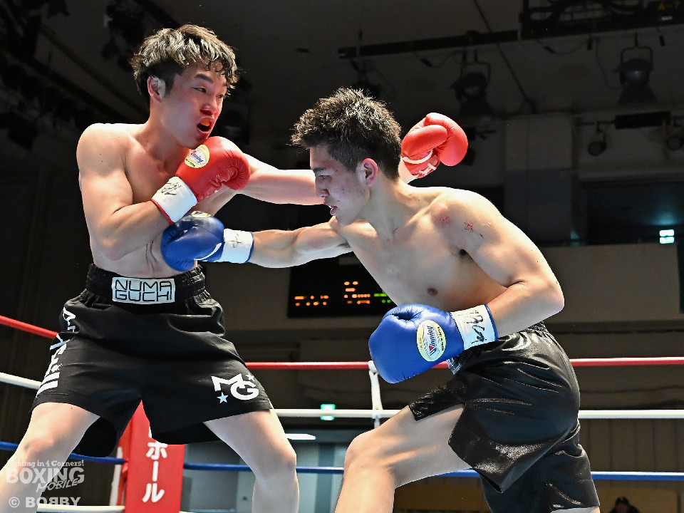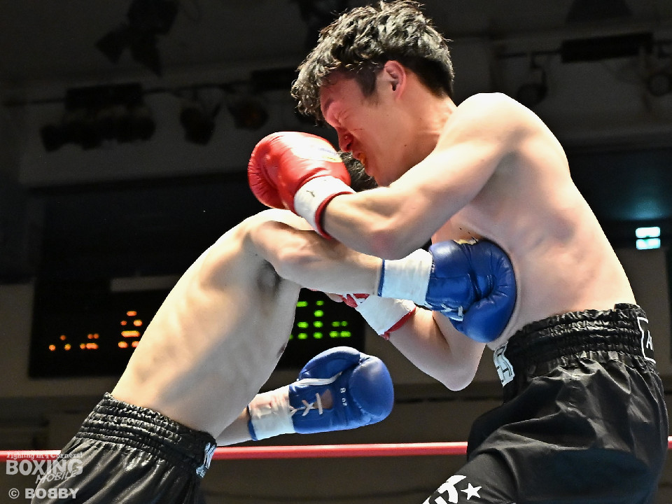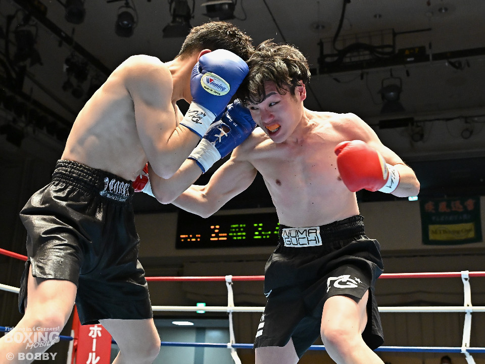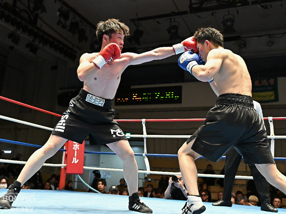 試合:右フックをブン!と振り回す沼口に対し、竹内はガードで対応するとジャブから右ボディストレートにつなげてペースを掌握。2回、竹内は右ボディ、右アッパーを好打。被弾した沼口だが、お構いなしとばかりに右フックを全振り。3回、竹内はこれでもかと右ボディストレートを突き刺すと動きが止まった沼口を見てレフェリーが試合をストップした。