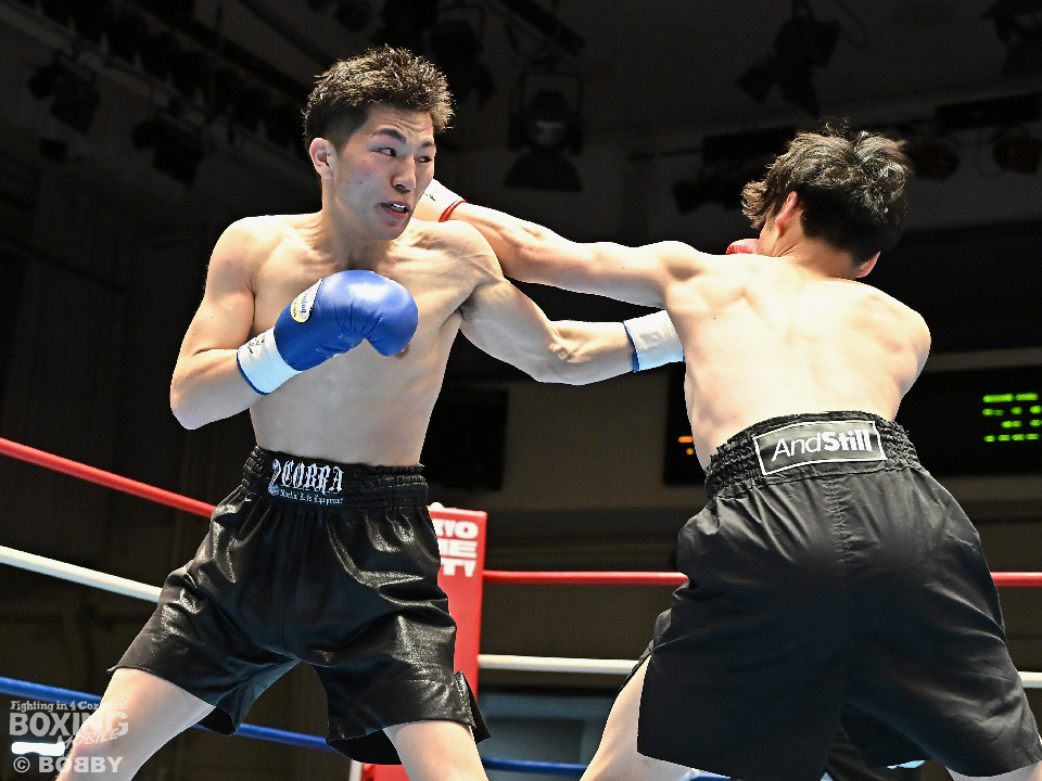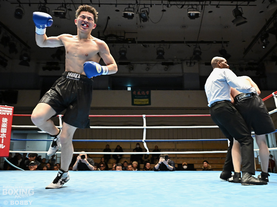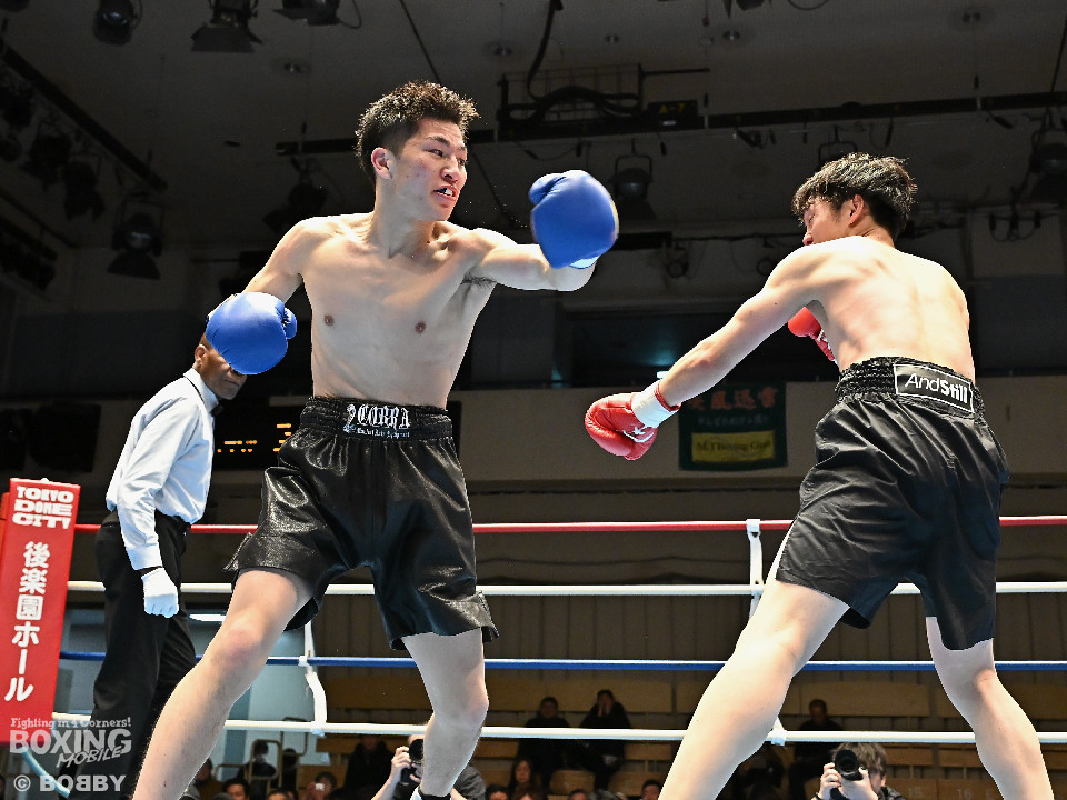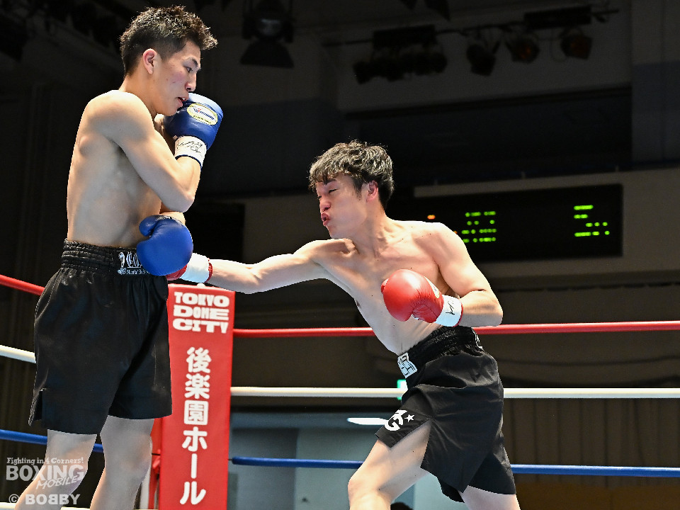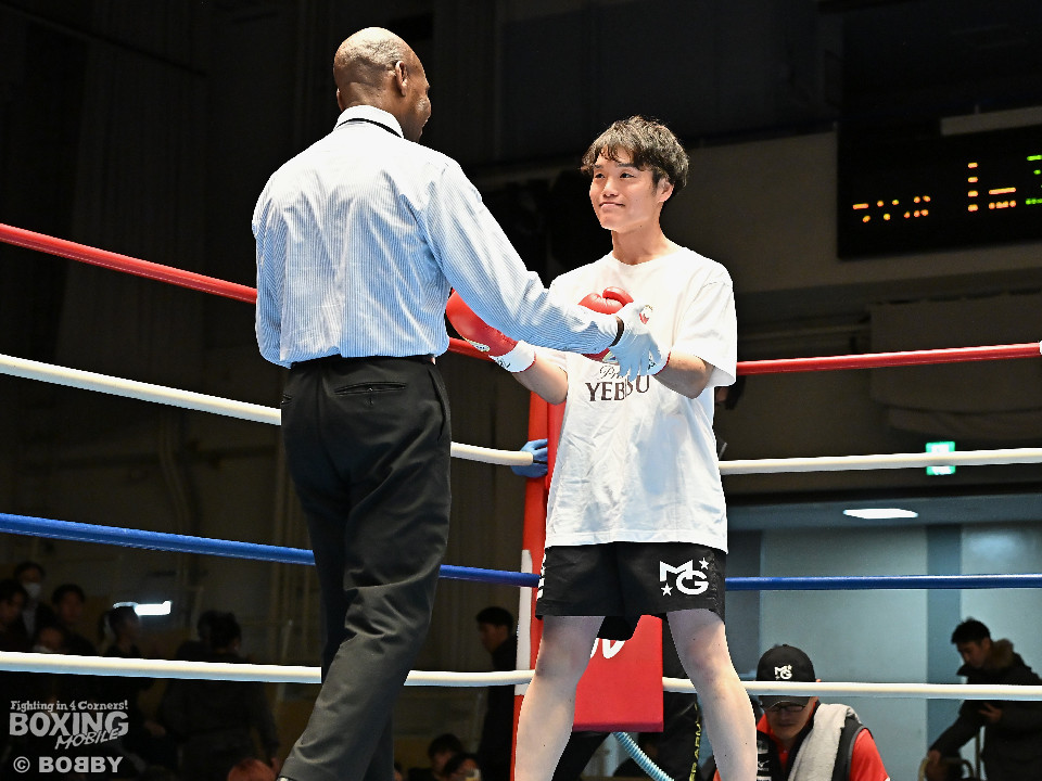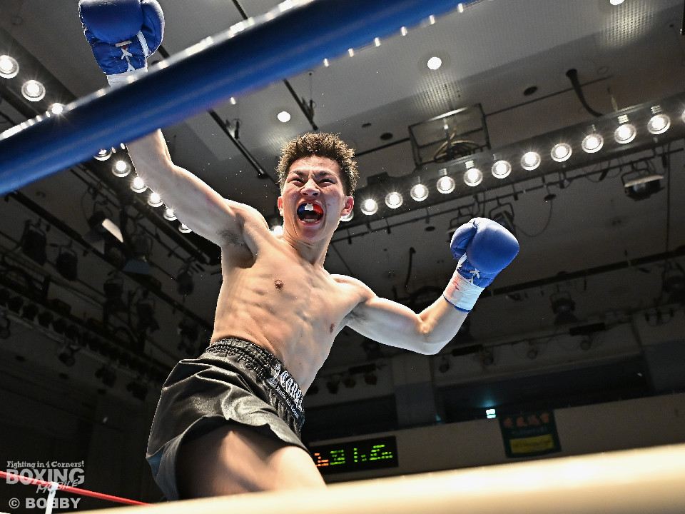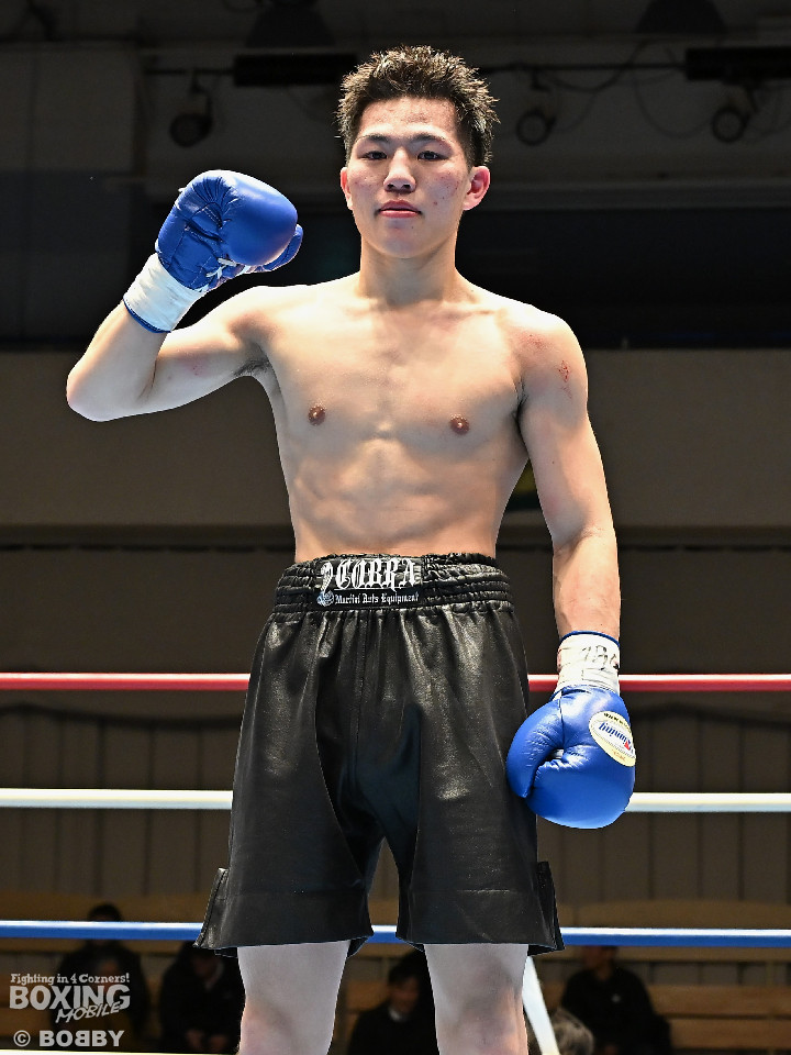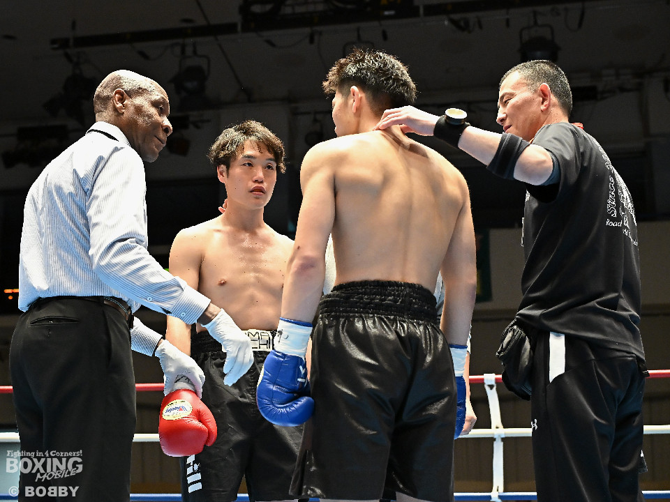 試合:右フックをブン!と振り回す沼口に対し、竹内はガードで対応するとジャブから右ボディストレートにつなげてペースを掌握。2回、竹内は右ボディ、右アッパーを好打。被弾した沼口だが、お構いなしとばかりに右フックを全振り。3回、竹内はこれでもかと右ボディストレートを突き刺すと動きが止まった沼口を見てレフェリーが試合をストップした。