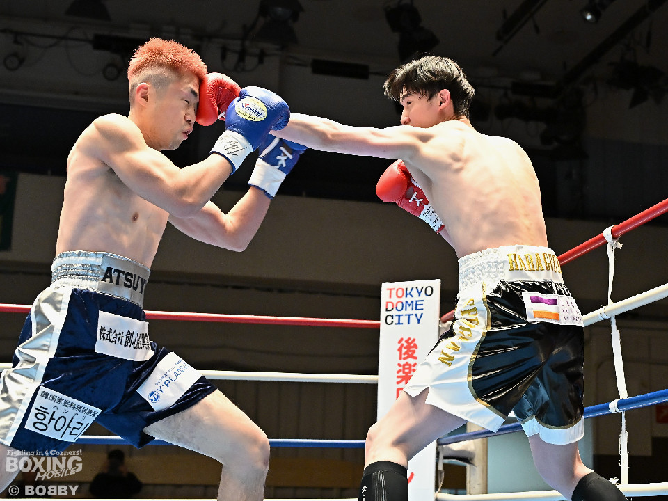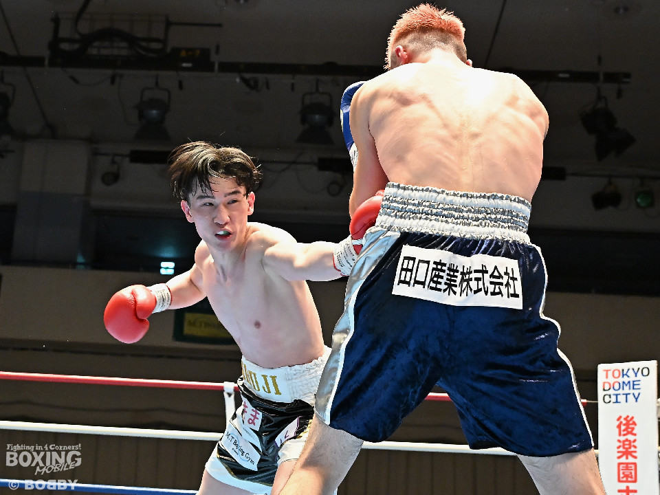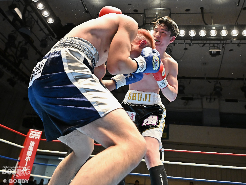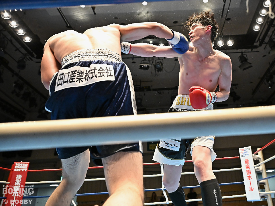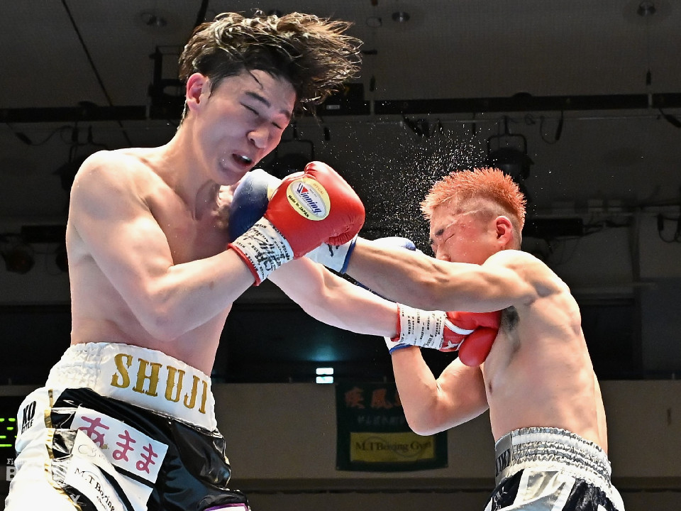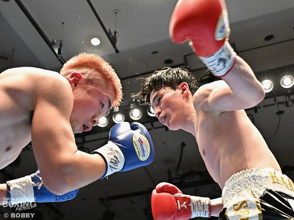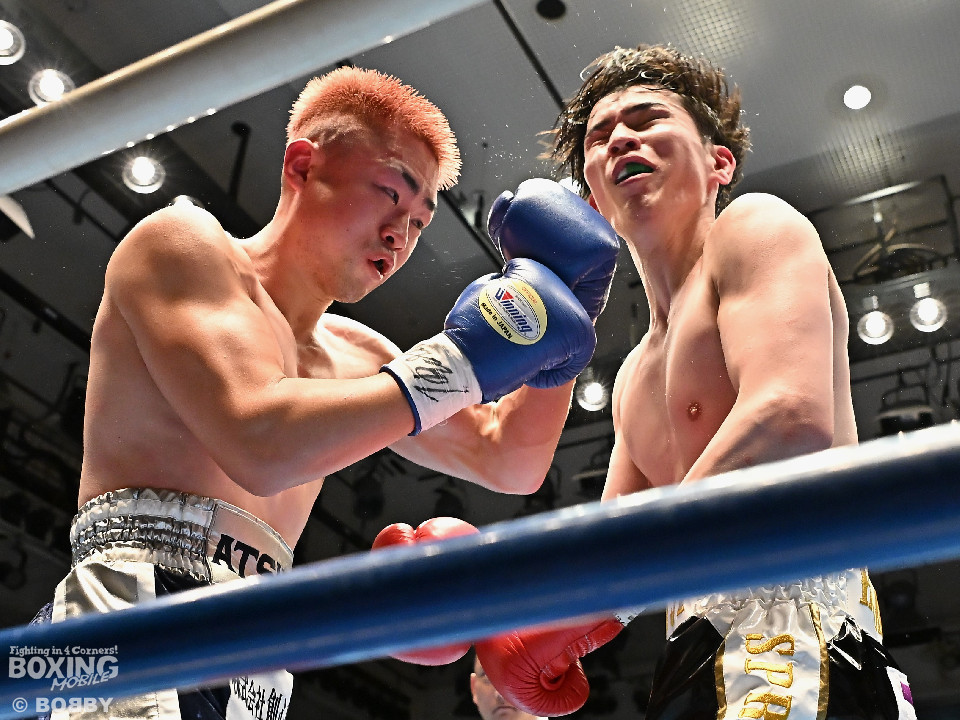 試合:佐藤がプレスをかけて左ボディをコツコツと集めて先制。2回、原口は左フックを叩きつけるが佐藤のしつこさは変わらず。3回、原口はワンツーで腰を沈めさせると連打で攻勢。一転、ピンチに陥った佐藤は必死に返した。4回、佐藤は右ショートでグラつかせると細かくまとめて攻勢。しかし、ここを踏ん張った原口はワンツーをねじ込み反撃。攻守が目まぐるしく変わった。5回、原口はワンツーで効かせると手数をまとめて攻勢をアピール。続く回も原口はジャブでリズムを作るとワンツーを再三ヒット。7回、スタミナの消耗が激しい中、有効打で上回ったのは原口。8回、劣勢の佐藤は手数を増やして積極性をアピールした。2~6ポイント差をつけた原口が連敗脱出に成功した。