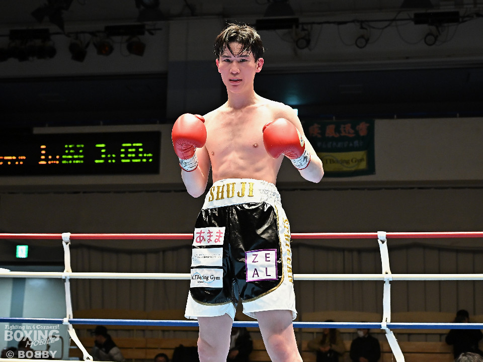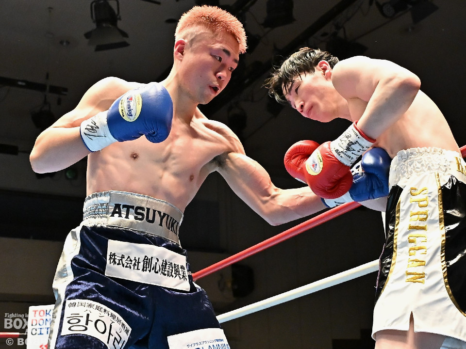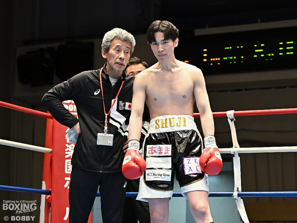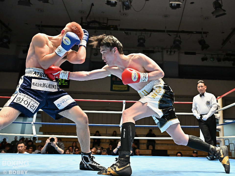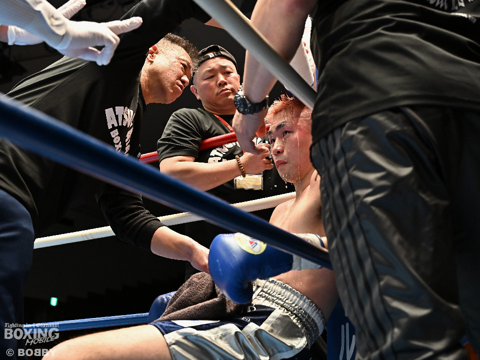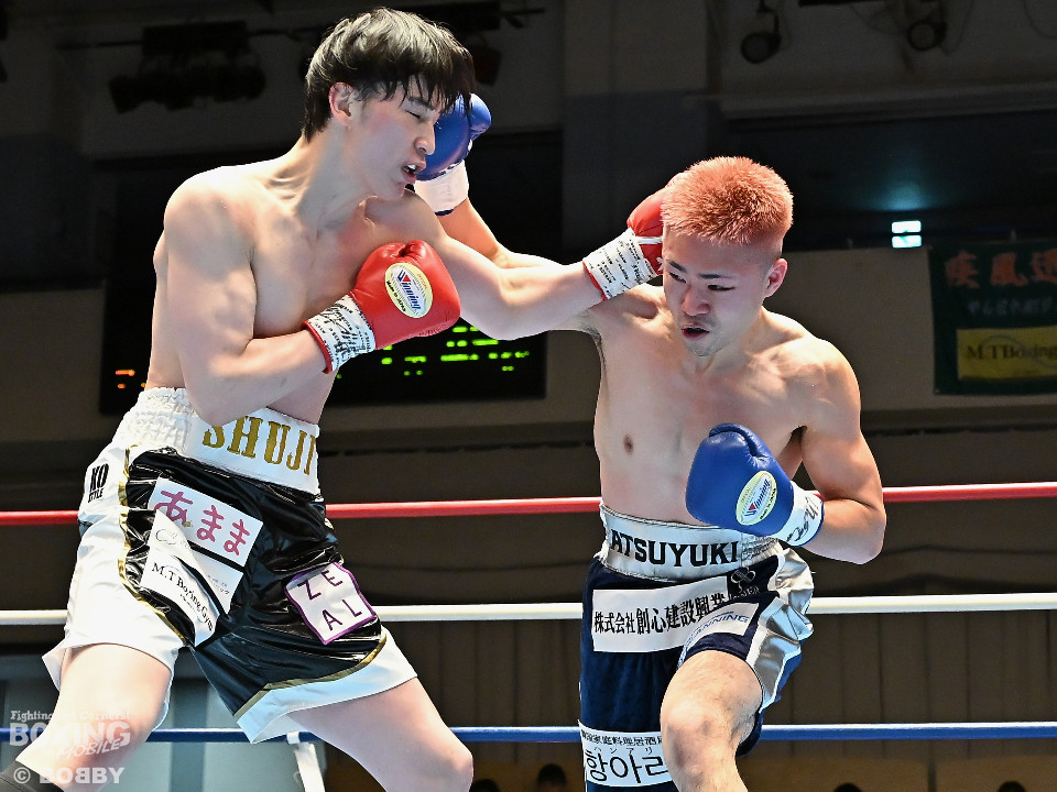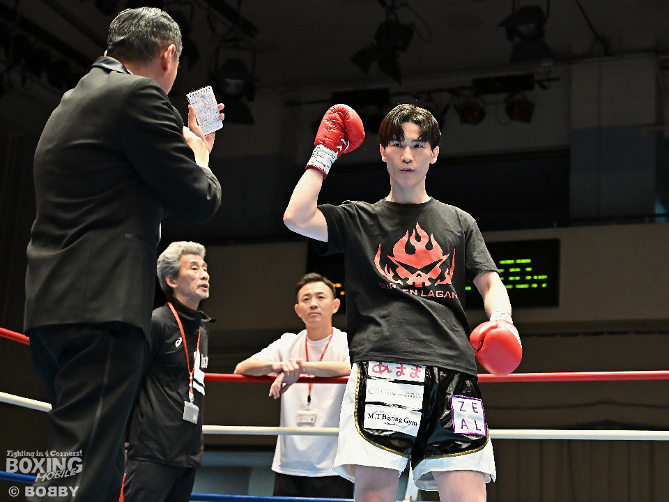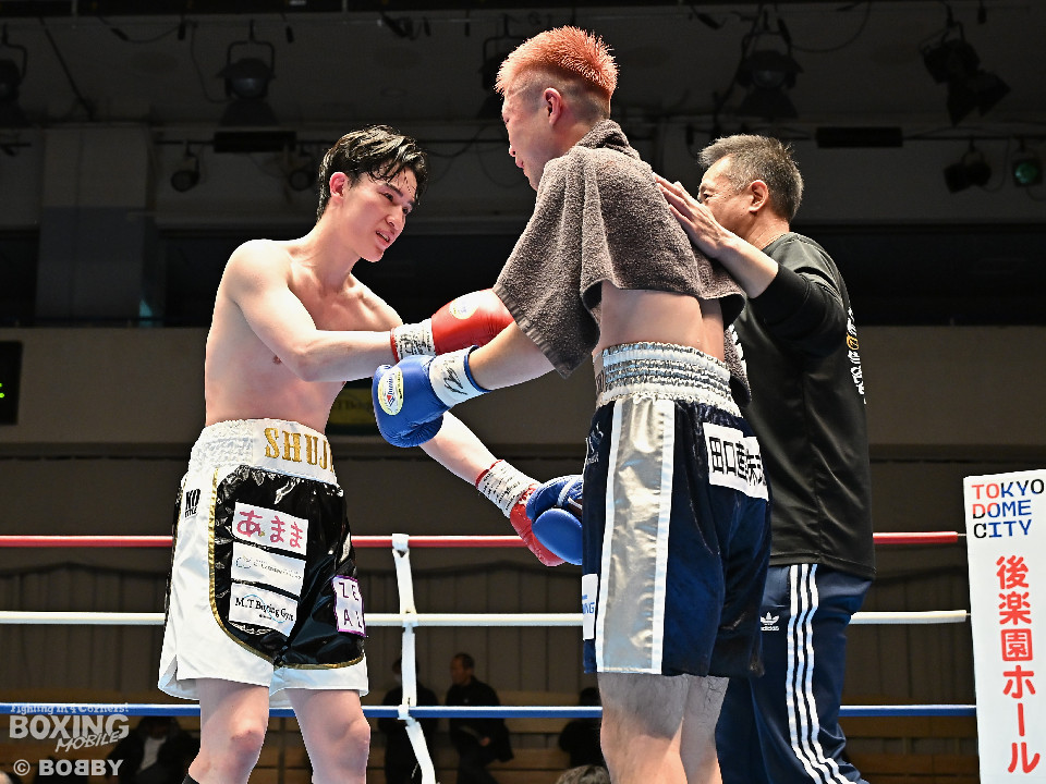 試合:佐藤がプレスをかけて左ボディをコツコツと集めて先制。2回、原口は左フックを叩きつけるが佐藤のしつこさは変わらず。3回、原口はワンツーで腰を沈めさせると連打で攻勢。一転、ピンチに陥った佐藤は必死に返した。4回、佐藤は右ショートでグラつかせると細かくまとめて攻勢。しかし、ここを踏ん張った原口はワンツーをねじ込み反撃。攻守が目まぐるしく変わった。5回、原口はワンツーで効かせると手数をまとめて攻勢をアピール。続く回も原口はジャブでリズムを作るとワンツーを再三ヒット。7回、スタミナの消耗が激しい中、有効打で上回ったのは原口。8回、劣勢の佐藤は手数を増やして積極性をアピールした。2~6ポイント差をつけた原口が連敗脱出に成功した。