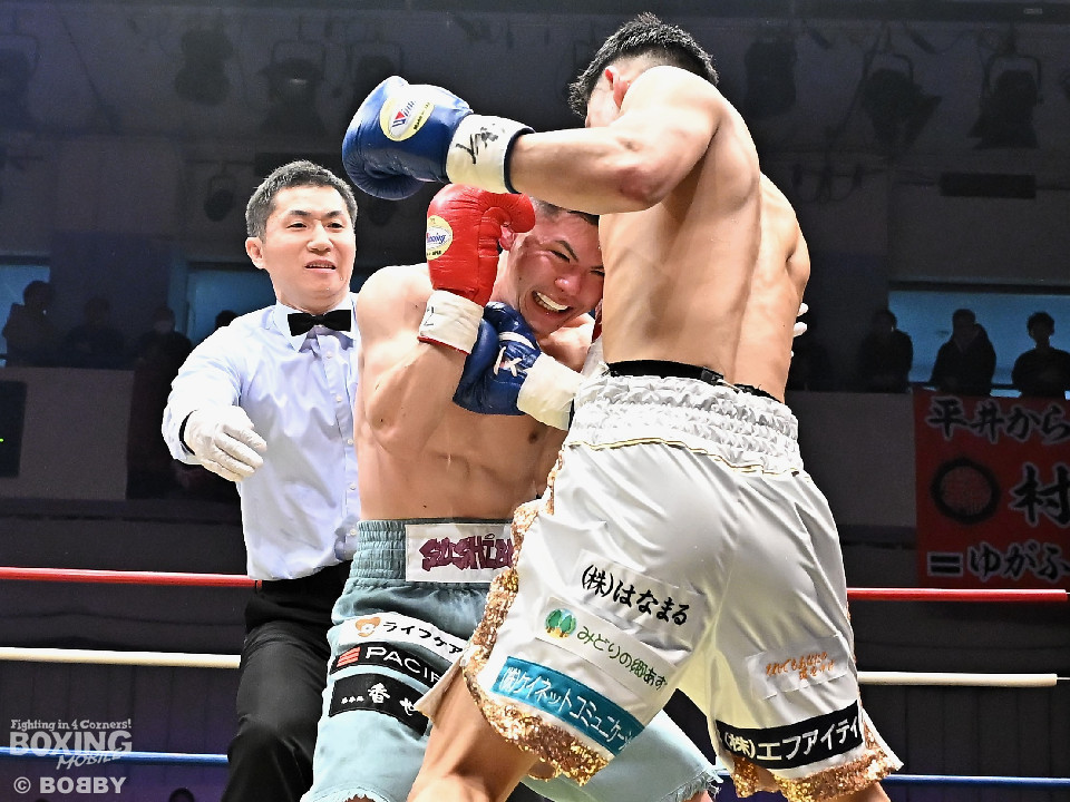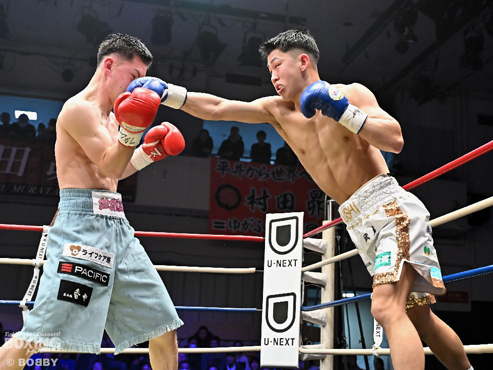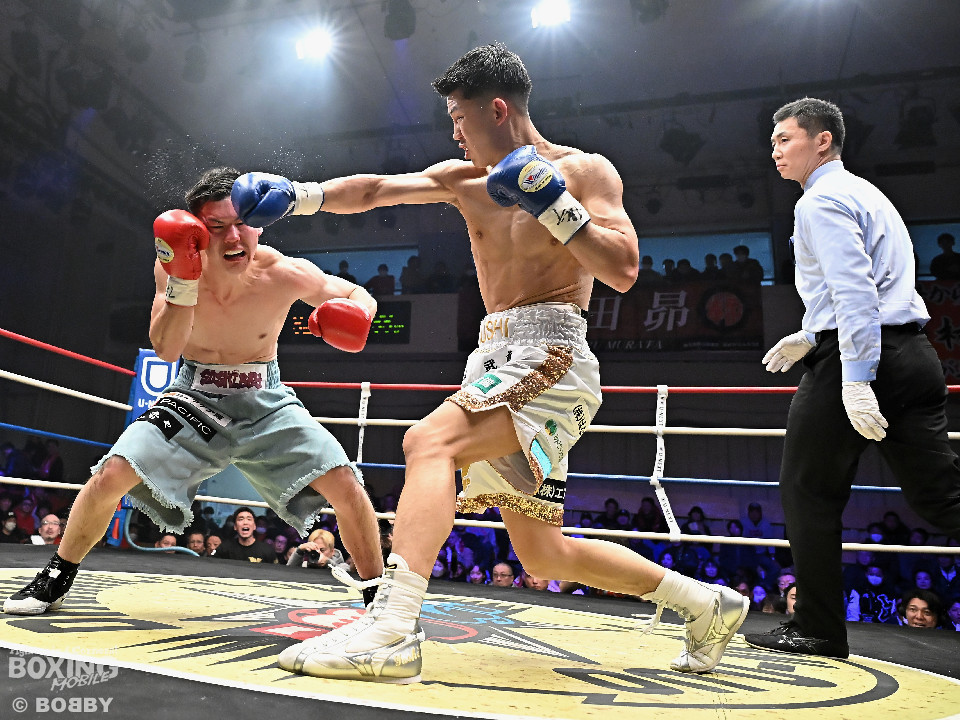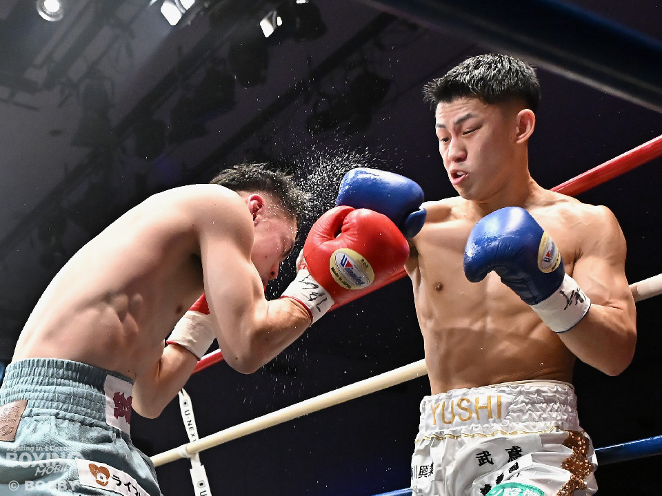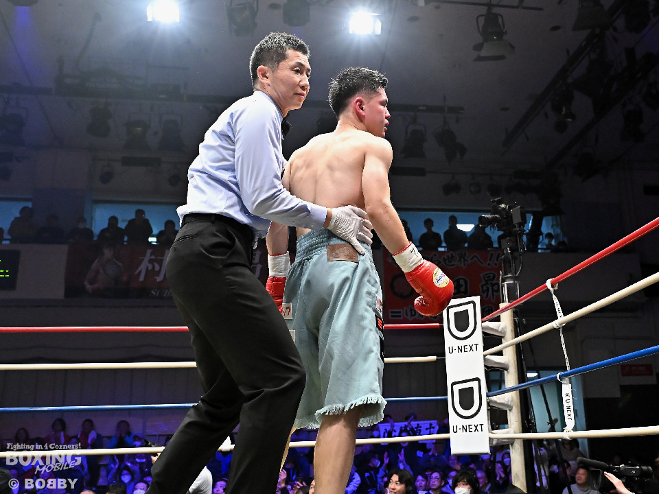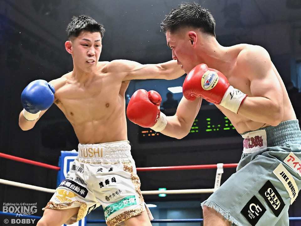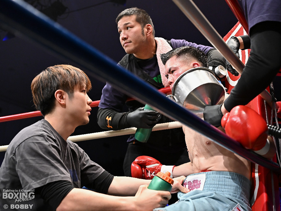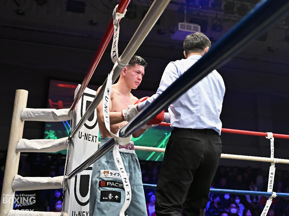 試合:日本バンタム級11位の西屋にノーランカーの山口が挑んだ。山口が長いリーチを活かしジャブでリズムを構築すると右ストレートでダウンを奪う絶好のスタート。2回、山口はポジションを上手くずらしながら打ち合いを避けると右アッパーを好打。3回、守勢を強いられた西屋は距離を止めたが、山口は右カウンターで2度目のダウンをゲット。再開後、攻撃の手を緩めず連打でフィニッシュした。山口がランカーを撃破する殊勲の勝利を挙げた。