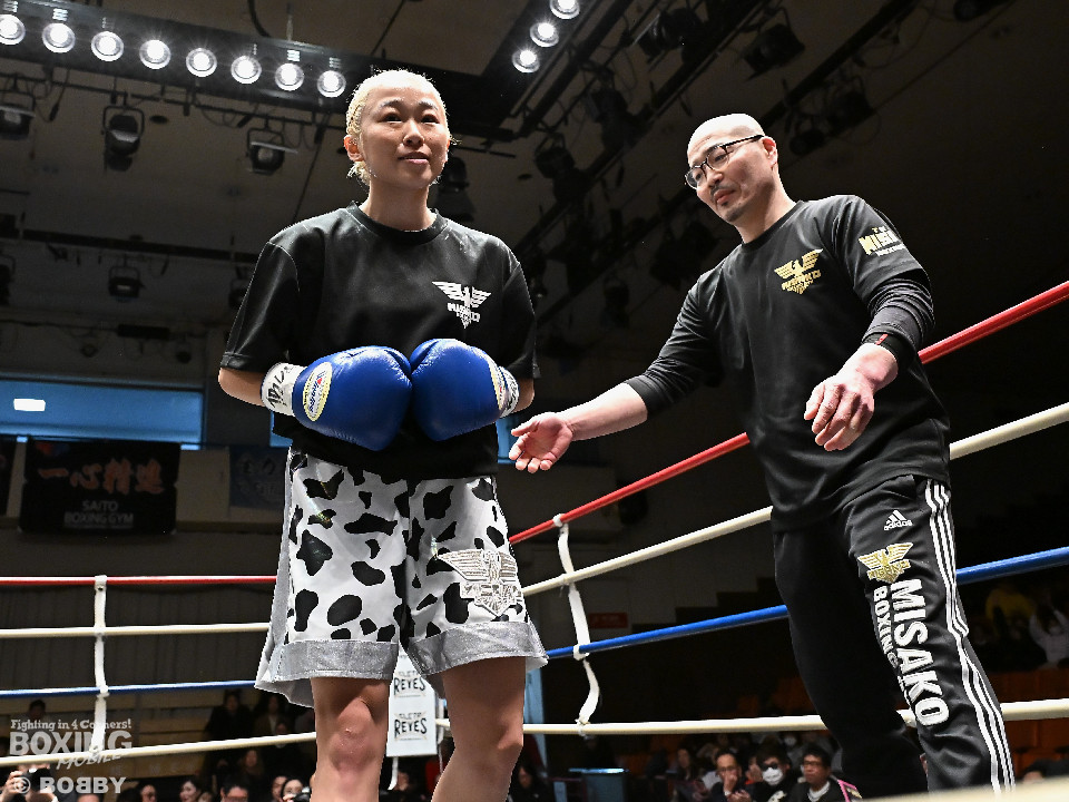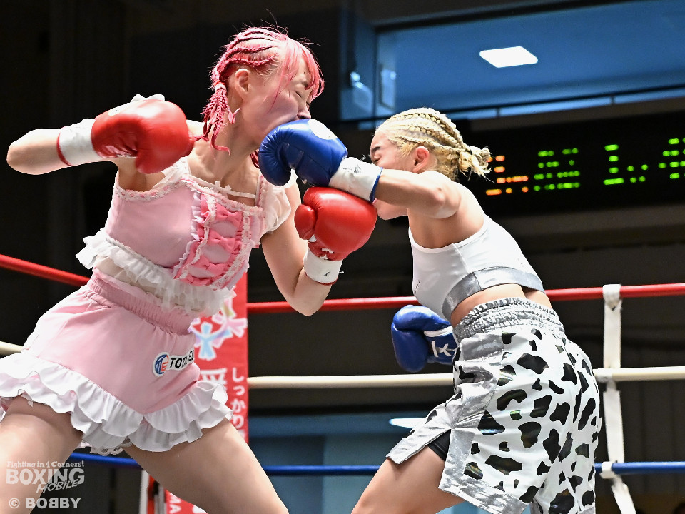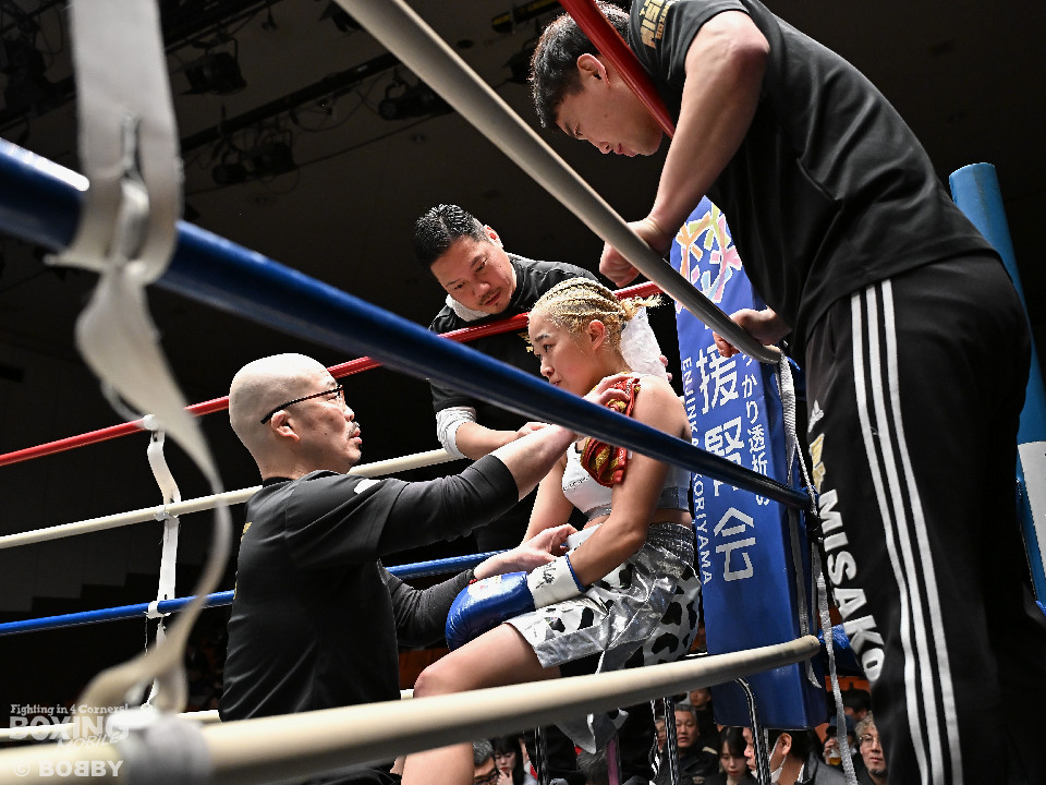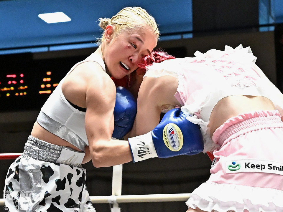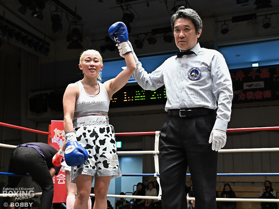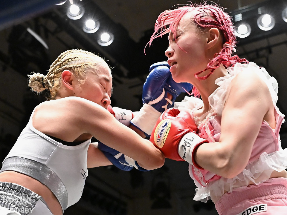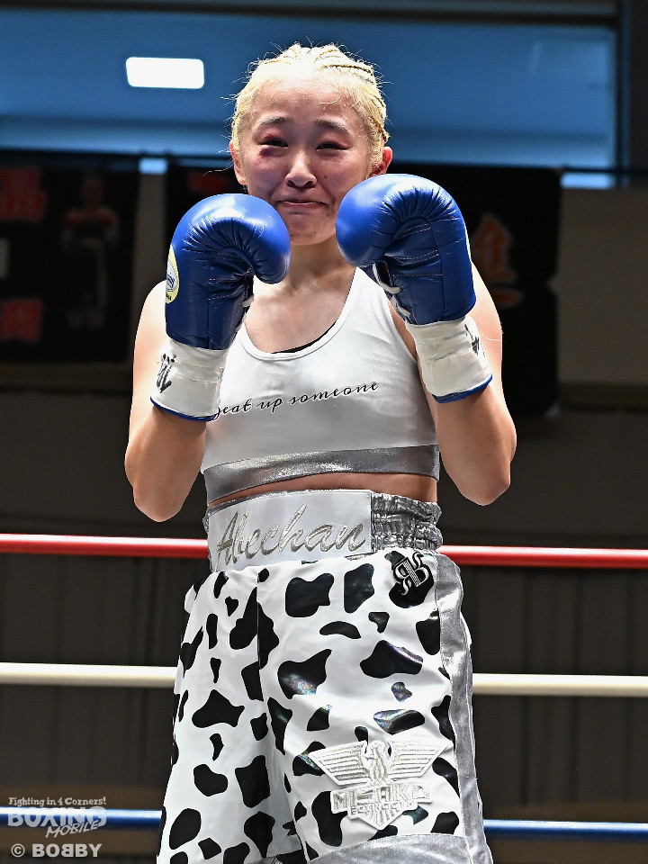 試合:阿部が重心を落としてグイっと前に出ると右フックを好打。2回、阿部は前後の動きを意識しながら左フックで顔を弾きリズム感のある攻撃を披露。3回、後手に回ったタカナはワンツーを繰り出すが、阿部はサイドに回り込んで的を絞らせず。4回、阿部は右フックで膝を揺らすとボディにパンチを集めて攻勢を印象付けた。念願の初勝利を挙げた阿部はフッと息を吐き喜びを噛み締めた。