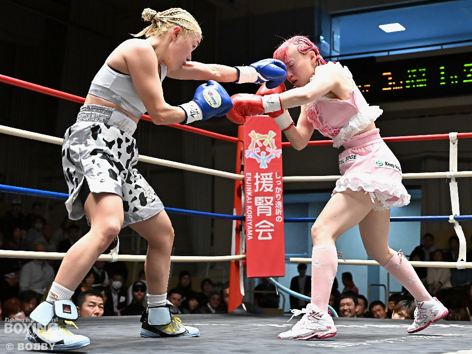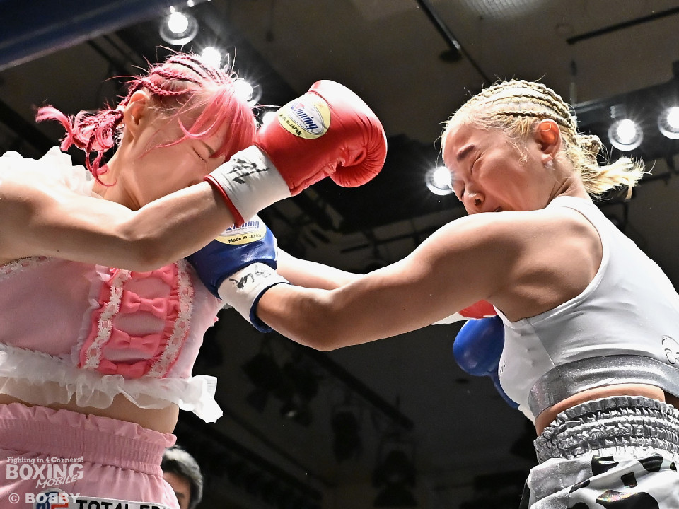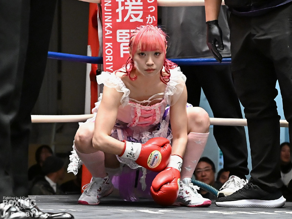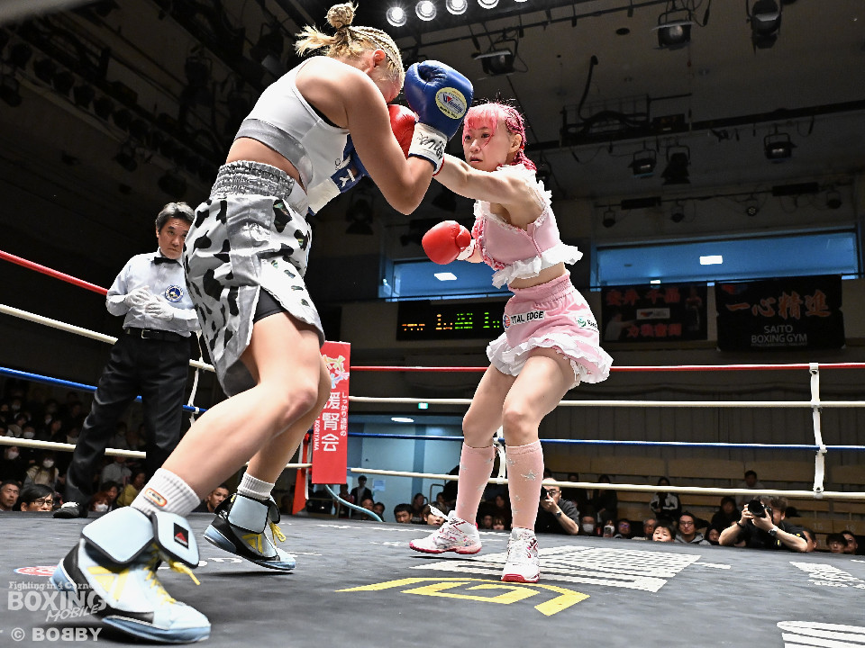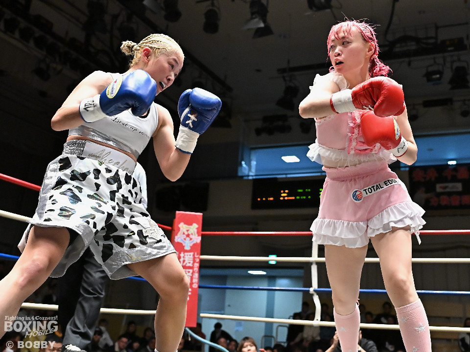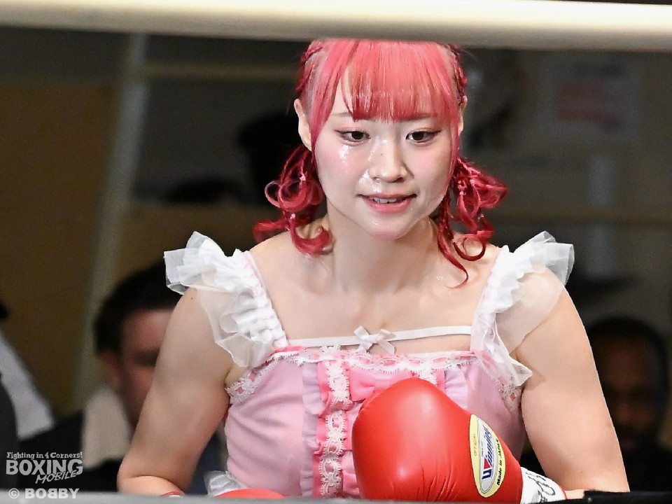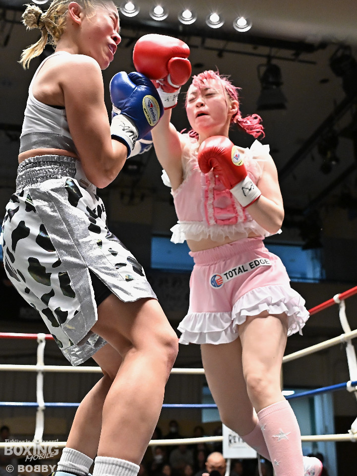 試合:阿部が重心を落としてグイっと前に出ると右フックを好打。2回、阿部は前後の動きを意識しながら左フックで顔を弾きリズム感のある攻撃を披露。3回、後手に回ったタカナはワンツーを繰り出すが、阿部はサイドに回り込んで的を絞らせず。4回、阿部は右フックで膝を揺らすとボディにパンチを集めて攻勢を印象付けた。念願の初勝利を挙げた阿部はフッと息を吐き喜びを噛み締めた。