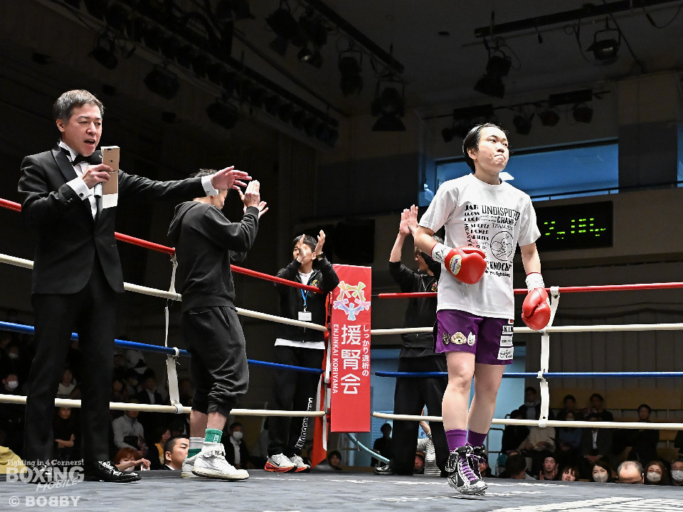 試合:渡邊と岸が1年8ヶ月ぶりの再戦。岸が広くスタンスを取りながら左フックで顔を弾くと返しのパンチをボディワークで回避。2回、渡邊はプレスをかけてワンツー連打で反撃。3回、岸は左を軸にコンパクトな右をヒット。4回、渡邊はグイグイと前に出るが、岸は頭のポジションと足を使いながら試合運びの上手さを見せた。5回、渡邊は持ち前のしつこさを発揮。6回、右ストレートを交錯させて互角に打ち合った。ジャッジ1者は岸につけたが残り2者は引き分けとした。