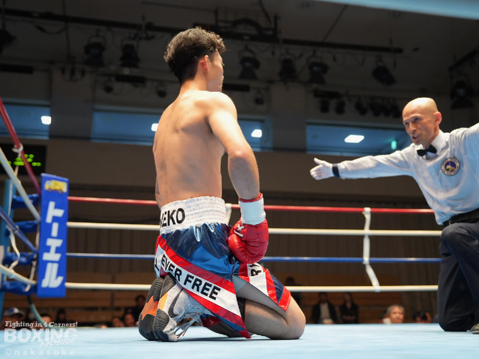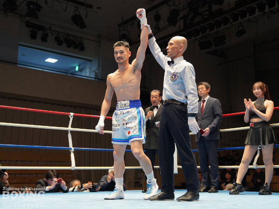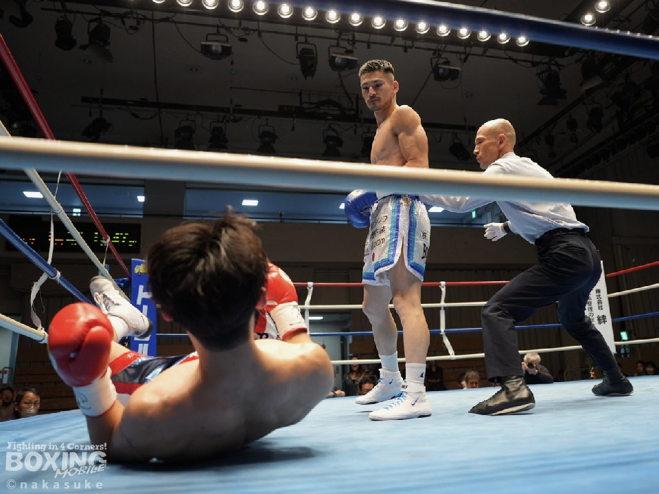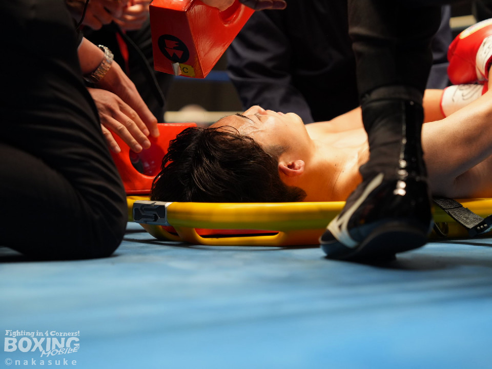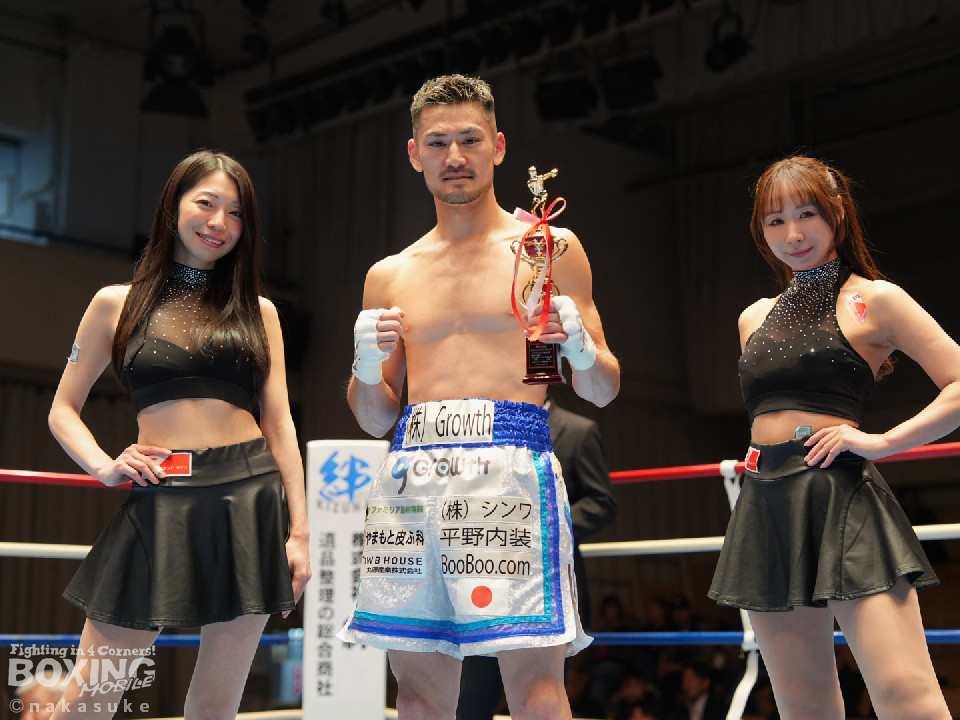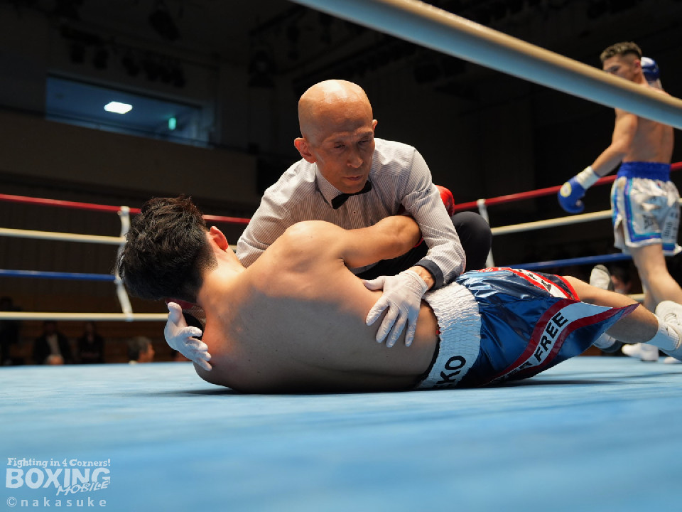 試合:平野がジャブから右ストレートで腰を沈めさせるとワンツーでダウンを奪取。カウント9で再開に応じた小山に迫ると右ストレートで痛烈に倒して結着をつけた。福岡から乗り込んできた平野がインパクト大のKO勝ちを飾った。ダメージが深い小山は担架で運ばれた。