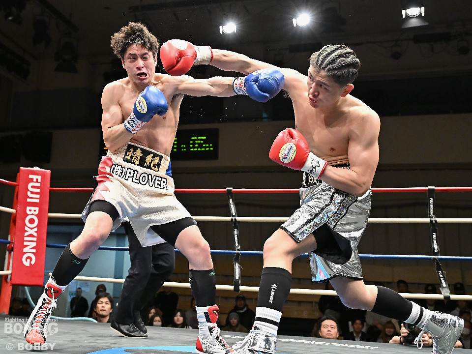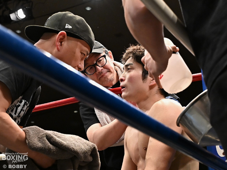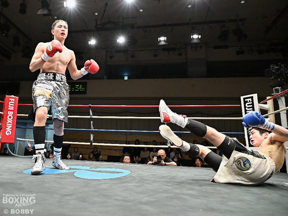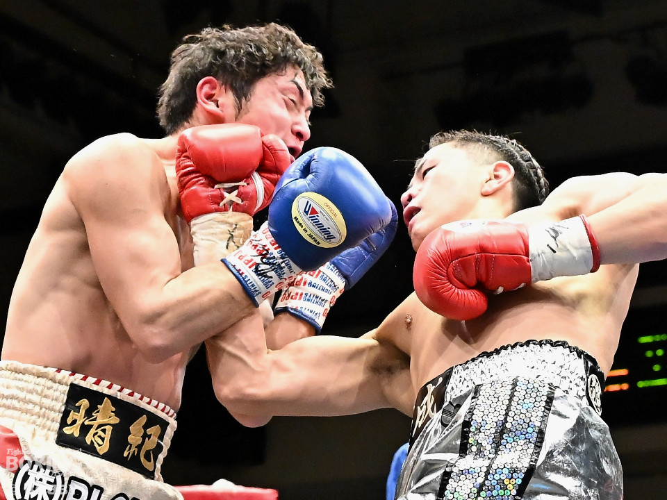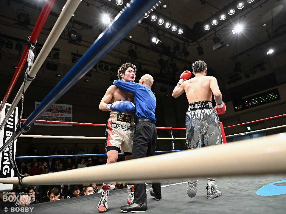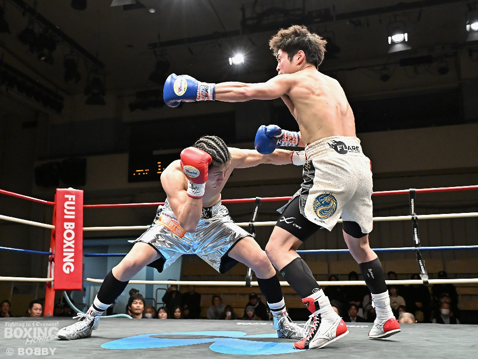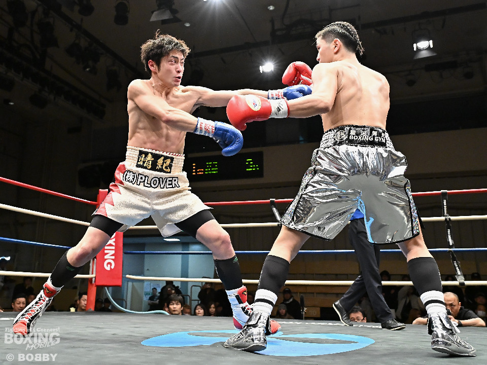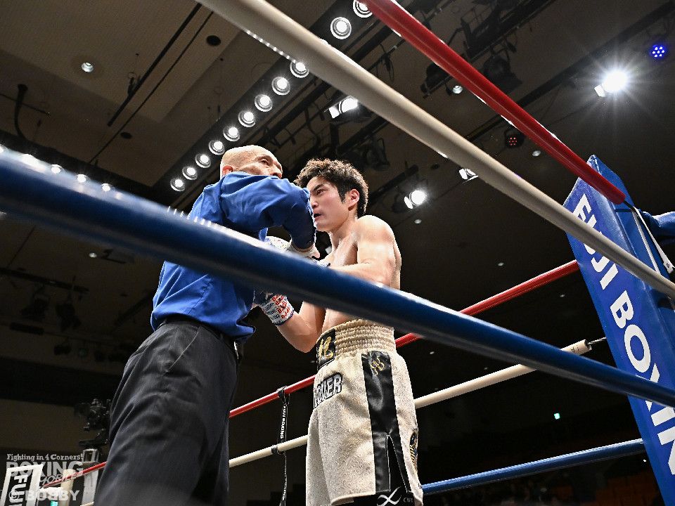 試合:サークリングしながらジャブを伸ばす飯塚に対し、白井は落ち着いて鋭いジャブを放つと左アッパーを突き上げた。2回、ジャブワンツーで前に出る飯塚に連打をまとめられた白井だが、落ち着いて立て直すとノーモーションの右でダウンを先取。3回、ワンツーで距離を潰す飯塚に白井は左右アッパーから右クロスにつなげ、ペースを譲らず。左ボディを突き刺し、連打をまとめるとレフェリーが割って入った。