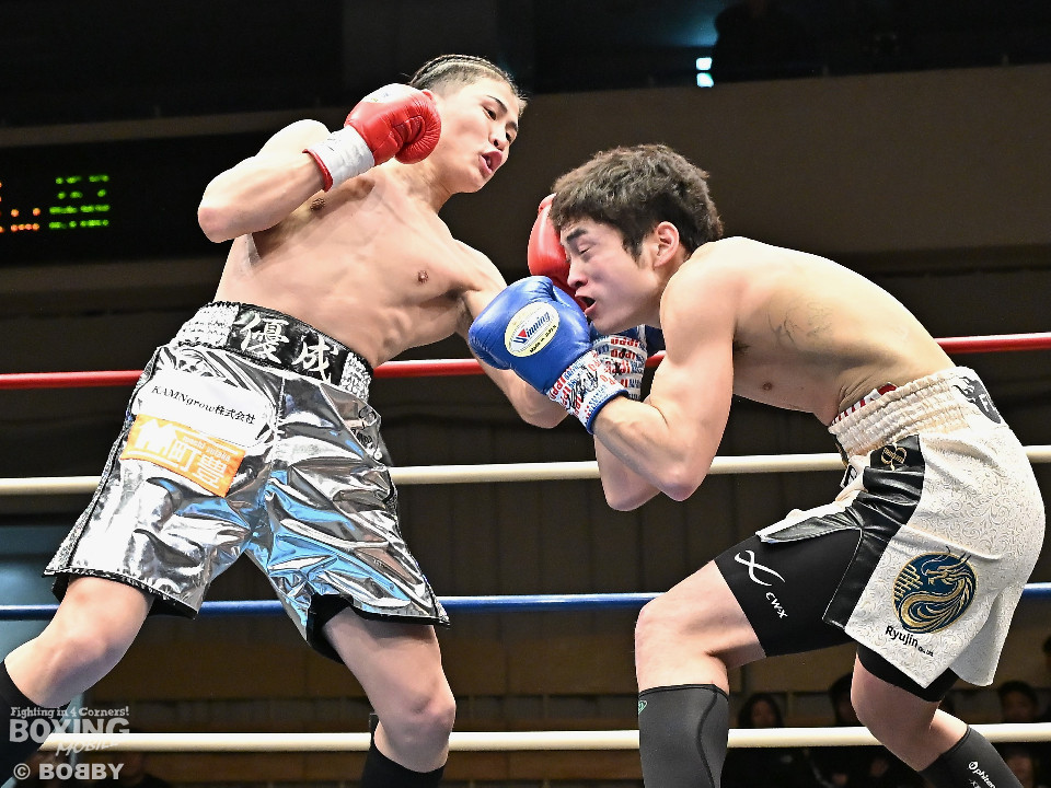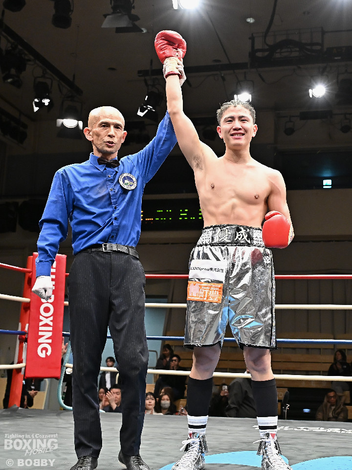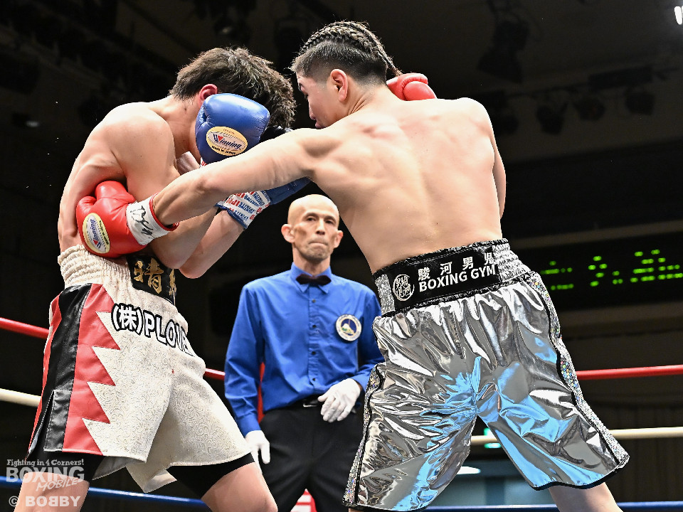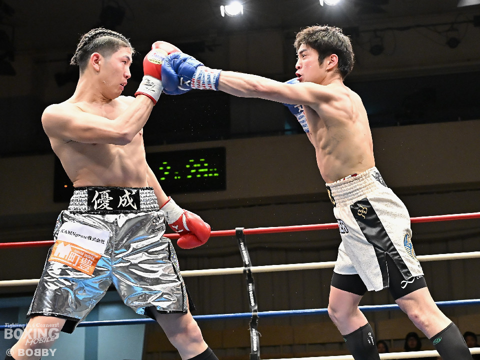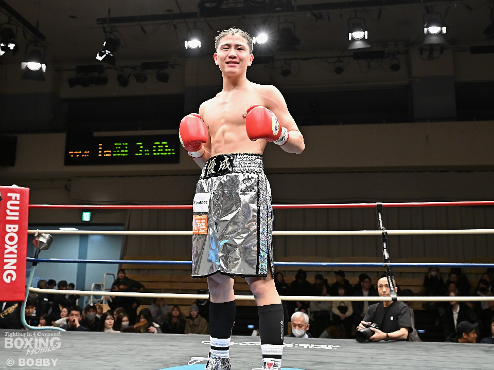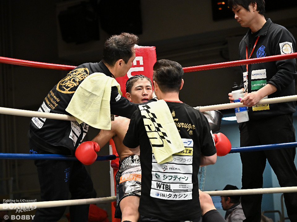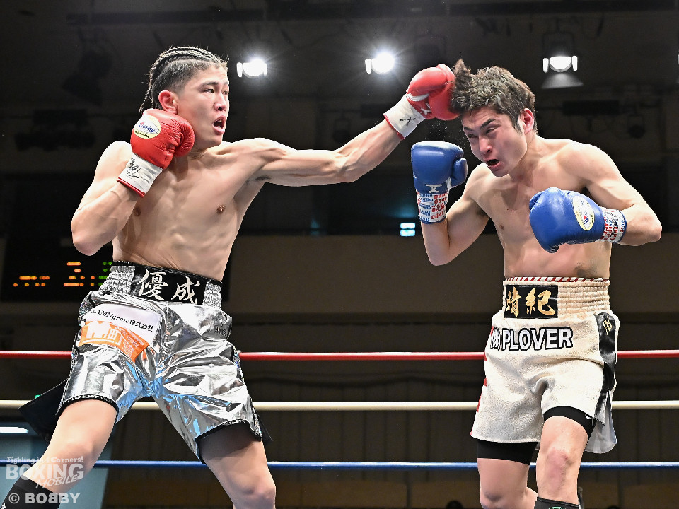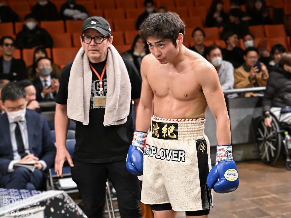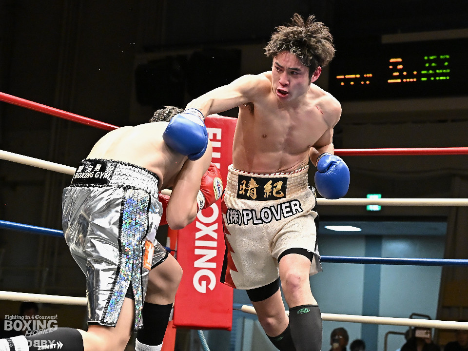 試合:サークリングしながらジャブを伸ばす飯塚に対し、白井は落ち着いて鋭いジャブを放つと左アッパーを突き上げた。2回、ジャブワンツーで前に出る飯塚に連打をまとめられた白井だが、落ち着いて立て直すとノーモーションの右でダウンを先取。3回、ワンツーで距離を潰す飯塚に白井は左右アッパーから右クロスにつなげ、ペースを譲らず。左ボディを突き刺し、連打をまとめるとレフェリーが割って入った。