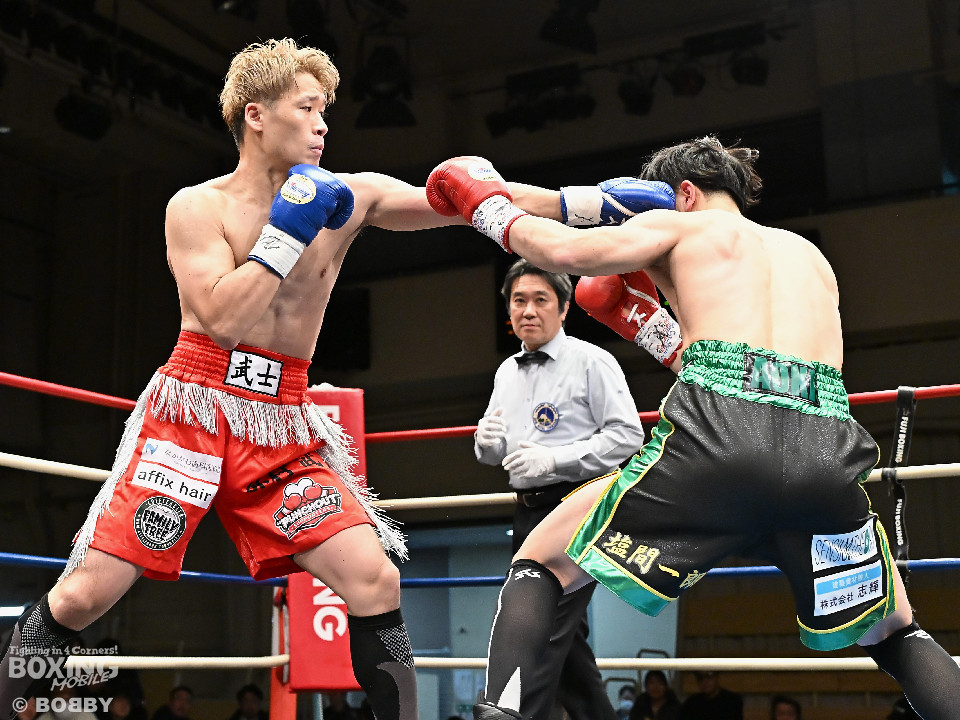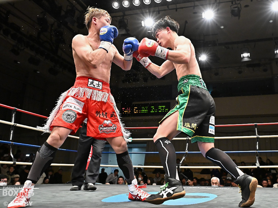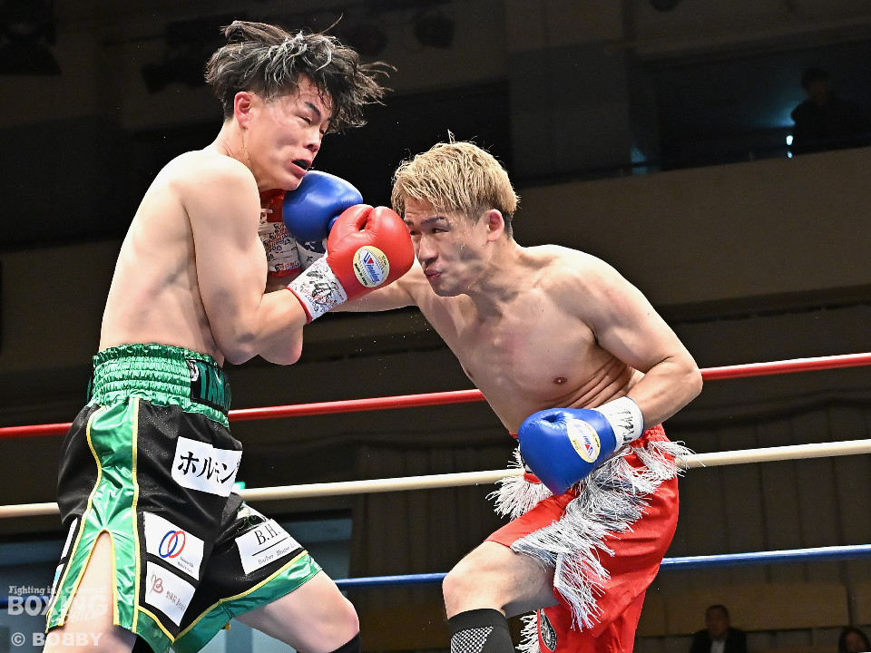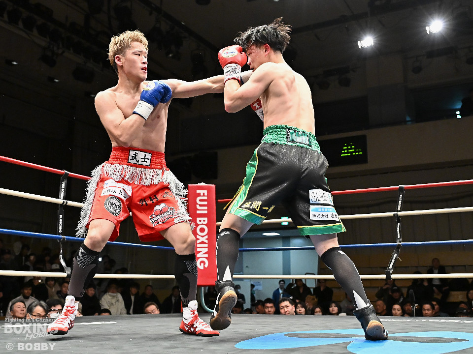 試合:福永がガードを高く上げ、右から切り込むが距離がかみ合わず。2回、外村はボディジャブから組み立てると左フックで膝を揺らしてジャッジに攻勢をアピール。3回、福永はプレスをかけてワンツーを繰り出すのに対し、外村は右クロスで迎え撃ちペースを渡さず。4回、福永はグイっと前に出て左フックで反撃。外村はこのラウンド、後手に回った印象。5回、福永はジャブから左フックにつなげて積極性をアピール。6回、両者とも最後の力を振り絞り、必死にパンチを繰り出したが、決定打は生まれなかった。ジャッジに委ねられた採点は三者三葉の引き分けで結着がつかなかった。