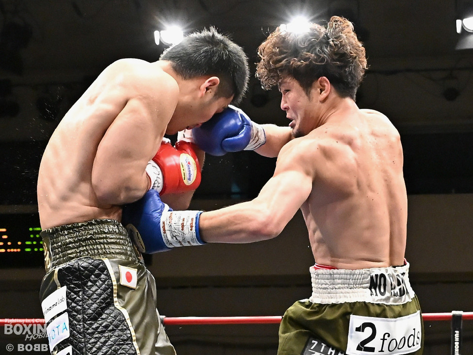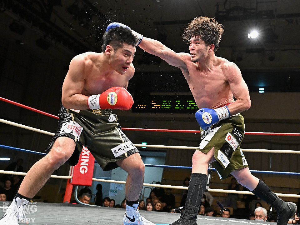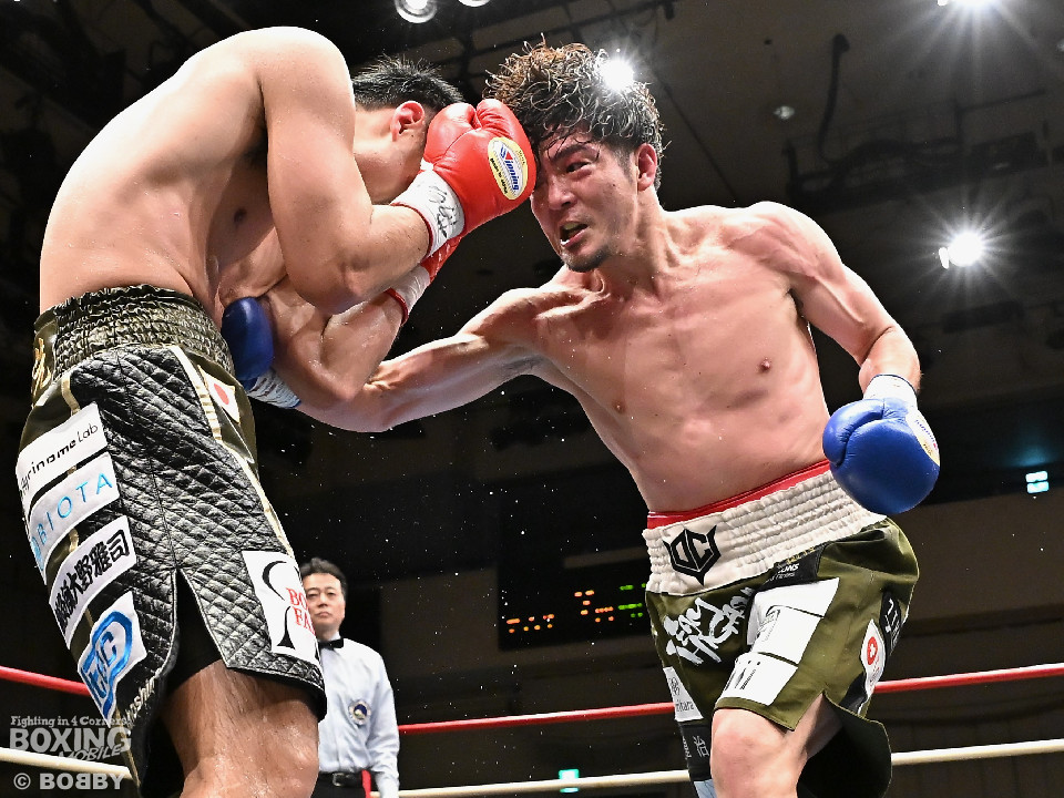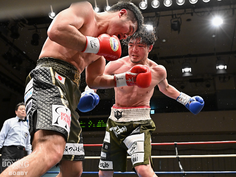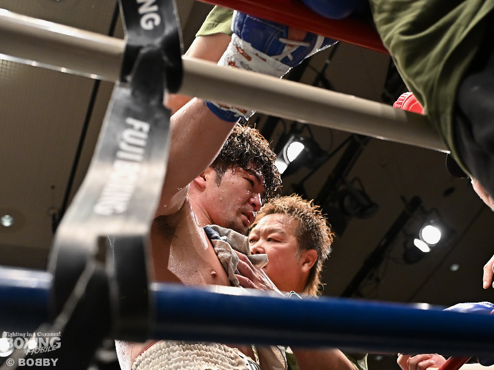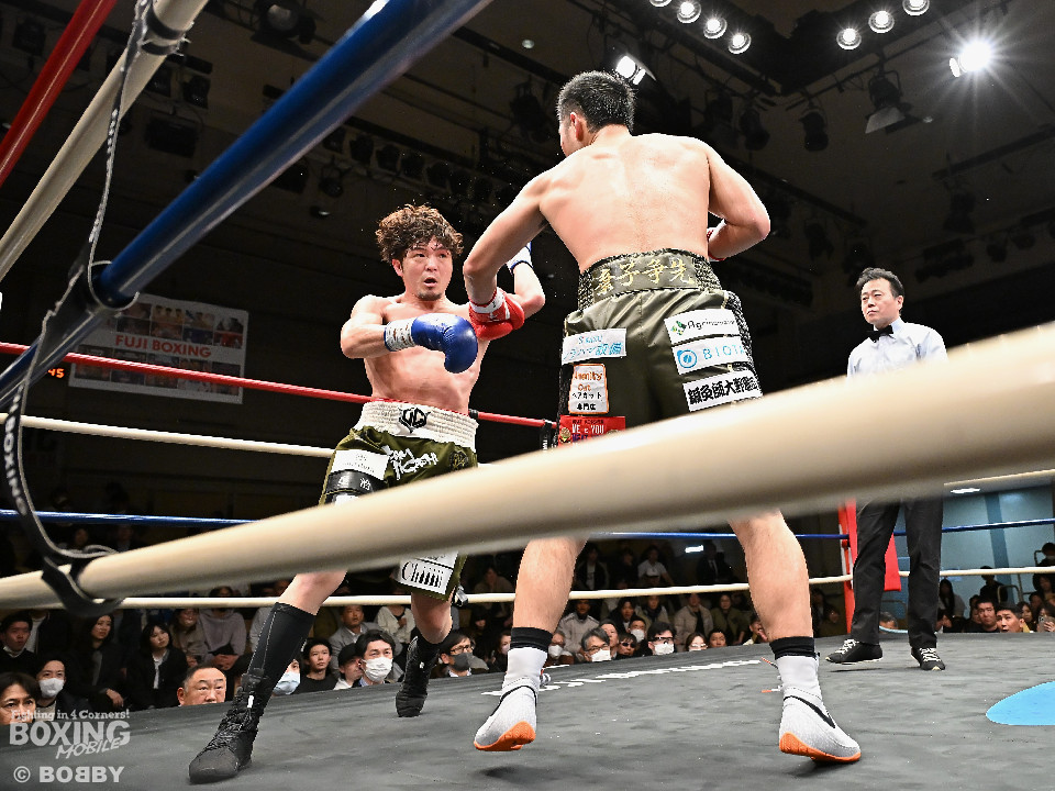 試合:日本スーパーウェルター級王者の神風がランキング1位の左右田を迎え撃った。左右田がジャブから丁寧に組み立てるとワンツーで膝を揺らして先手を奪うことに成功。2回、左右田は右ボディストレートを突き刺すと距離をキープ。単発の左ボディを決めた神風だが、後手に回った。3回、左右田は打ち下ろしの右ストレート、左ボディを好打しポイントを加点。4回、神風はプレスを強めて左フックを叩き込み反撃。5回、至近距離で激しいパンチの応酬、左右田がワンツーを決めれば神風も左ボディを突き刺した。前半終了時の公開採点は48-47(神風)、48-47(左右田)、49-46(左右田)と割れたが挑戦者がリード。6回、肉弾戦が続き体力の削り合い。7回、左右田はもう一度ジャブから組み立てるとワンツーで顔を弾く。8回、クリンチが多くなってくる中、神風が要所で右フックをヒット。9回も同じような展開となるが、今度は左右田がワンツーを決めた。10回、左右田はボディにコツコツと集めると神風も真っ向から応戦。左右田の有効打が上回った。ジャッジ3者とも4ポイント差をつけた左右田が新チャンピオンに輝いた。