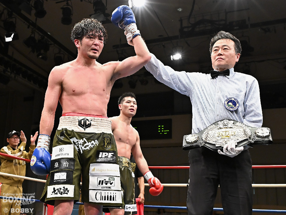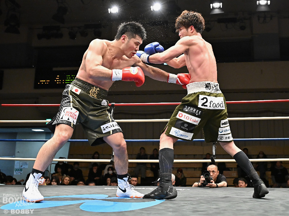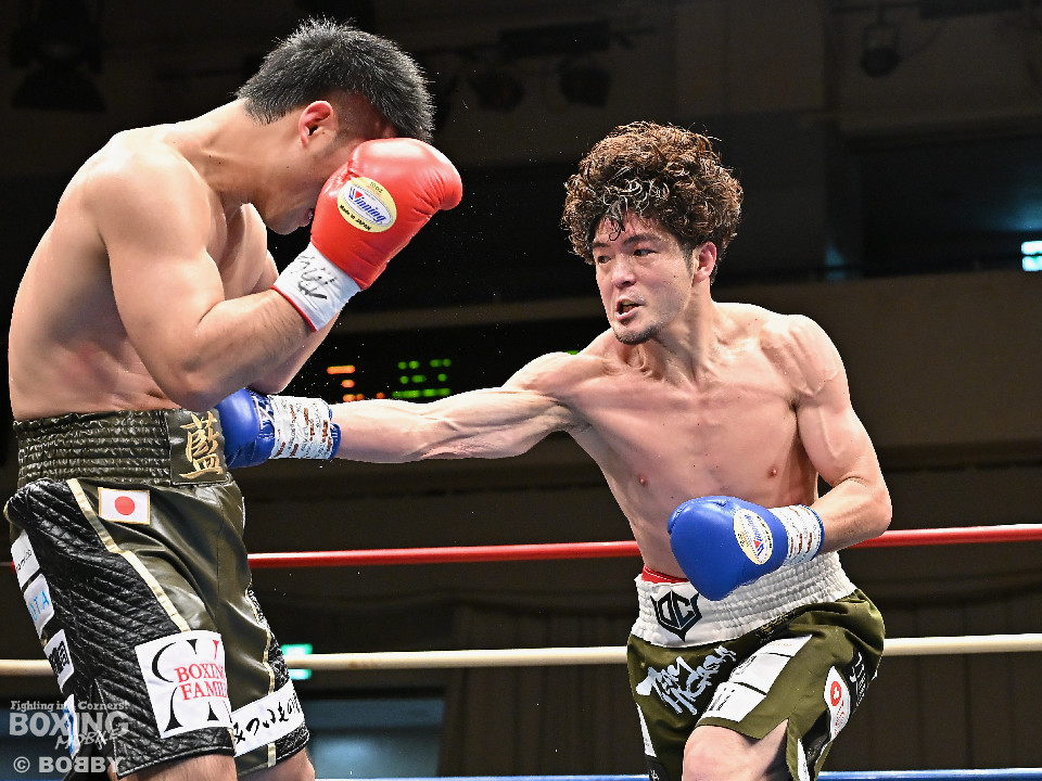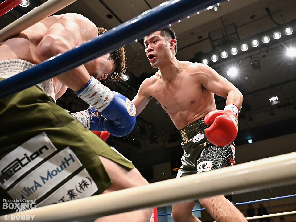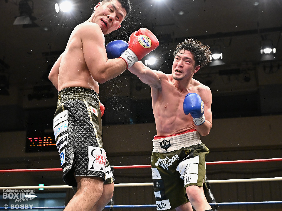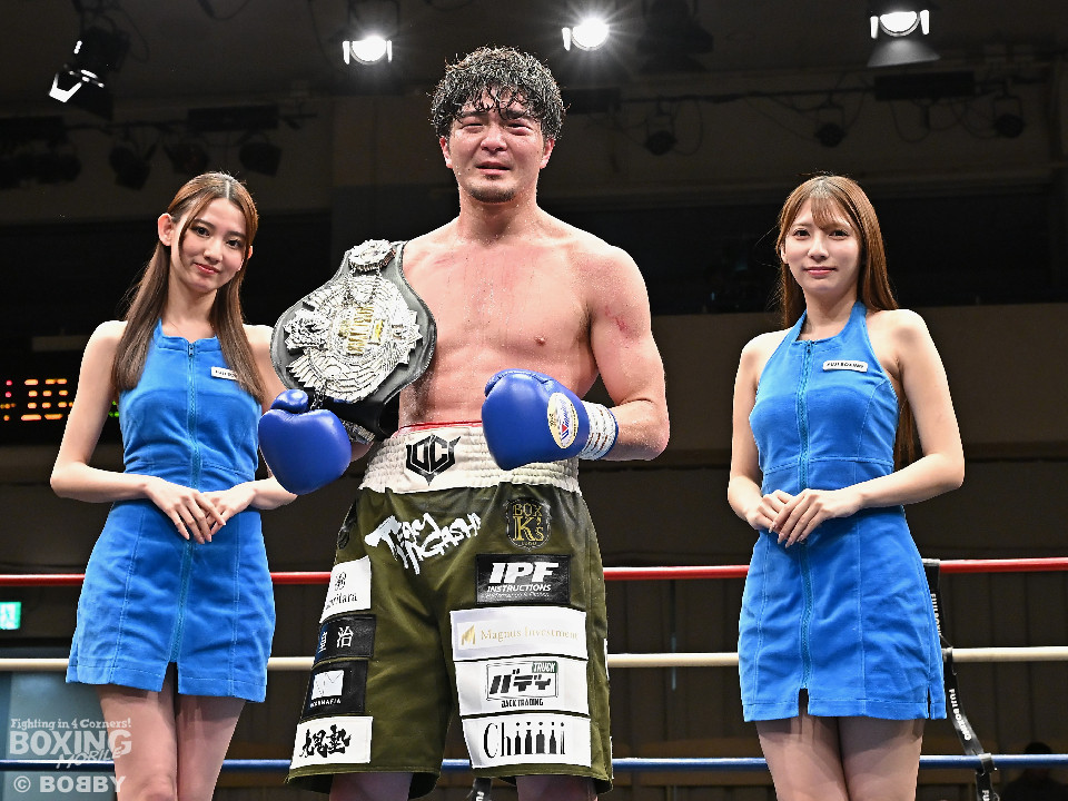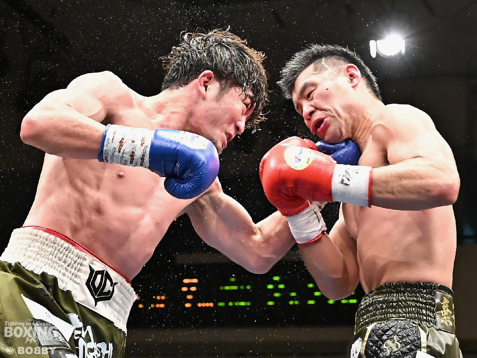 試合:日本スーパーウェルター級王者の神風がランキング1位の左右田を迎え撃った。左右田がジャブから丁寧に組み立てるとワンツーで膝を揺らして先手を奪うことに成功。2回、左右田は右ボディストレートを突き刺すと距離をキープ。単発の左ボディを決めた神風だが、後手に回った。3回、左右田は打ち下ろしの右ストレート、左ボディを好打しポイントを加点。4回、神風はプレスを強めて左フックを叩き込み反撃。5回、至近距離で激しいパンチの応酬、左右田がワンツーを決めれば神風も左ボディを突き刺した。前半終了時の公開採点は48-47(神風)、48-47(左右田)、49-46(左右田)と割れたが挑戦者がリード。6回、肉弾戦が続き体力の削り合い。7回、左右田はもう一度ジャブから組み立てるとワンツーで顔を弾く。8回、クリンチが多くなってくる中、神風が要所で右フックをヒット。9回も同じような展開となるが、今度は左右田がワンツーを決めた。10回、左右田はボディにコツコツと集めると神風も真っ向から応戦。左右田の有効打が上回った。ジャッジ3者とも4ポイント差をつけた左右田が新チャンピオンに輝いた。