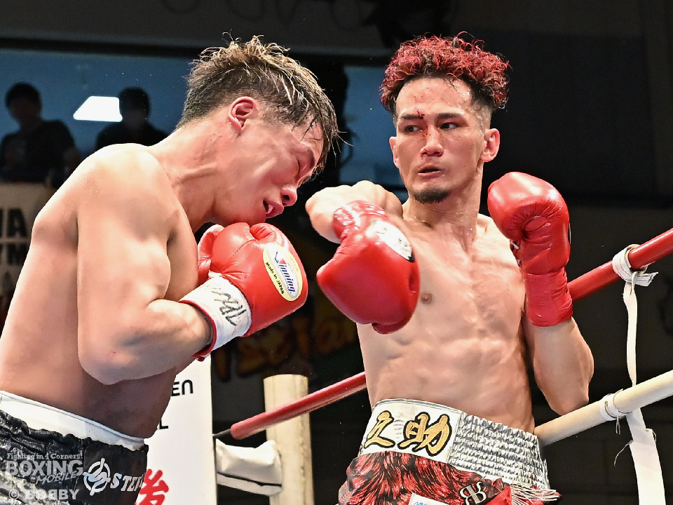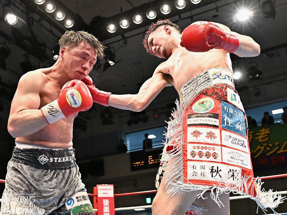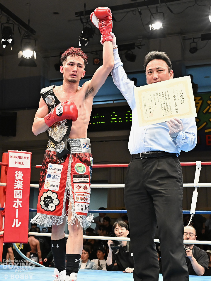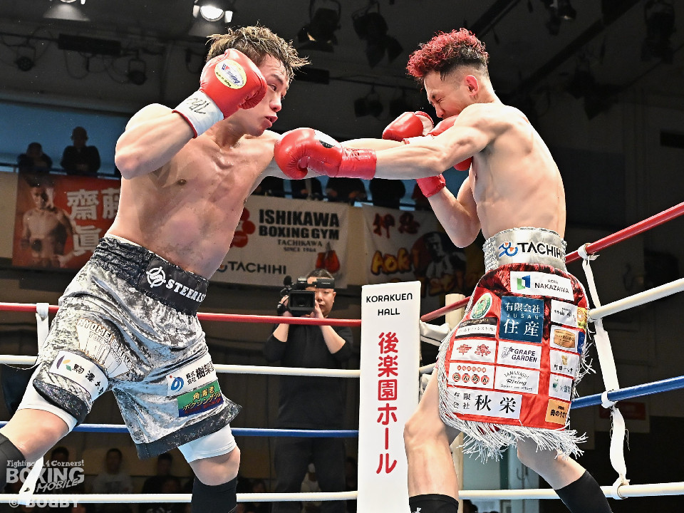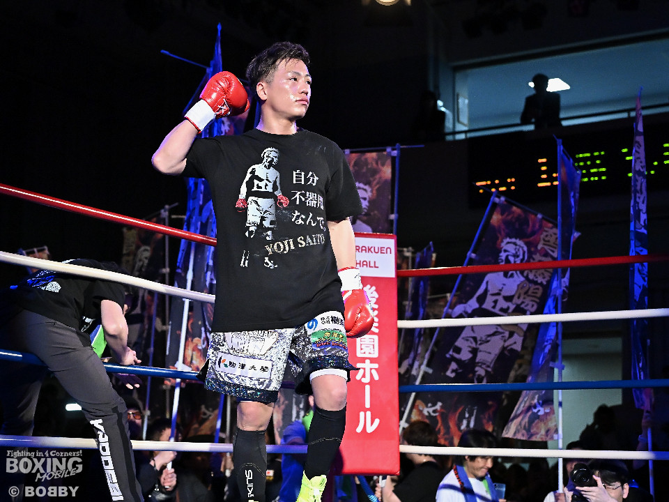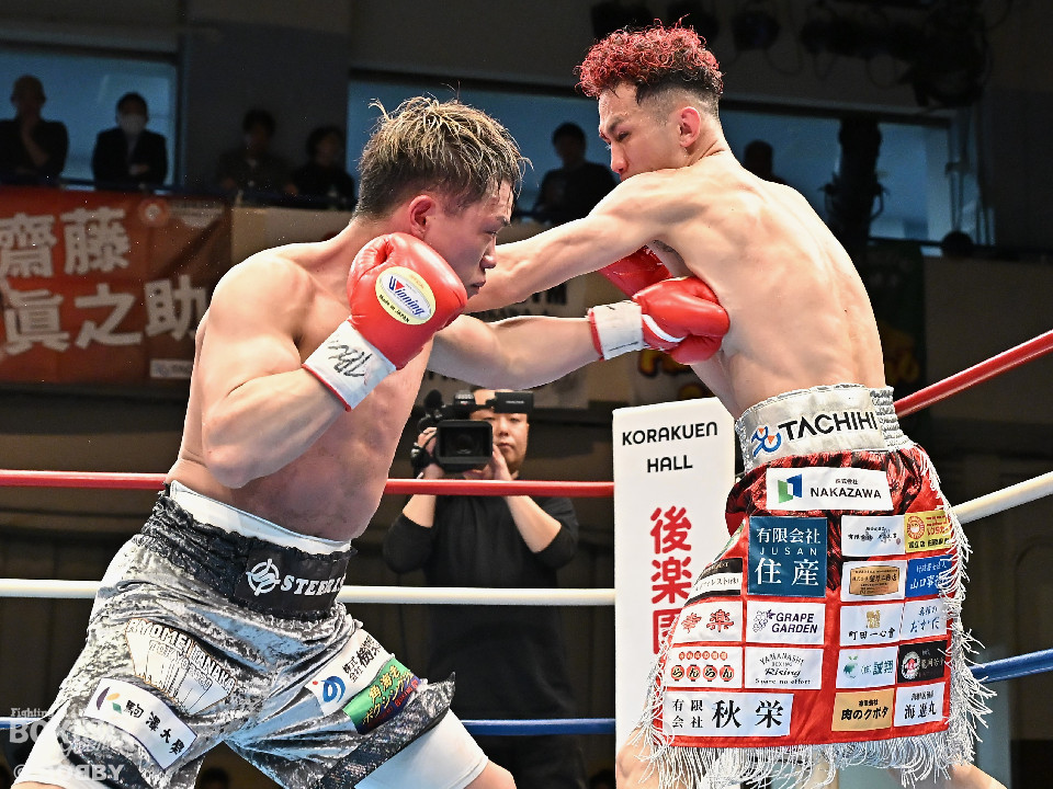 試合:空位の日本ライト級王座を懸けて齊藤陽二と齋藤眞之助が拳を交えた。眞之助が足を使いながらジャブを飛ばすと右アッパーをヒット。距離を潰しにくる陽二に対し、サークリングしながら的を絞らせず。初回が終わると「陽二」「眞之助」コールが鳴り響いた。2回、陽二はプレスをかけて右ボディで動きを止めに行くが、眞之助は左を軸に距離をキープ。サウスポーにスイッチするとクリンチで遮断した。3回、陽二はグイっと前に出て右オーバーハンドを叩きつけるとギアを上げて反撃。眞之助は偶然のバッティングで眉間をカット。4回、陽二は右ボディを突き刺すとアクセル全開。力強い左右フックでグイグイと攻め立てた。5回、眞之助は右アッパーで顔を弾くとワンツーを好打。ラウンド終了間際には、右ストレートでバランスを崩させて攻勢を印象付けた。前半終了時の公開採点は48ー47×3で眞之助がリード。6回、もう一段ギアを上げた陽二が怒涛の攻撃。壮絶な打撃戦に会場は興奮のるつぼと化した。続く回も陽二のパワフルな攻撃が光った。8回、陽二は左ボディを徹底。眞之助は苦しい表情を浮かべた。9回、眞之助は右ストレート、右アッパーで突き放し我慢のボクシング。10回、眞之助は足を止めず右カウンターを決めると手数を増やして最後の力を振り絞った。ジャッジに委ねられた採点は3者とも2ポイント差をつけた齋藤眞之助が新王者に輝いた。