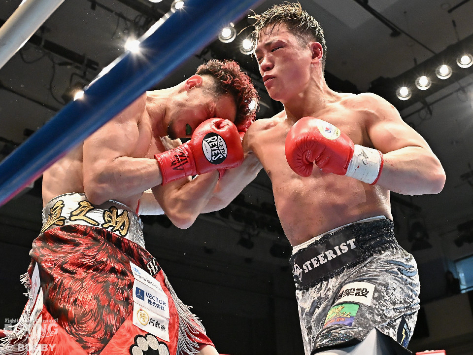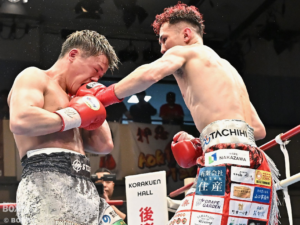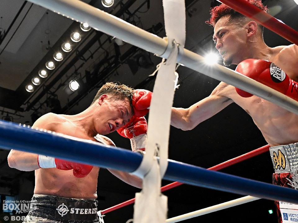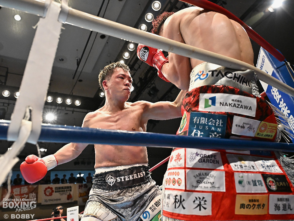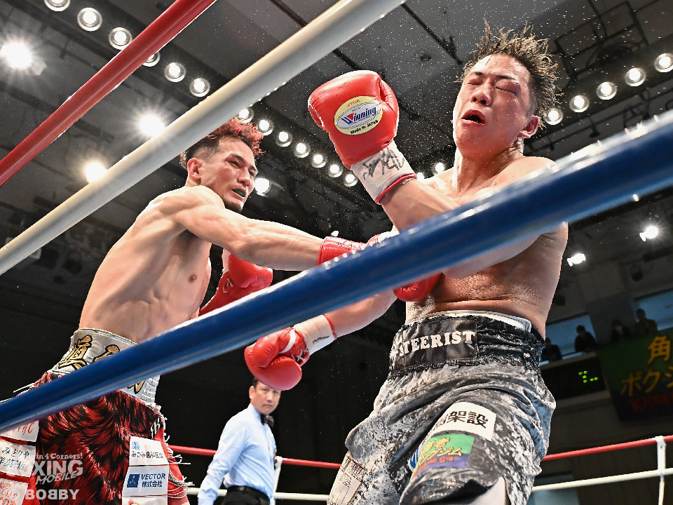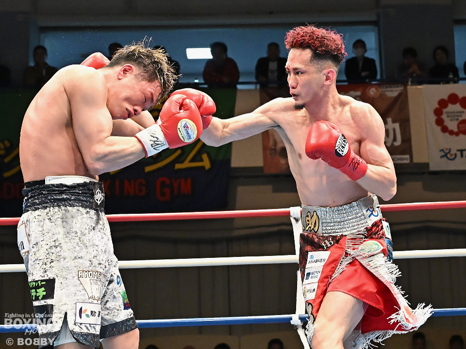 試合:空位の日本ライト級王座を懸けて齊藤陽二と齋藤眞之助が拳を交えた。眞之助が足を使いながらジャブを飛ばすと右アッパーをヒット。距離を潰しにくる陽二に対し、サークリングしながら的を絞らせず。初回が終わると「陽二」「眞之助」コールが鳴り響いた。2回、陽二はプレスをかけて右ボディで動きを止めに行くが、眞之助は左を軸に距離をキープ。サウスポーにスイッチするとクリンチで遮断した。3回、陽二はグイっと前に出て右オーバーハンドを叩きつけるとギアを上げて反撃。眞之助は偶然のバッティングで眉間をカット。4回、陽二は右ボディを突き刺すとアクセル全開。力強い左右フックでグイグイと攻め立てた。5回、眞之助は右アッパーで顔を弾くとワンツーを好打。ラウンド終了間際には、右ストレートでバランスを崩させて攻勢を印象付けた。前半終了時の公開採点は48ー47×3で眞之助がリード。6回、もう一段ギアを上げた陽二が怒涛の攻撃。壮絶な打撃戦に会場は興奮のるつぼと化した。続く回も陽二のパワフルな攻撃が光った。8回、陽二は左ボディを徹底。眞之助は苦しい表情を浮かべた。9回、眞之助は右ストレート、右アッパーで突き放し我慢のボクシング。10回、眞之助は足を止めず右カウンターを決めると手数を増やして最後の力を振り絞った。ジャッジに委ねられた採点は3者とも2ポイント差をつけた齋藤眞之助が新王者に輝いた。