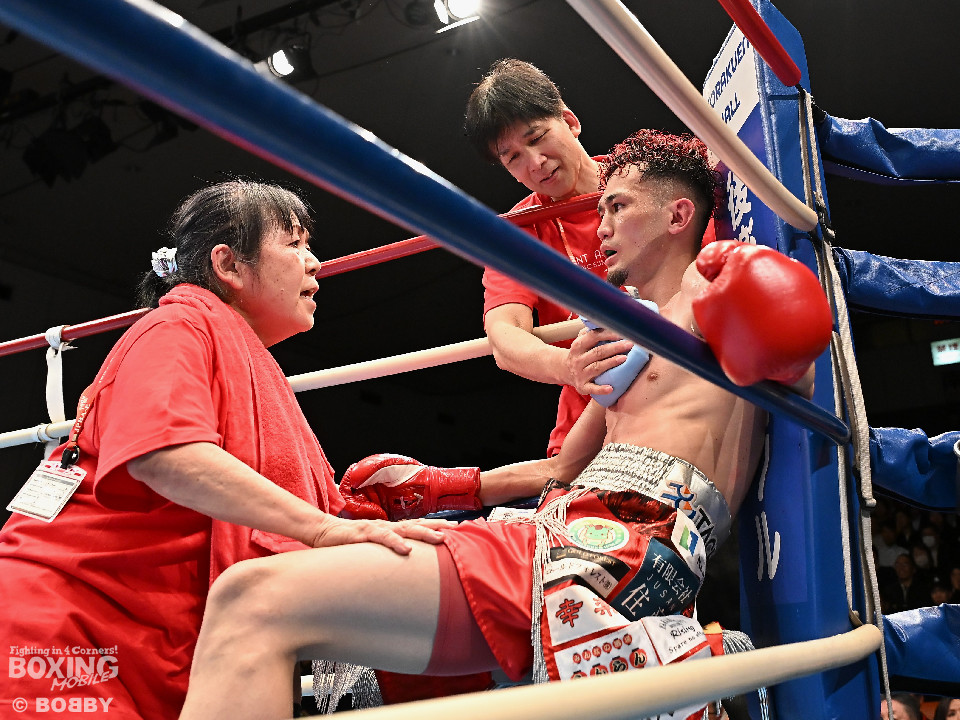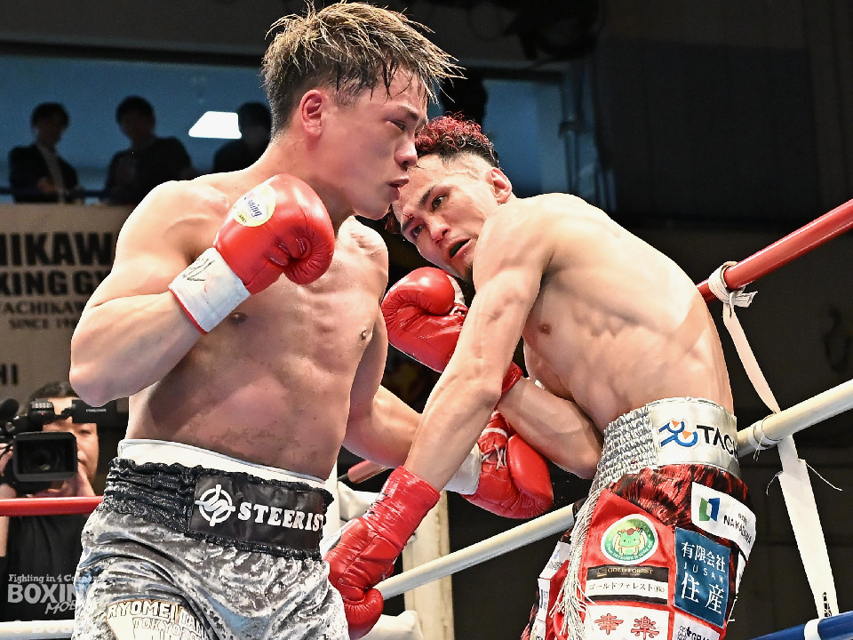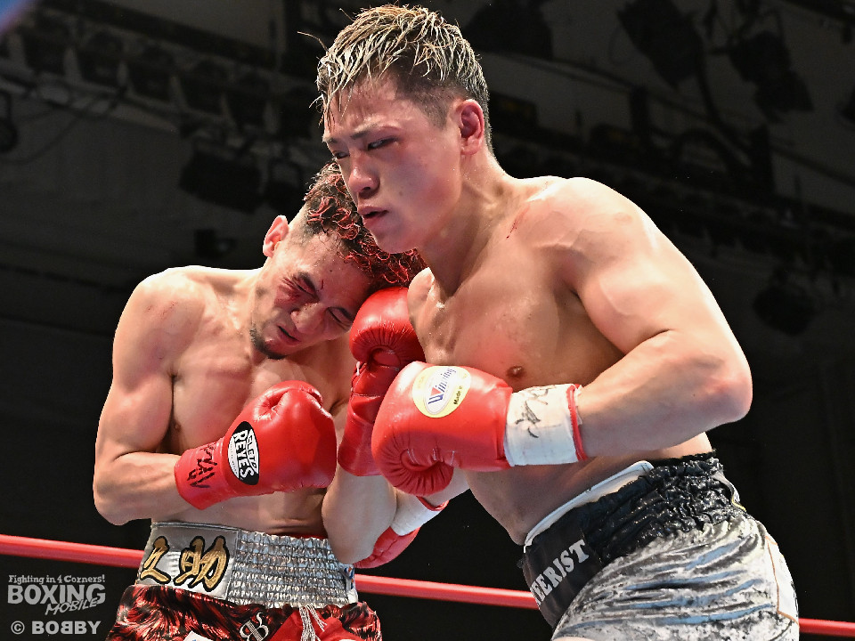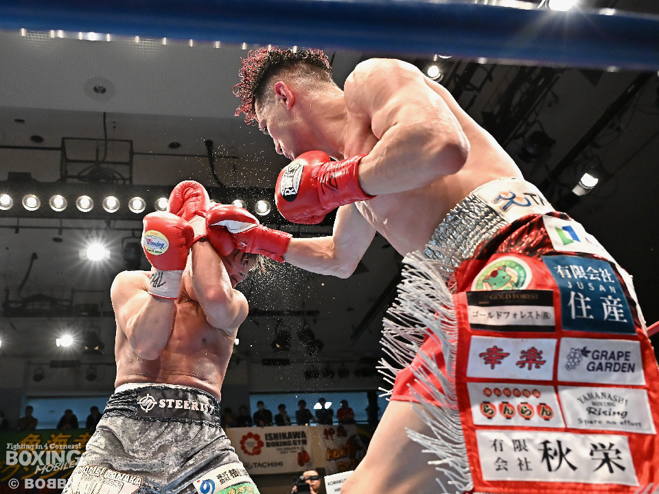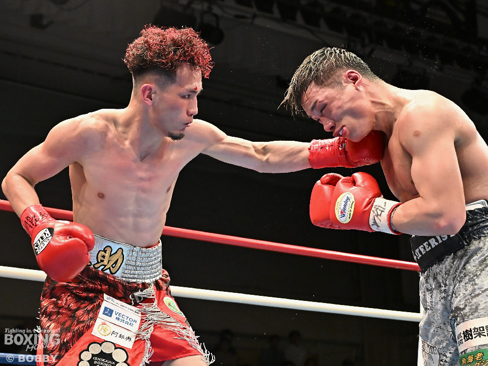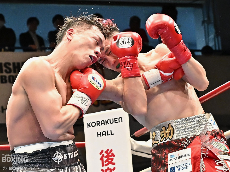 試合:空位の日本ライト級王座を懸けて齊藤陽二と齋藤眞之助が拳を交えた。眞之助が足を使いながらジャブを飛ばすと右アッパーをヒット。距離を潰しにくる陽二に対し、サークリングしながら的を絞らせず。初回が終わると「陽二」「眞之助」コールが鳴り響いた。2回、陽二はプレスをかけて右ボディで動きを止めに行くが、眞之助は左を軸に距離をキープ。サウスポーにスイッチするとクリンチで遮断した。3回、陽二はグイっと前に出て右オーバーハンドを叩きつけるとギアを上げて反撃。眞之助は偶然のバッティングで眉間をカット。4回、陽二は右ボディを突き刺すとアクセル全開。力強い左右フックでグイグイと攻め立てた。5回、眞之助は右アッパーで顔を弾くとワンツーを好打。ラウンド終了間際には、右ストレートでバランスを崩させて攻勢を印象付けた。前半終了時の公開採点は48ー47×3で眞之助がリード。6回、もう一段ギアを上げた陽二が怒涛の攻撃。壮絶な打撃戦に会場は興奮のるつぼと化した。続く回も陽二のパワフルな攻撃が光った。8回、陽二は左ボディを徹底。眞之助は苦しい表情を浮かべた。9回、眞之助は右ストレート、右アッパーで突き放し我慢のボクシング。10回、眞之助は足を止めず右カウンターを決めると手数を増やして最後の力を振り絞った。ジャッジに委ねられた採点は3者とも2ポイント差をつけた齋藤眞之助が新王者に輝いた。