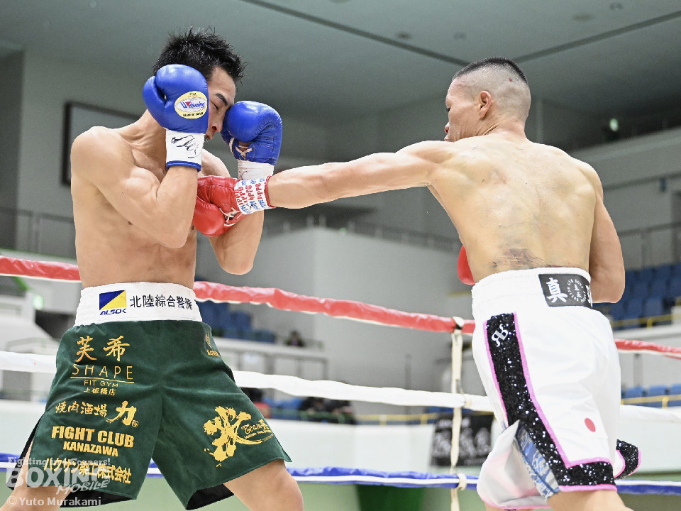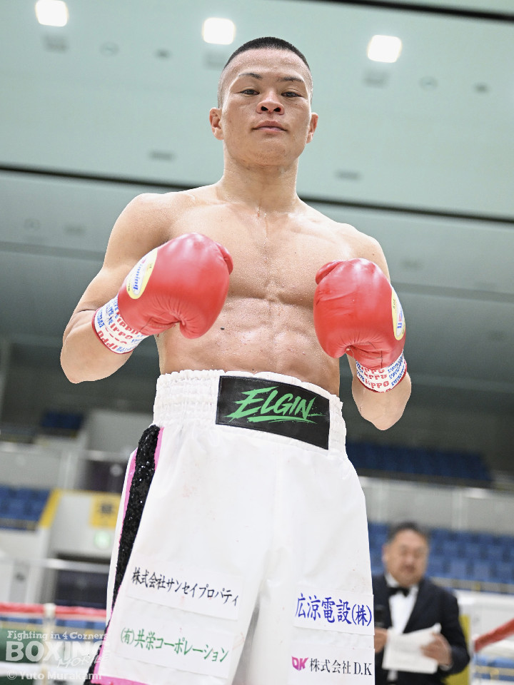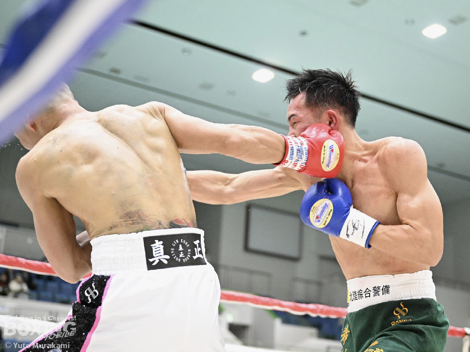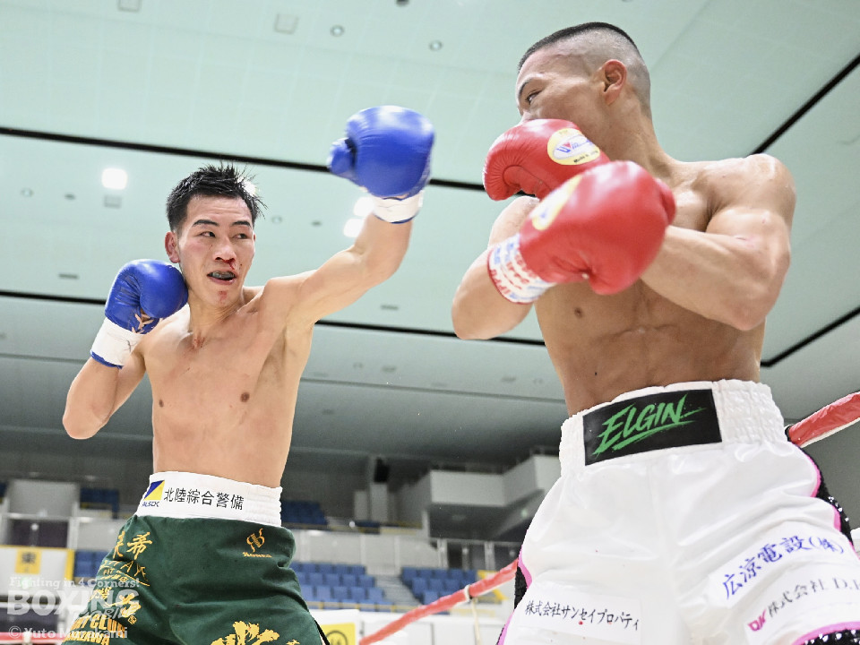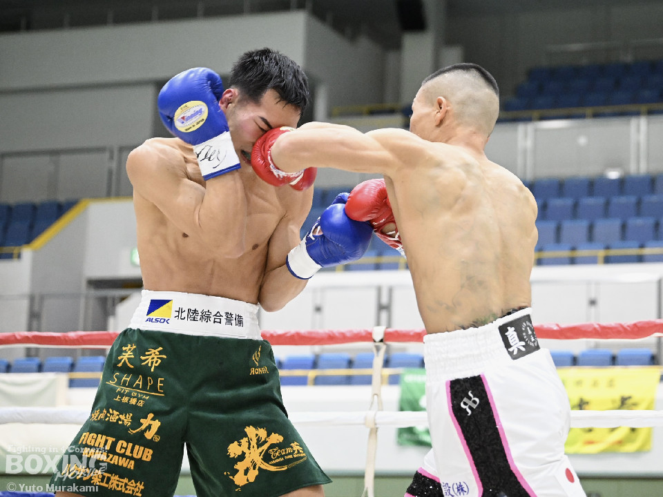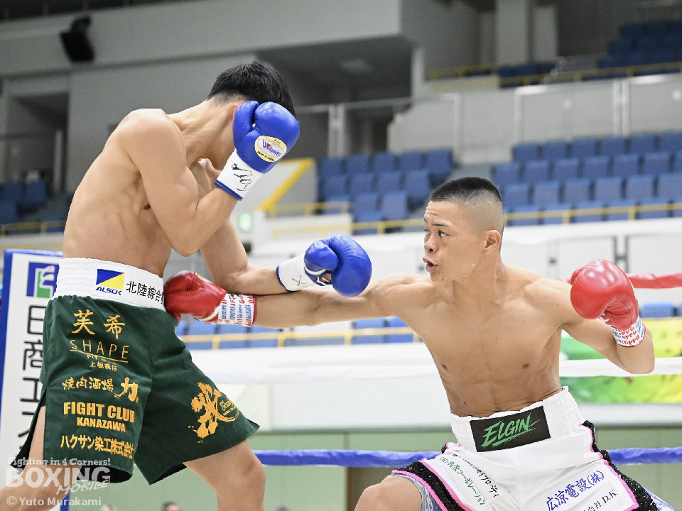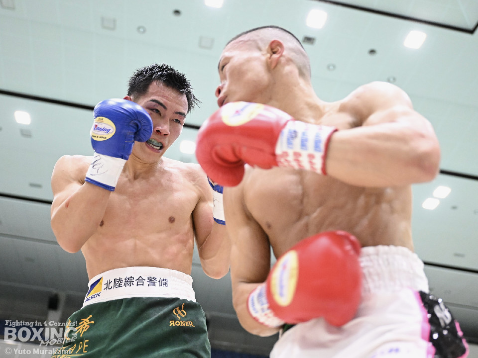 試合:新旧ユースチャンピオン対決。英がゴングからジャブを上下に散らしプレス。現チャンピオン友良もパーリングで落ち着いて対処し、鋭いジャブを返す。2回、友良がギアを上げガードの隙間にワンツーを打ち抜き、終盤はジャブ続け様にヒット。3回、英は自分から打って出るが友良のジャブにワンテンポ反応が遅れる。友良は距離感を掴みジャブ、左ストレートとヒットを奪う。4回、友良の左ストレートがクリーンヒット。英は鼻血を流し始めるが、下がらずジャブを突き続け逆転を狙う。5回、英は手数を増やして前に出るが友良に防がれ、右フックを浴びる。6回、友良は左ストレート、右フックをクリーンヒットするがタフな英はそれでも前進し手数をだす。7回、友良がロープに詰め、立て続けに顔面にクリーンヒット。しかし英はここでも効いた素振りを見せずパンチを返す。最終回、両者死力を尽くし打ち合う。距離が近くなったところで両者の頭が当たり、英の右目上をカット。続行不可能となり試合がストップ。負傷判定となり友良が大差で勝利を挙げた。