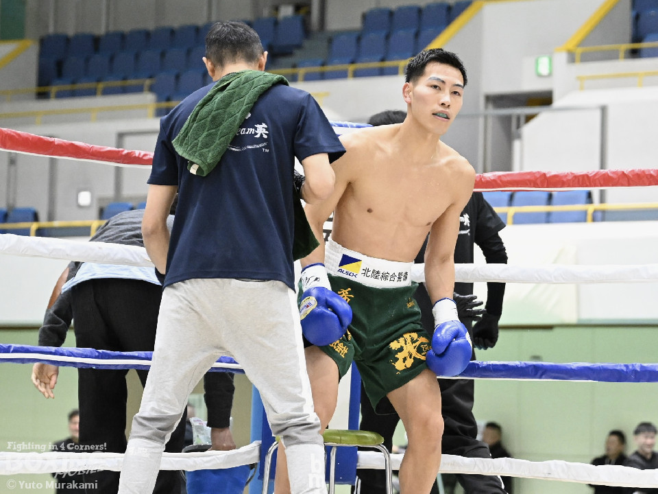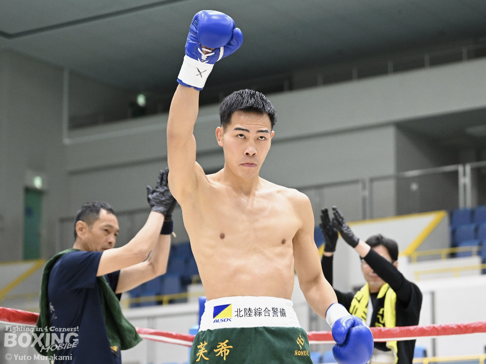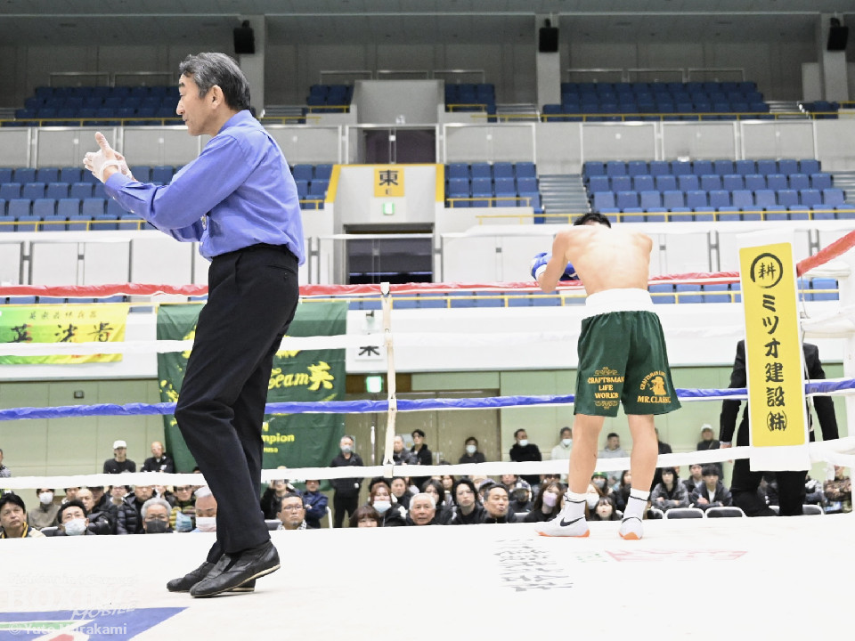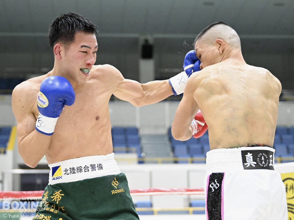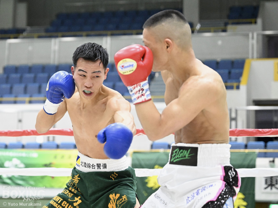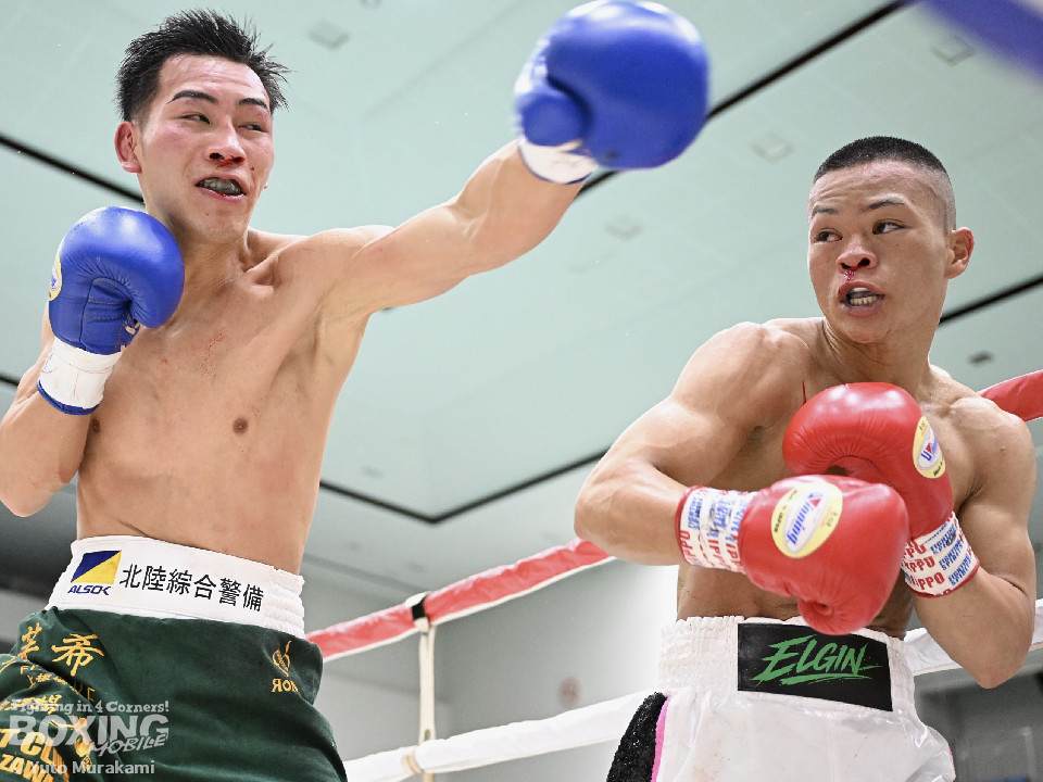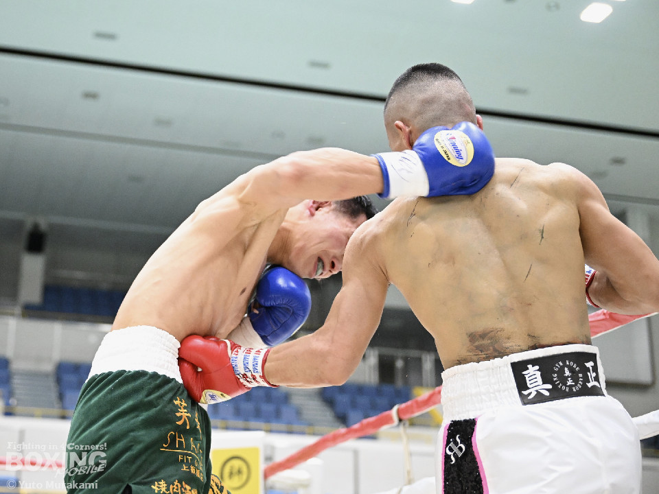 試合:新旧ユースチャンピオン対決。英がゴングからジャブを上下に散らしプレス。現チャンピオン友良もパーリングで落ち着いて対処し、鋭いジャブを返す。2回、友良がギアを上げガードの隙間にワンツーを打ち抜き、終盤はジャブ続け様にヒット。3回、英は自分から打って出るが友良のジャブにワンテンポ反応が遅れる。友良は距離感を掴みジャブ、左ストレートとヒットを奪う。4回、友良の左ストレートがクリーンヒット。英は鼻血を流し始めるが、下がらずジャブを突き続け逆転を狙う。5回、英は手数を増やして前に出るが友良に防がれ、右フックを浴びる。6回、友良は左ストレート、右フックをクリーンヒットするがタフな英はそれでも前進し手数をだす。7回、友良がロープに詰め、立て続けに顔面にクリーンヒット。しかし英はここでも効いた素振りを見せずパンチを返す。最終回、両者死力を尽くし打ち合う。距離が近くなったところで両者の頭が当たり、英の右目上をカット。続行不可能となり試合がストップ。負傷判定となり友良が大差で勝利を挙げた。