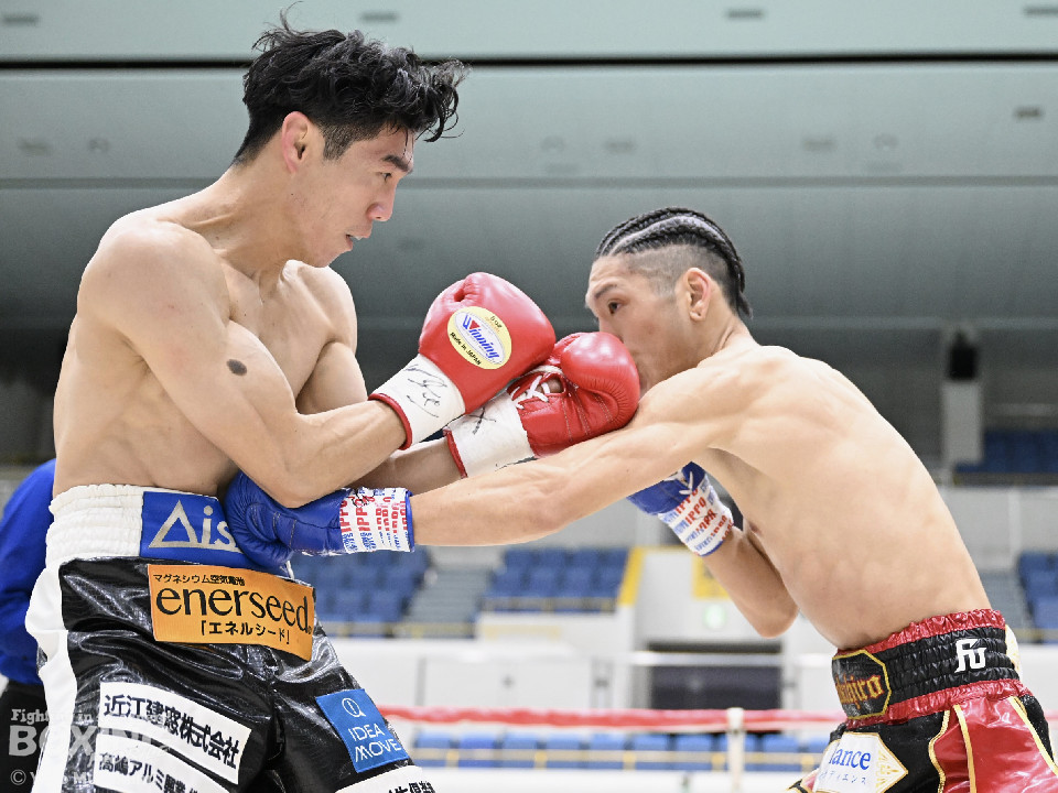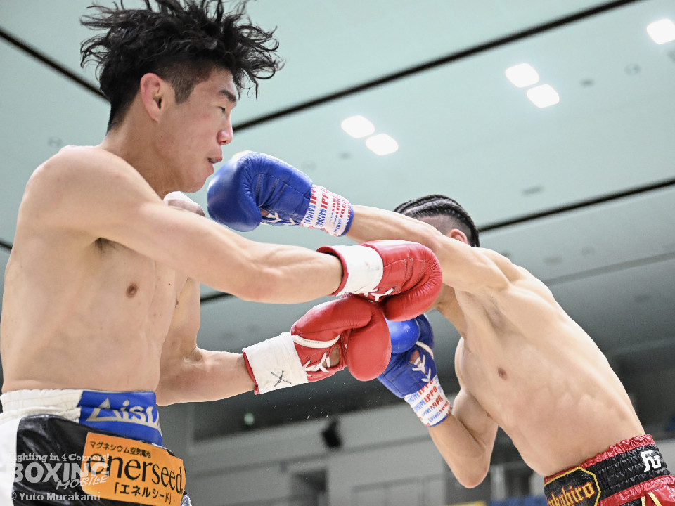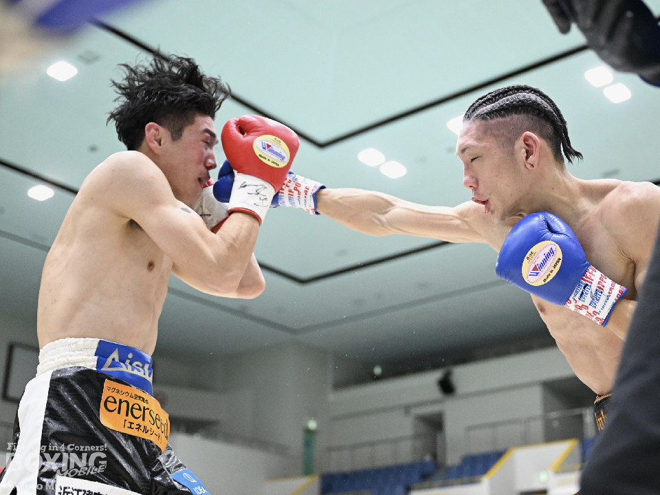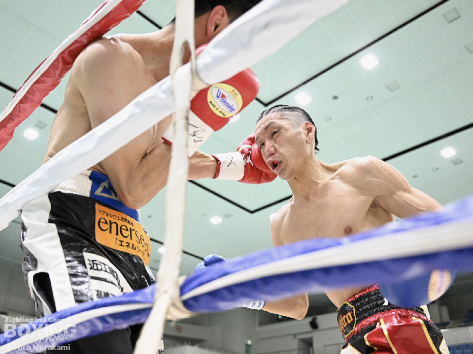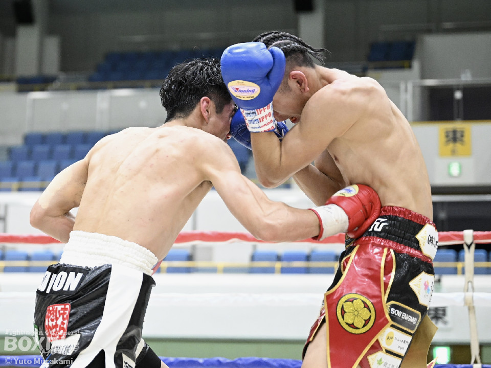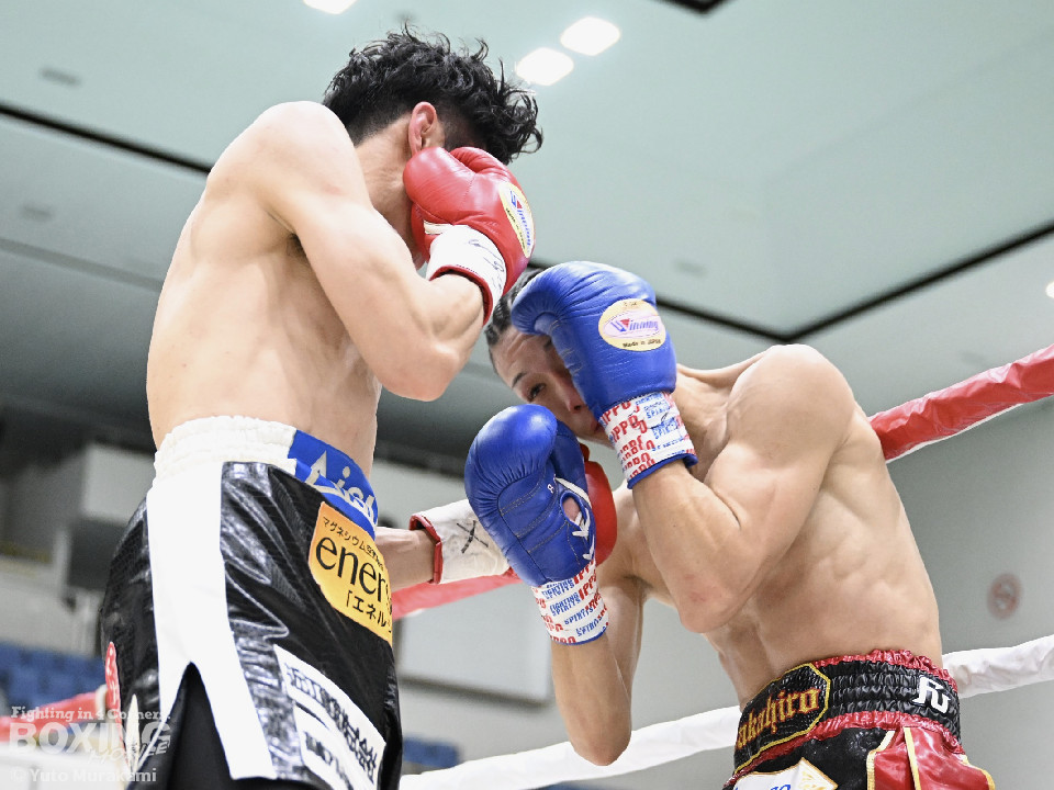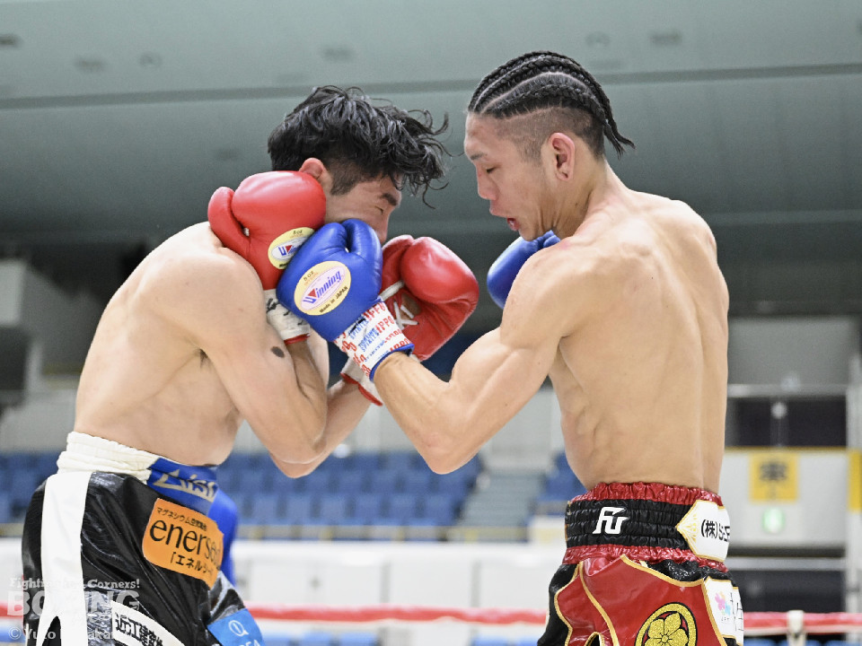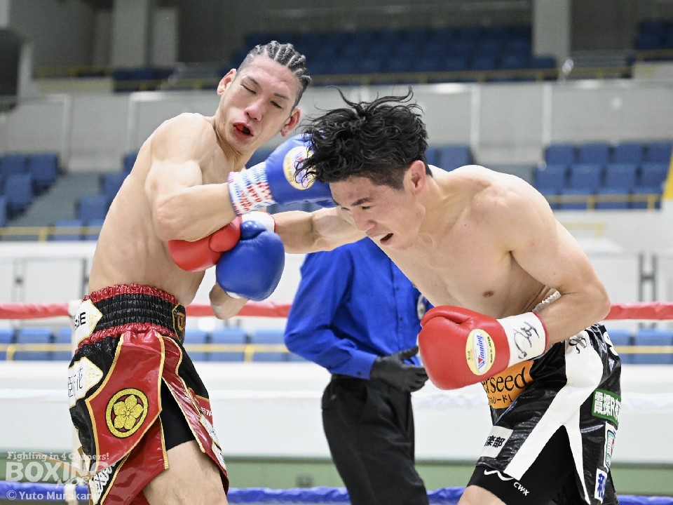 試合:田井が独特なタイミングとステップでパンチを放つ。終了間際には前に出ながら顔面にパンチを集め、青山をコーナーまで下がらせる。2回、青山がストレートを軸に前に出ると田井が左フックを合わせ、一度目のダウンを奪う。立ち上がる青山に追撃しロープまで追い詰めパンチを集めるが仕留めきれずゴングがなる。3回、打ち疲れが見える田井に今度は青山が襲いかかる。ロープに詰め田井を釘付けにする。その後も被弾をもろともせず青山が前に出て攻勢をアピール。4回、息を吹き返した田井がスイッチを繰り返しストレートを差し込む。5回、青山がプレスをかけ近い距離からフックを狙う。田井は軽打の連打でヒット数を稼ぐと、サイドチェンジから強打のフックを当てる。6回、田井が回転数を上げボディから顔面へとヒット数を増やす。青山も右フックを要所で当て主導権は握らせない。7回、田井がコンビネーションを放てば青山が右フックをカウンターで当て、一進一退の攻防。最終回、互いに手数を緩めずに打ち合い、試合終了直前は田井が一気に攻め、青山をロープぎわに追い込み見せ場を作った。判定はダウンを奪い、試合をコントロールした田井が勝利を挙げた。