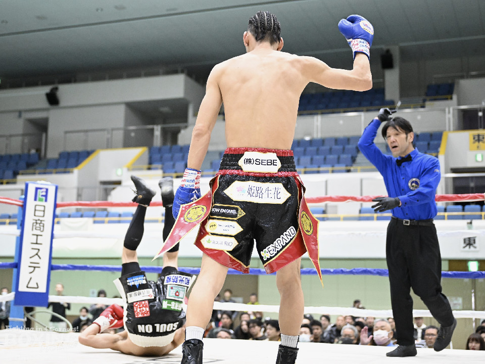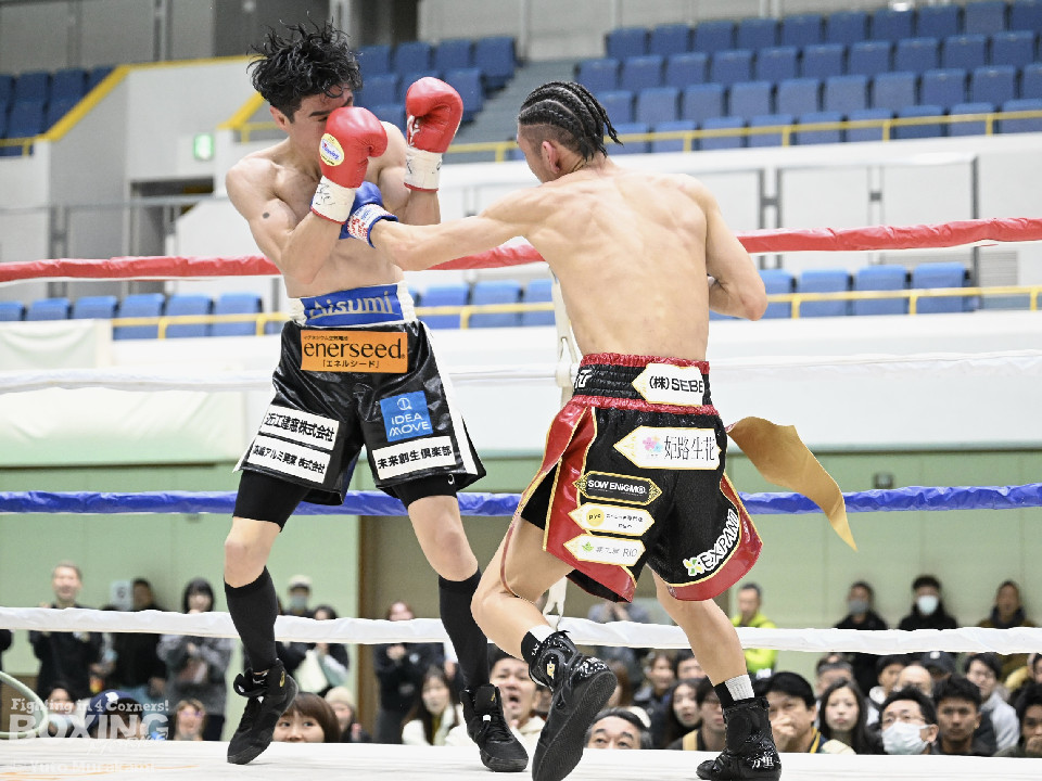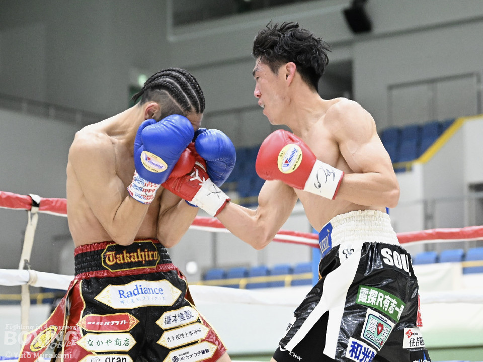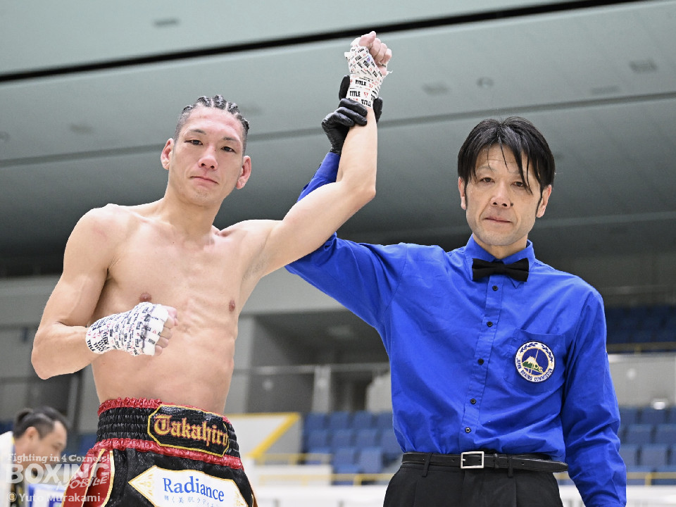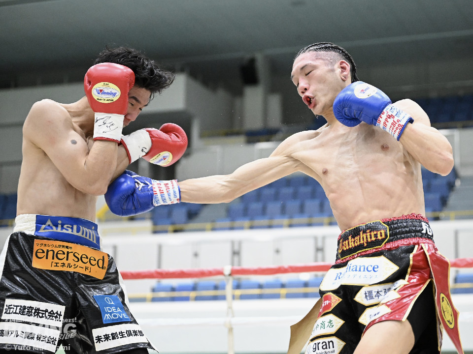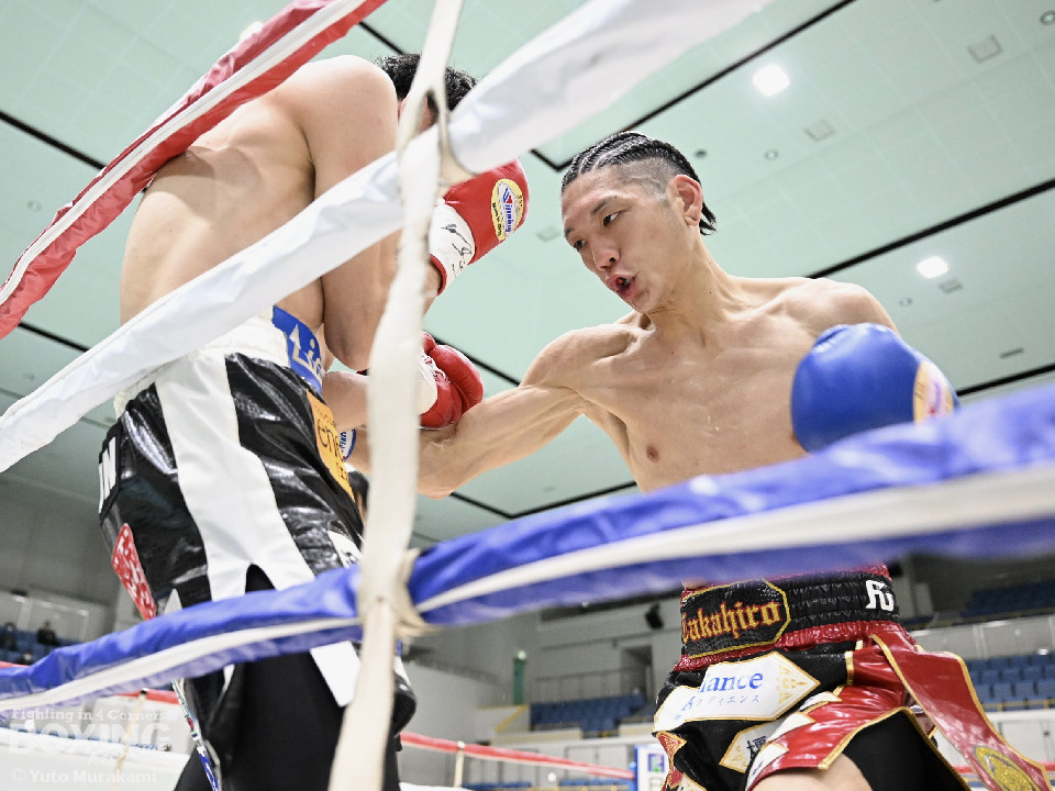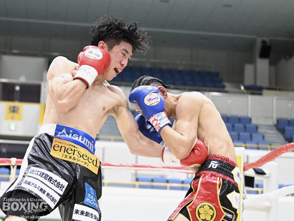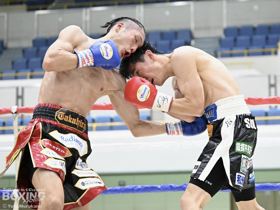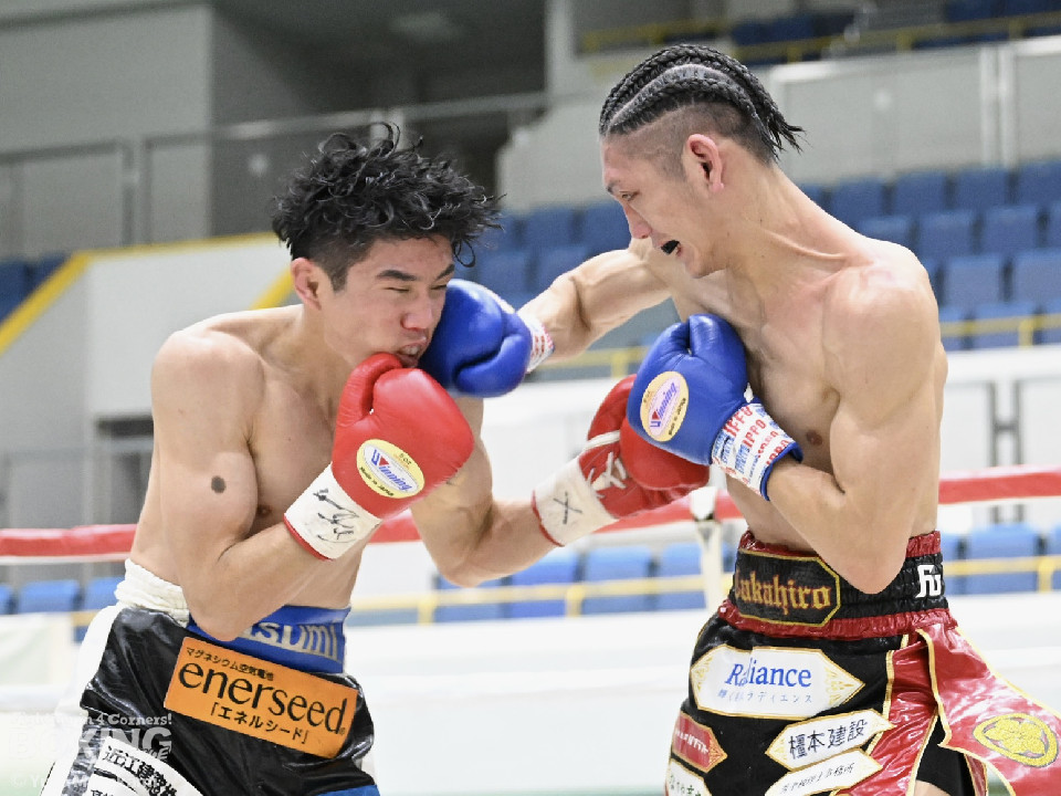 試合:田井が独特なタイミングとステップでパンチを放つ。終了間際には前に出ながら顔面にパンチを集め、青山をコーナーまで下がらせる。2回、青山がストレートを軸に前に出ると田井が左フックを合わせ、一度目のダウンを奪う。立ち上がる青山に追撃しロープまで追い詰めパンチを集めるが仕留めきれずゴングがなる。3回、打ち疲れが見える田井に今度は青山が襲いかかる。ロープに詰め田井を釘付けにする。その後も被弾をもろともせず青山が前に出て攻勢をアピール。4回、息を吹き返した田井がスイッチを繰り返しストレートを差し込む。5回、青山がプレスをかけ近い距離からフックを狙う。田井は軽打の連打でヒット数を稼ぐと、サイドチェンジから強打のフックを当てる。6回、田井が回転数を上げボディから顔面へとヒット数を増やす。青山も右フックを要所で当て主導権は握らせない。7回、田井がコンビネーションを放てば青山が右フックをカウンターで当て、一進一退の攻防。最終回、互いに手数を緩めずに打ち合い、試合終了直前は田井が一気に攻め、青山をロープぎわに追い込み見せ場を作った。判定はダウンを奪い、試合をコントロールした田井が勝利を挙げた。