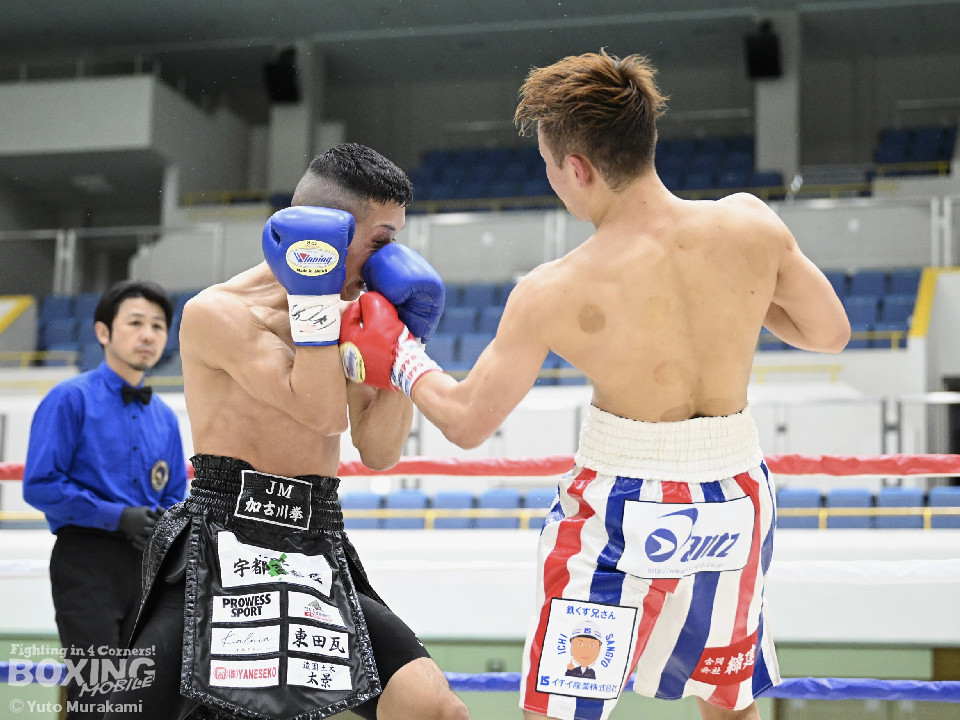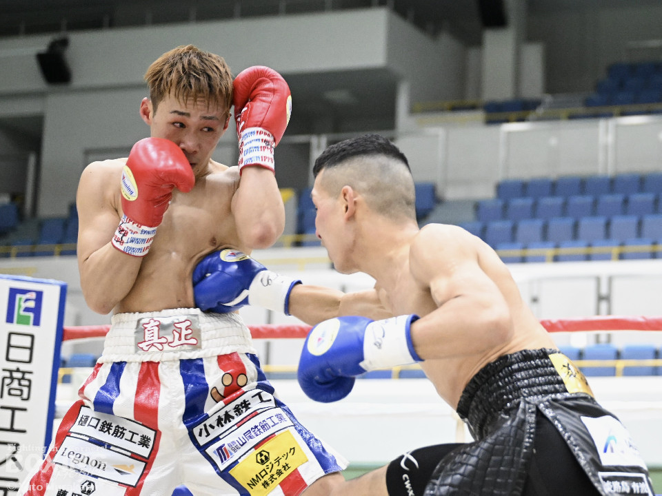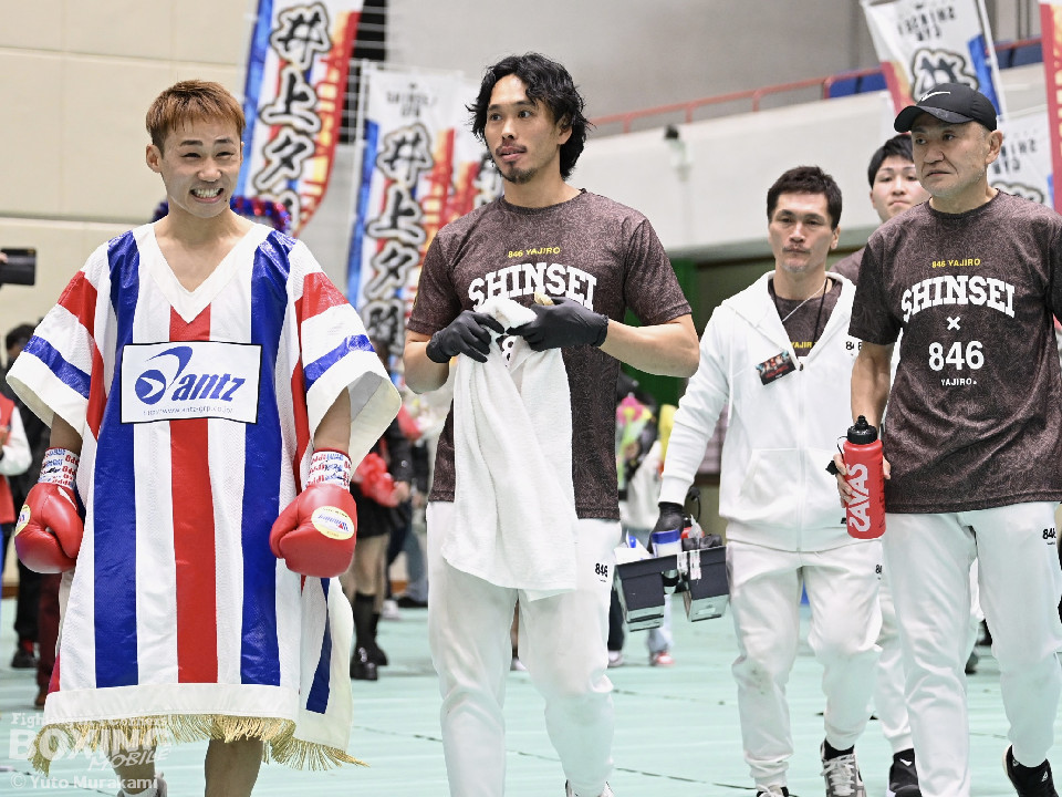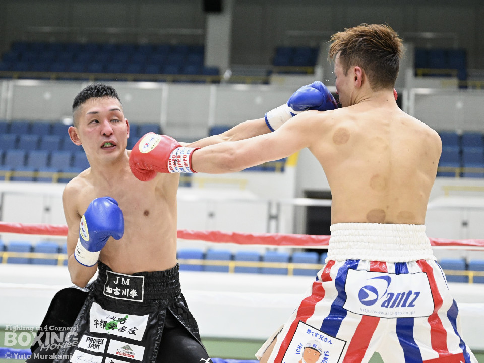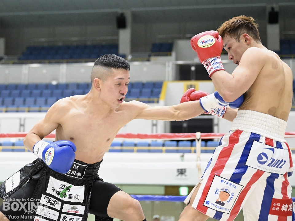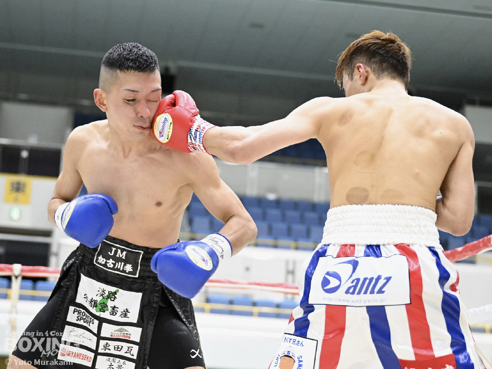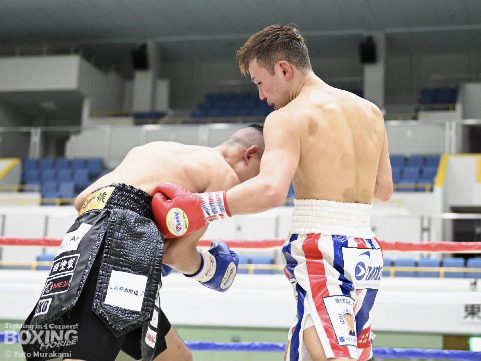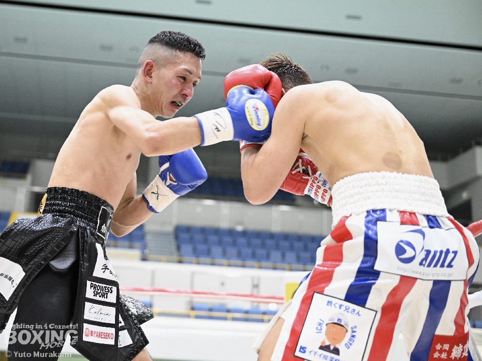 試合:湊が細かくステップを刻みジャブを伸ばし、飛び込みながら右ストレート放つ。井上はどっしり構え相手の出方を伺い、ラウンド終盤はプレスを強め、左フックをヒット。2回、湊の飛び込んでのフックをバックステップでかわした井上はフェイントを交えながら左フック、右ストレートをクリーンヒット。3回、ステップを刻み、パンチの回転数を上げた湊がコンビネーションを顔面に集めると井上もボディから顔面にパンチを繋げる。4回、湊がジャブで井上を下がらせ、右ストレートをクリーンヒットする場面を作る。5回も湊が前に出てジャブを軸にボクシングを組み立てる。井上は被弾数が増え、後手に回る。ラウンド終盤に井上がコンビネーションを顔面にヒットするが湊の勢いは止まらずゴング。6回、湊がジャブを突き刺すと井上もカウンターで左フックを返し、打ち合う展開となり、一進一退の攻防。7回、開始からお互い体をくっつけ打ち合う。湊は左右フック、井上は要所で右ストレートを打ち下ろす。湊は最後まで手数を緩めず打ち続けるが、井上のカウンターのフックが決まり、一瞬止まる。最終回、お互い勝負を決めるべく打ち合う展開になる。死力を尽くした試合の勝敗は判定となり、的確にジャブを当て続け最後まで手数を緩めなかった湊が勝利を上げた。