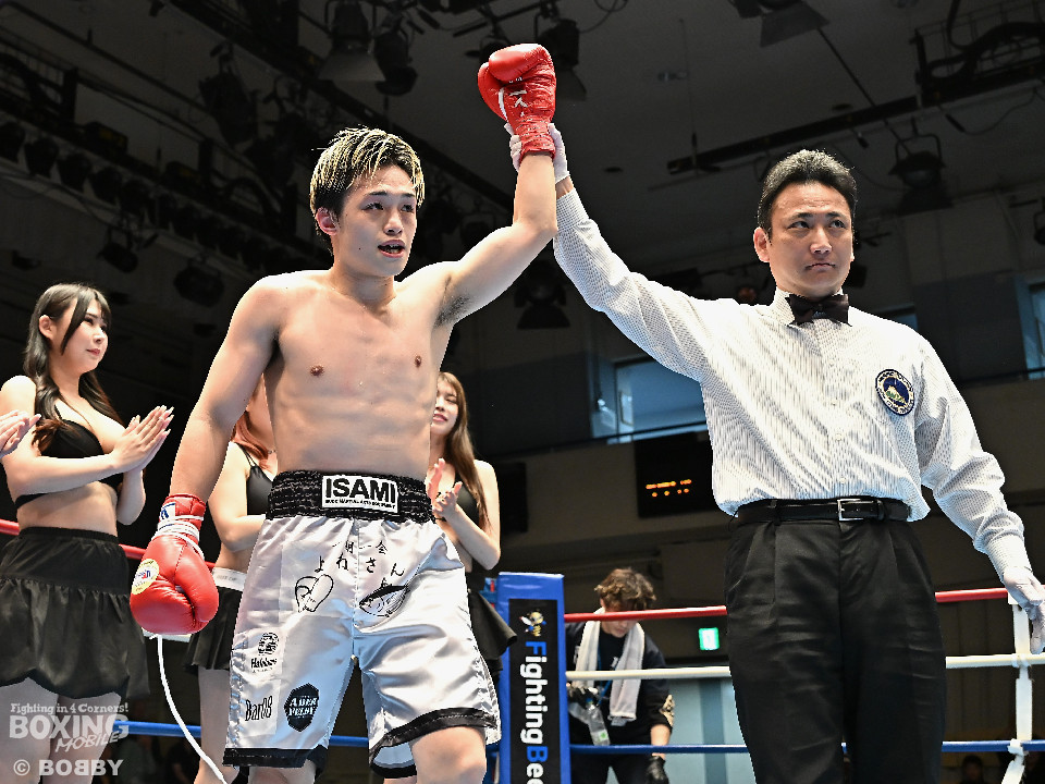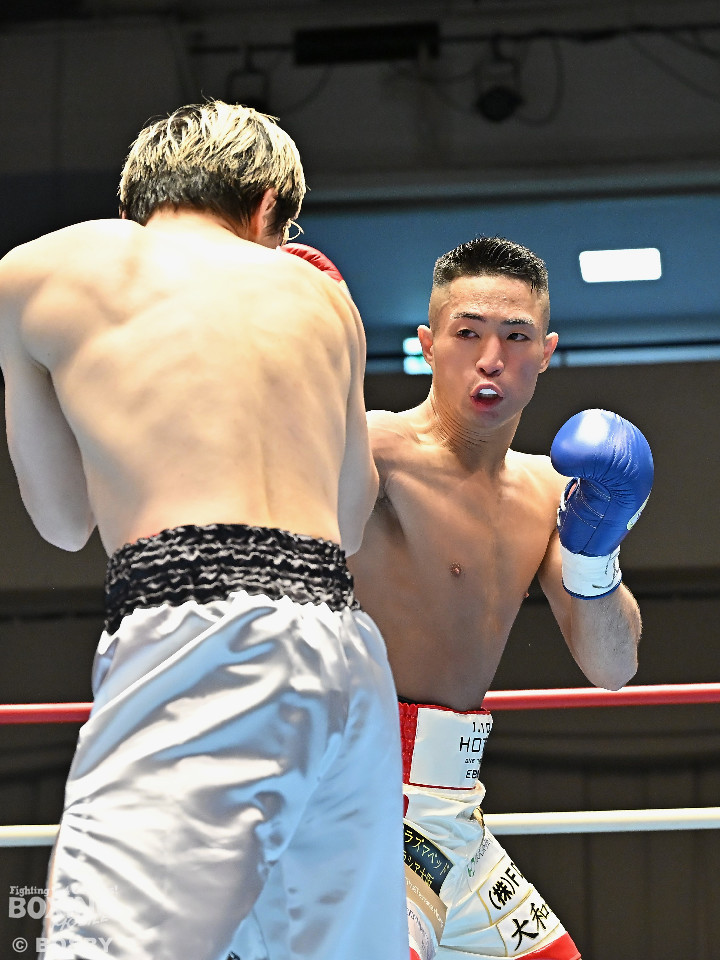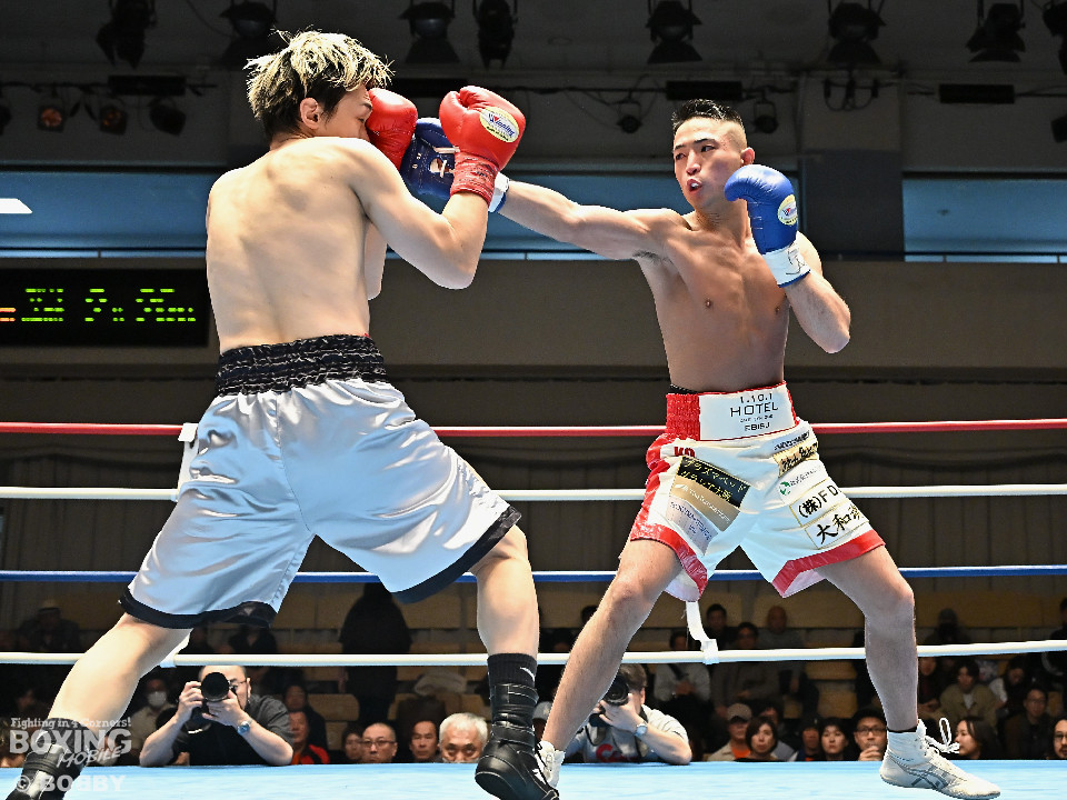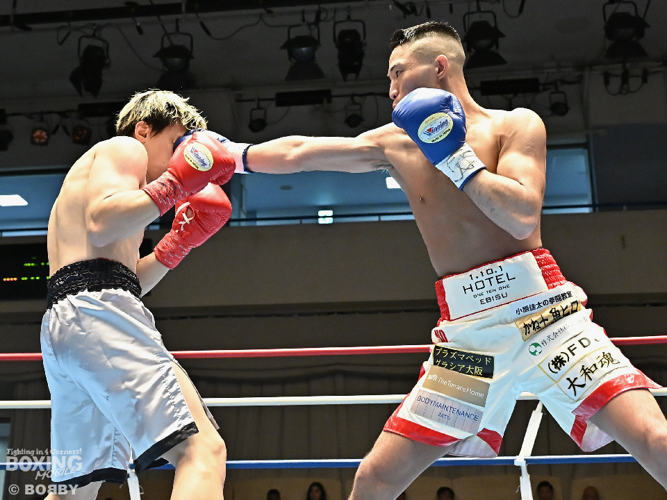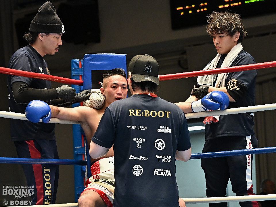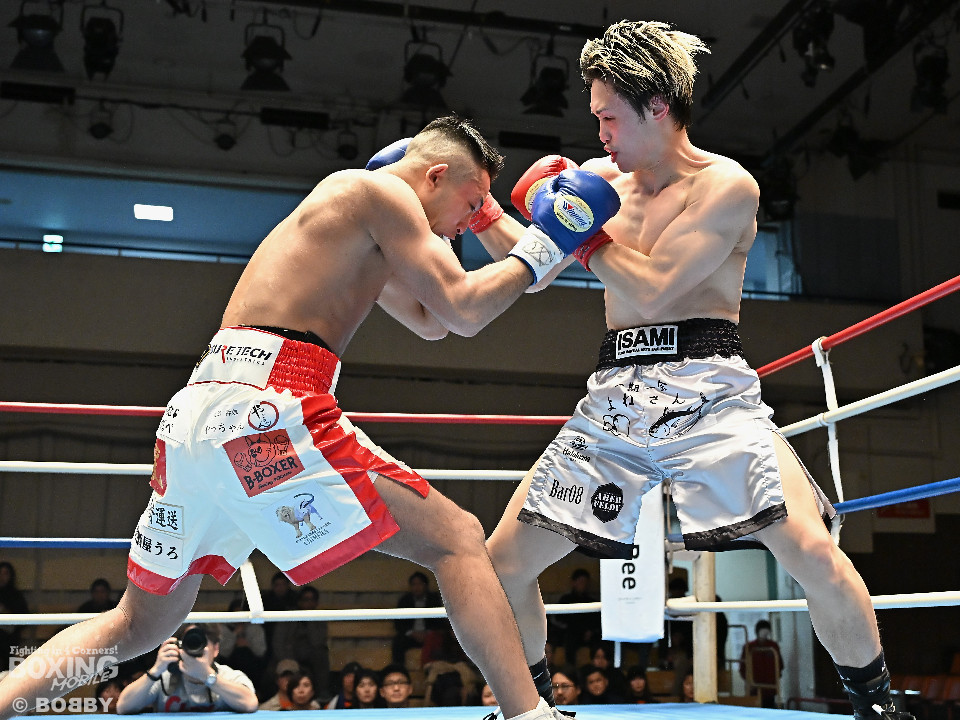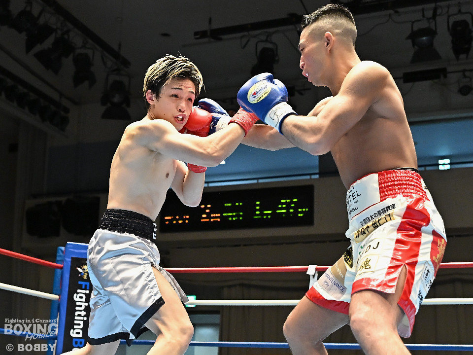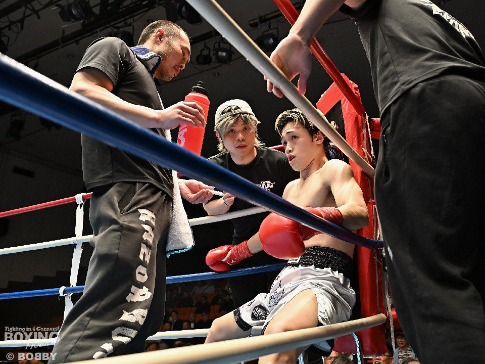 試合:元日本ユース・バンタム級王者の金城と6戦全勝(6KO)の矢代が拳を交えた。サウスポー同士による一戦は、金城がジャブで距離をキープしながらワンツーで顔を弾くとワンツーを好打。2回、金城は左アッパーで膝を揺らすとジャブで突き放しペースを維持。3回、矢代はプレスをかけてタイミングを探ると右フックで痛烈なダウンを奪うとレフェリーはノーカウントでストップした。矢代が日本ランカーを撃破した。
