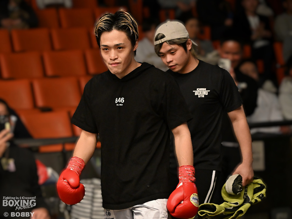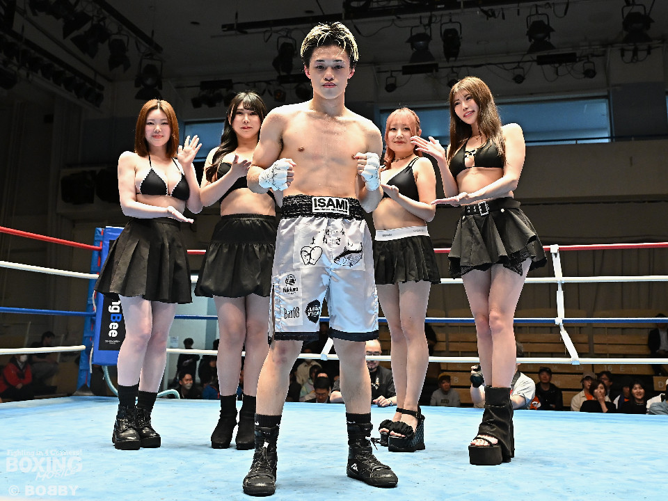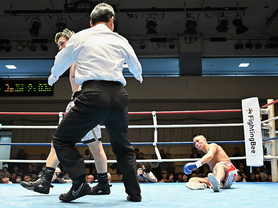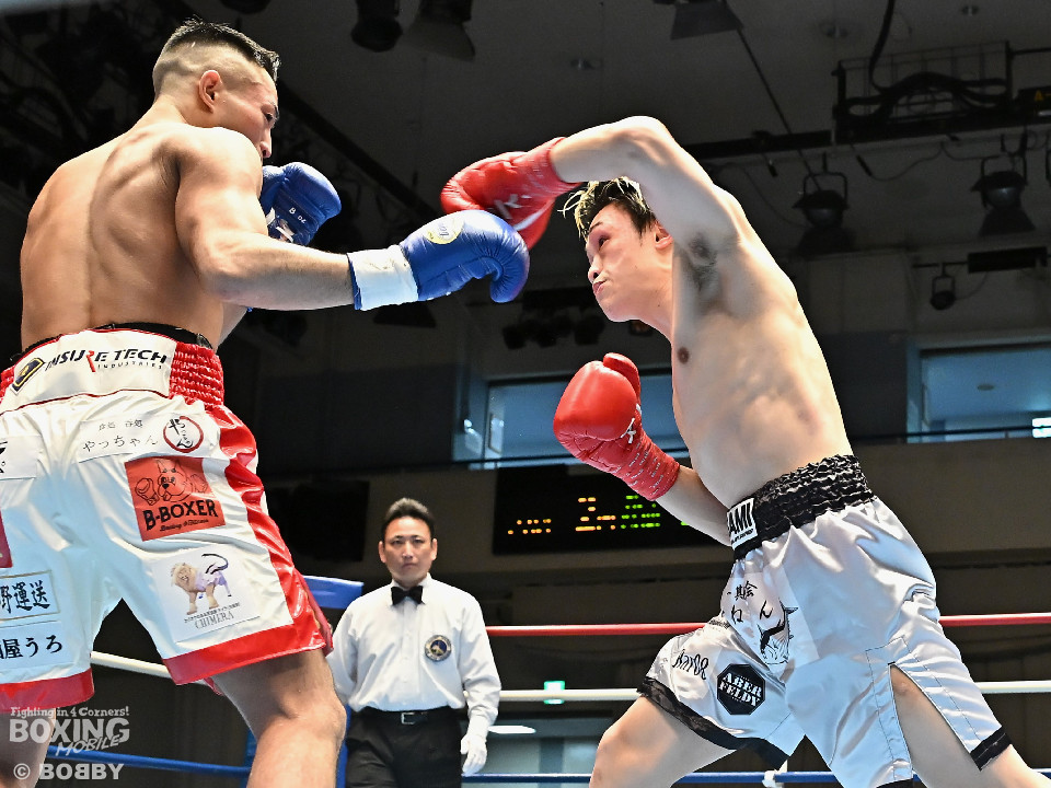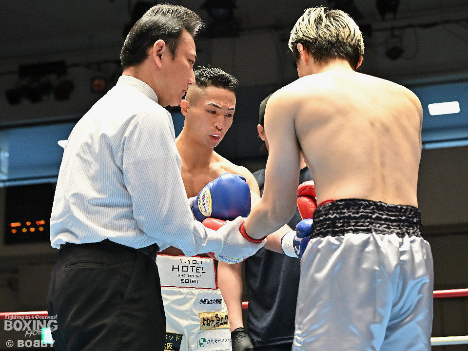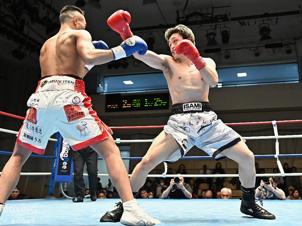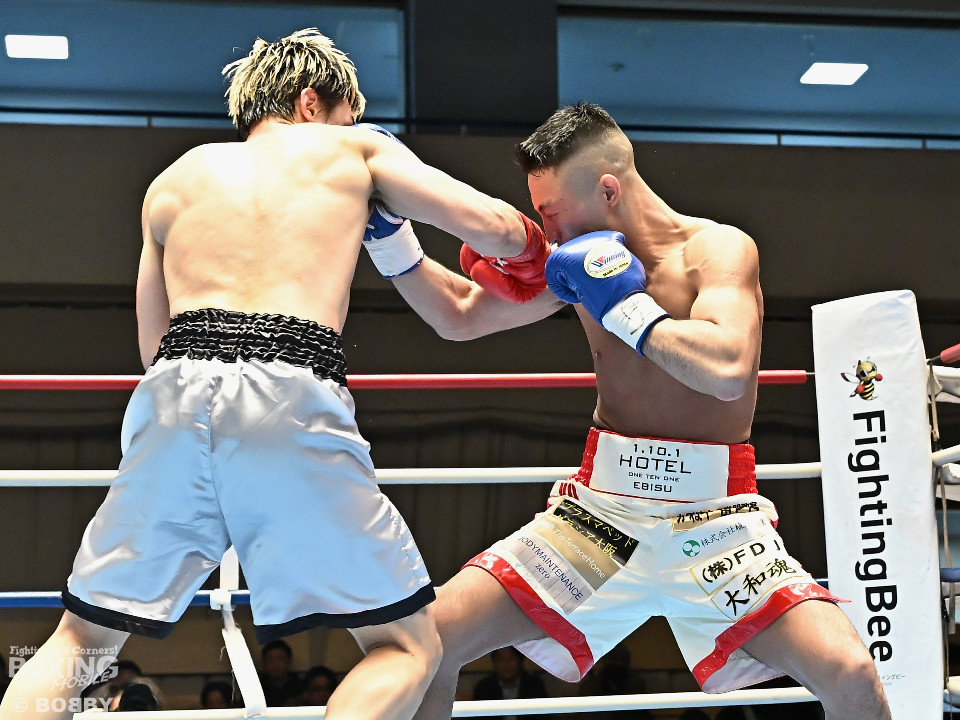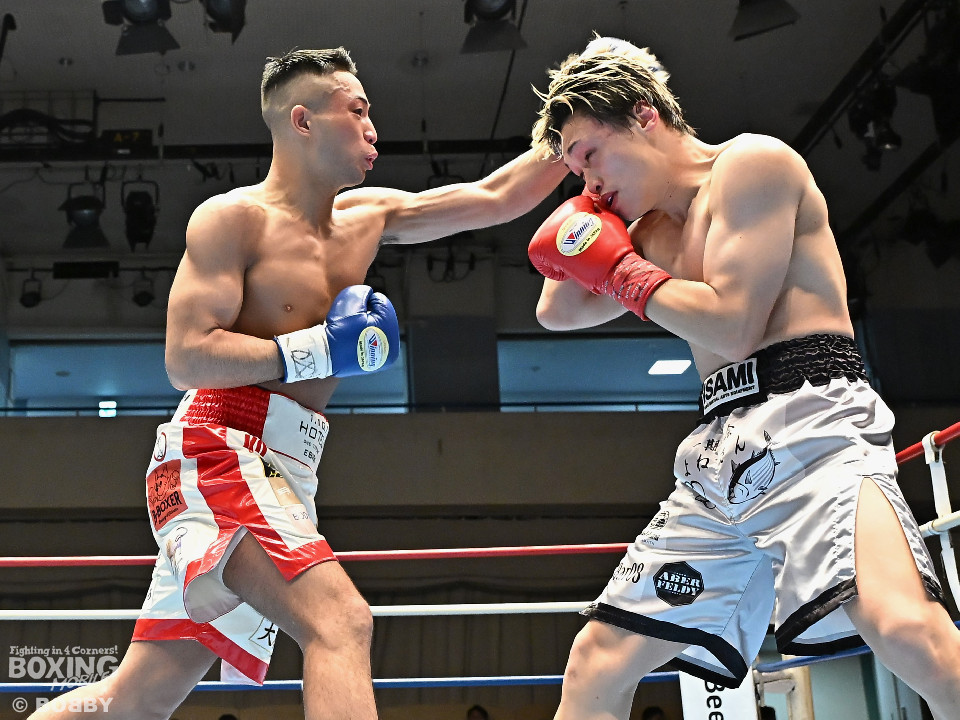 試合:元日本ユース・バンタム級王者の金城と6戦全勝(6KO)の矢代が拳を交えた。サウスポー同士による一戦は、金城がジャブで距離をキープしながらワンツーで顔を弾くとワンツーを好打。2回、金城は左アッパーで膝を揺らすとジャブで突き放しペースを維持。3回、矢代はプレスをかけてタイミングを探ると右フックで痛烈なダウンを奪うとレフェリーはノーカウントでストップした。矢代が日本ランカーを撃破した。