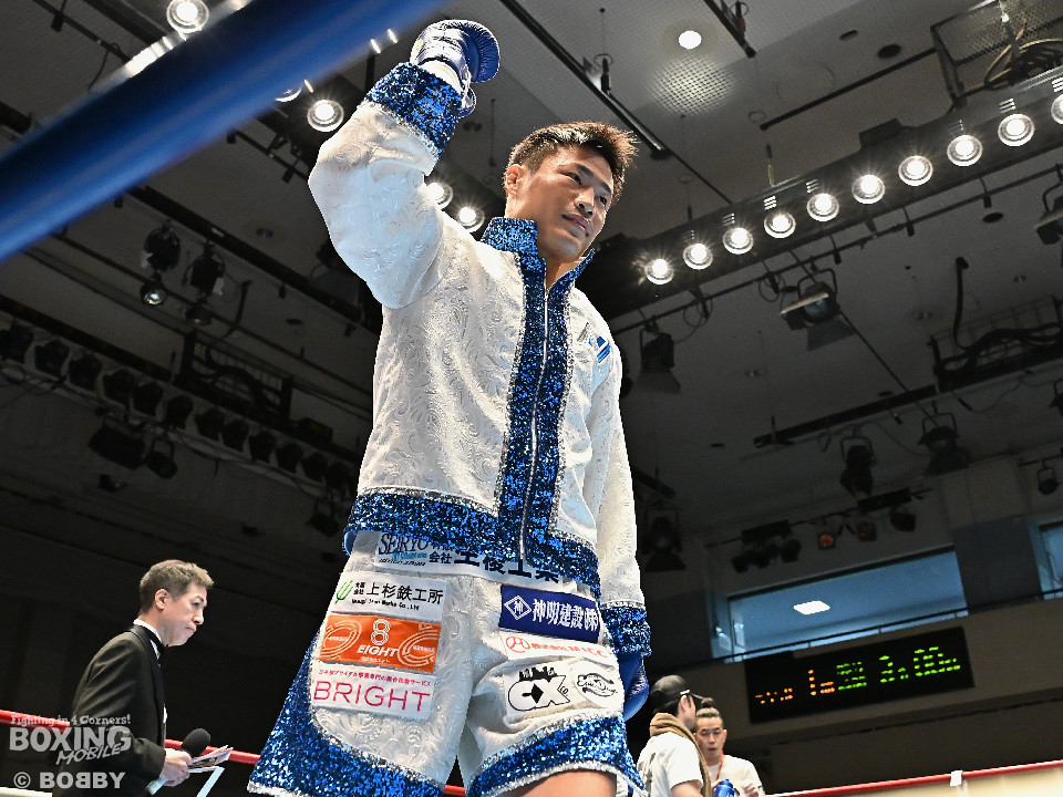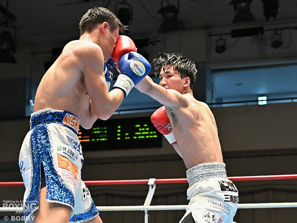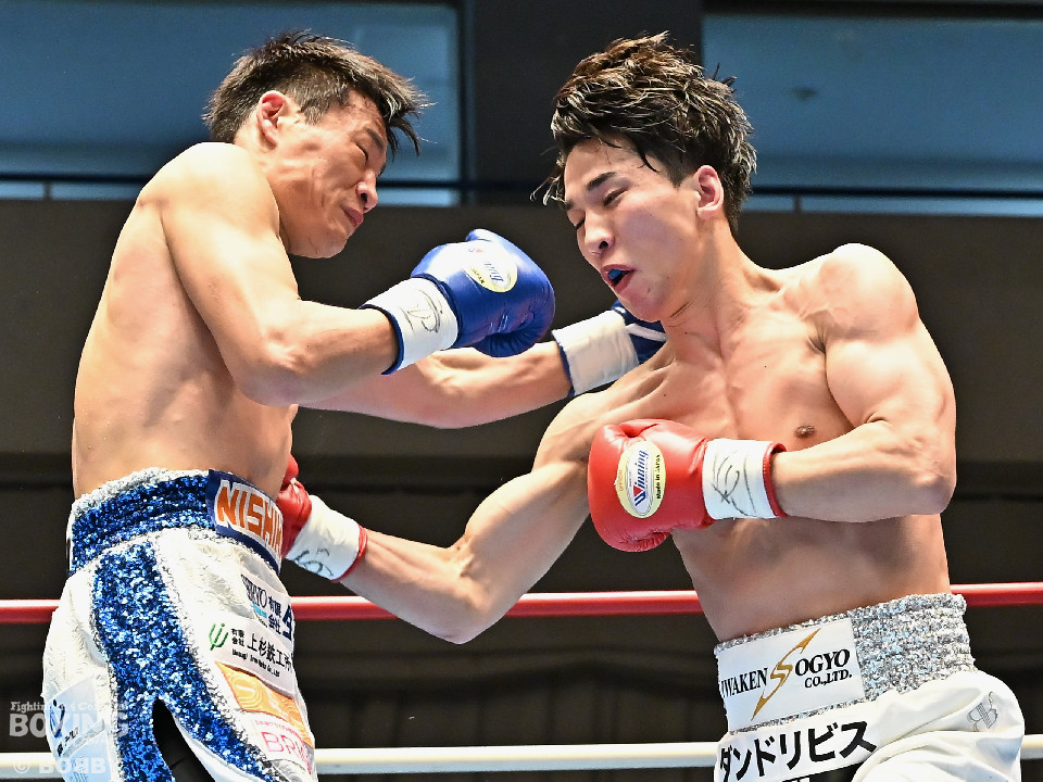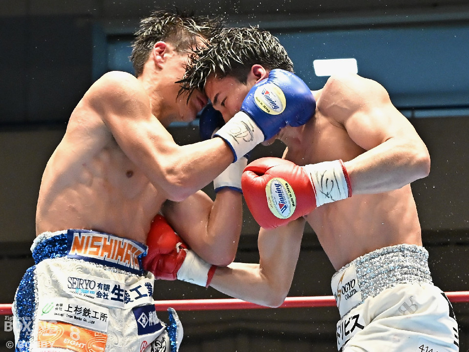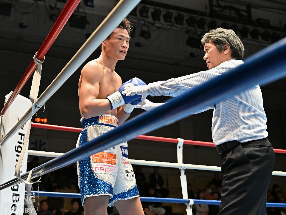 試合:フェイントをかけつつ機会を探った榊野は右フックで先制、左右ボディを好打した。2回、榊野はワンツーをヒット、ジャブから右ボディにつなげた。3回、挽回すべく攻勢を強めた西畑に対し、榊野はジャブから右ボディを突き刺すとワンツーで顔を跳ね上げた。4回、パンチを上下に散らした榊野は右フックでダウンを先取、再開後はボディにパンチを集めた。5回、近距離の打ち合いでは左フックを決めた榊野に対し、西畑は右をヒット、右ボディを好打した。6回、ジャブから右ボディにつなげた西畑はワンツーで顔を跳ね上げると右フックでポイントを重ねた。7回、左フックを叩きつけた榊野はワンツーをヒット。西畑もワンツーで反撃した。8回、榊野はワンツーを左フックまで返し、優勢をアピール。西畑にロープを背負わせてパンチをまとめると西畑はワンツーで反撃し意地を見せた。結果は3者の支持を得た榊野が再起戦を勝利。ランキング復活を確実とした。