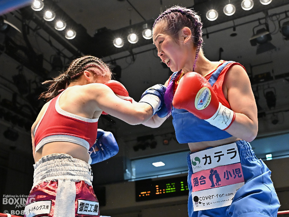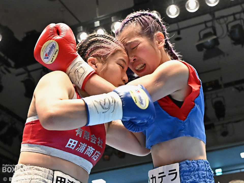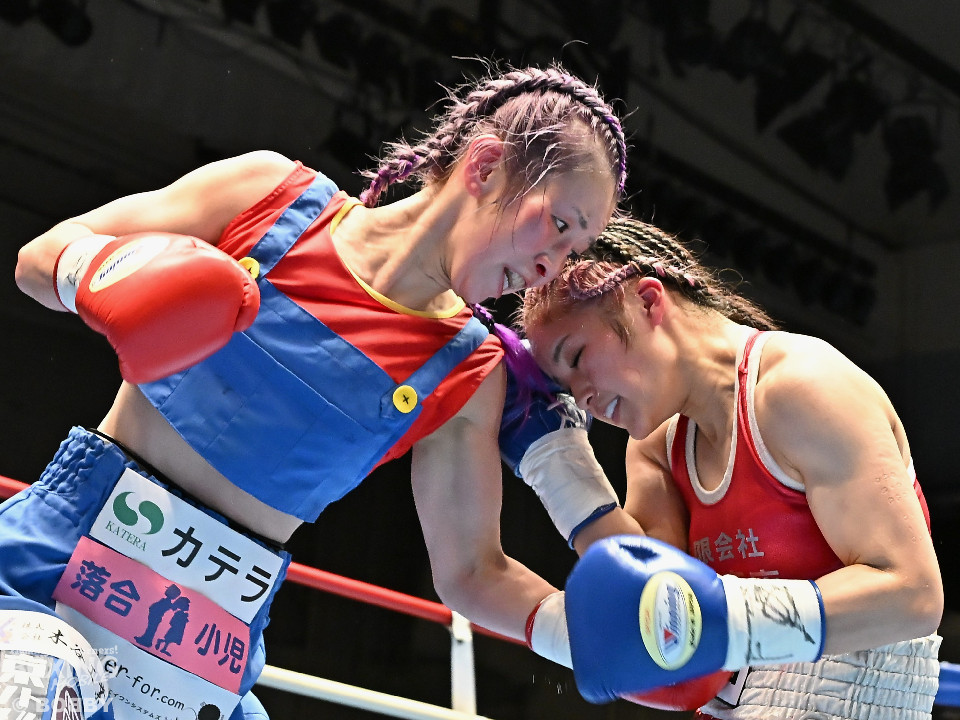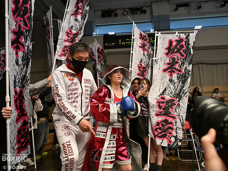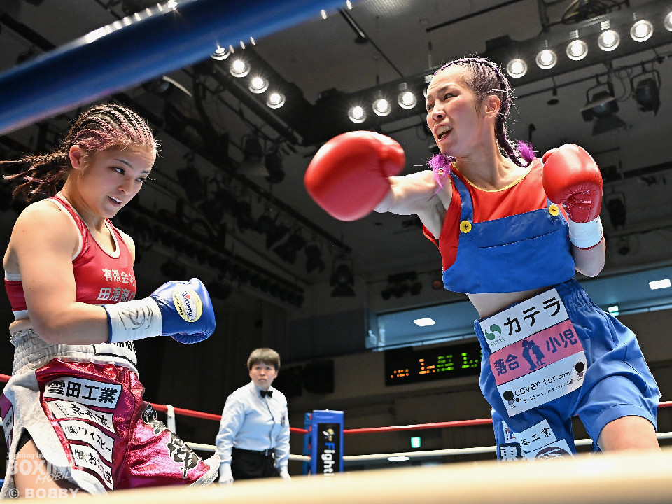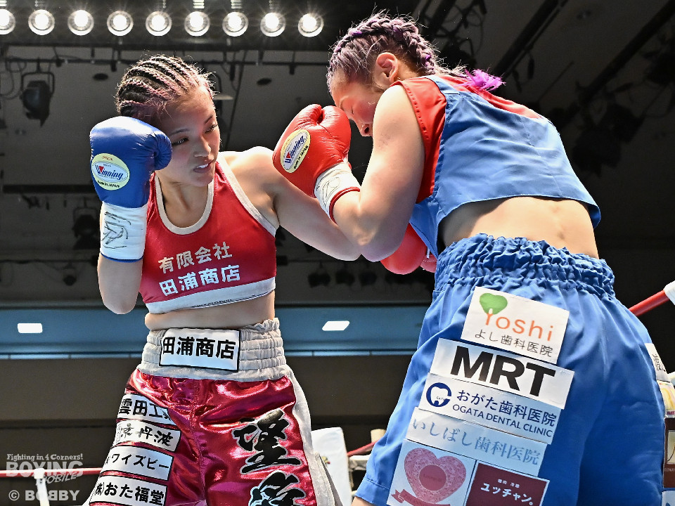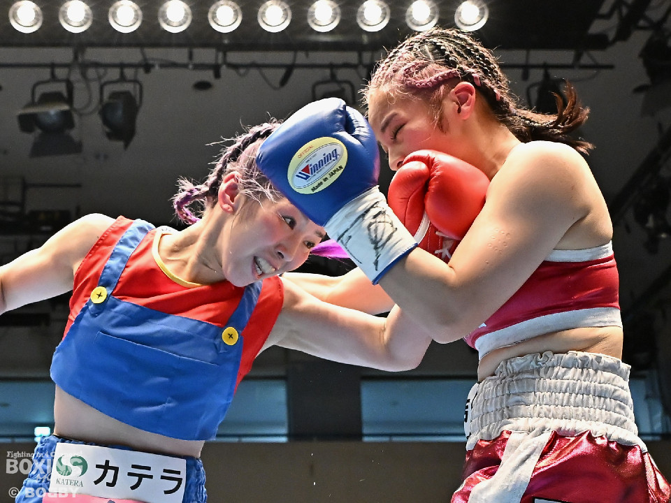 試合:日本アトム級王者のモンブランみきがランキング1位の坂本を相手に2度目の防衛戦に臨んだ。モンブランがプレスをかけてジャブから左ボディで先制攻撃。対する坂本は表情を変えず足を使いながら要所でワンツーを返した。2回、坂本は出入りを意識しながらワンツーで反撃。モンブランはボディにパンチを集めて動きを止めに行った。3回、モンブランはボディを突き刺し積極的な攻撃。頭がぶつかり両者とも前頭部を腫らした。4回、坂本はワンツーを軸にメリハリのある攻撃で見栄えの良さをアピール。5回、偶然のバッティングでモンブランは左目下を負傷。その後は激しいパンチの応酬で譲らず。6回、モンブランはプッシュしながら豊富な手数で攻め立てた。2~4ポイント差をつけたモンブランが王座防衛に成功した。