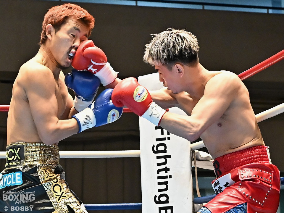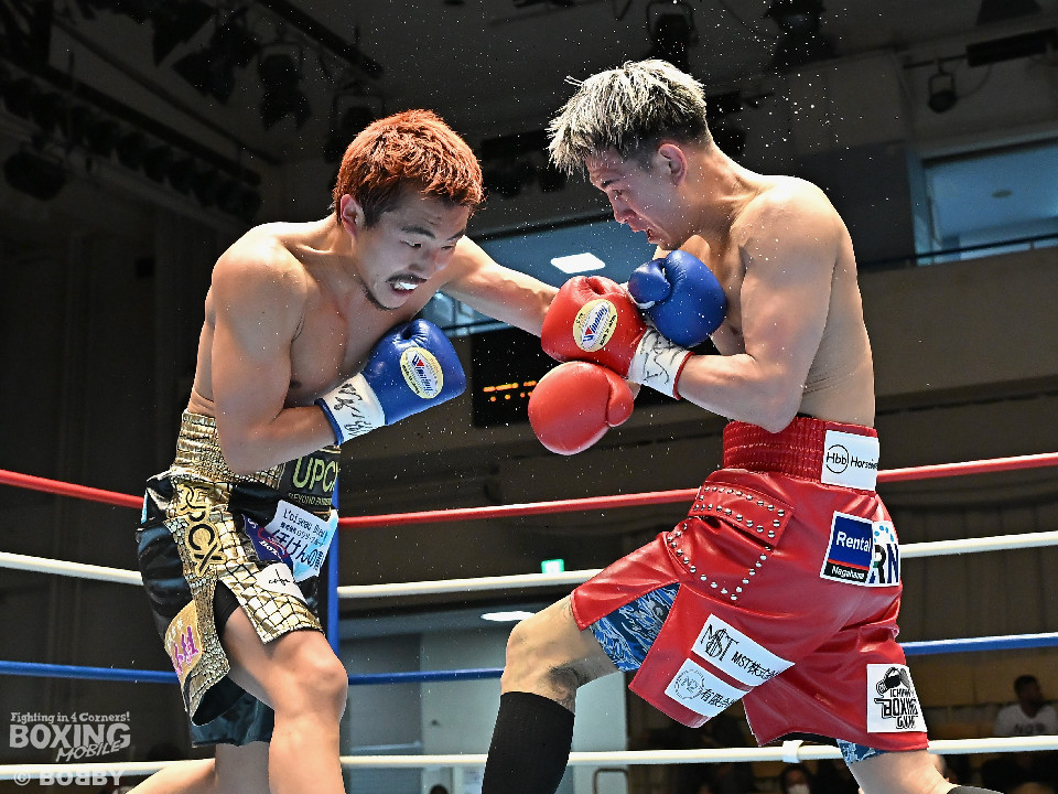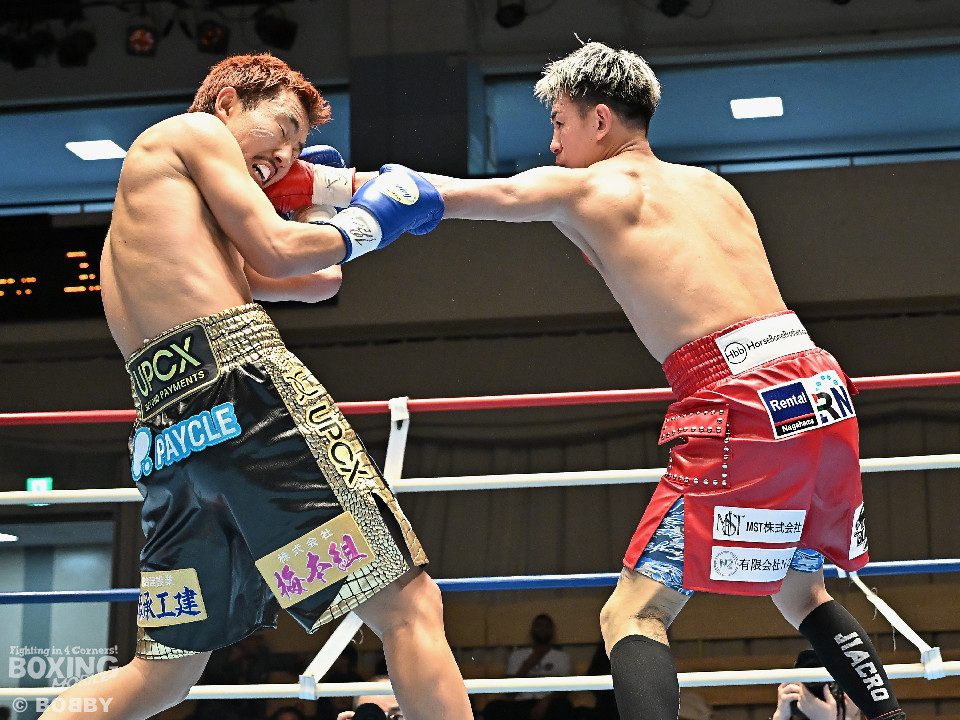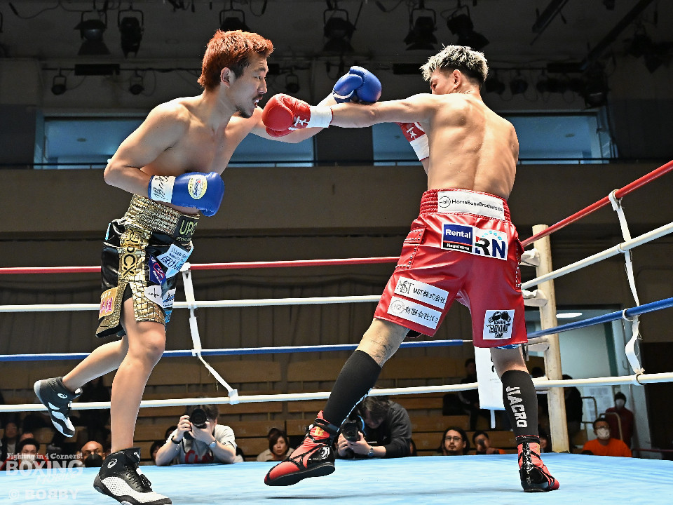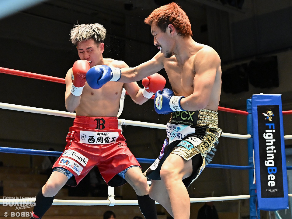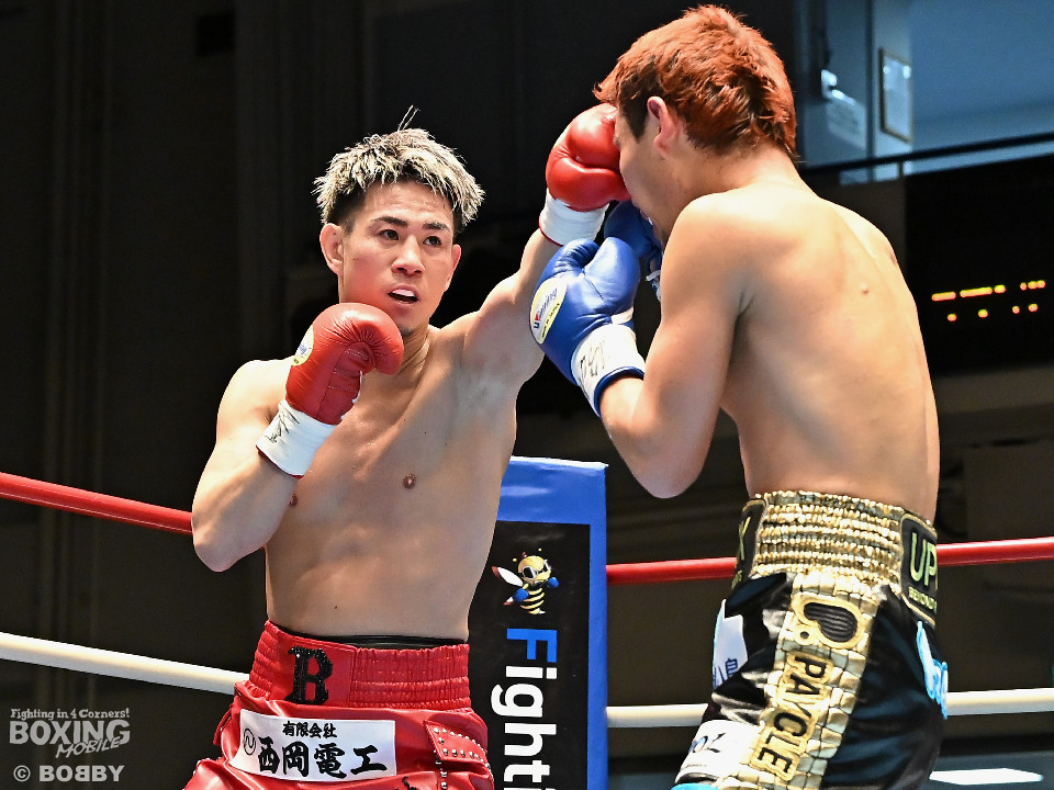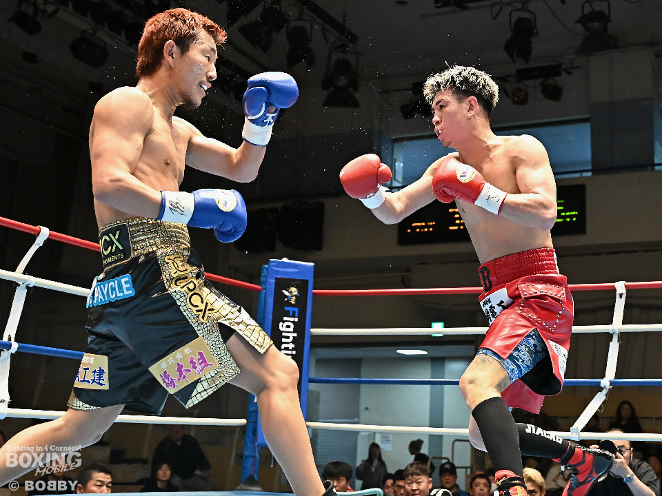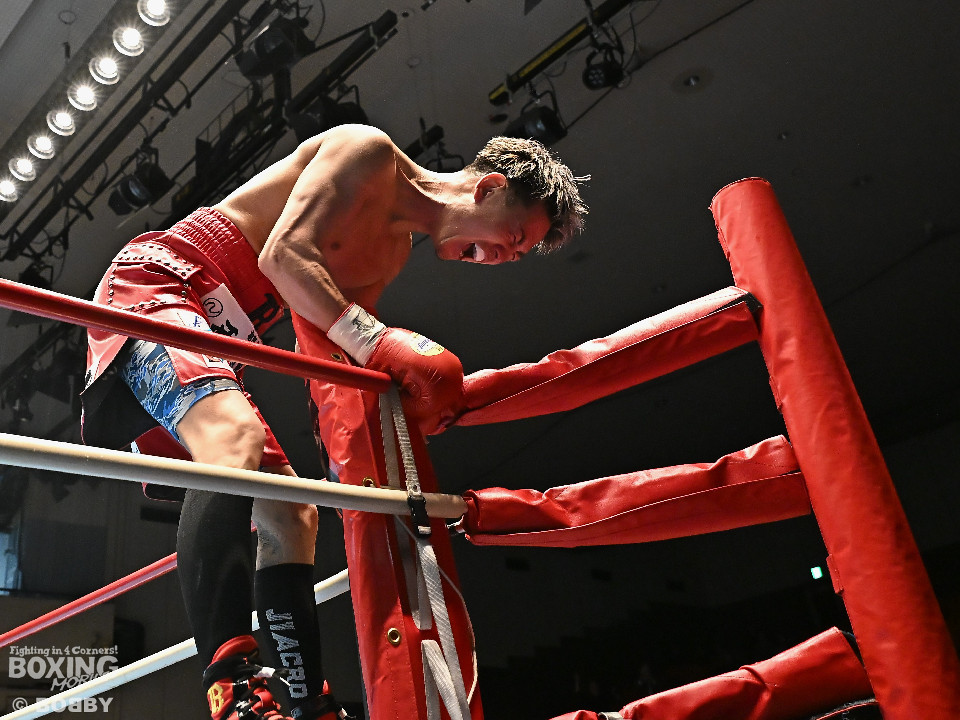 試合:池田がジリジリと距離を詰めるとノーモーションの右をヒット。2回、池田は右オーバーハンドで脅かすと上下に打ち分けアグレッシブな姿勢。しかし、サウスポー寺田は負けじと左ボディストレートを返した。3回、中間距離でスリリングな攻防を見せる中、池田が左フックでグラつかせて優勢を印象付けた。4回、寺田は左ボディストレートから右フックで反撃に転じるが、池田は右カウンターダウンを奪取。立ち上った寺田だったが、足元がふらついたのを見たレフェリーがストップした。日本ランカーの池田がメインイベントを締めた。