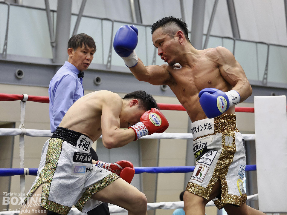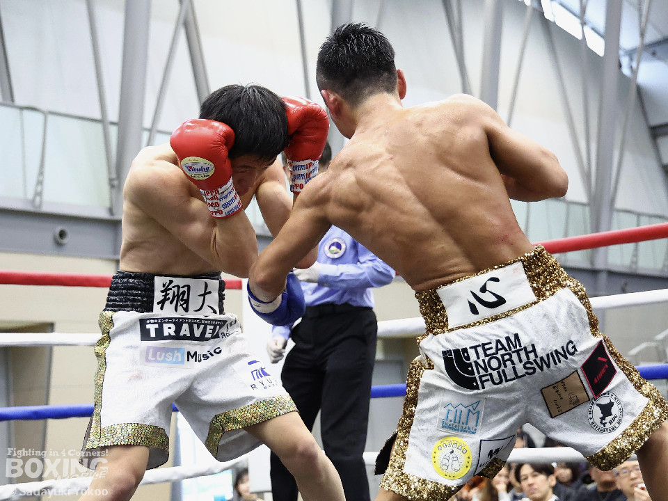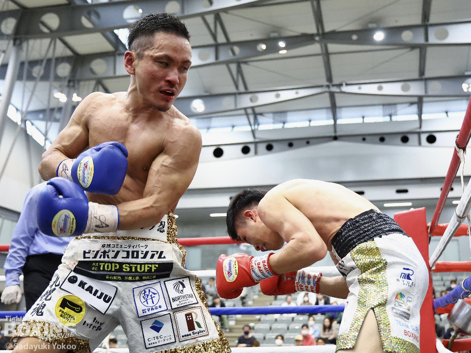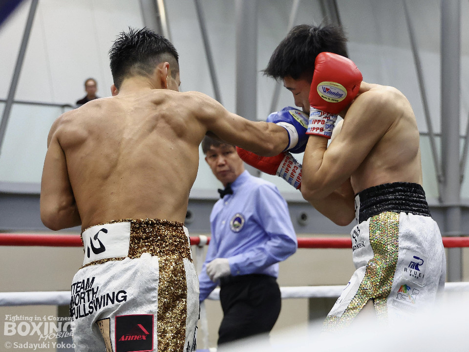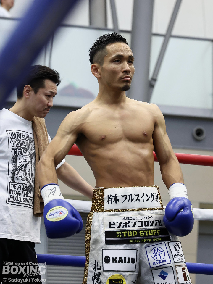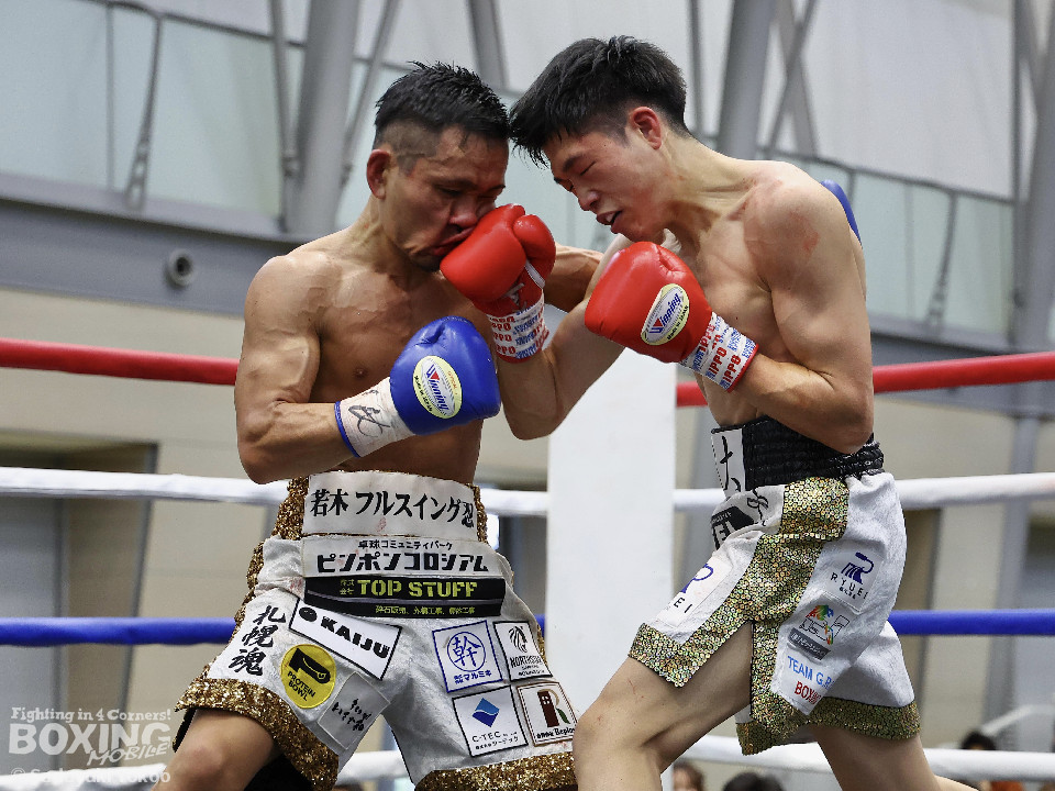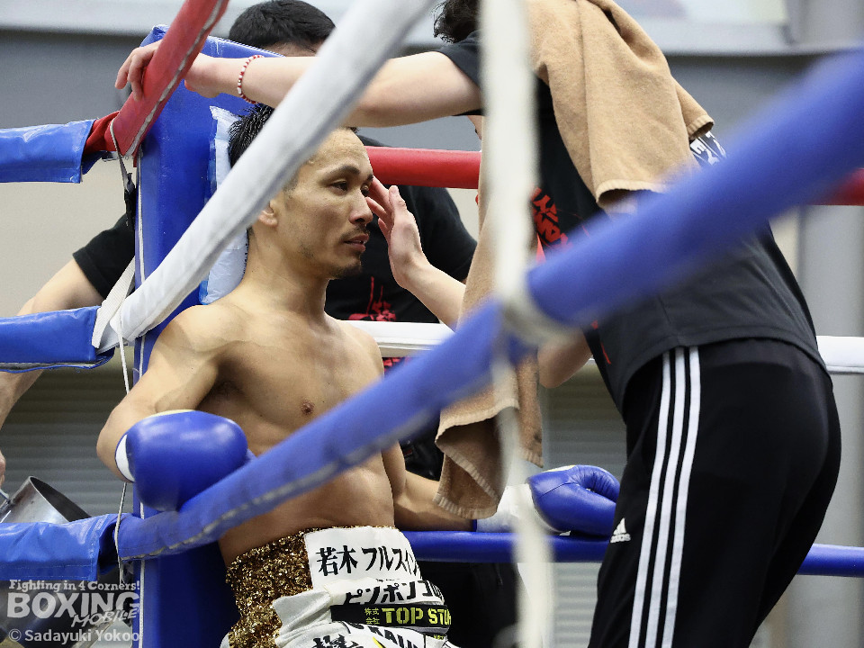 試合:若木がジリジリと距離を詰めて右ボディストレートを差し込み先制攻撃。2回、ボディの削り合いで我慢比べに発展。その中で若木の左ボディの見栄えが上回った印象。3回、藤本はジャブからワンツーにつなげるが、若木は反応の良さを見せると左ボディを好打しポイントを加点。4回、藤本は体が密着した状態からコツコツと当てて反撃。5回、一進一退の攻防を繰り広げる中、藤本の試合運びが上回った。6回、若木がワンツー左ボディを好打すると積極的な攻撃で優勢を印象付けた。ジャッジ2者の支持を得た若木がA級昇格を決めた。