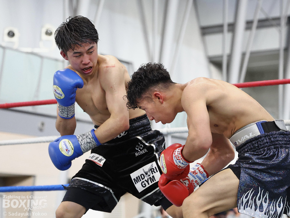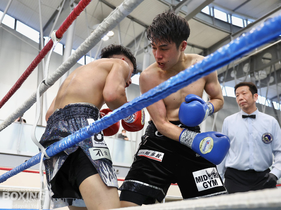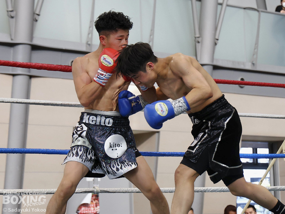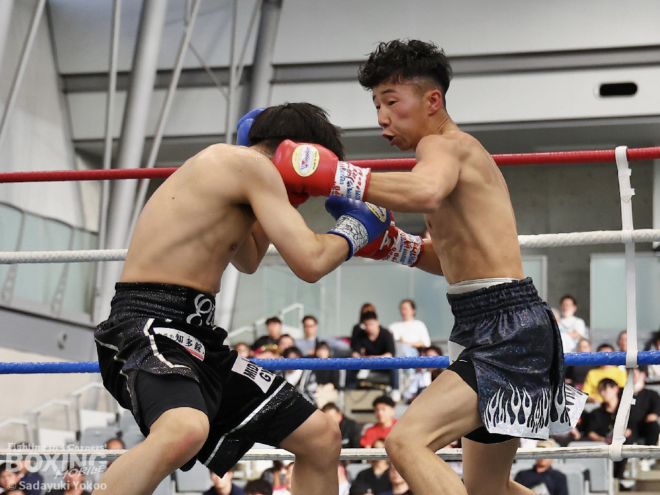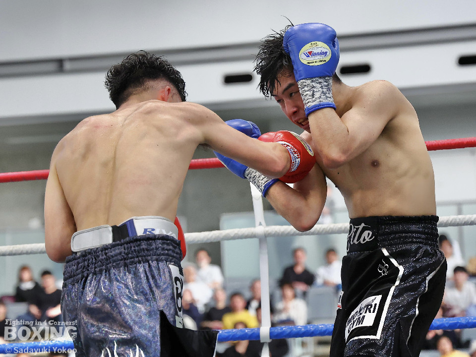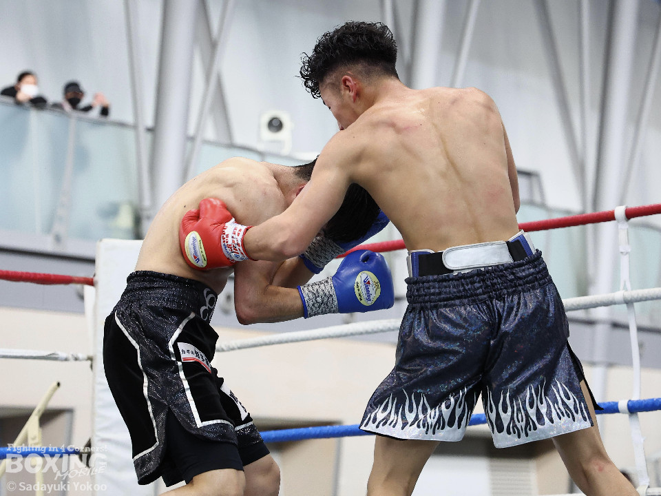 試合:フェイントをかけつつジャブの差し合いからスタート。ツーワンツーをヒットした後藤は左を上下に散らした。2回、横山は右でぐらつかせると後藤はたまらずクリンチ。横山は連打をまとめ、左フックから右につなげた。3回、左を上下に散らした後藤は左フックで動きを止めた横山に連打をまとめた。4回、互いの意地をかけた打撃戦。総力を尽くした打ち合いに会場もヒートアップした。熱戦の結果はドローとなり、決着はつかなかった。
