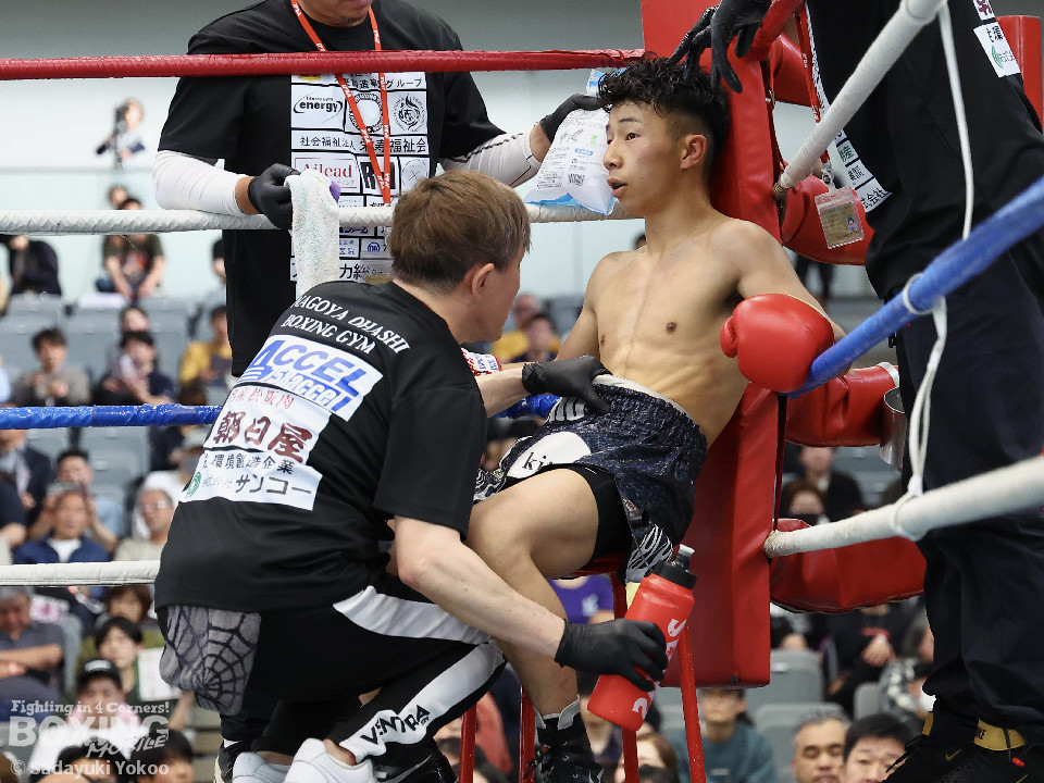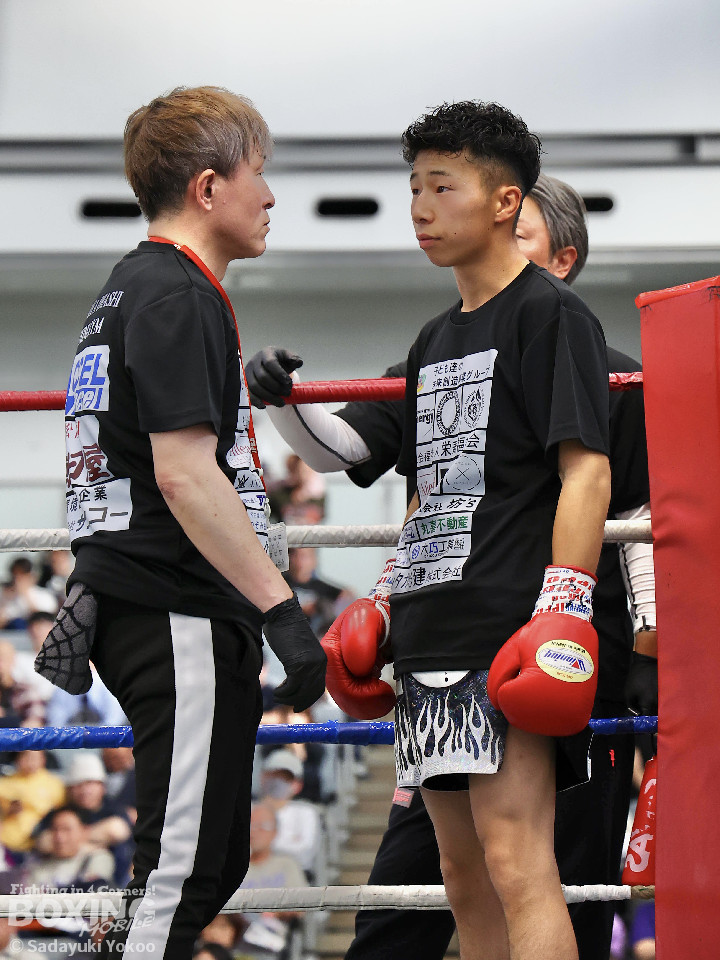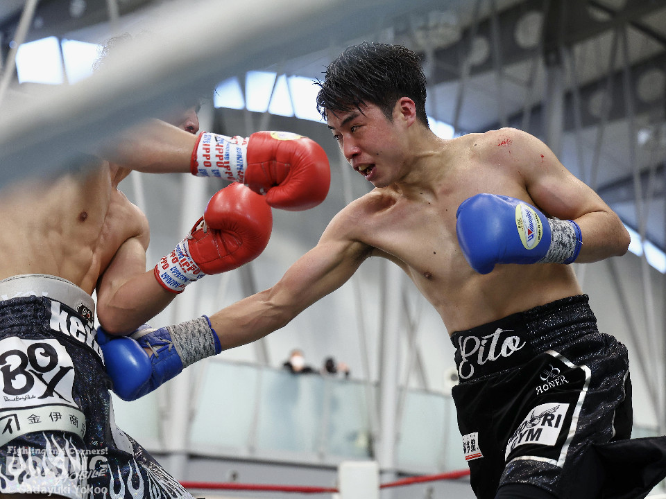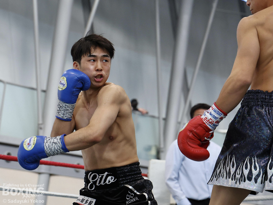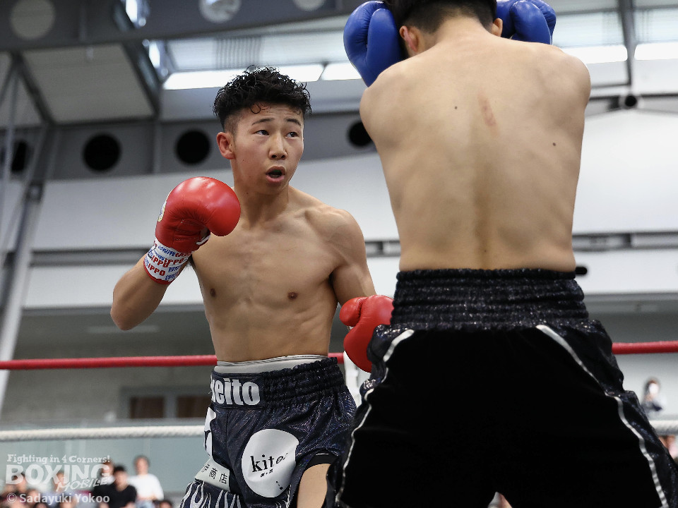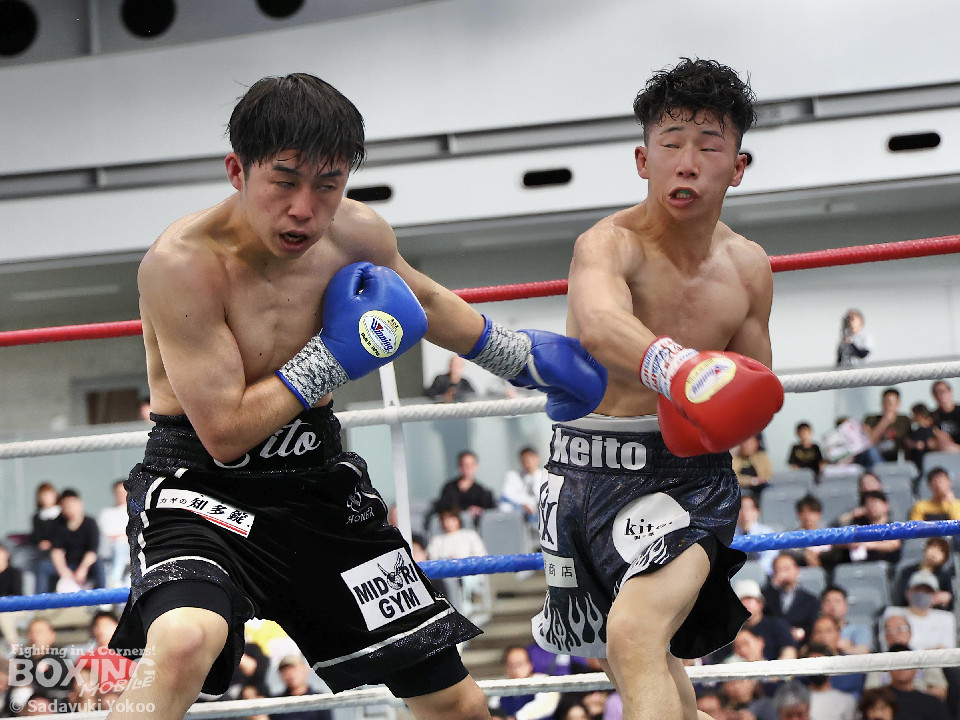 試合:フェイントをかけつつジャブの差し合いからスタート。ツーワンツーをヒットした後藤は左を上下に散らした。2回、横山は右でぐらつかせると後藤はたまらずクリンチ。横山は連打をまとめ、左フックから右につなげた。3回、左を上下に散らした後藤は左フックで動きを止めた横山に連打をまとめた。4回、互いの意地をかけた打撃戦。総力を尽くした打ち合いに会場もヒートアップした。熱戦の結果はドローとなり、決着はつかなかった。