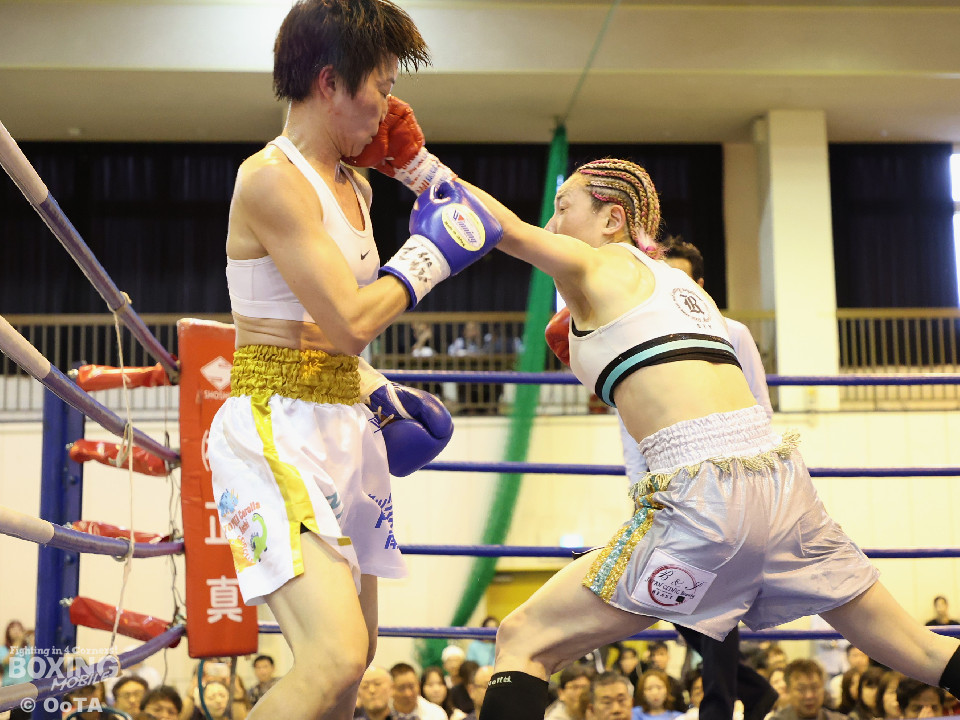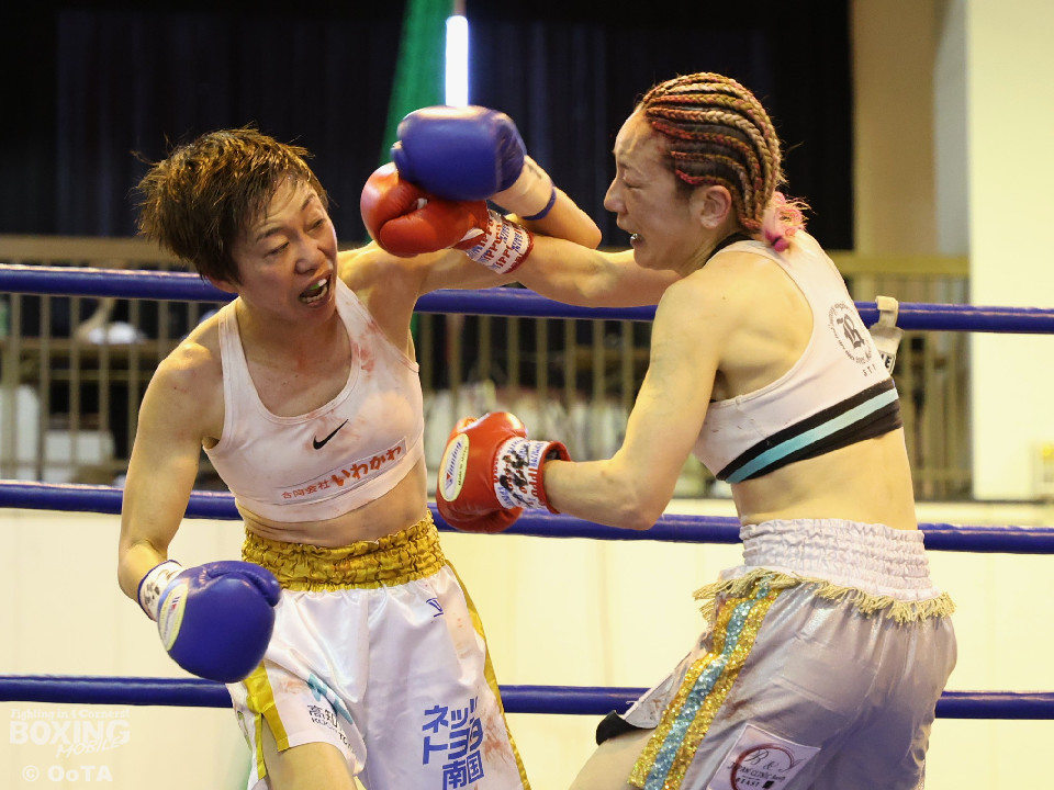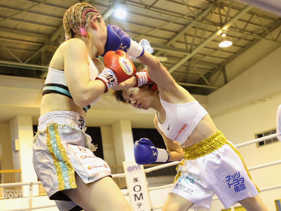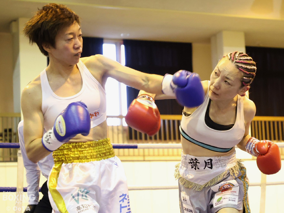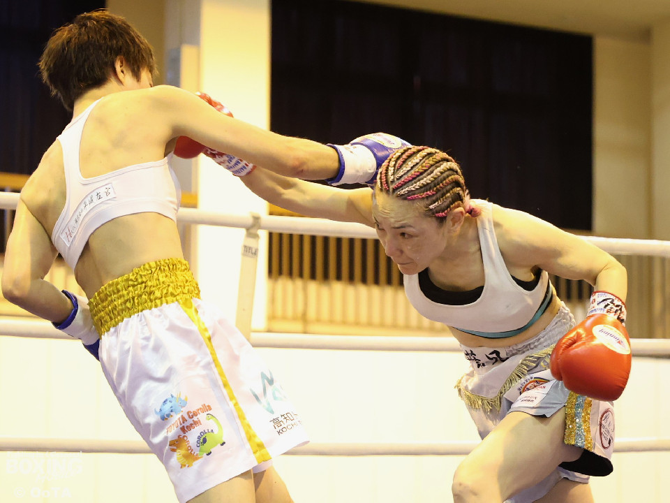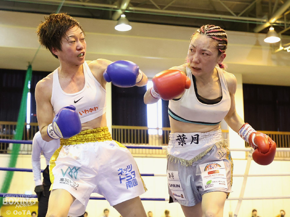 試合:左で煽りながら出方を見る岩川に対し、右ストレートで距離を詰める葉月。互いに静かな立ち上がりを見せたが、続く2回、踏み込みを更に深めた葉月が攻勢をかけるが、対する岩川も入り際にカウンターを合わせて、後半はプレッシャーをかける展開へと挽回。3回以降も葉月が積極的に距離を詰める展開は作るが、岩川もスイッチで揺さぶりをかけ、ストレートをカウンターでねじ込みペースを渡さず。被弾を合図に火の出るような打ち合いを展開した。緊張した展開を打破したのは、6回の葉月、右ストレートをボディへと伸ばすと、そこから波状攻撃をかけてペースを引き寄せた。7回、岩川も打ち合いに挑み激しくパンチが交錯するが、葉月が偶然のバッティングにより左頭部をカット。最終回、ここも葉月がしつこく前に出て攻勢をかけた。岩川も右から左フックへと繋ぎ、打ち終わりを鋭く狙うも完全な打開にはいたらず。判定決着となった一戦は、アグレッシブな攻撃でジャッジ3者の支持を得た葉月に軍配が上がった。