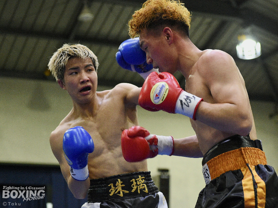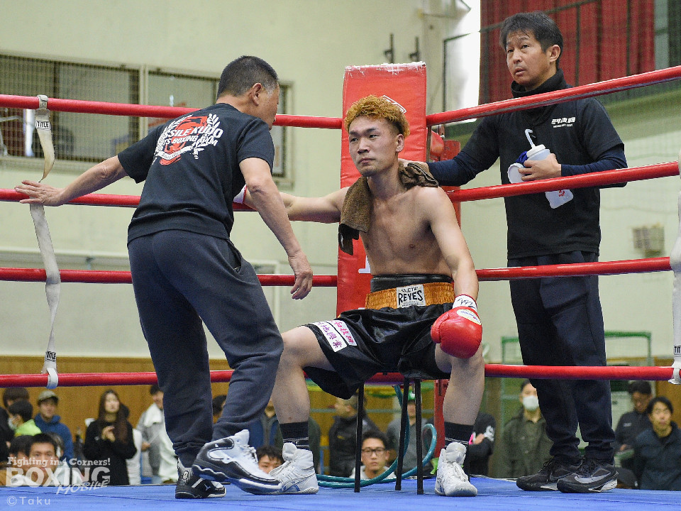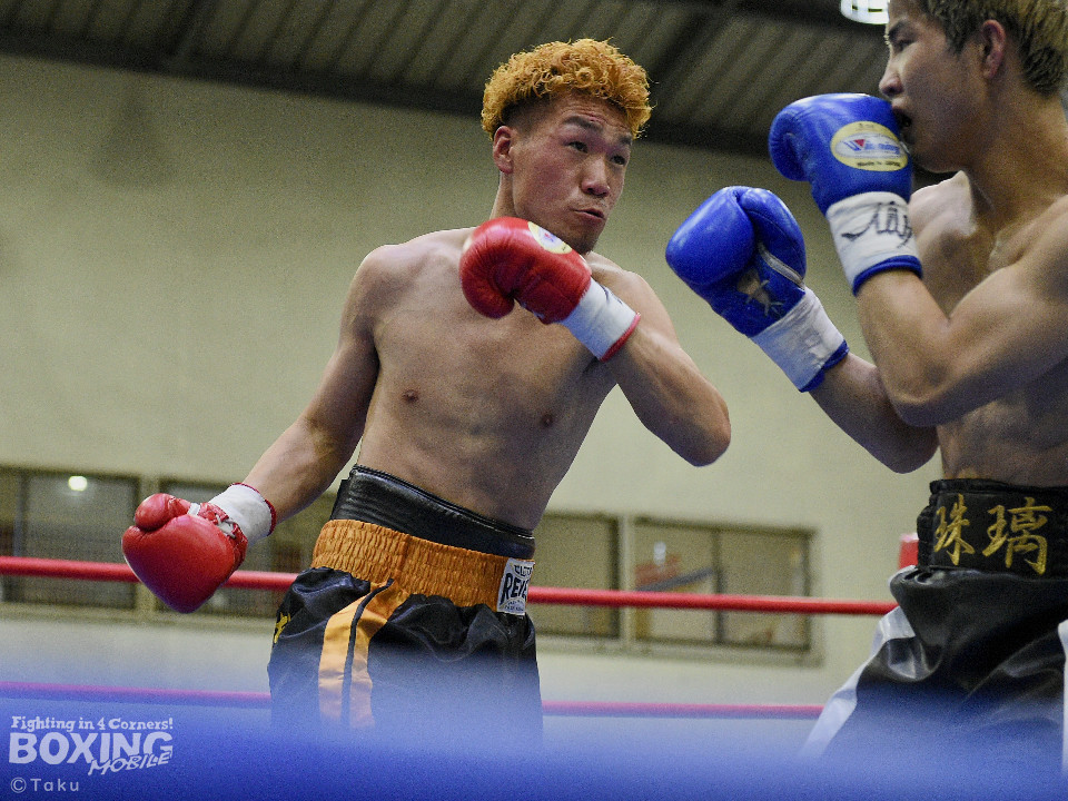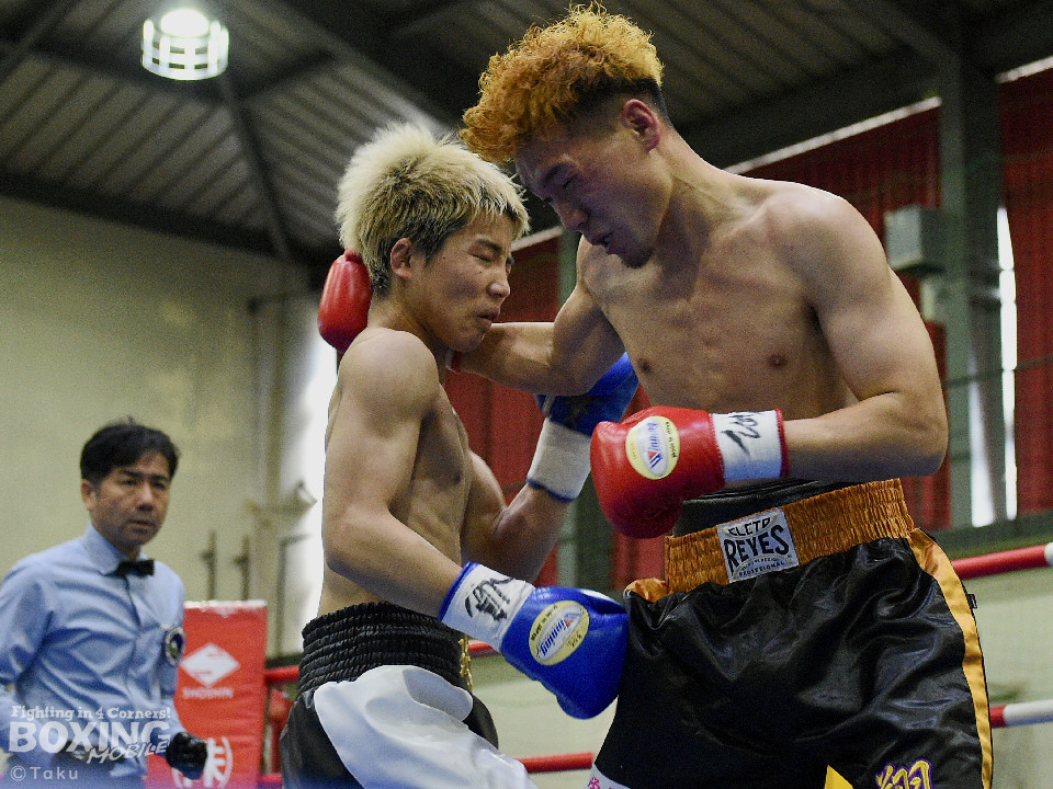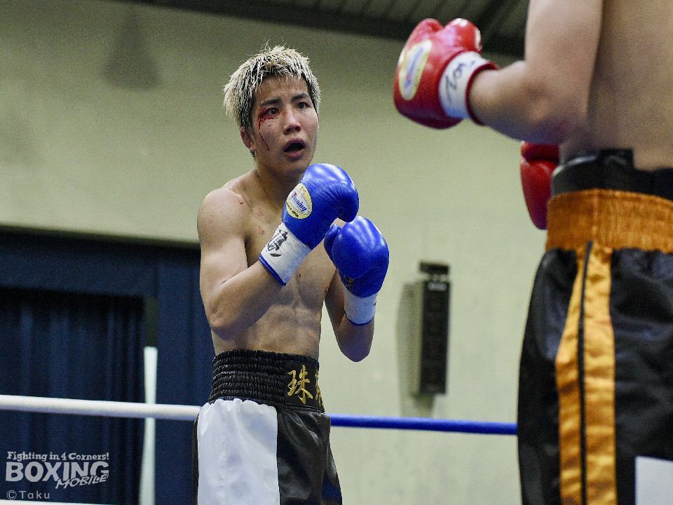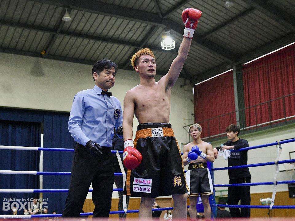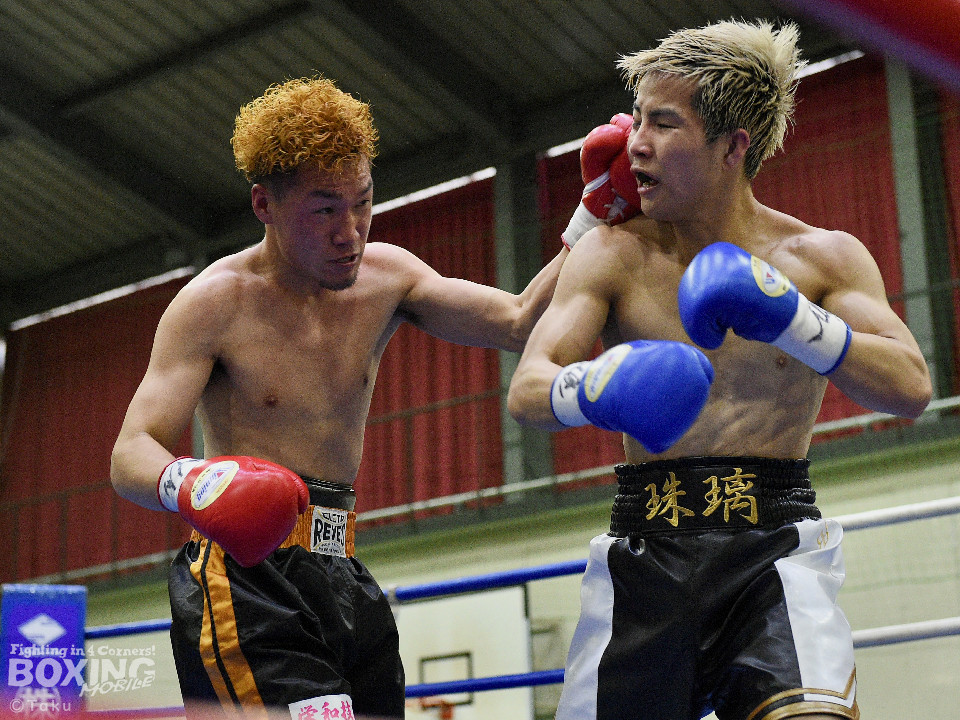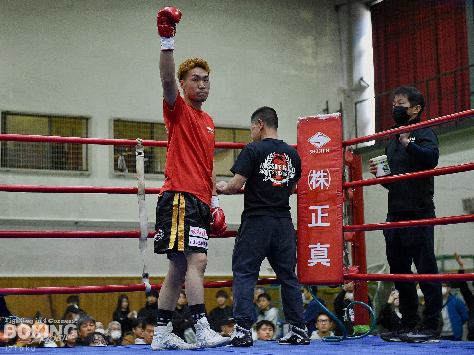試合:サウスポー同士の一戦は、田中がグイッと前に出て左ストレートをヒット。後手に回った河地だがリターンの右フックで応戦。2回、田中は左ストレートを再三決めるが、河地は臆することなく前に出るとラウンド終盤に右フックでバランスを崩させた。3回、河地は左右フックをブンブンと強振。クリーンヒットこそないが攻勢点で上回った印象。4回、両者とも最後の力を振り絞りパンチを繰り出す中、河地が右フックで右目上を切り裂き見栄えの良さをアピールした。4戦目で念願の初勝利を挙げた河地は、明日、誕生日を迎える父に感謝の気持ちを伝えた。