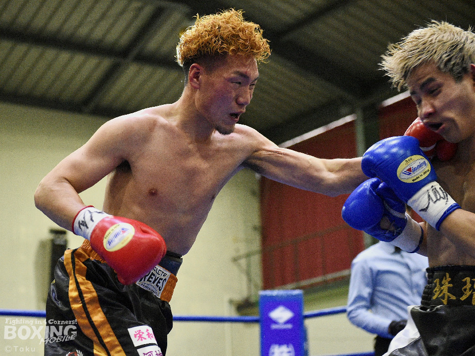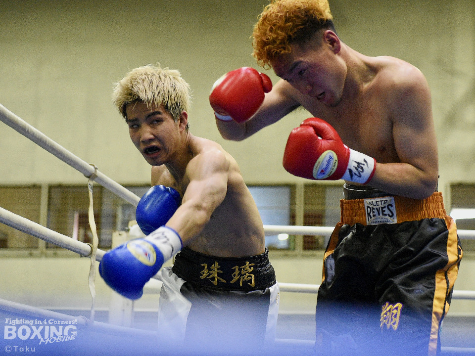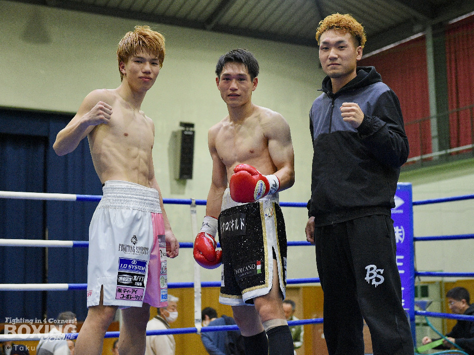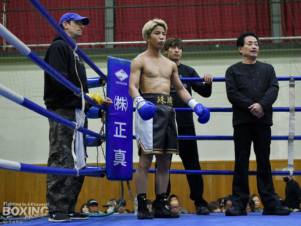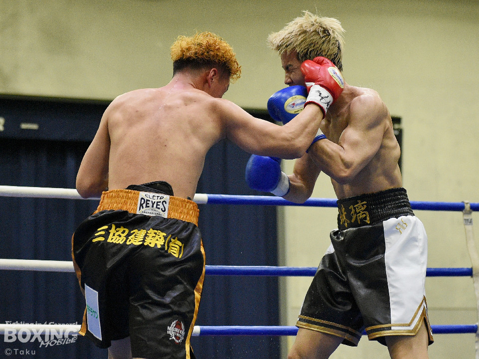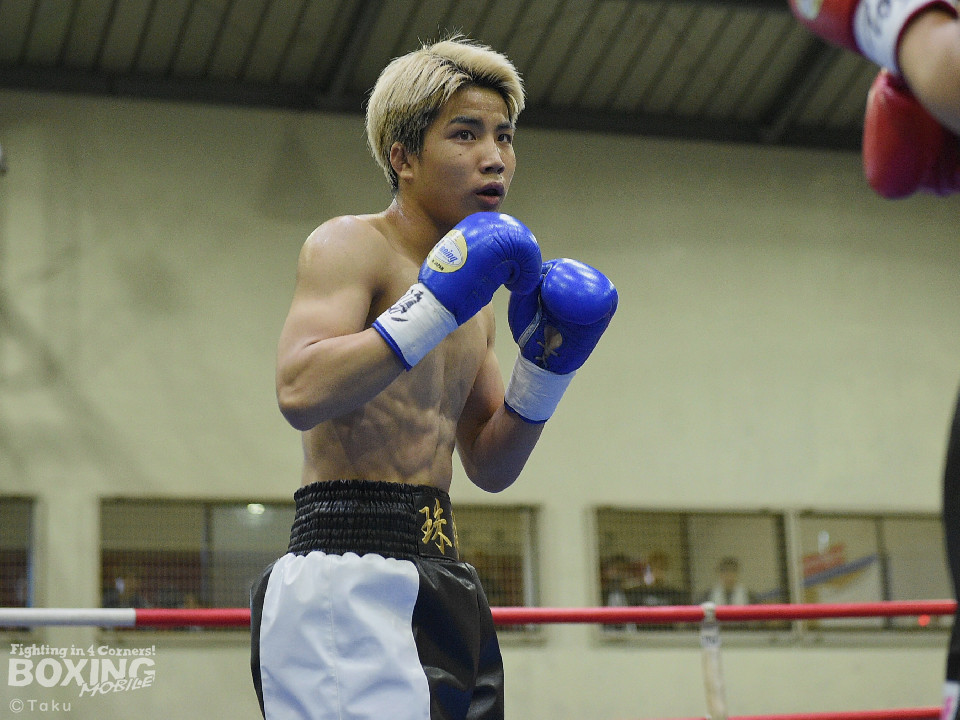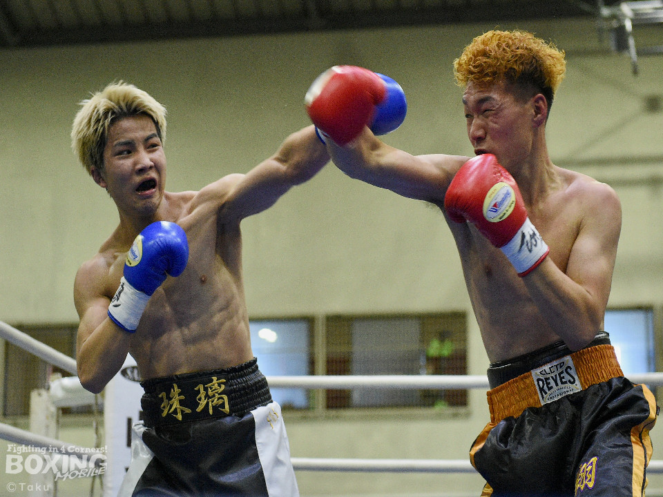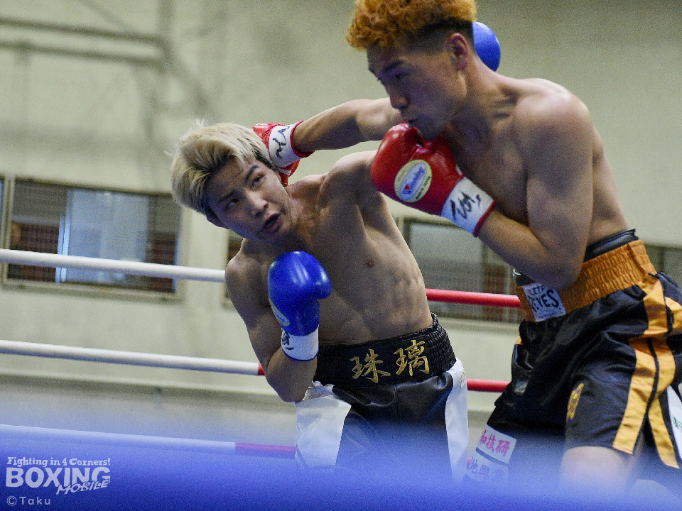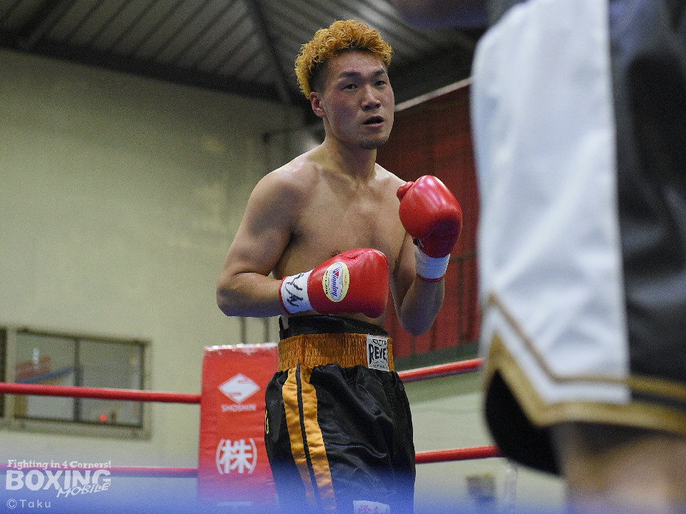 試合:サウスポー同士の一戦は、田中がグイッと前に出て左ストレートをヒット。後手に回った河地だがリターンの右フックで応戦。2回、田中は左ストレートを再三決めるが、河地は臆することなく前に出るとラウンド終盤に右フックでバランスを崩させた。3回、河地は左右フックをブンブンと強振。クリーンヒットこそないが攻勢点で上回った印象。4回、両者とも最後の力を振り絞りパンチを繰り出す中、河地が右フックで右目上を切り裂き見栄えの良さをアピールした。4戦目で念願の初勝利を挙げた河地は、明日、誕生日を迎える父に感謝の気持ちを伝えた。