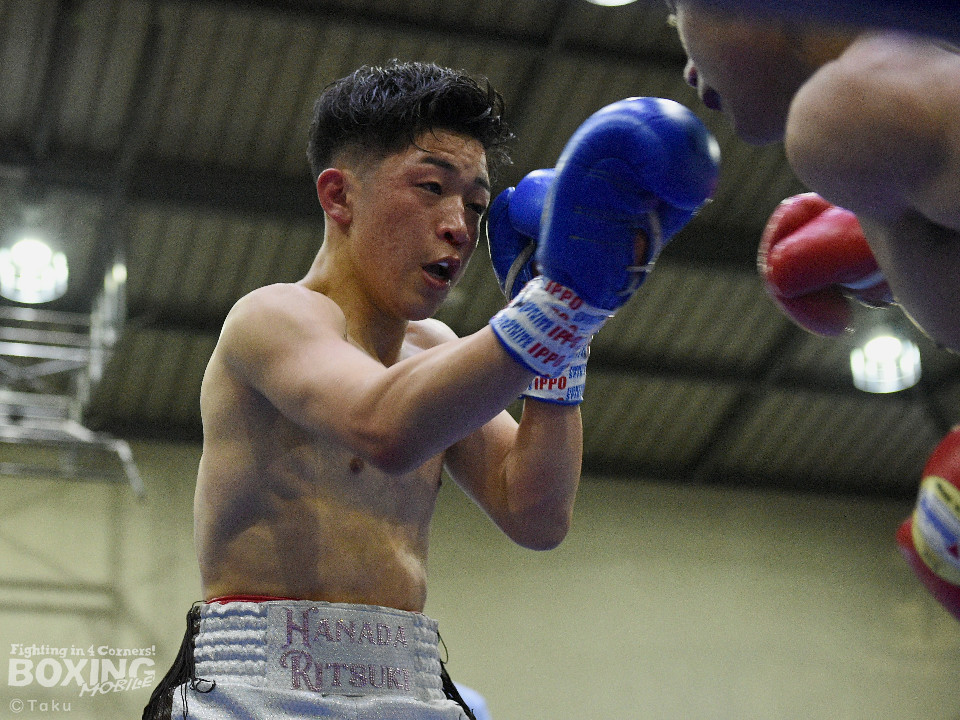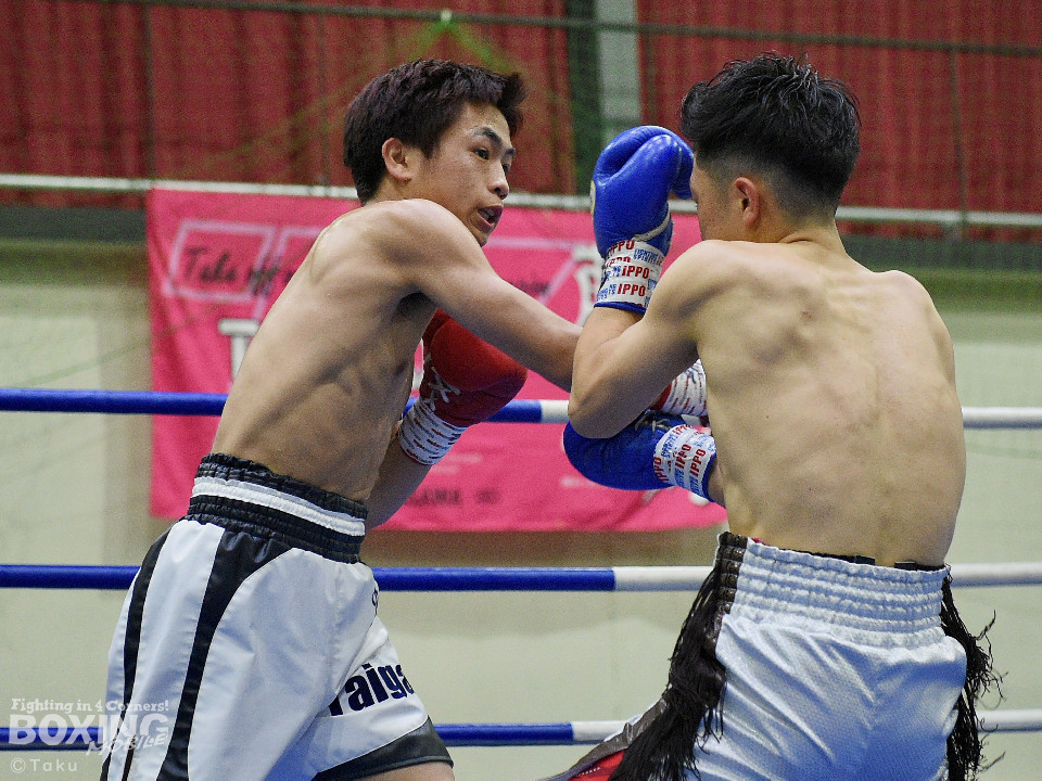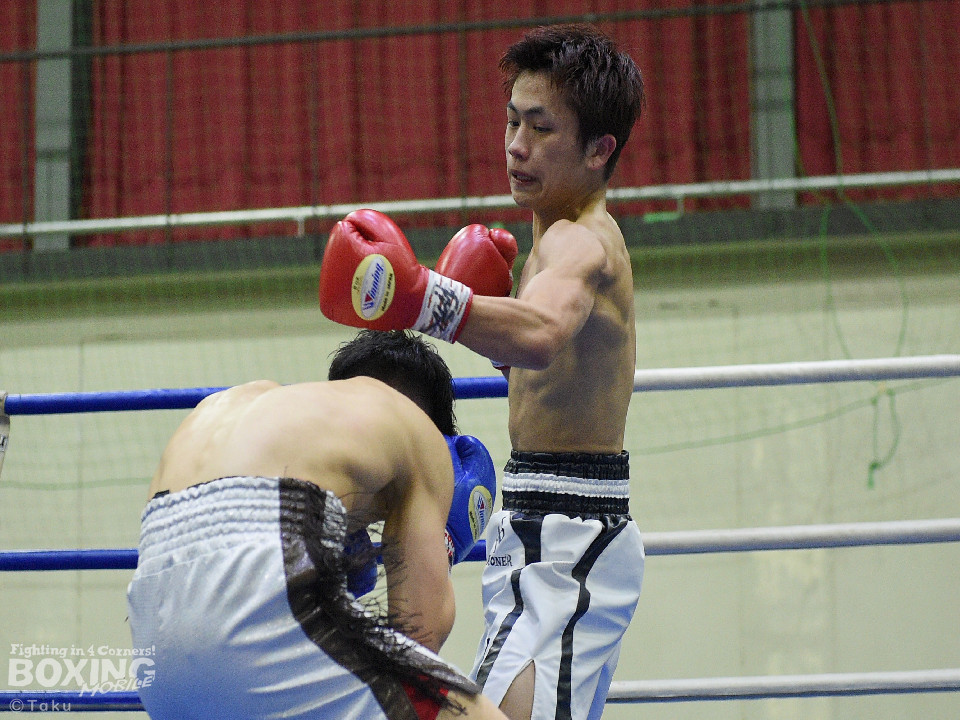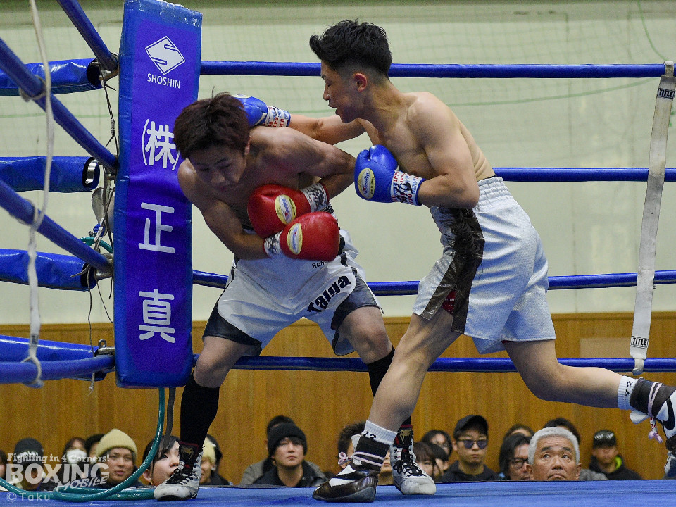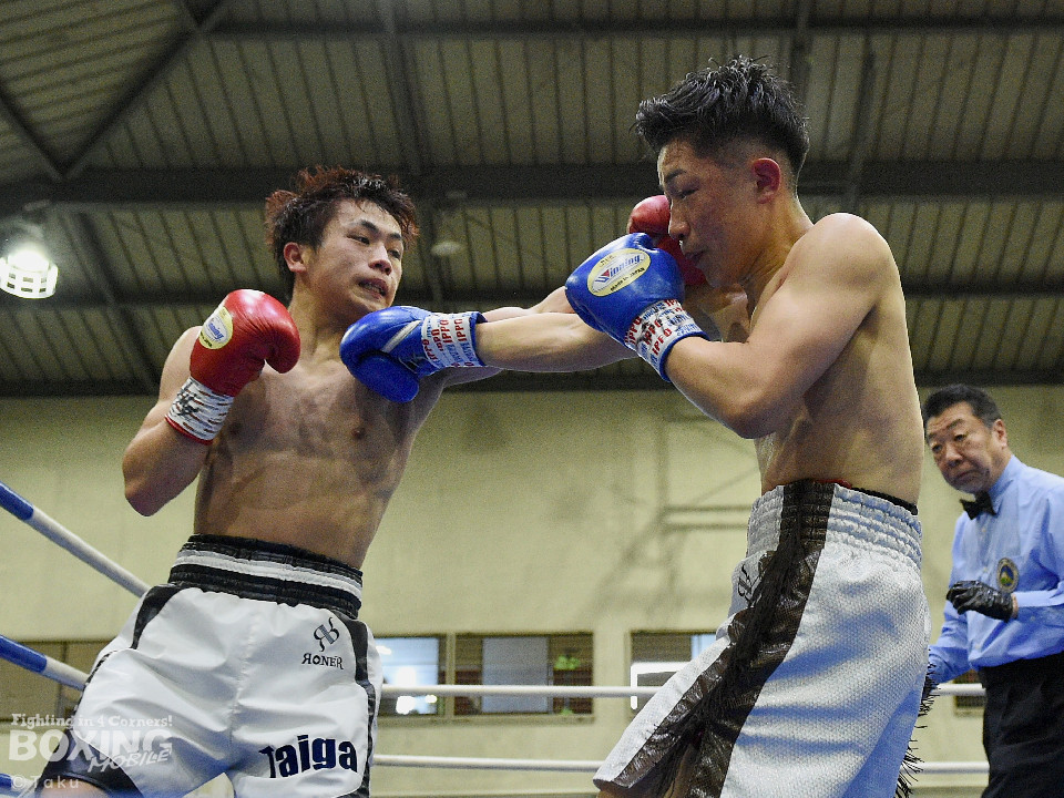 試合:阿部が右ショートから上下に打ち分け先制。対する花田は左ボディを好打するとラウンド終盤に左フックで顔を弾き優勢を印象付けた。2回、阿部はワンツー左ボディを好打しリズムを構築。3回、中間距離でし烈なペース争いを繰り広げる中、花田はコンパクトな左ボディ、ワンツーで上回った。4回、阿部は足を使いながら打っては動くを意識した。ジャッジ委ねられた採点は三者三様の引き分け。新人王特別ルールにより優勢点を勝ち取った花田が次戦にコマを進めた。