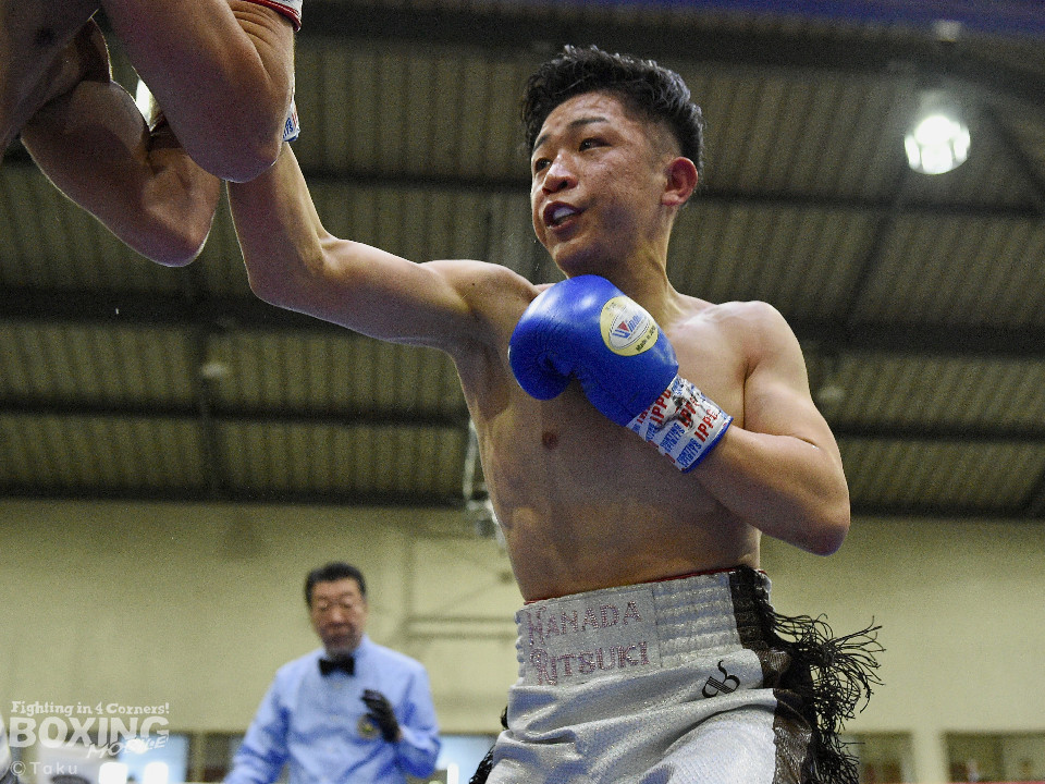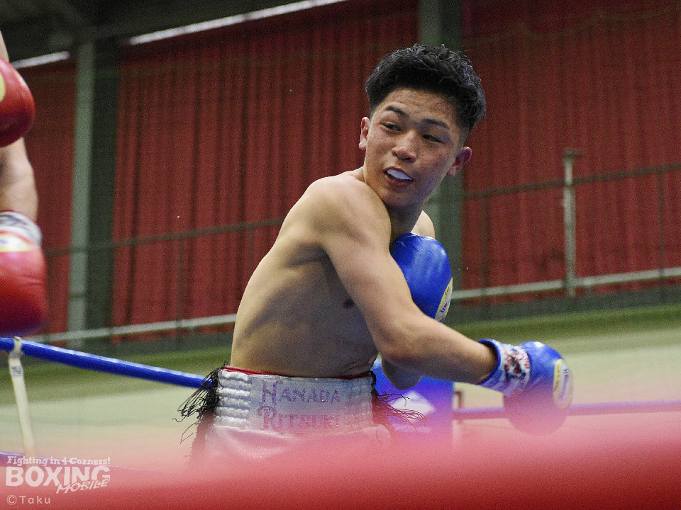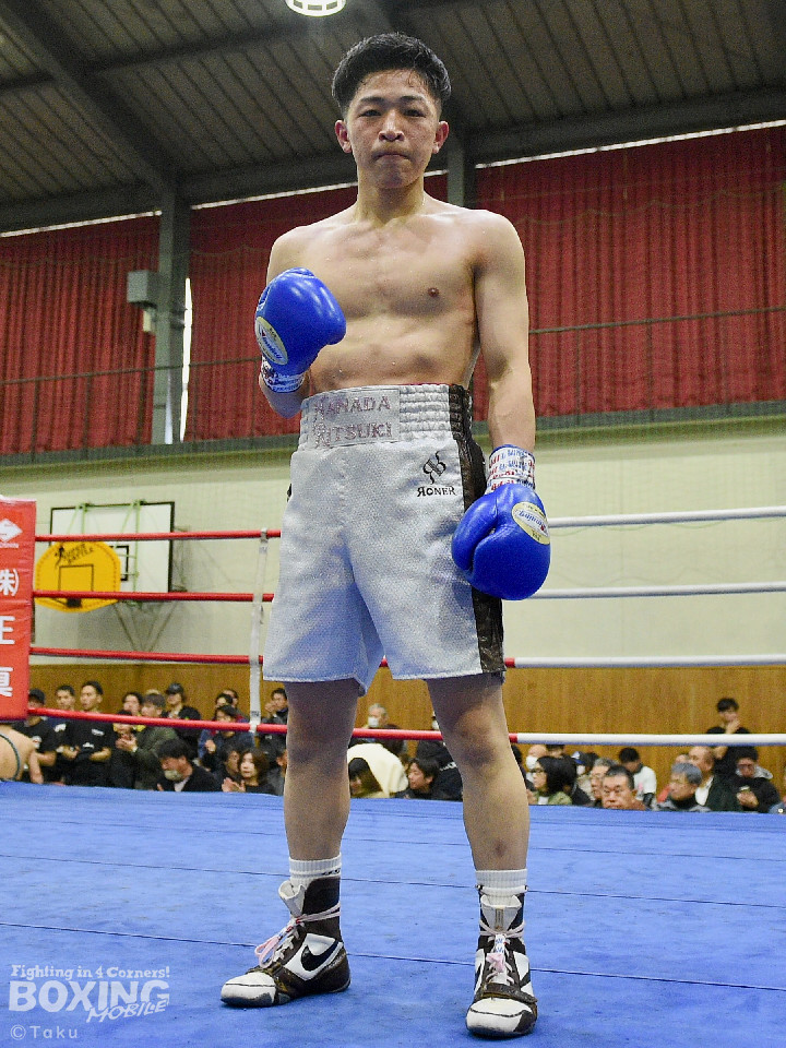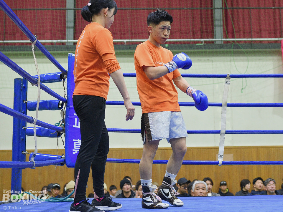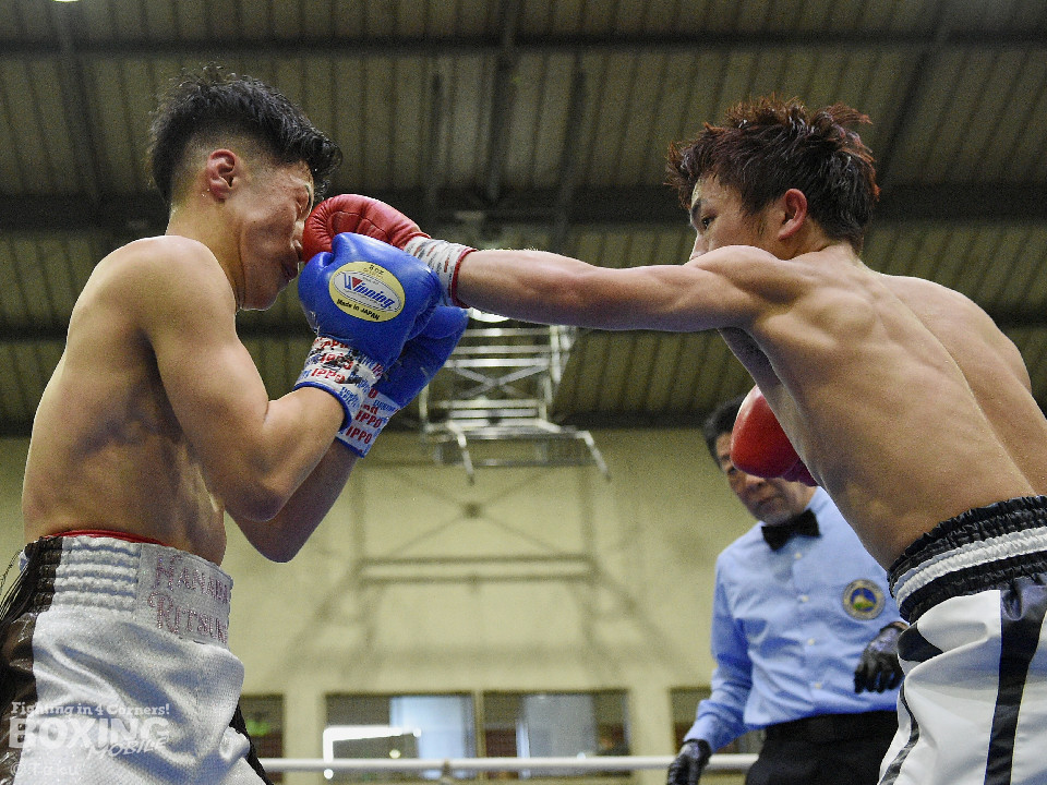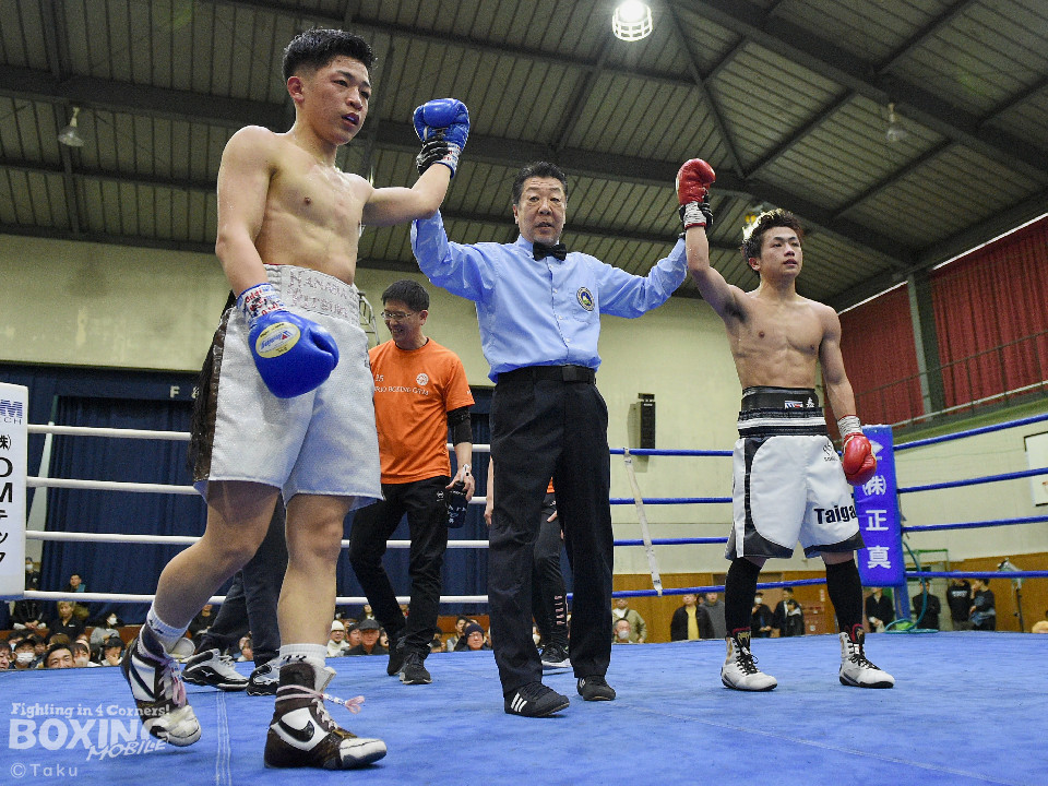 試合:阿部が右ショートから上下に打ち分け先制。対する花田は左ボディを好打するとラウンド終盤に左フックで顔を弾き優勢を印象付けた。2回、阿部はワンツー左ボディを好打しリズムを構築。3回、中間距離でし烈なペース争いを繰り広げる中、花田はコンパクトな左ボディ、ワンツーで上回った。4回、阿部は足を使いながら打っては動くを意識した。ジャッジ委ねられた採点は三者三様の引き分け。新人王特別ルールにより優勢点を勝ち取った花田が次戦にコマを進めた。