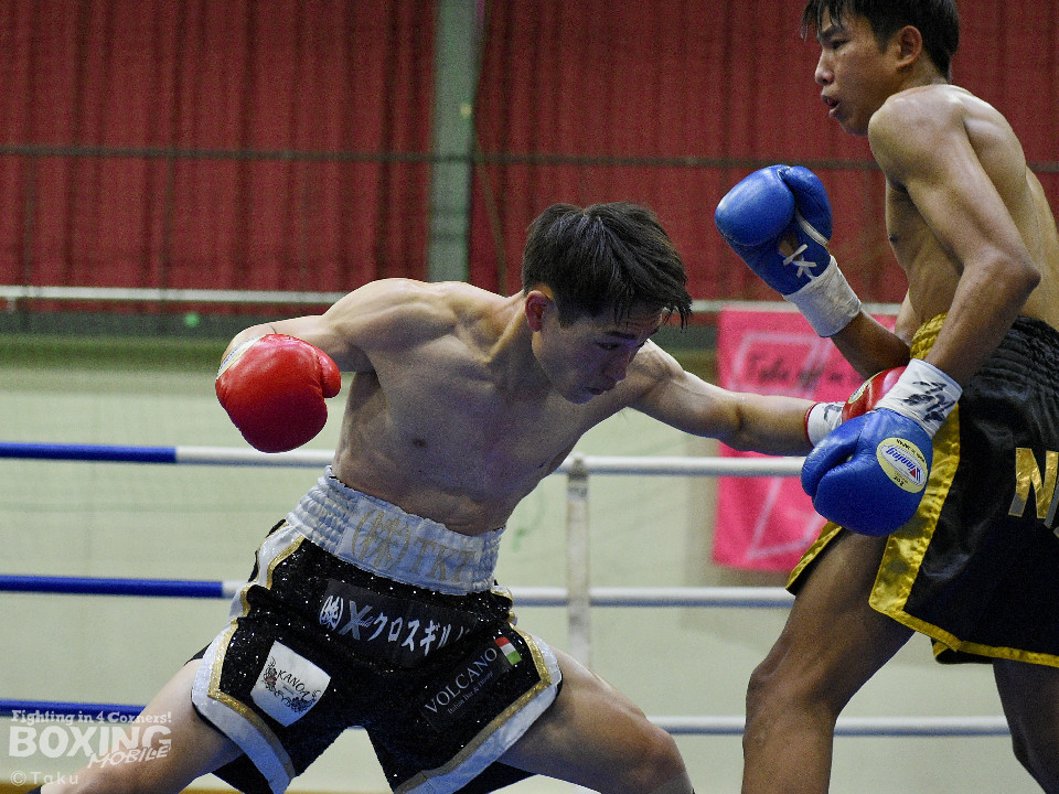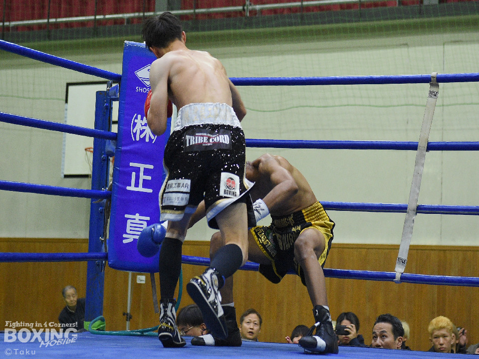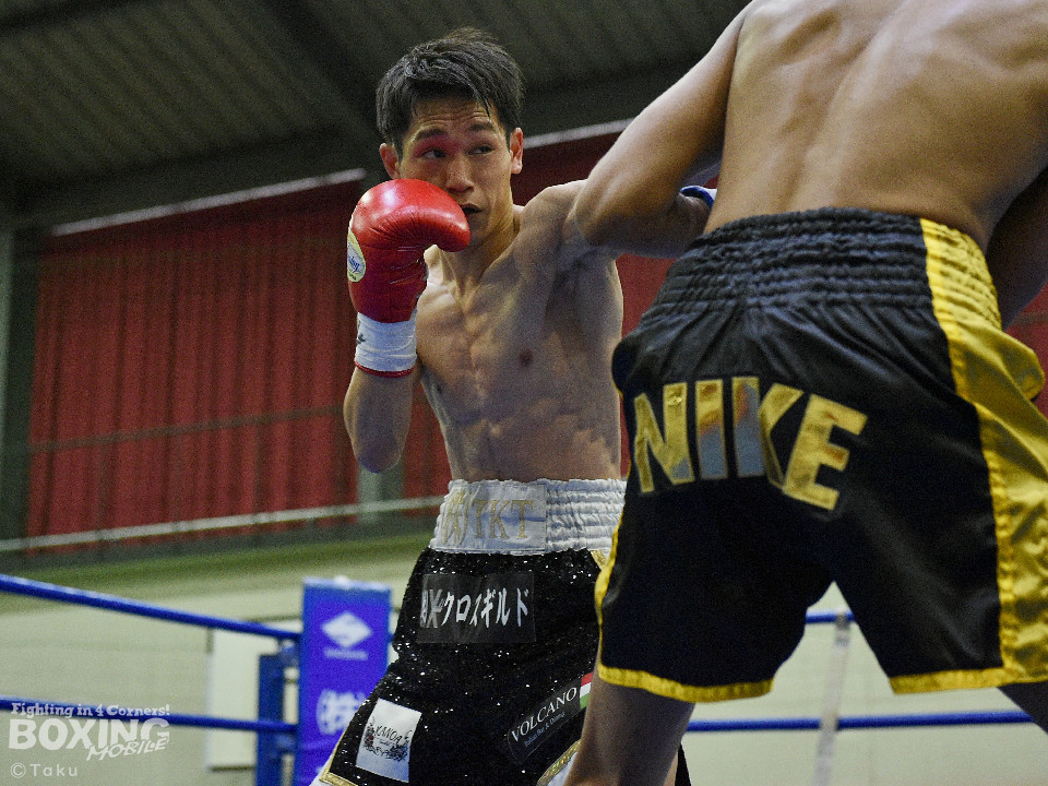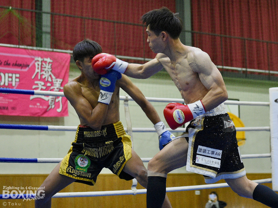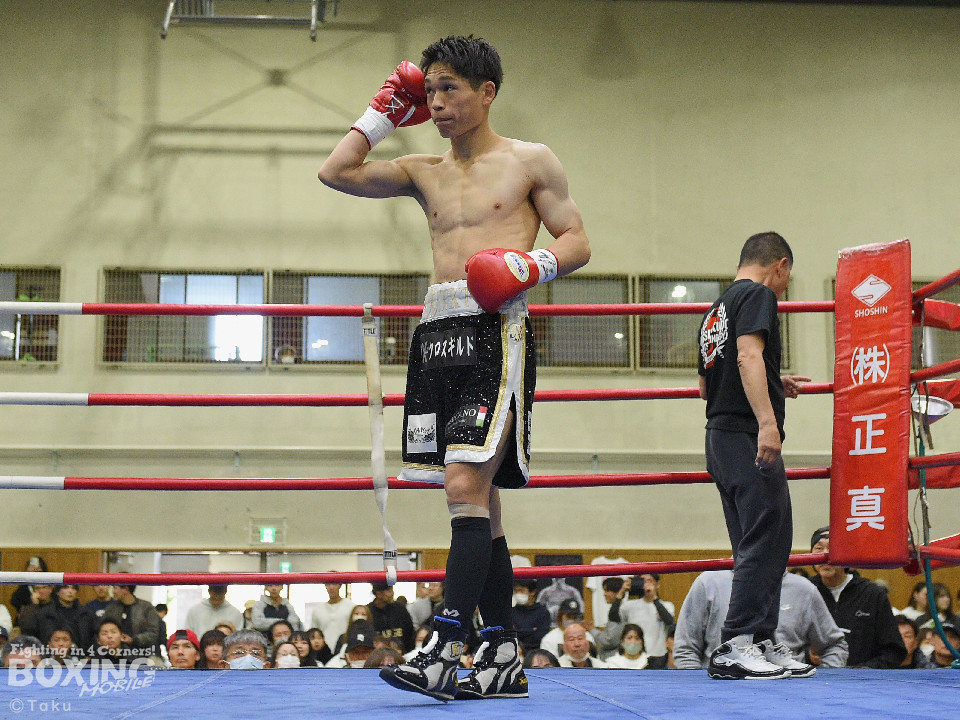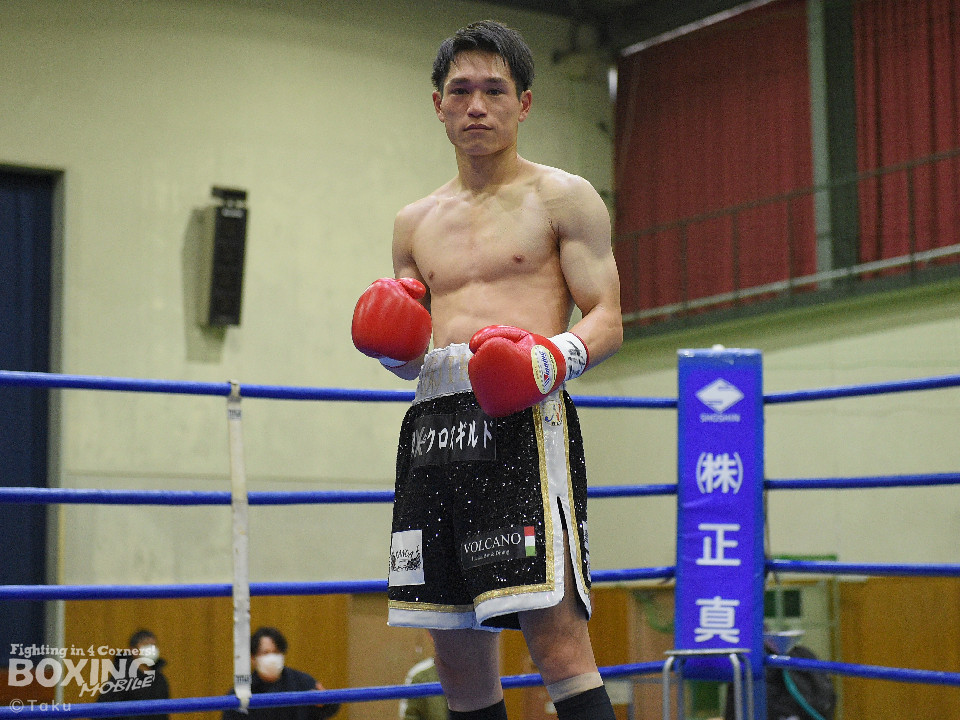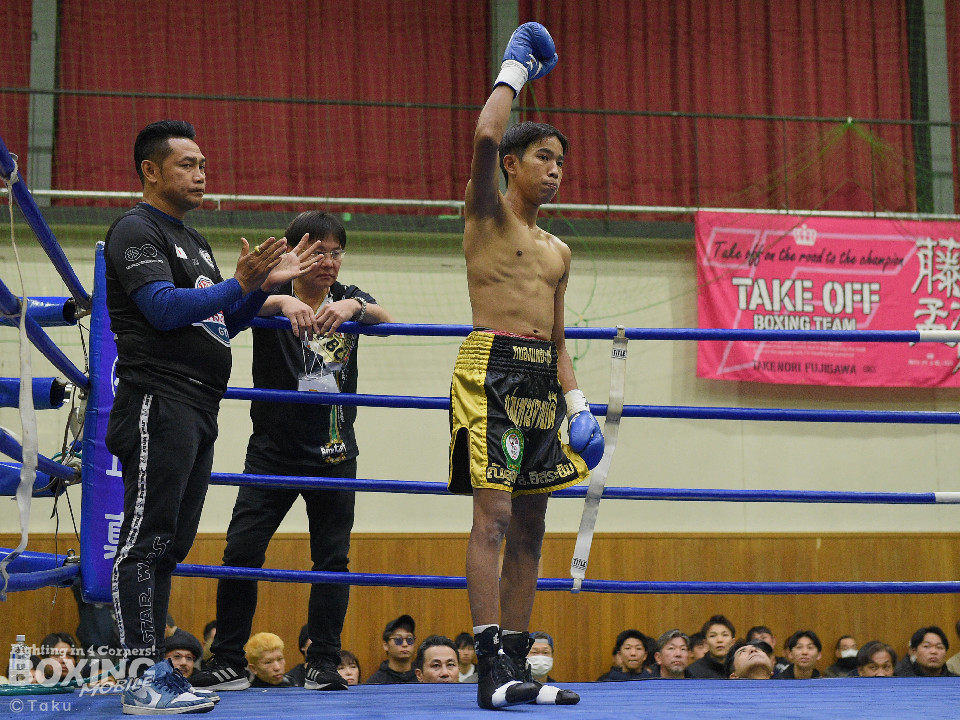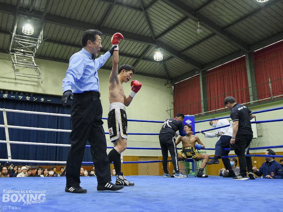 試合:2025年西部日本バンタム級新人王の手島が凱旋試合に臨んだ。初回、手島がボディジャブから攻め立てると思い切りの良いワンツー、左ボディで積極的な攻撃を展開。2回、硬さが取れてきた手島はジリジリと距離を詰めてワンツー、右ボディストレートを繰り出すと返しのパンチを冷静に対応。ラウンド終了間際、手島はステップインから強烈なワンツーでダウンを奪取。ダメージが深いナッタポンを見てレフェリーはノーカウントでストップした。手島が自主興行のメインイベントを締めた。