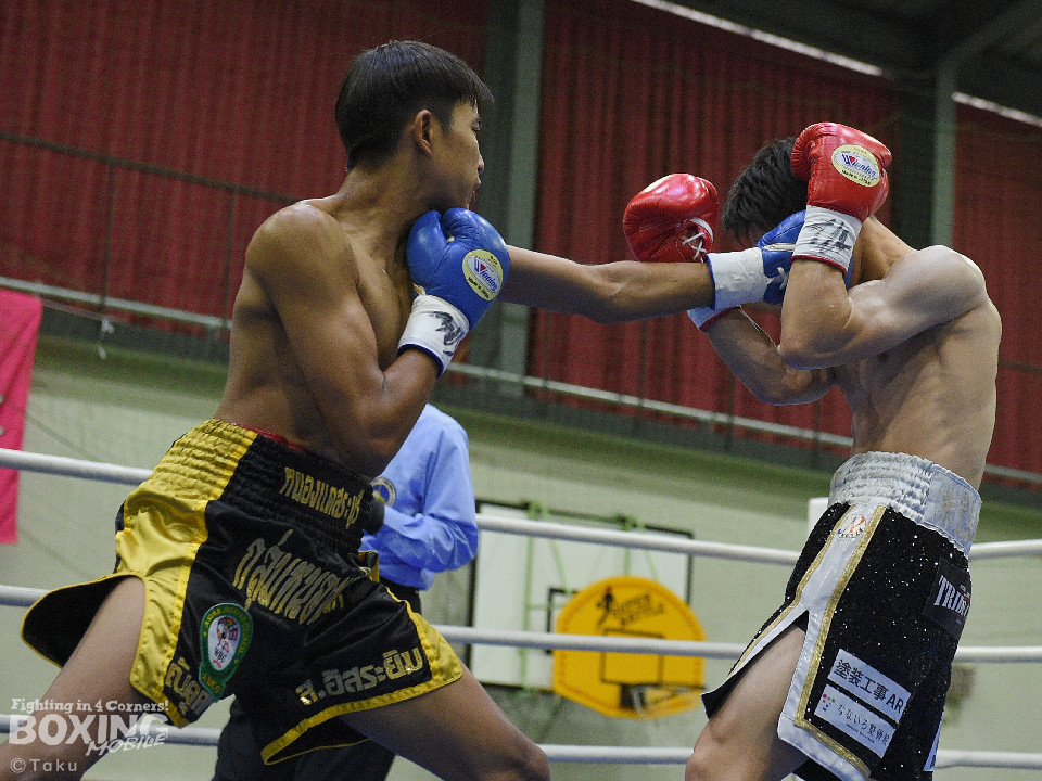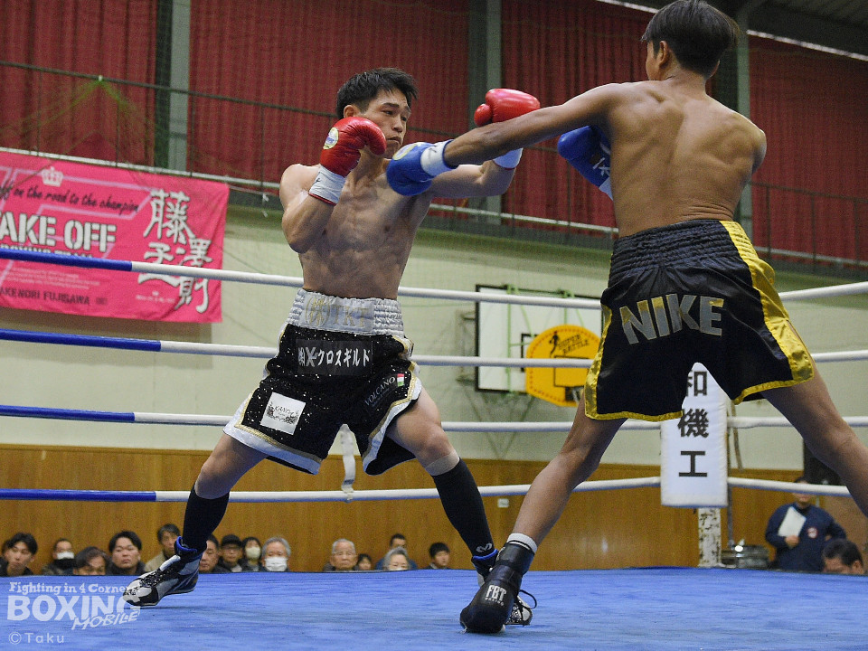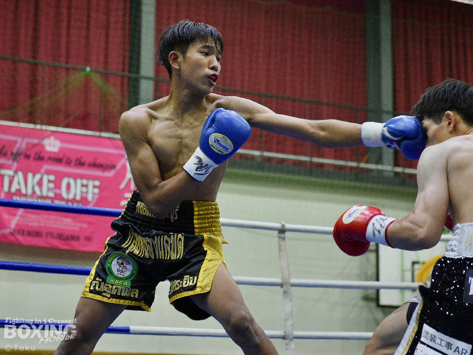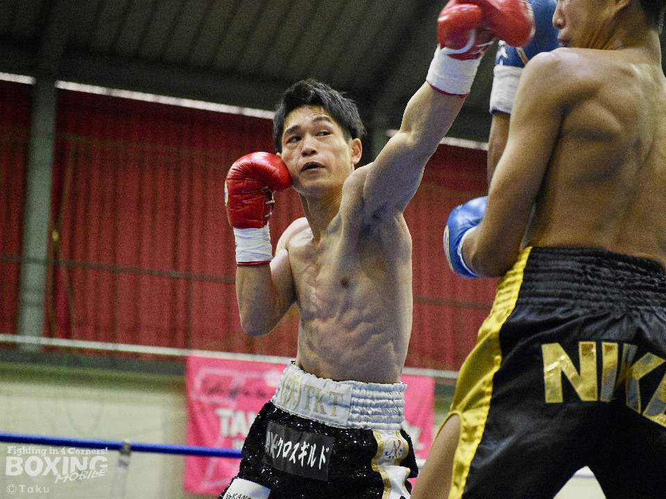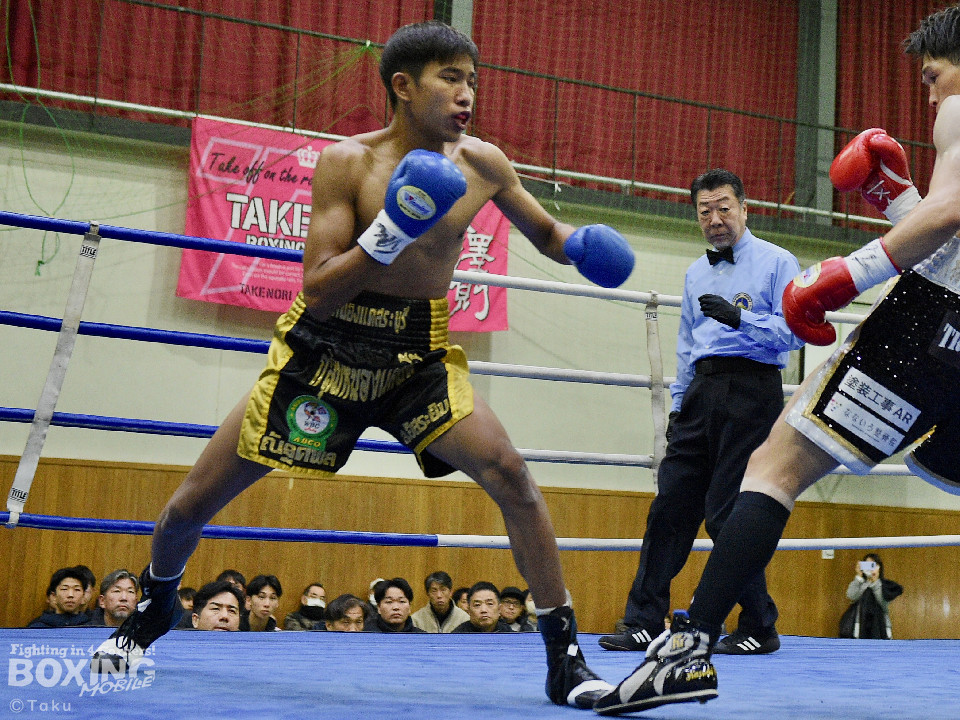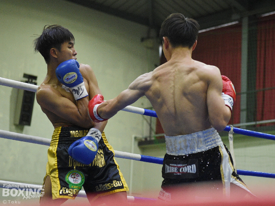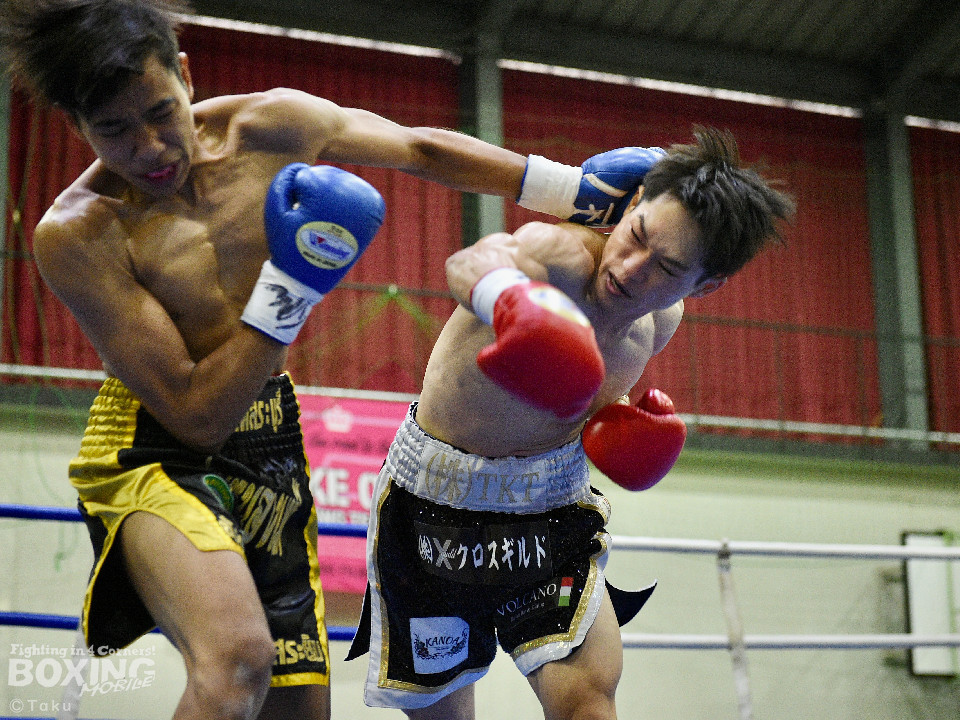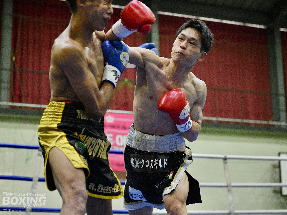 試合:2025年西部日本バンタム級新人王の手島が凱旋試合に臨んだ。初回、手島がボディジャブから攻め立てると思い切りの良いワンツー、左ボディで積極的な攻撃を展開。2回、硬さが取れてきた手島はジリジリと距離を詰めてワンツー、右ボディストレートを繰り出すと返しのパンチを冷静に対応。ラウンド終了間際、手島はステップインから強烈なワンツーでダウンを奪取。ダメージが深いナッタポンを見てレフェリーはノーカウントでストップした。手島が自主興行のメインイベントを締めた。