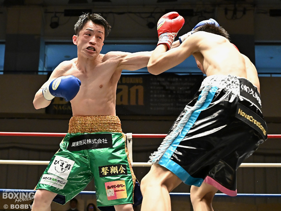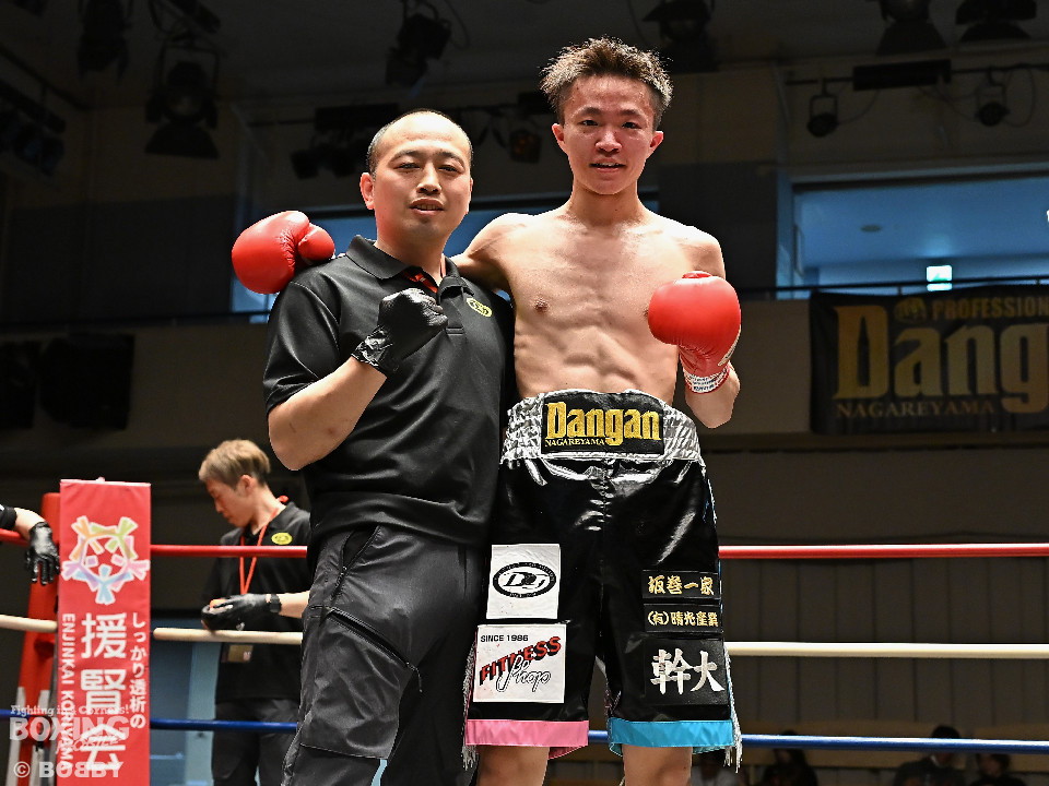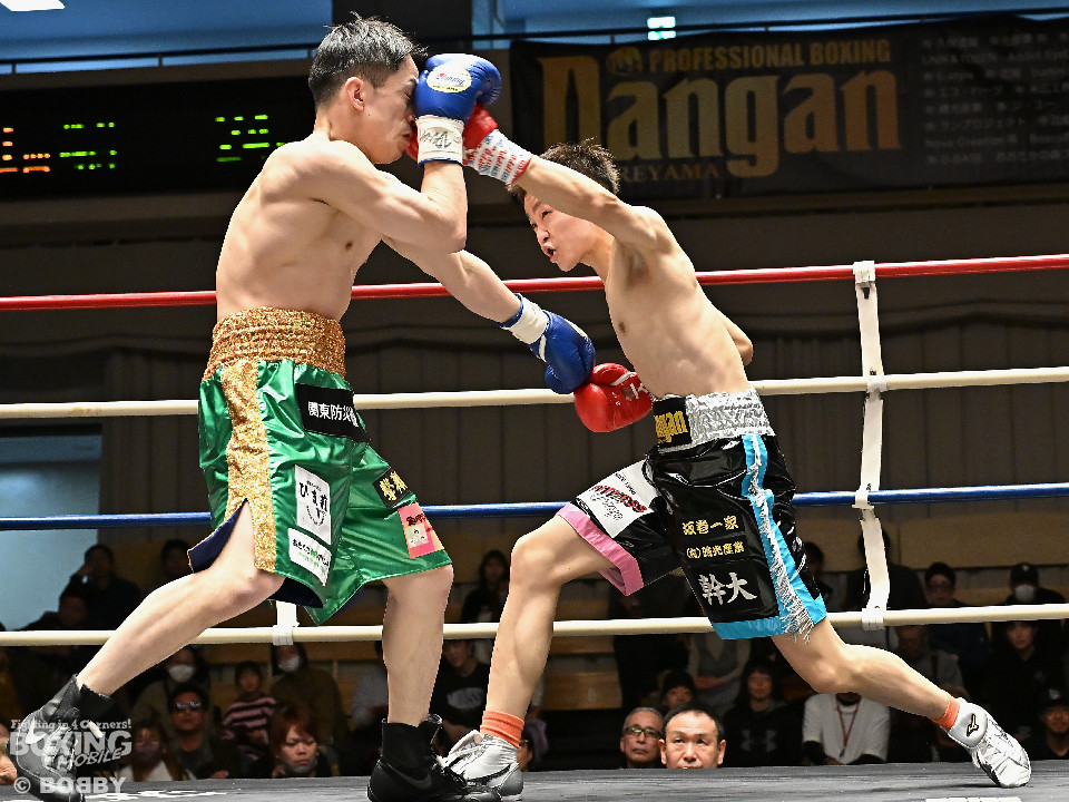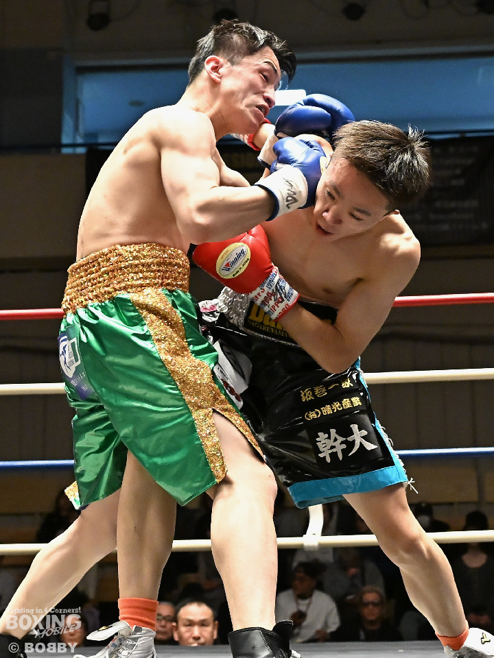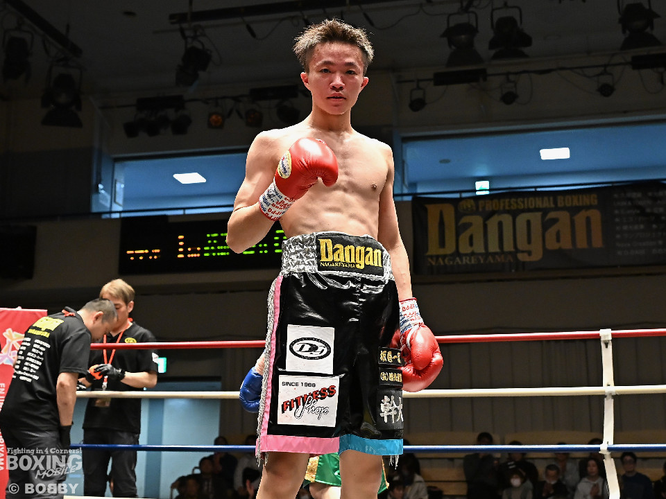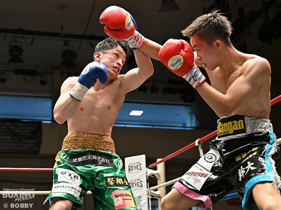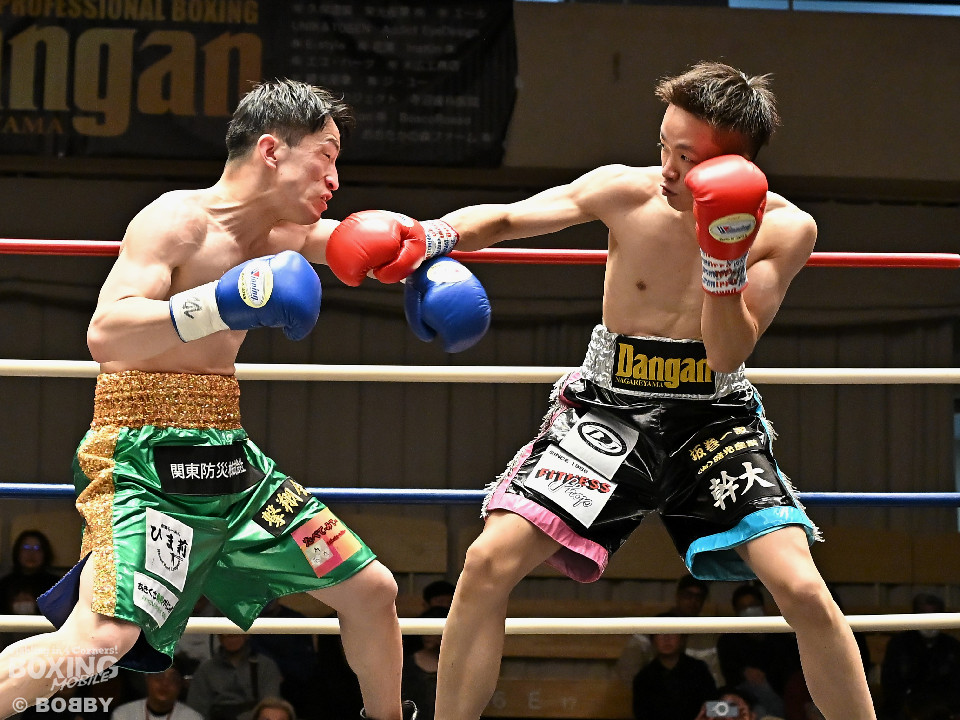 試合:サウスポー鈴木幹大が前の手でコントロールしながらワンツーを好打すると左カウンターでダウンを先取。2回、距離を詰めて打ち合いに持ち込みたい鈴木耕太朗だが、左ショートを浴びて思い通りの展開を作れず。3回、幹大は左ストレート、右フックを決めてテンポの良いボクシングを披露。耕太朗は偶然のバッティングで右目上をカットした。4回、耕太朗はショートレンジで右ボディを叩くが、幹大は要所でワンツーを決めてペースを渡さなかった。幹大が2勝目を挙げた。