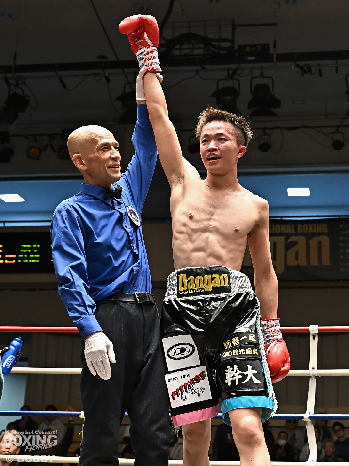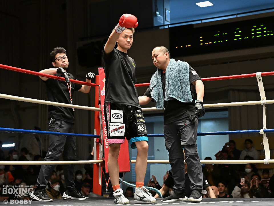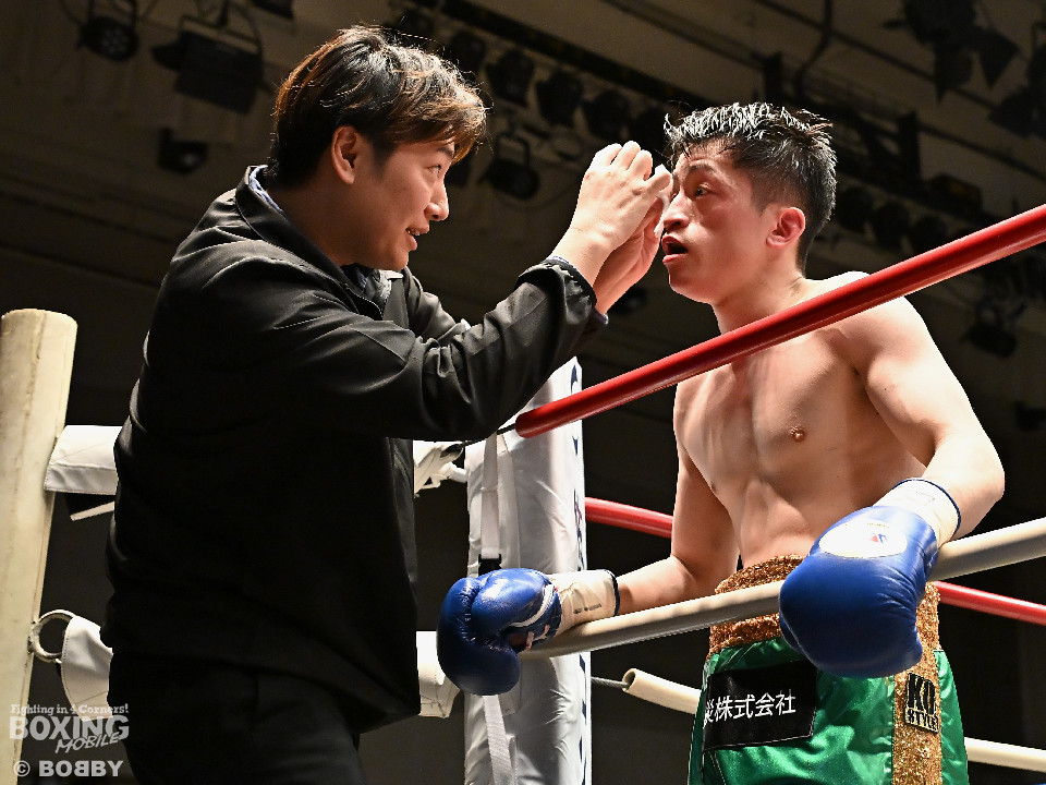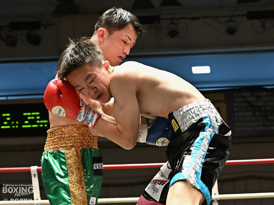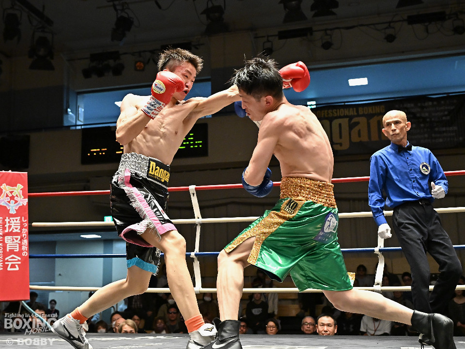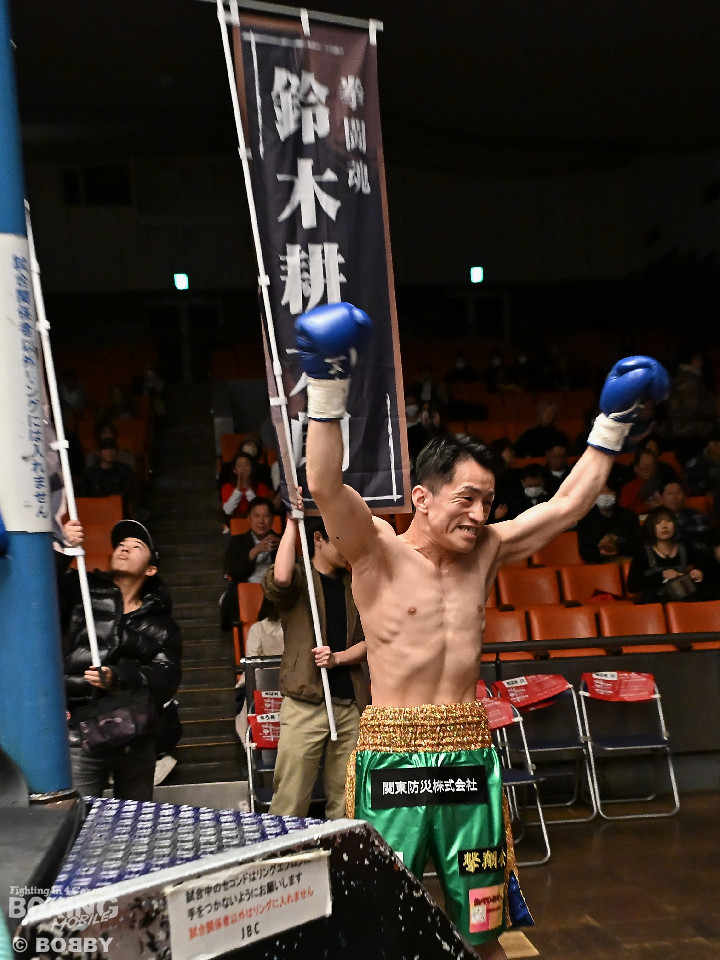 試合:サウスポー鈴木幹大が前の手でコントロールしながらワンツーを好打すると左カウンターでダウンを先取。2回、距離を詰めて打ち合いに持ち込みたい鈴木耕太朗だが、左ショートを浴びて思い通りの展開を作れず。3回、幹大は左ストレート、右フックを決めてテンポの良いボクシングを披露。耕太朗は偶然のバッティングで右目上をカットした。4回、耕太朗はショートレンジで右ボディを叩くが、幹大は要所でワンツーを決めてペースを渡さなかった。幹大が2勝目を挙げた。