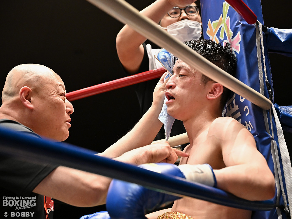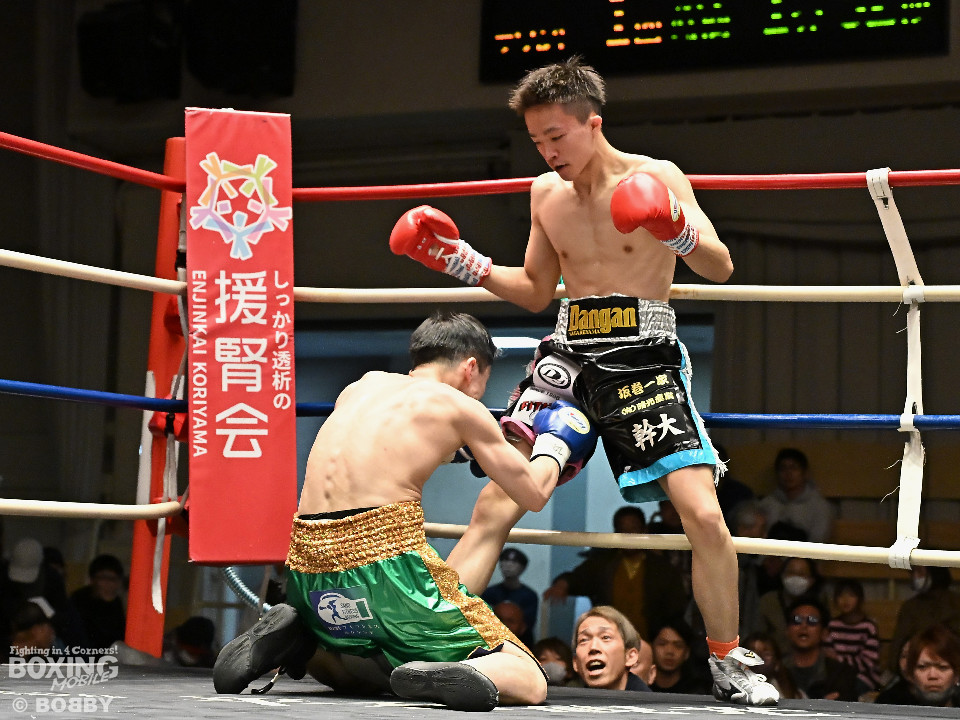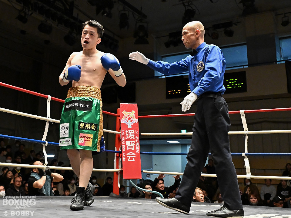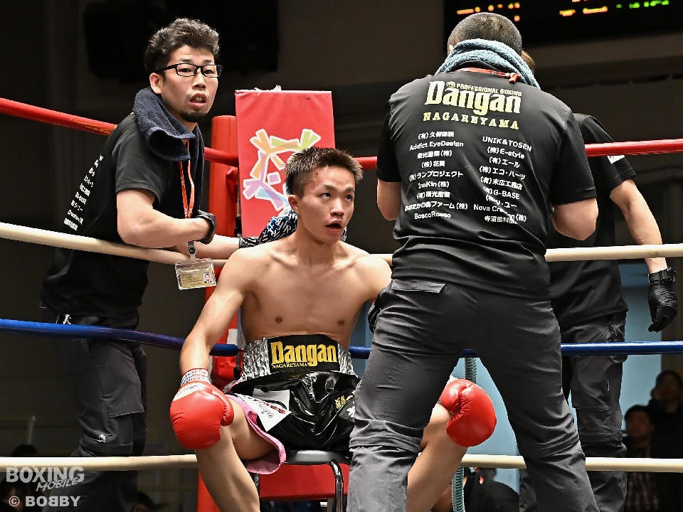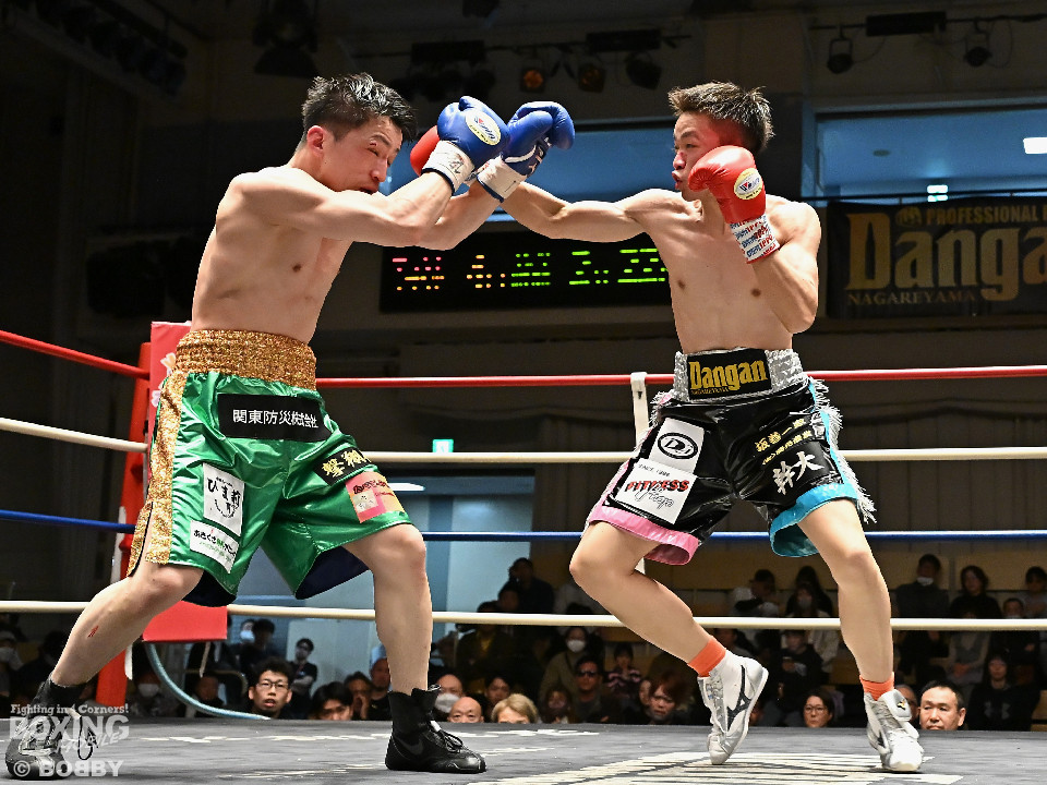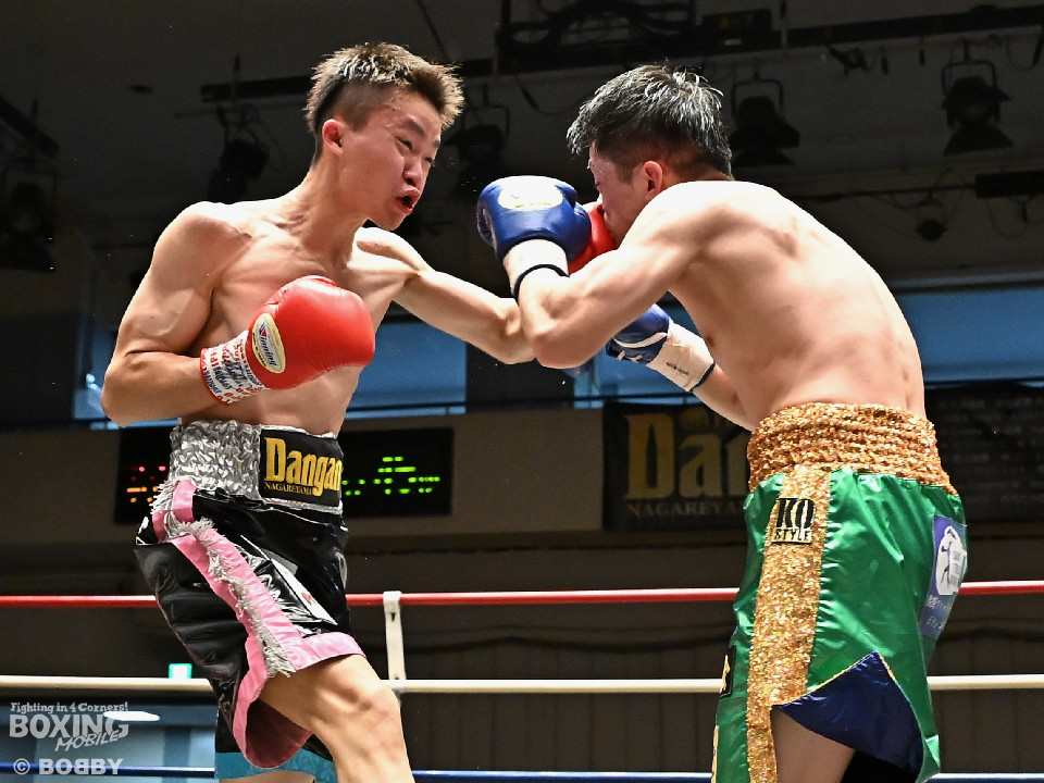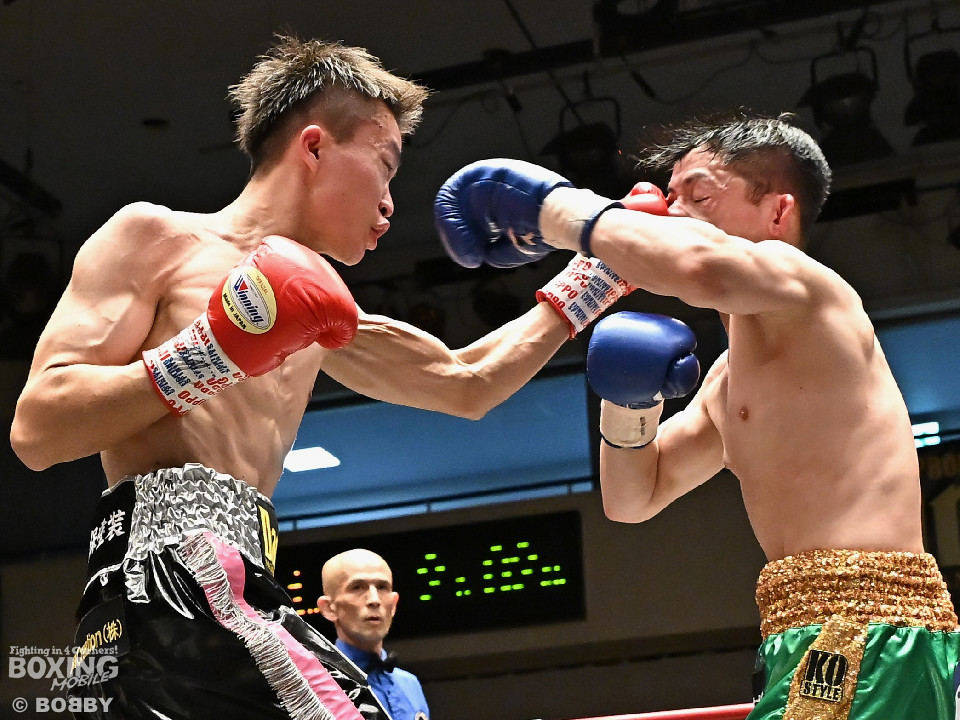 試合:サウスポー鈴木幹大が前の手でコントロールしながらワンツーを好打すると左カウンターでダウンを先取。2回、距離を詰めて打ち合いに持ち込みたい鈴木耕太朗だが、左ショートを浴びて思い通りの展開を作れず。3回、幹大は左ストレート、右フックを決めてテンポの良いボクシングを披露。耕太朗は偶然のバッティングで右目上をカットした。4回、耕太朗はショートレンジで右ボディを叩くが、幹大は要所でワンツーを決めてペースを渡さなかった。幹大が2勝目を挙げた。