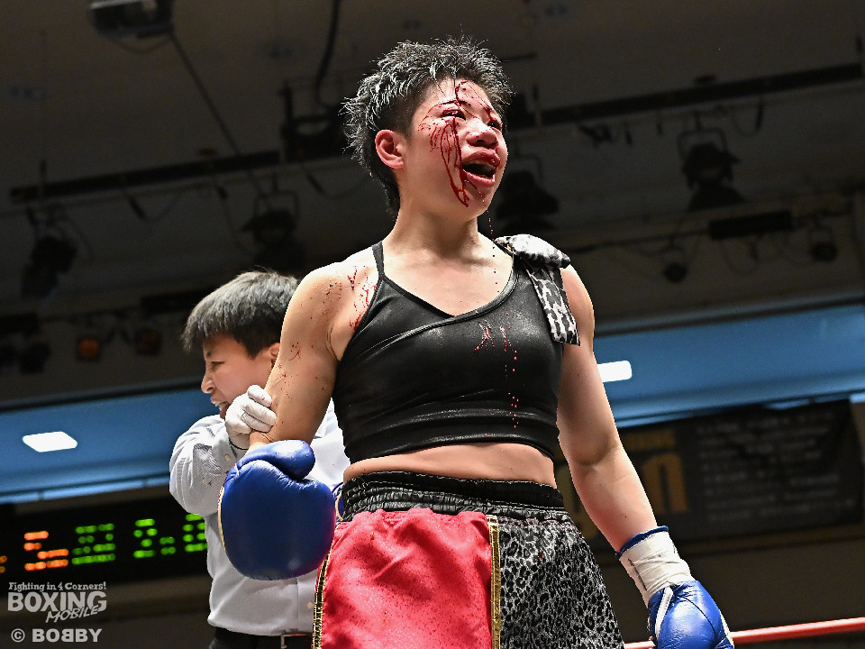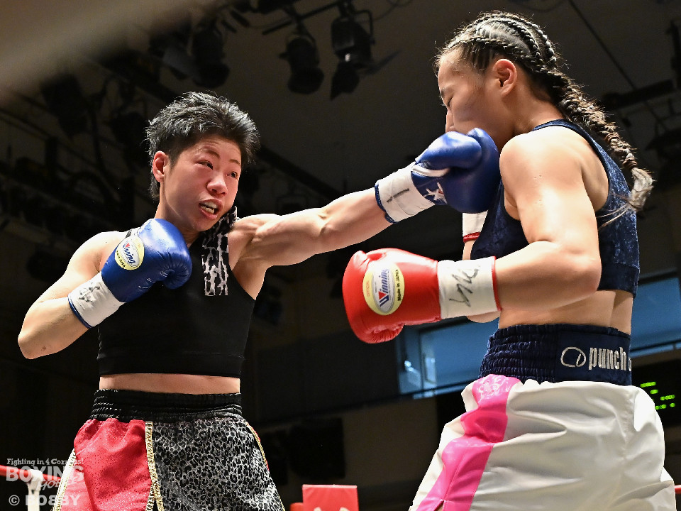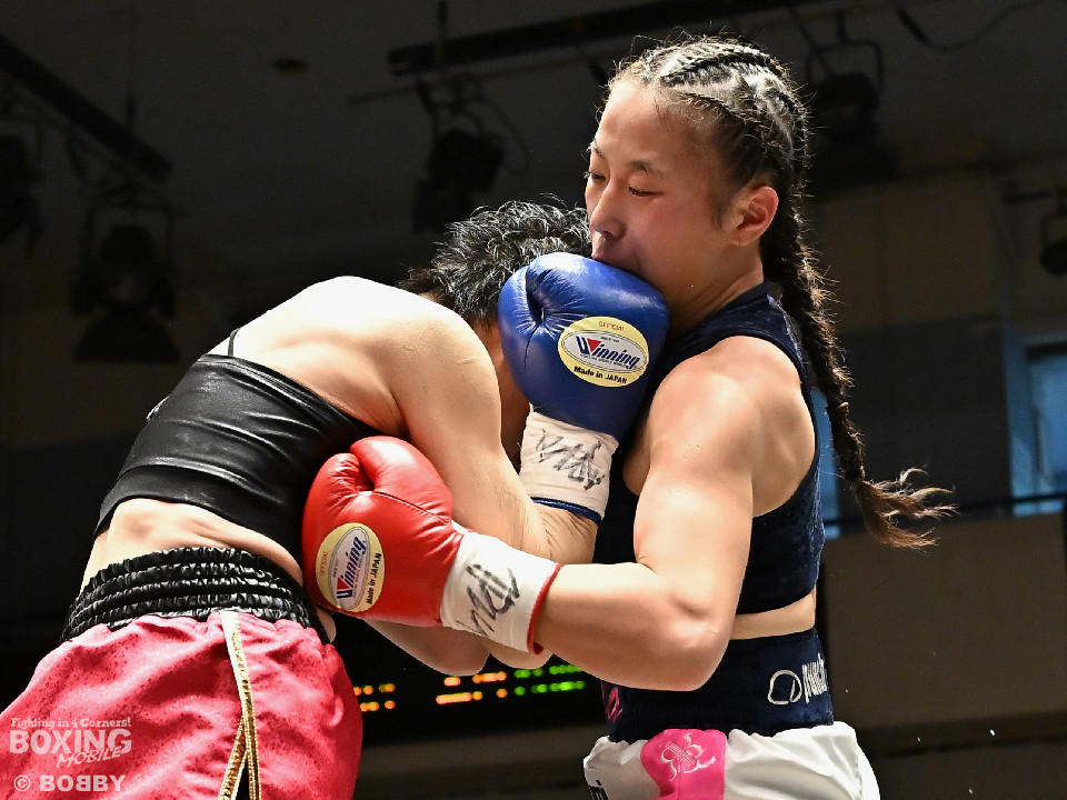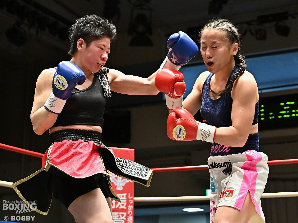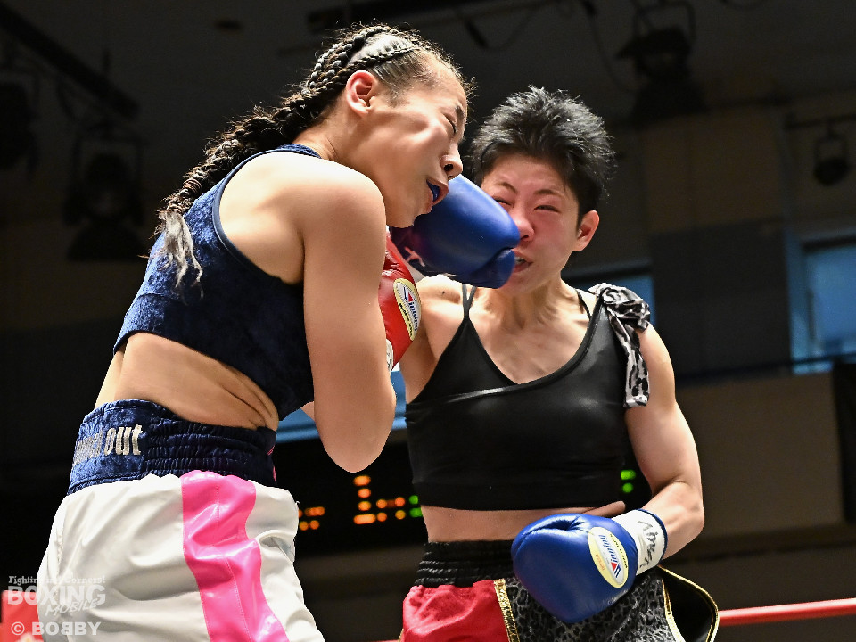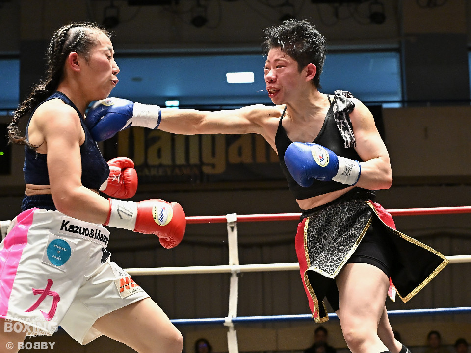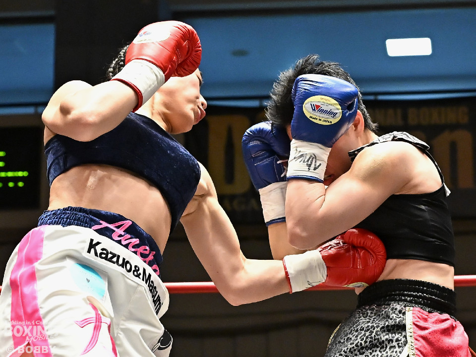 試合:日本女子フェザー級王者の大澤がランキング2位・西を迎え撃った。初回、大澤が左ボディから左フックにつなげるのに対し西は距離を詰めて強気の姿勢。2回、大澤は冷静な試合運びを見せるとワンツー、左ボディで見栄えの良さをアピール。3回、大澤は上下に打ち分けリズム感のある攻撃でペースを維持。西はヒッティングで右目上を腫らした。4回、大澤は左フックを合わせてダウンを先取。立ち上った西は回転力を活かした連打で反撃。ラウンド終了間際、偶然のバッティングで西は左前頭部をカット。インターバル中、ドクターチェックでレフェリーはこれ以上の試合続行を不能と判断。勝負は負傷判定へと持ち込まれた。大澤が日本王座初防衛に成功した。