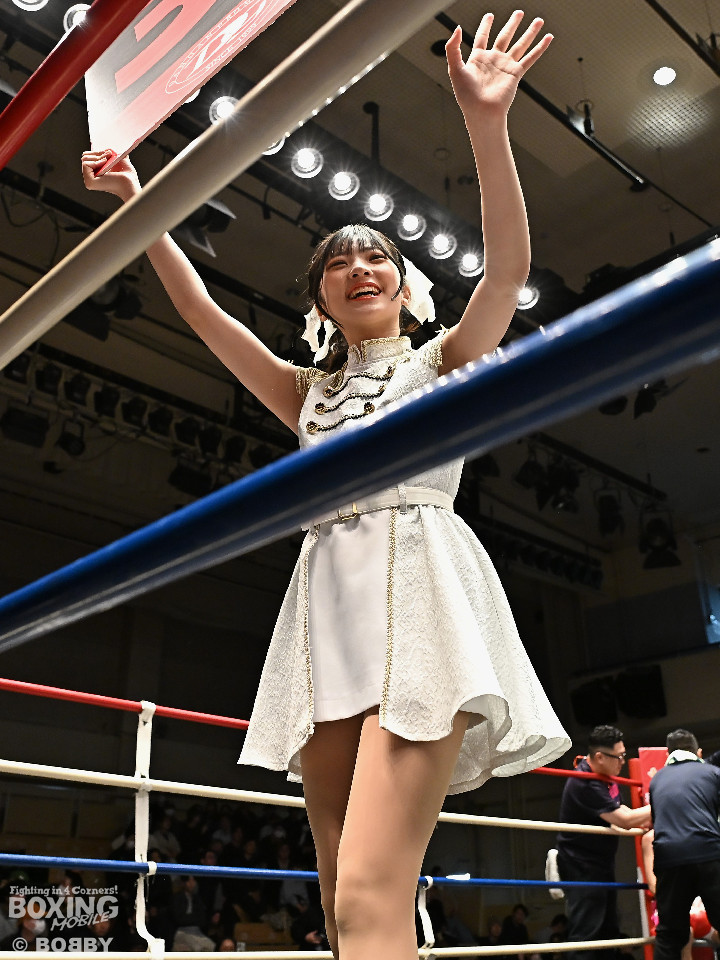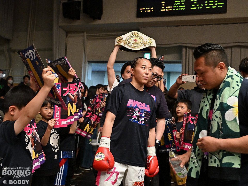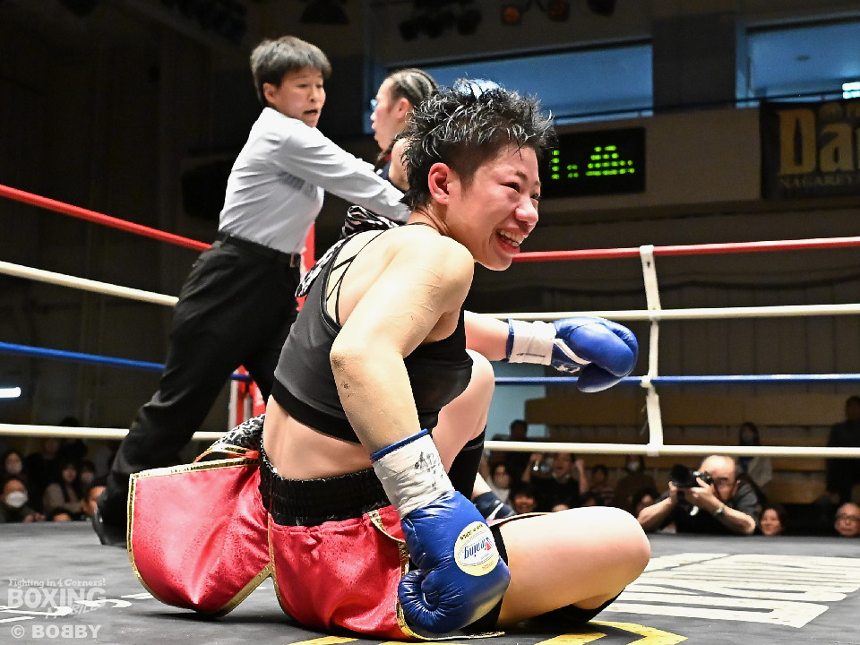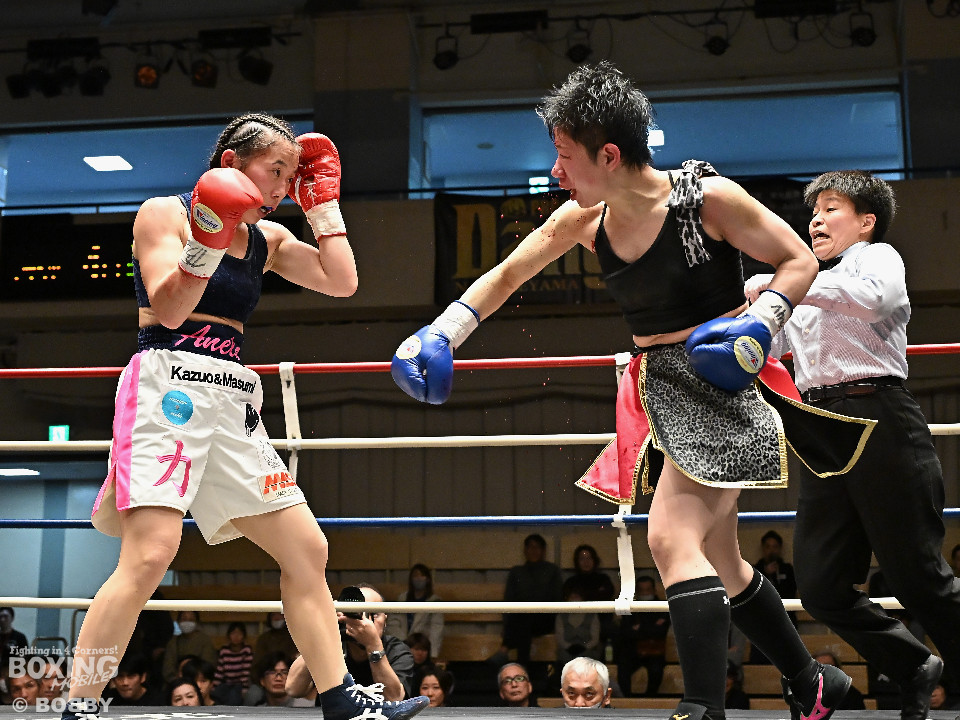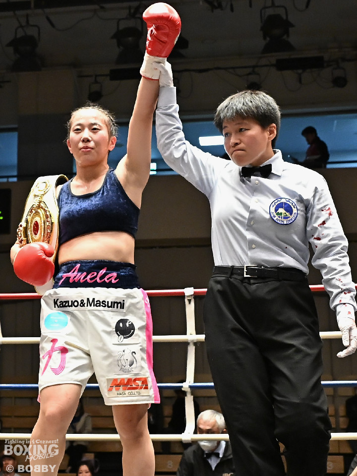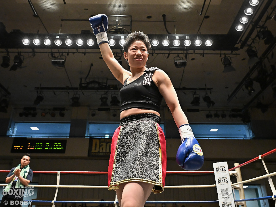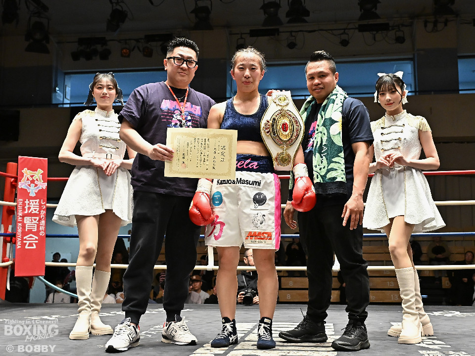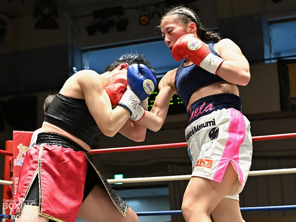 試合:日本女子フェザー級王者の大澤がランキング2位・西を迎え撃った。初回、大澤が左ボディから左フックにつなげるのに対し西は距離を詰めて強気の姿勢。2回、大澤は冷静な試合運びを見せるとワンツー、左ボディで見栄えの良さをアピール。3回、大澤は上下に打ち分けリズム感のある攻撃でペースを維持。西はヒッティングで右目上を腫らした。4回、大澤は左フックを合わせてダウンを先取。立ち上った西は回転力を活かした連打で反撃。ラウンド終了間際、偶然のバッティングで西は左前頭部をカット。インターバル中、ドクターチェックでレフェリーはこれ以上の試合続行を不能と判断。勝負は負傷判定へと持ち込まれた。大澤が日本王座初防衛に成功した。