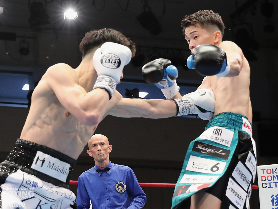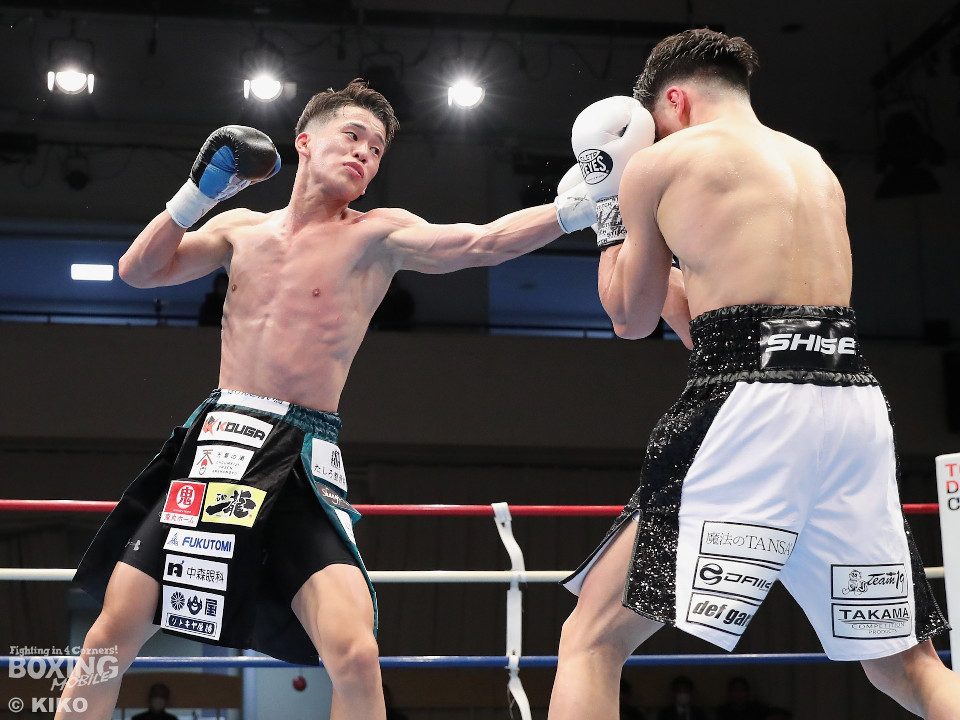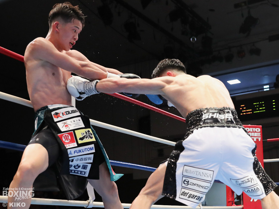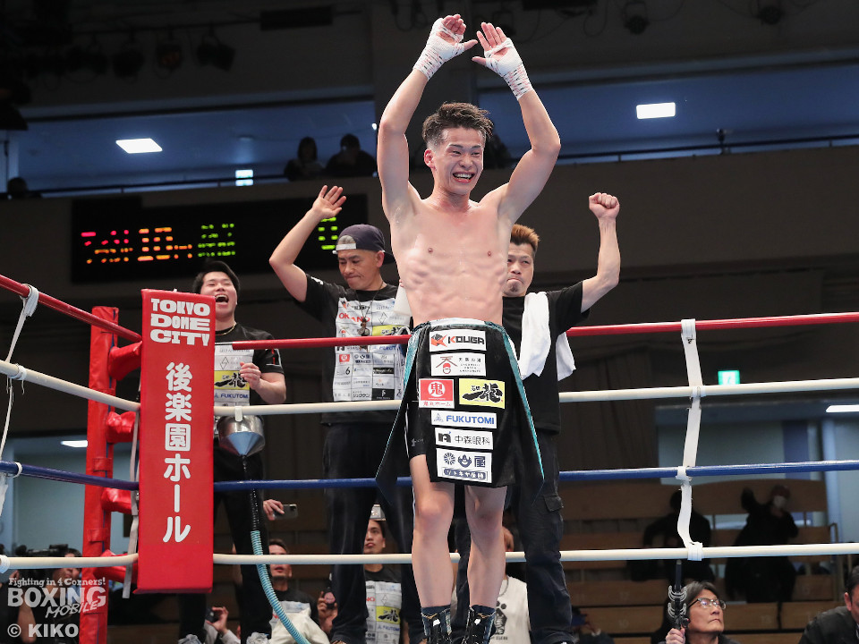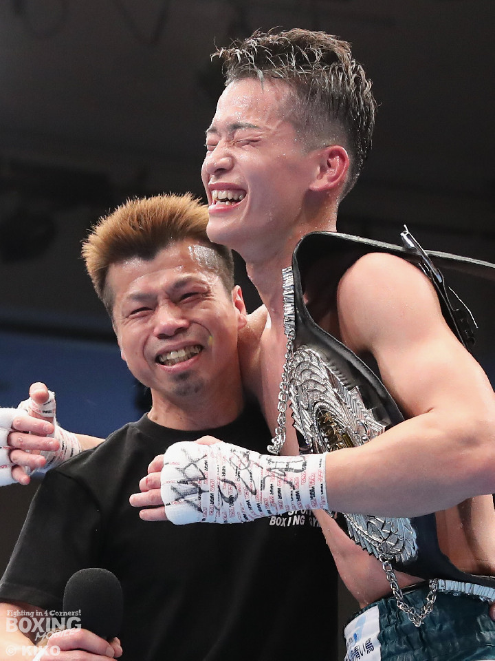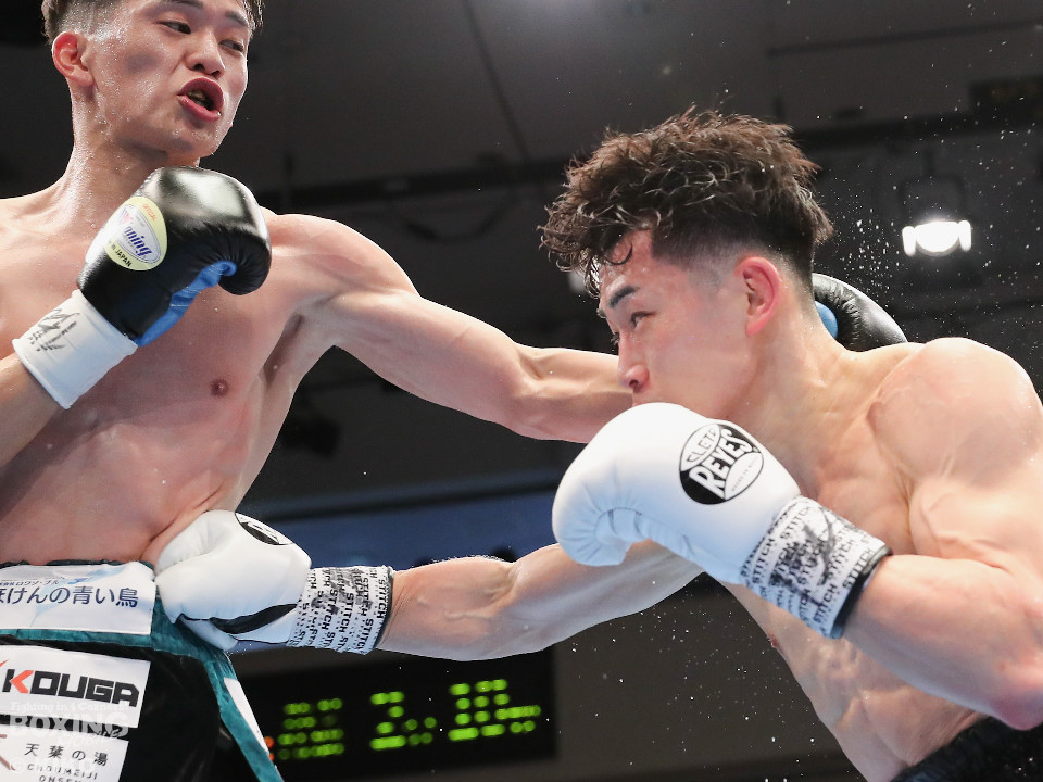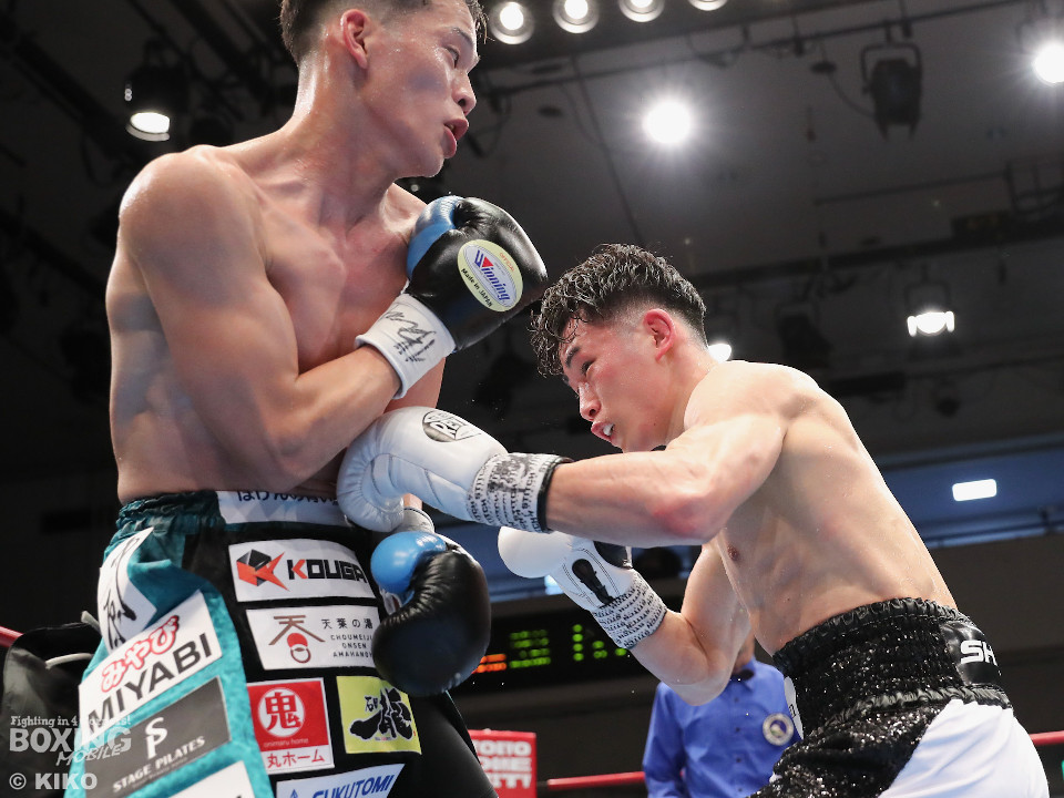 試合:空位の日本フェザー級王座を岡本と嶋田が争った。岡本が前の手で揺さぶりをタイミングを探るのに対し、嶋田は真っすぐな左で対抗。2回、岡本はジャブを上下に散らすと右オーバーハンドで脅かす。3回、岡本は右アッパーで腰を沈めさせると右オーバーハンドを好打。攻め急がずジャブから組み立てた。4回、嶋田は距離を詰めて右ボディストレートから切り込むが、岡本は足を使いながら的を絞らせず。5回も岡本はシャープなジャブから左フックにつなげて見栄えの良さをアピール。前半終了時の公開採点は49-46×2、50-45×1で岡本がリード。6回、嶋田はプレスを強めてワンツーを繰り出し反撃。しかし、岡本は慌てる素振りを見せずジャブをヒット。続く回も岡本のラウンド。サークリングしながら折々でワンツーを好打しポイントを加点。8回、嶋田はプレスをかけてワンツーを好打。この試合に懸ける思いを見せた。9回、岡本は距離が詰まるとクリンチで遮断。ジャブを軸にアウトボクシングを遂行。10回、嶋田は右フックをねじ込み逆転を狙うが、相手の足を止めるまでには至らず。岡本のジャブが冴えわたった。この日、誕生日を迎えた岡本が新チャンピオンに輝いた。
