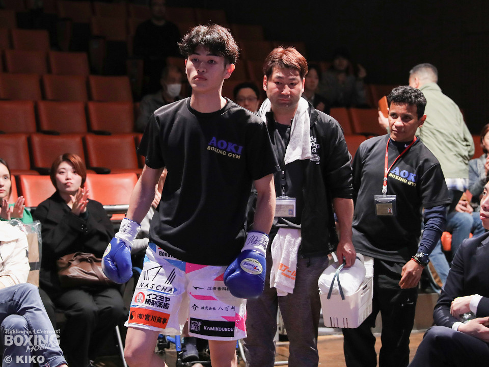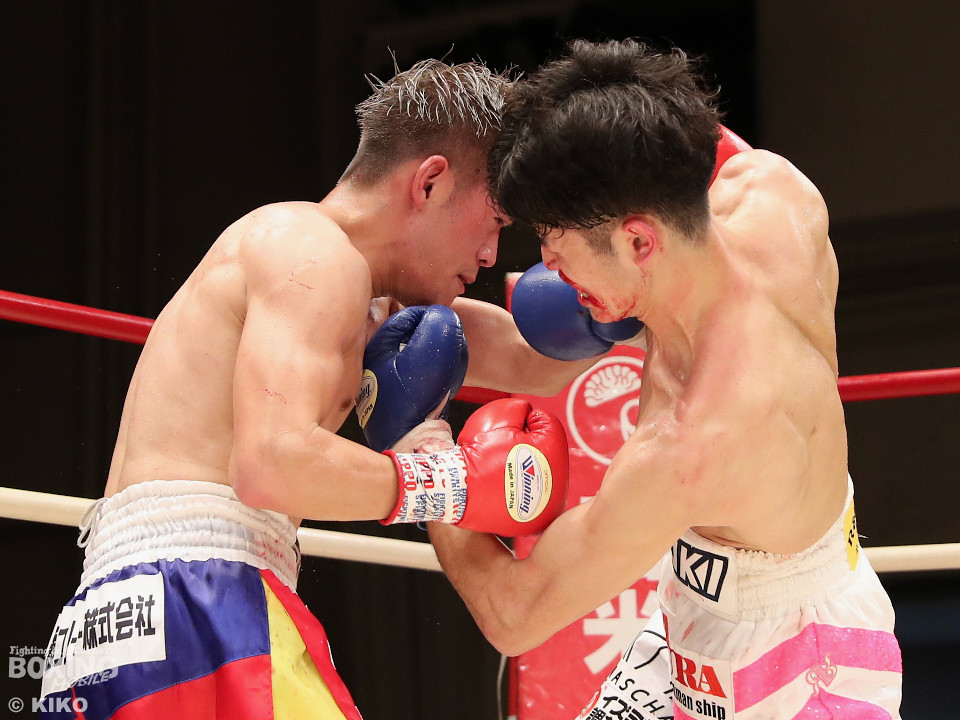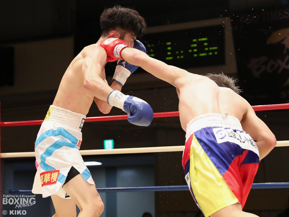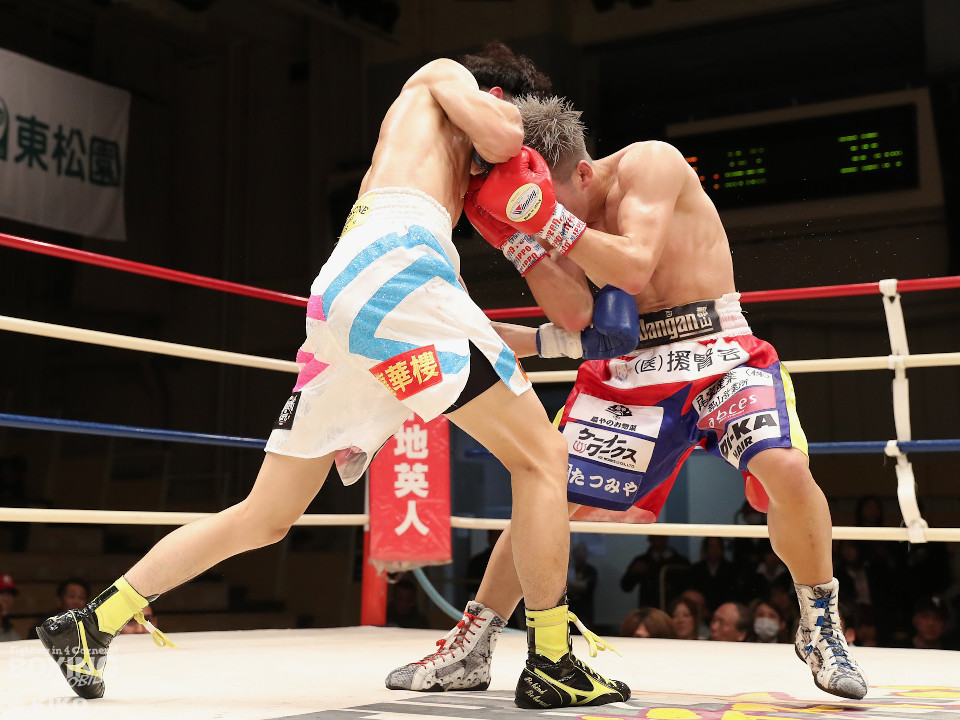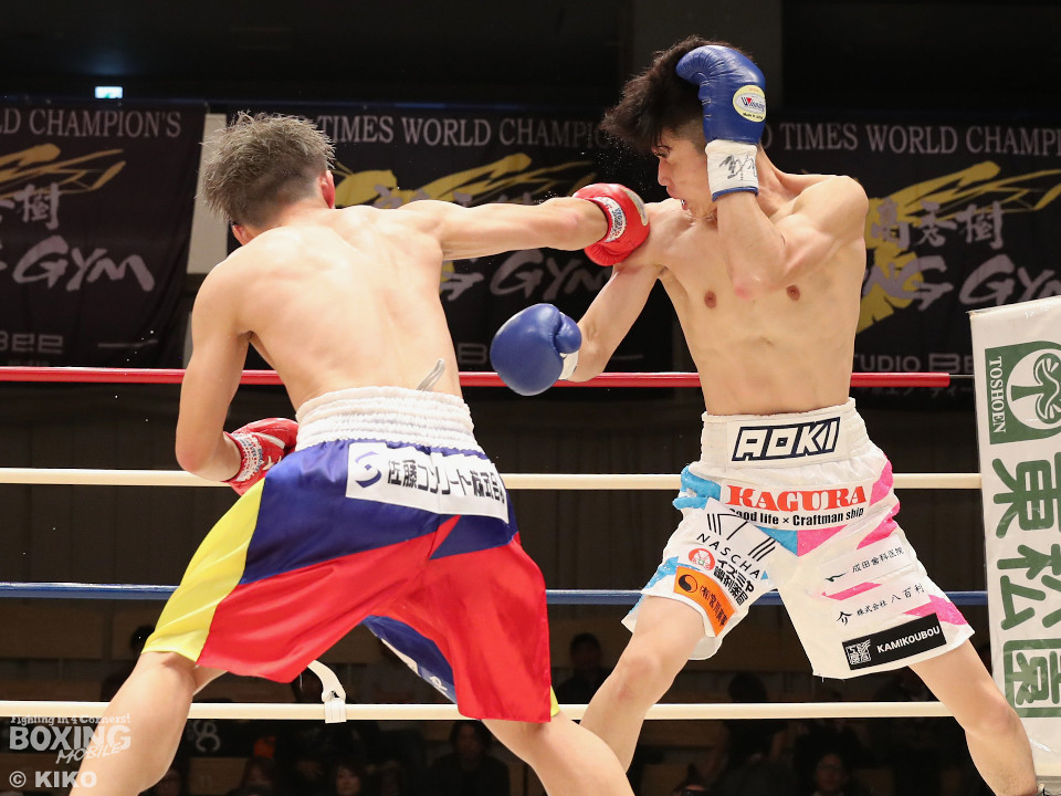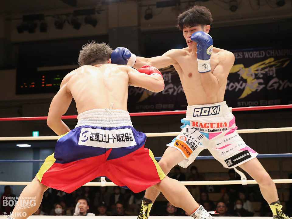 試合:サウスポー同士による一戦は、岡本が左回りを意識しながらジャブを飛ばしてリズムを作る。対する蛯名はプレスをかけて射程圏内に入ると左フックをブンと振り回して対抗! 2回、距離を詰めた蛯名だが相手のジャブが邪魔なのか左ストレートを決めきれず。3回、岡本はサークリングしながらシャープなジャブを軸にコントロール。4回、蛯名はプレスを強めて左オーバーハンドで鼻血を流させると、積極的な攻撃を繰り出した。ジャッジに委ねられた採点は引き分け。新人王トーナメント特別ルールにより、優勢点を勝ち取った蛯名が次戦にコマを進めた。
