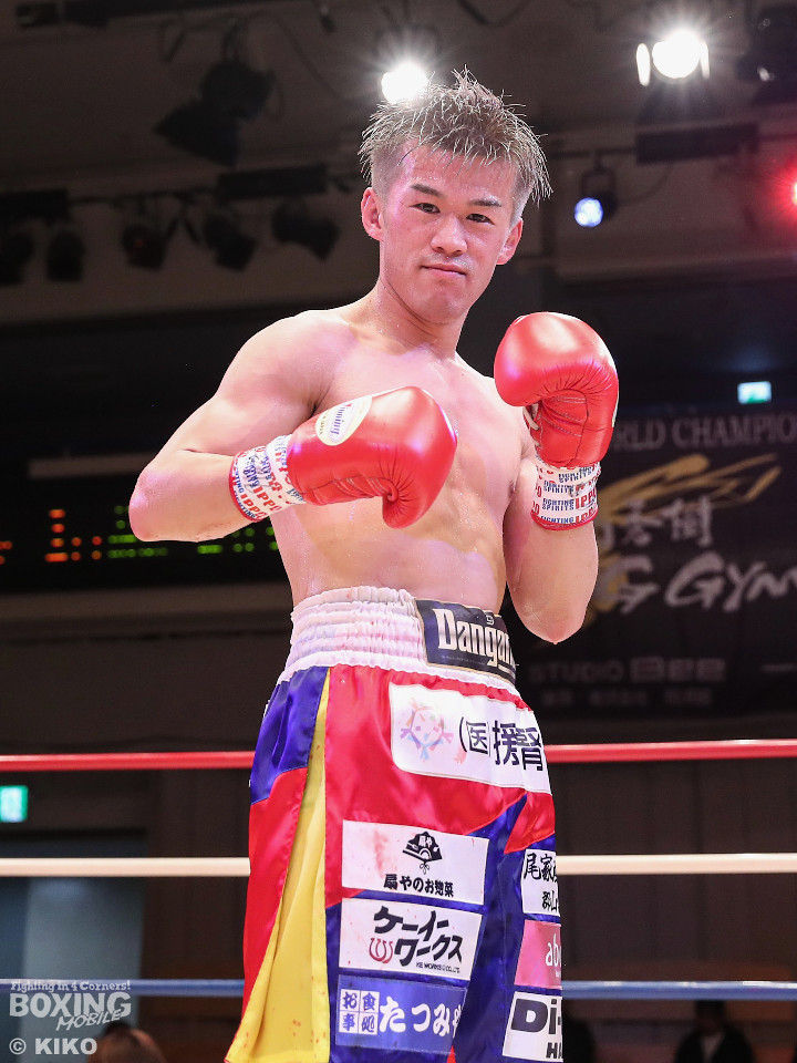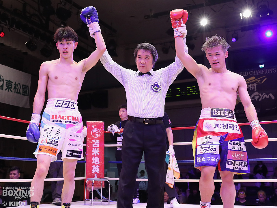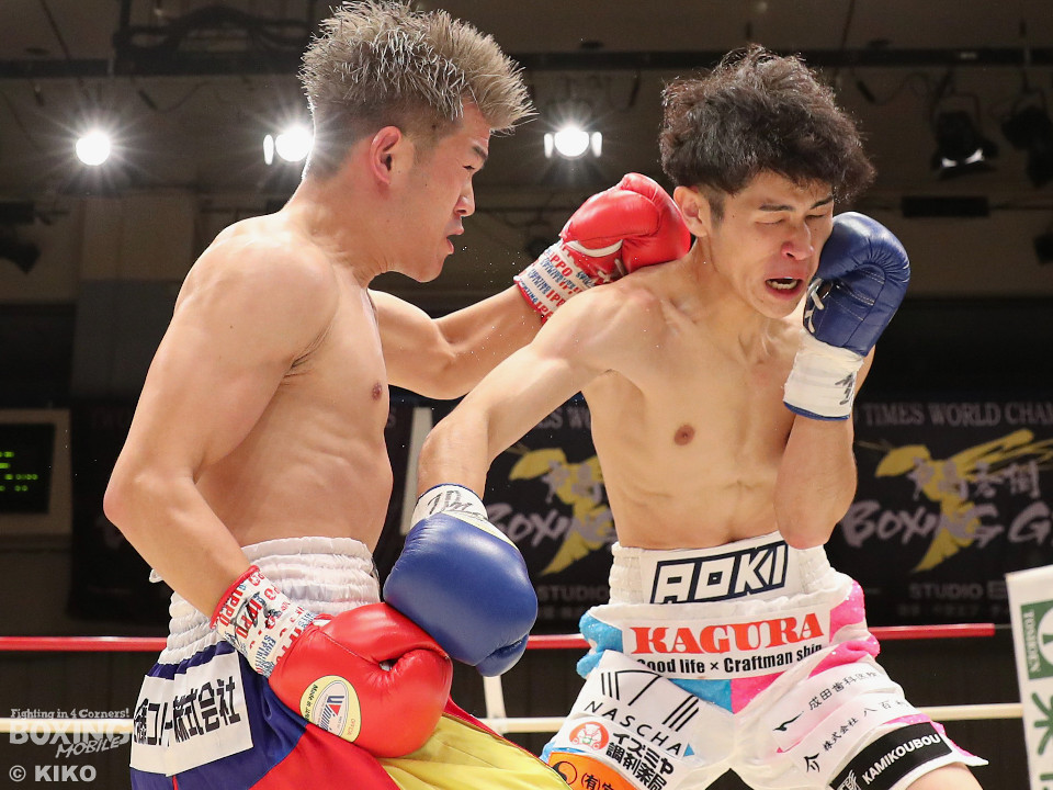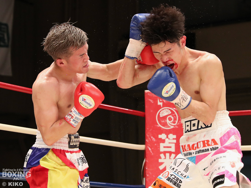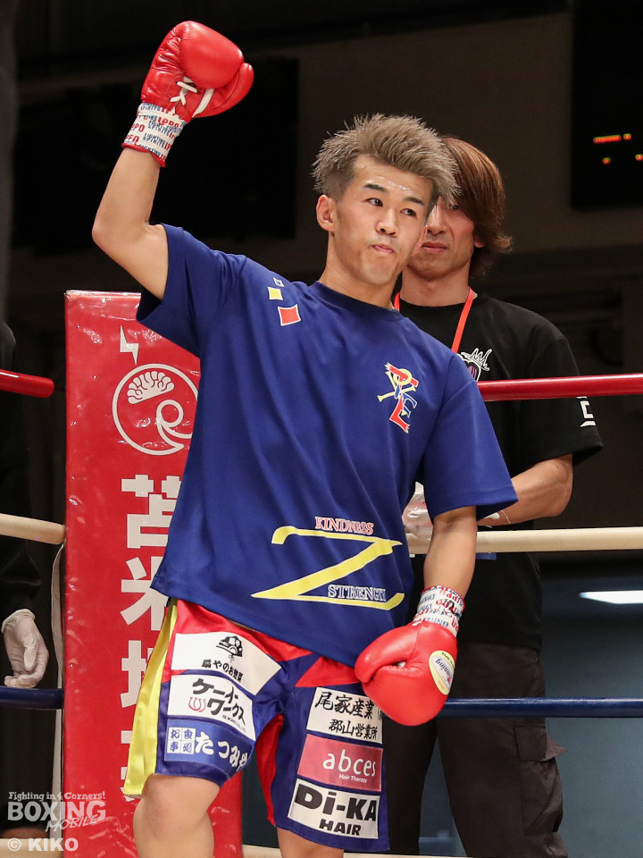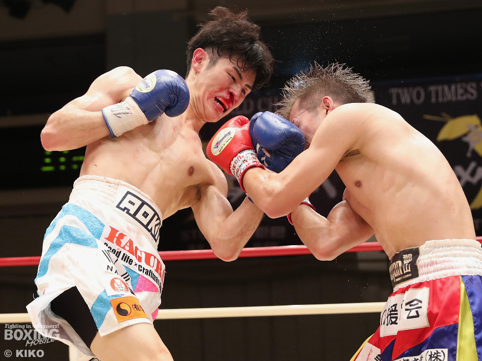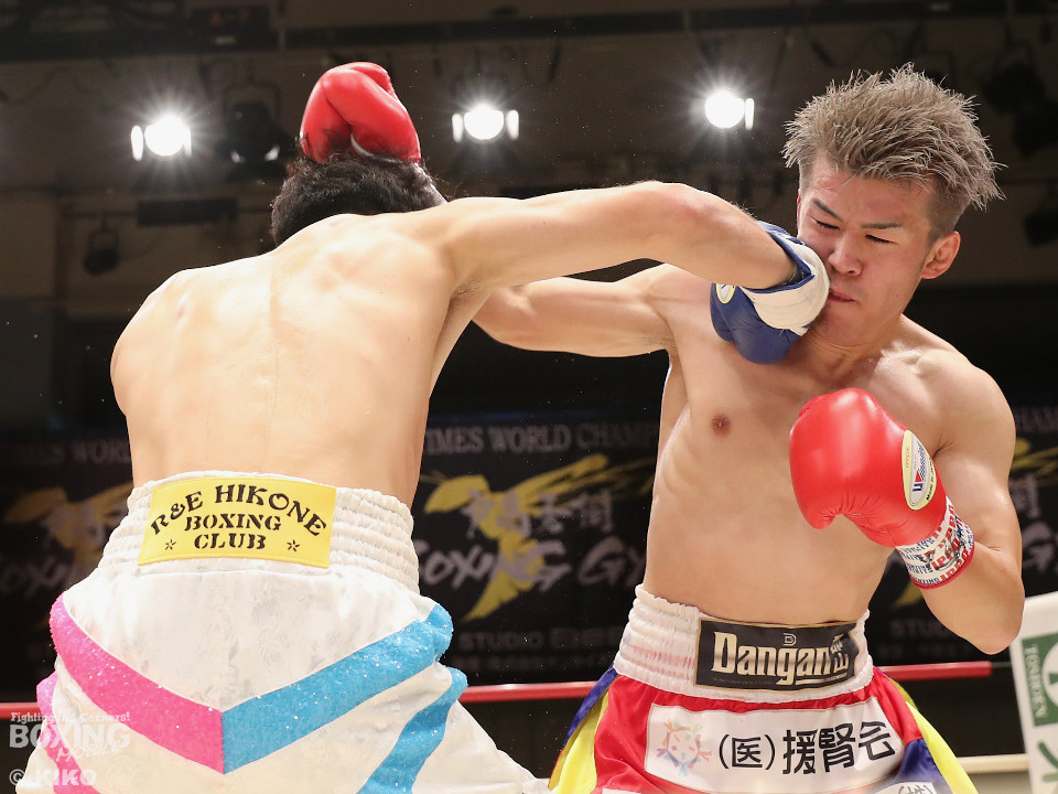試合:サウスポー同士による一戦は、岡本が左回りを意識しながらジャブを飛ばしてリズムを作る。対する蛯名はプレスをかけて射程圏内に入ると左フックをブンと振り回して対抗! 2回、距離を詰めた蛯名だが相手のジャブが邪魔なのか左ストレートを決めきれず。3回、岡本はサークリングしながらシャープなジャブを軸にコントロール。4回、蛯名はプレスを強めて左オーバーハンドで鼻血を流させると、積極的な攻撃を繰り出した。ジャッジに委ねられた採点は引き分け。新人王トーナメント特別ルールにより、優勢点を勝ち取った蛯名が次戦にコマを進めた。