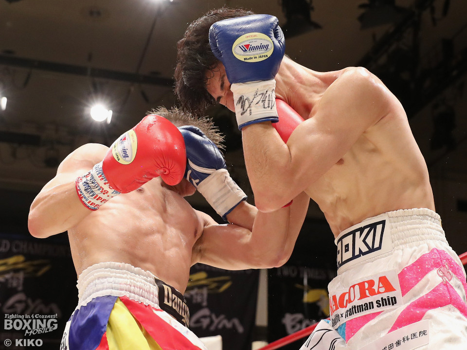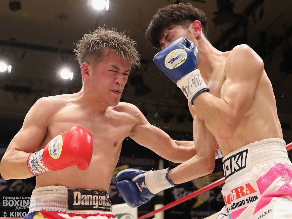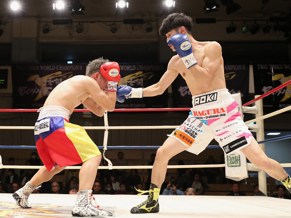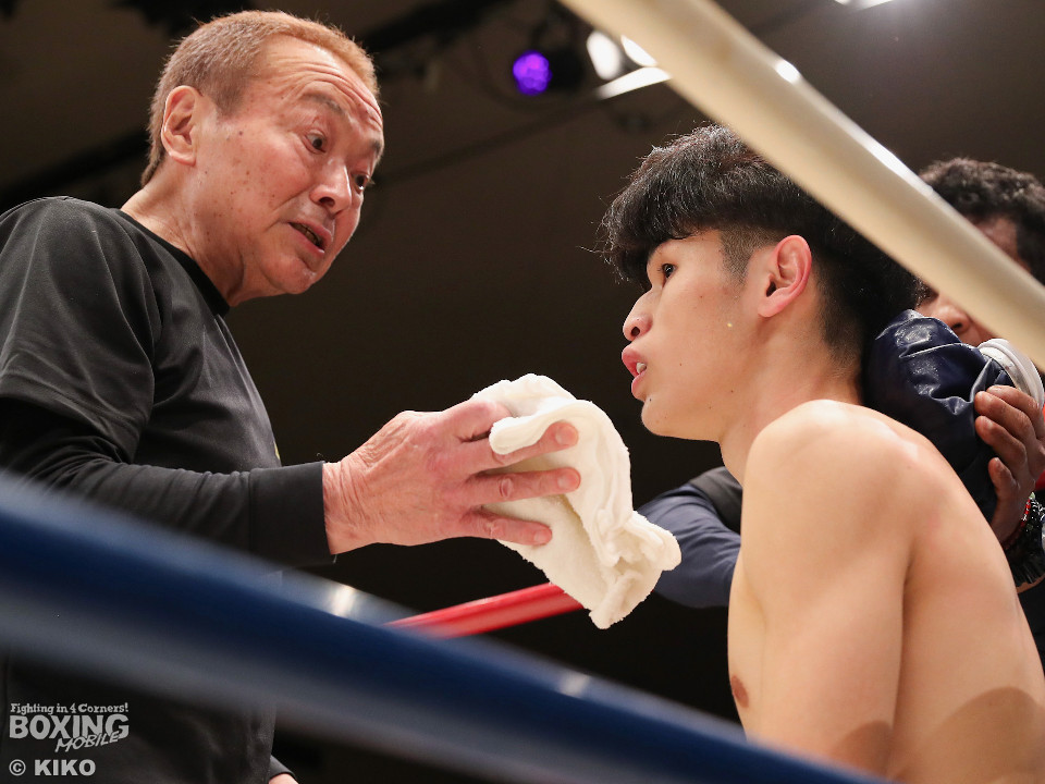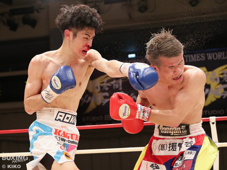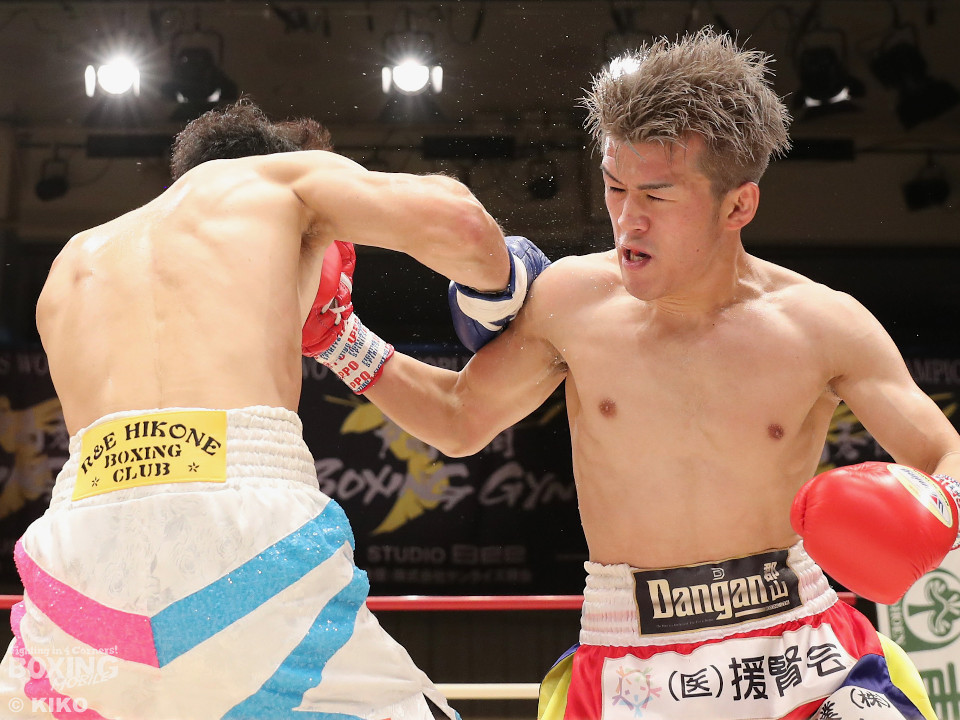 試合:サウスポー同士による一戦は、岡本が左回りを意識しながらジャブを飛ばしてリズムを作る。対する蛯名はプレスをかけて射程圏内に入ると左フックをブンと振り回して対抗! 2回、距離を詰めた蛯名だが相手のジャブが邪魔なのか左ストレートを決めきれず。3回、岡本はサークリングしながらシャープなジャブを軸にコントロール。4回、蛯名はプレスを強めて左オーバーハンドで鼻血を流させると、積極的な攻撃を繰り出した。ジャッジに委ねられた採点は引き分け。新人王トーナメント特別ルールにより、優勢点を勝ち取った蛯名が次戦にコマを進めた。