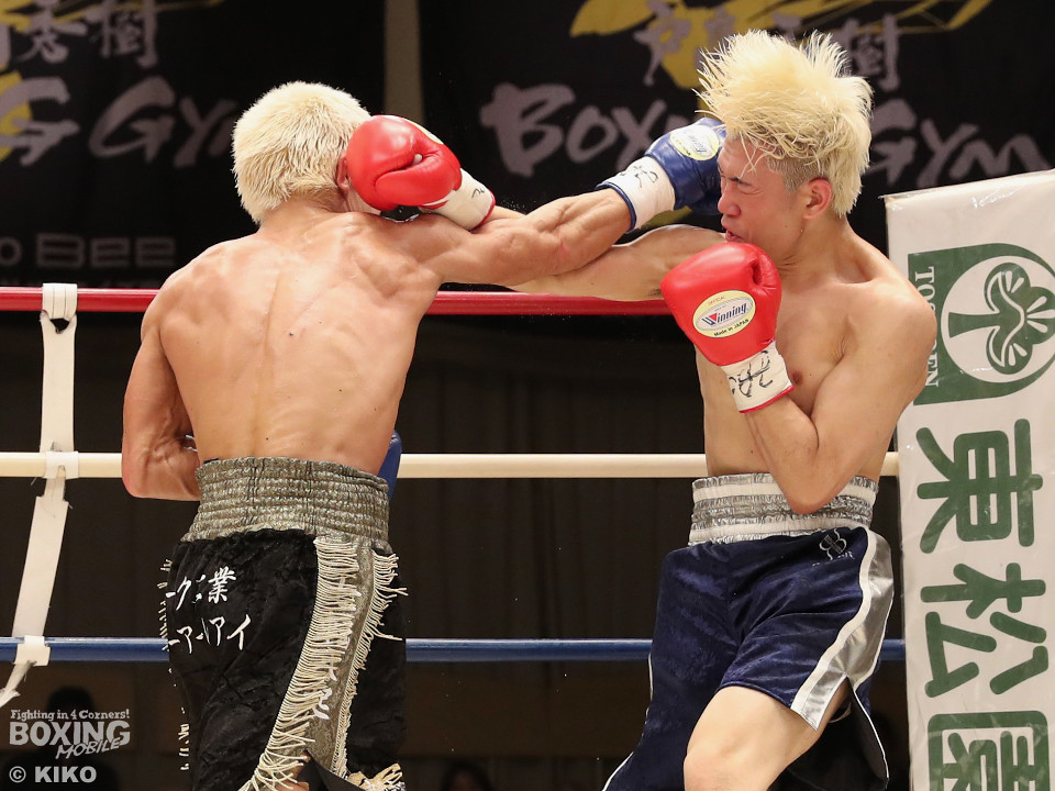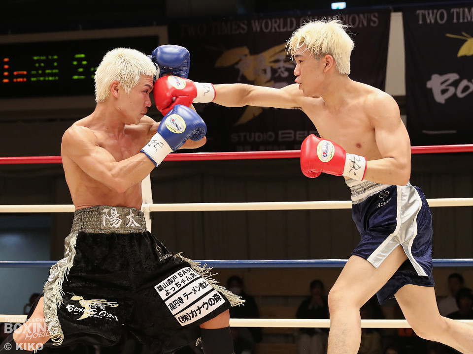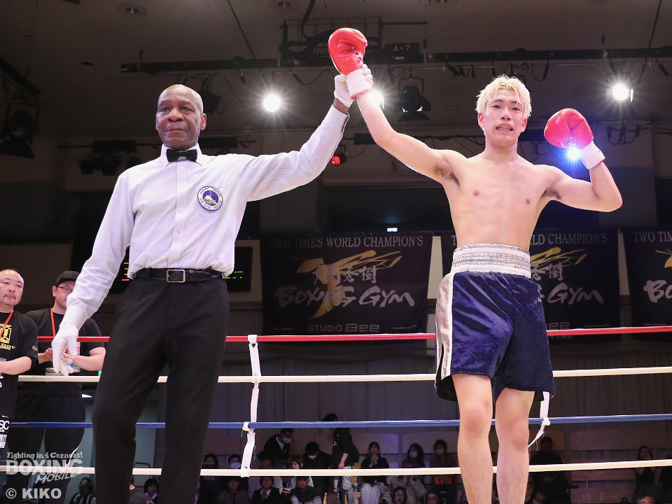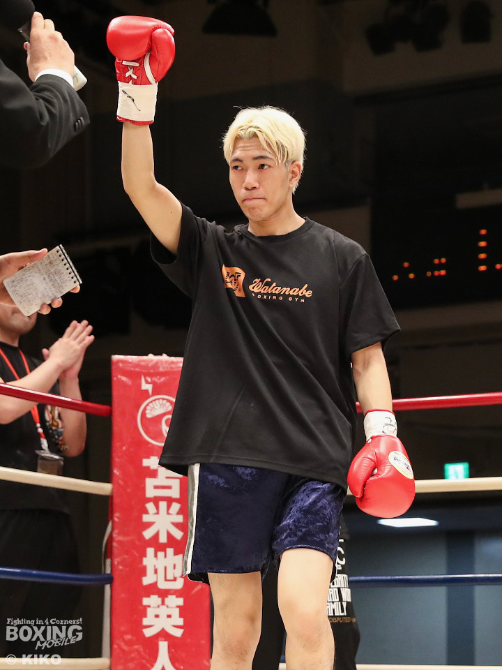試合:渡邉が足を使いながらジャブを飛ばして距離をキープ。2回、三原はプレスを強めて右フックで顔を弾くと積極的な攻撃。3回、三原は右ショートでガクッと腰を沈めさせると、アグレッシブな姿勢。渡邉は要所で右ストレートを返した。4回、渡邉は右カウンターで左目下を切り裂くとレフェリーはドクターチェックを要請。ザックリと切れており、これ以上の試合続行を不能としたレフェリーがストップ。渡邉が連敗脱出に成功した。