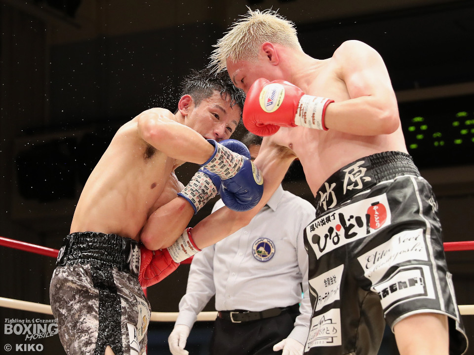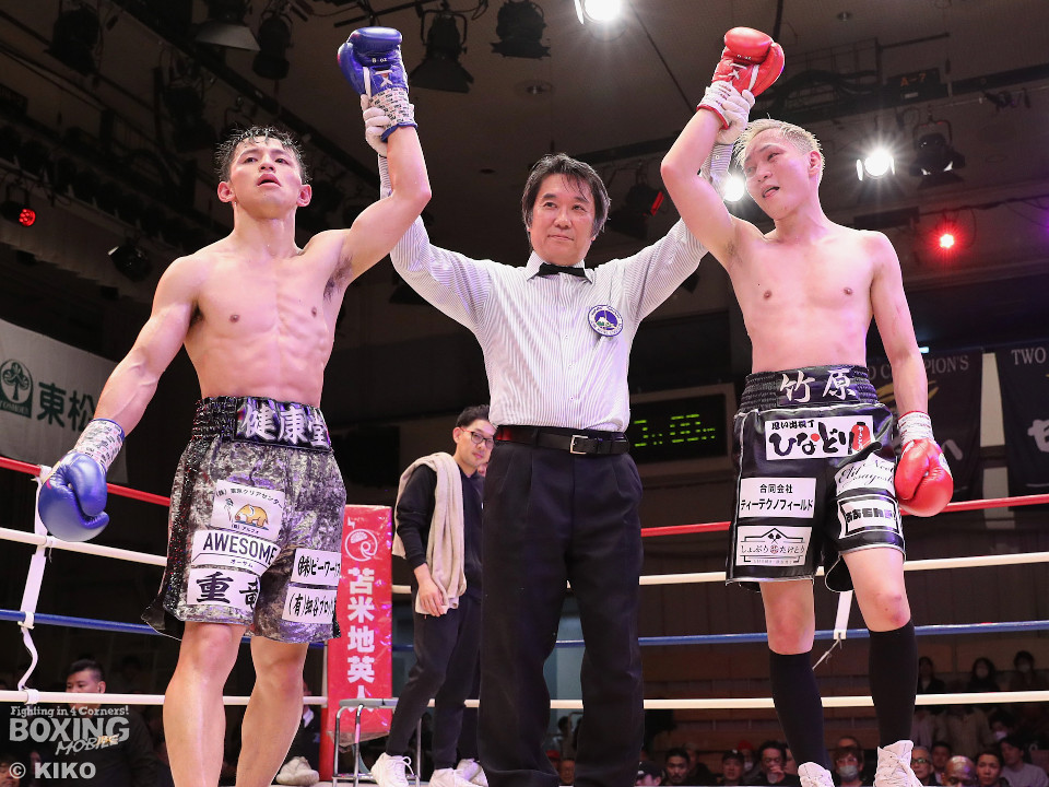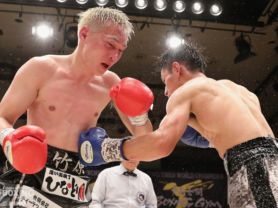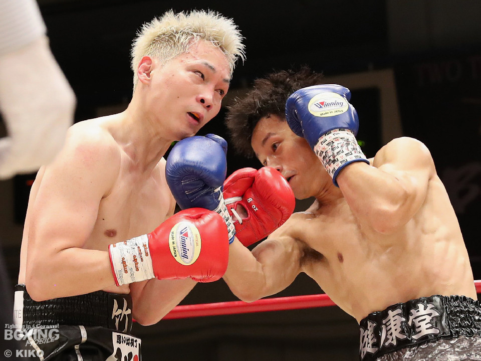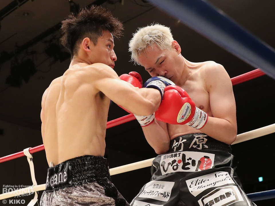 試合:サウスポー対決は、森が上下に揺さぶりをかけながら右フックを好打。バランスを崩した竹原に対し、ジワリジワリと攻め立てた。2回、森は左オーバーハンド、右アッパーを決めて攻勢。守勢を強いられた竹原は3回、右ボディから手数を増やして反撃。4回、森は上下に打ち分けると、サイドに回り込み見栄えの良さをアピール。5回、竹原は距離を潰して細かくまとめるが、森は機動力を活かしたボクシングを展開。6回、竹原の右ボディが効果を発揮してくる。しつこく前進しながらコツコツと当てた。7回、竹原は押し込みながらなりふり構わず右ボディ、右フックをヒット。森はクリンチで流れを切った。8回、森はサークリングしながらジャブを軸に組み立てるとワンツー、右ボディで攻勢を印象付けた。ジャッジに委ねられた採点は三者三様の引きわけで決着がつかなかった。