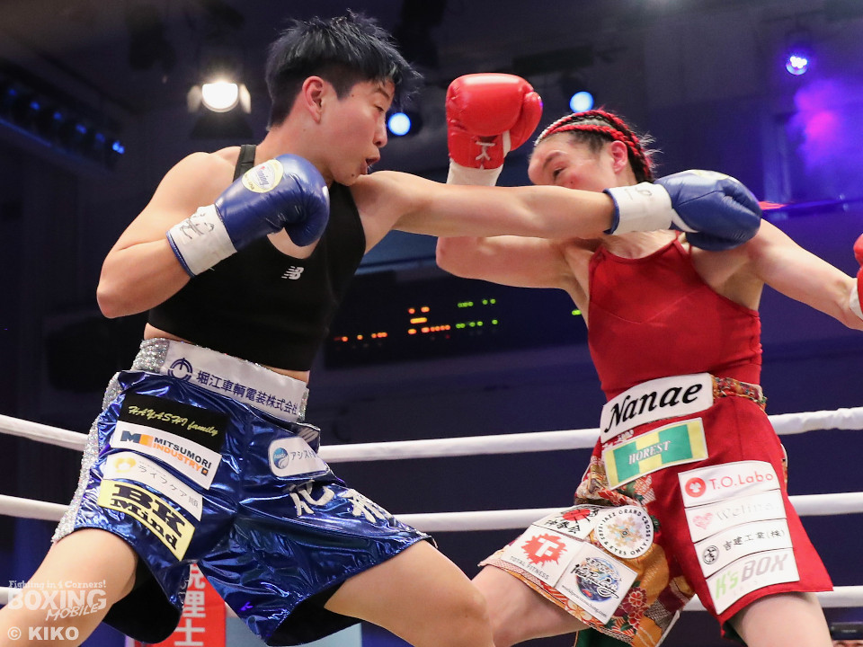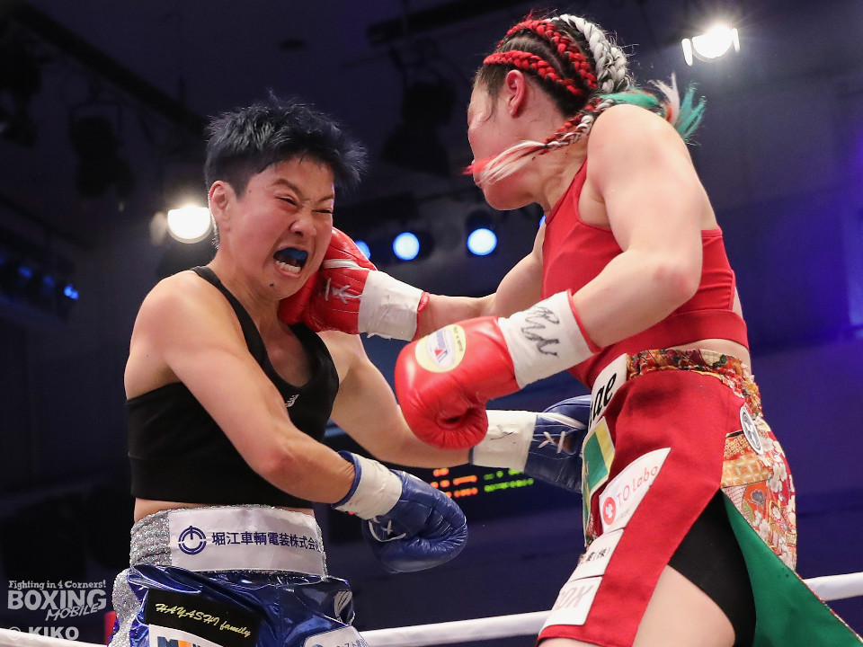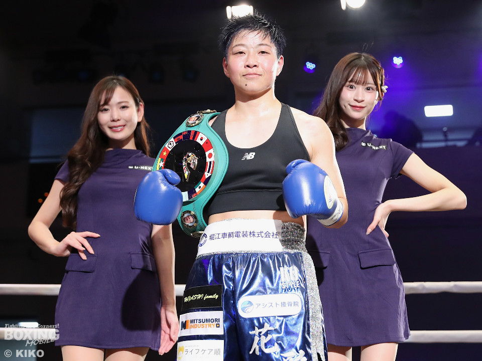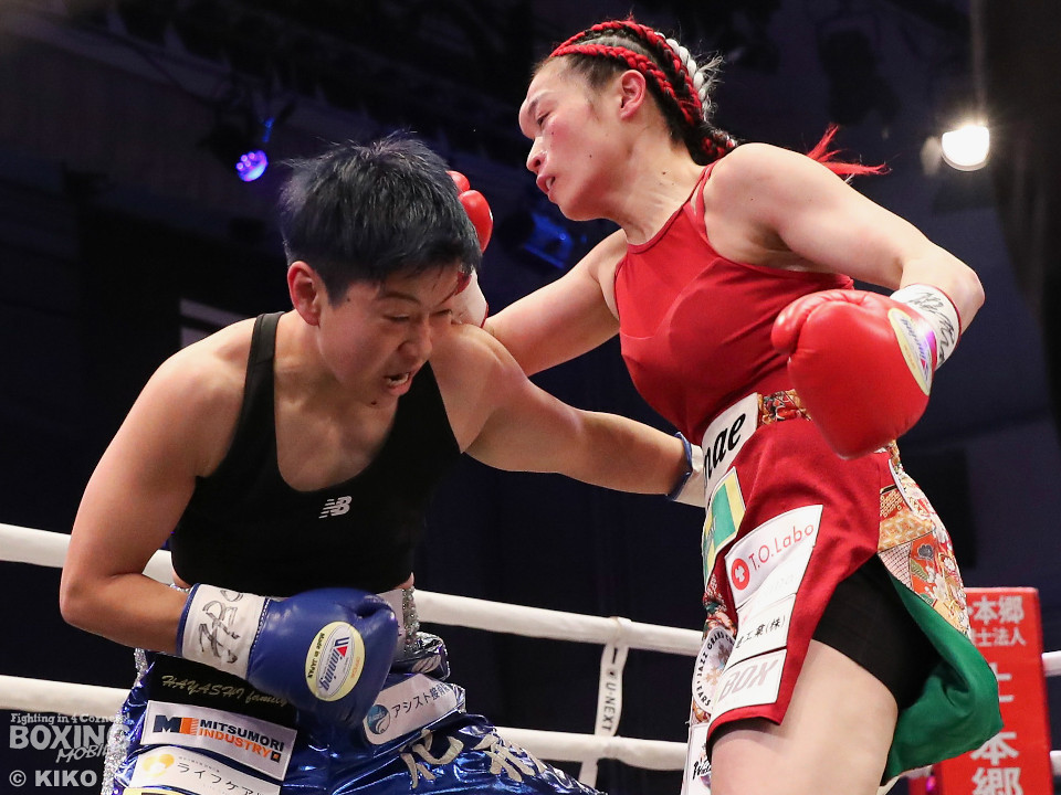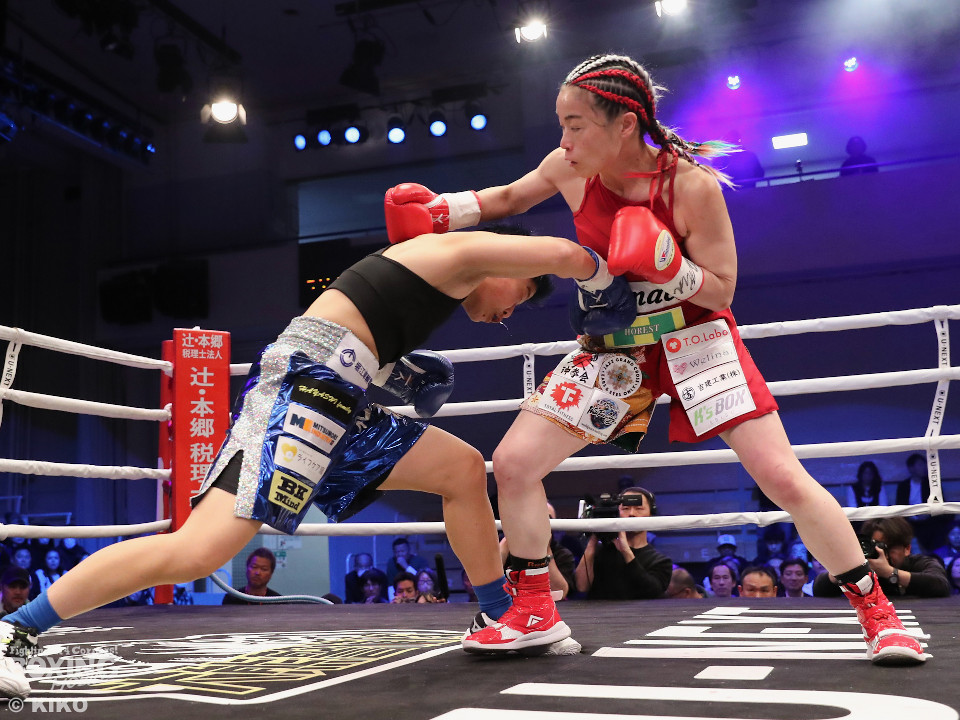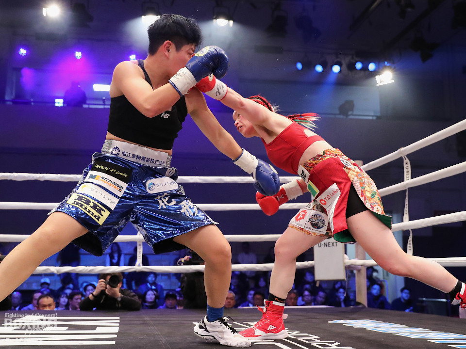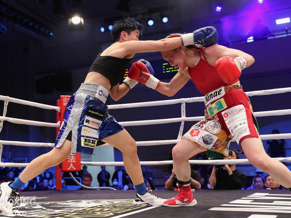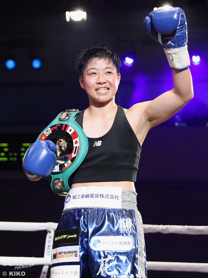 試合:空位のOPBF東洋太平洋女子フライ級王座をかけて、日本王者の山家とOPBF4位の柳尾が1年3ヶ月ぶりに拳を交えた。柳尾がステップインから左右フックで先制攻撃。サウスポー山家は頭がぶつかり前頭部を腫らした。2回、山家は左から切り込むが、打ち終わりを狙われ思い通りの展開を作れず。3回、山家はジリジリと距離を詰めてワンツーを繰り出すが、柳尾は足を使いながら決定打を回避。4回、柳尾は右アッパーで顔を弾くと距離を意識したボクシングを展開。前半終了時の公開採点は、40-36×3で柳尾がリード。5回、柳尾は右ボディストレートを突き刺すと機動力を活かしてポイントを加点。6回も柳尾のラウンド。ワンツーで顔を弾くとパンチをまとめた。8回、逆転を狙う山家は手数を増やすが、柳尾は気持ちで引かず打ち合った。試合終了のゴングが鳴ると勝利を確信した柳尾は雄たけびをあげた。リベンジを果たした柳尾が新王者に輝いた。