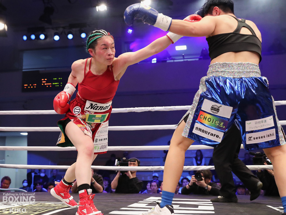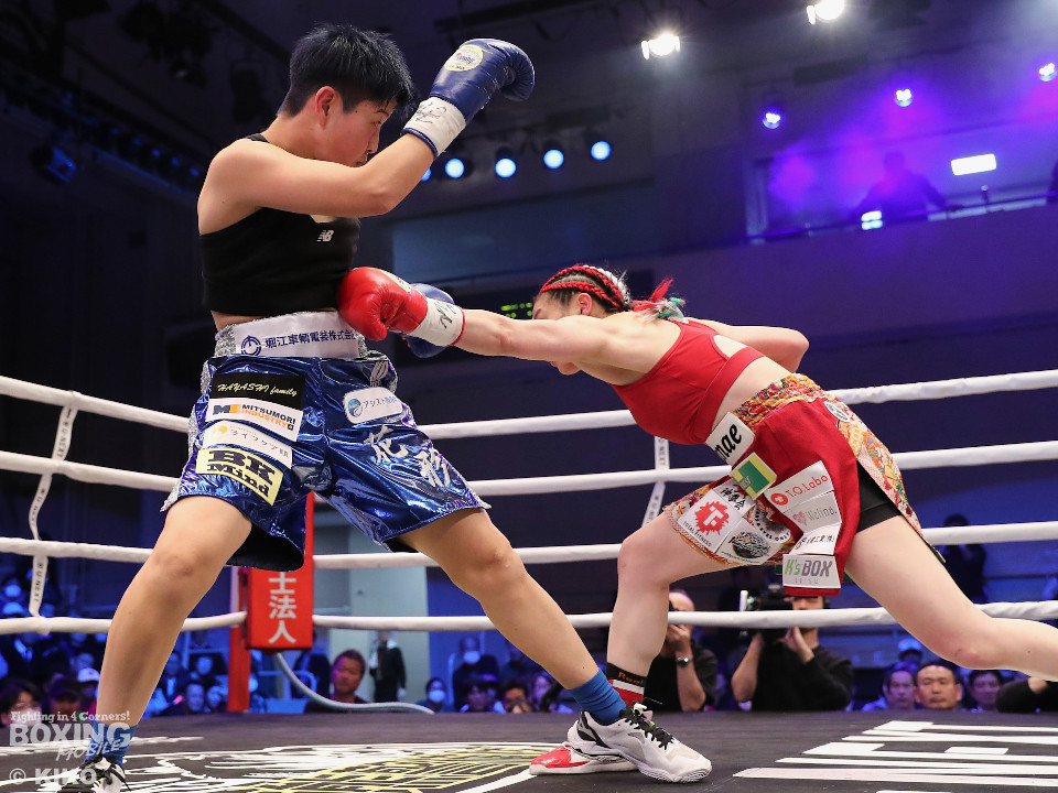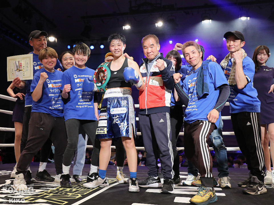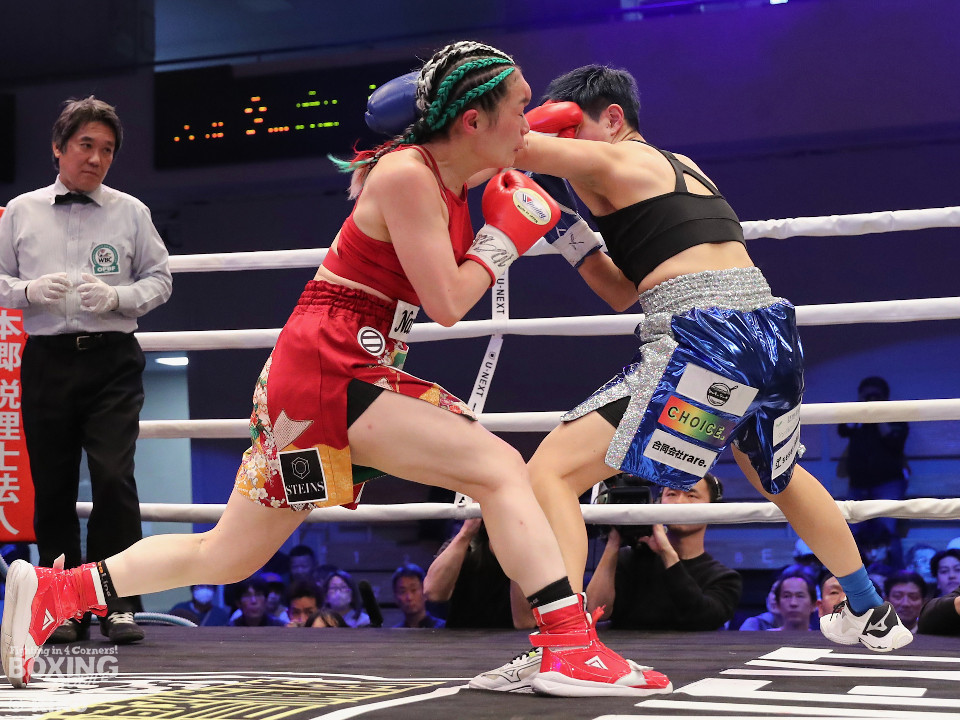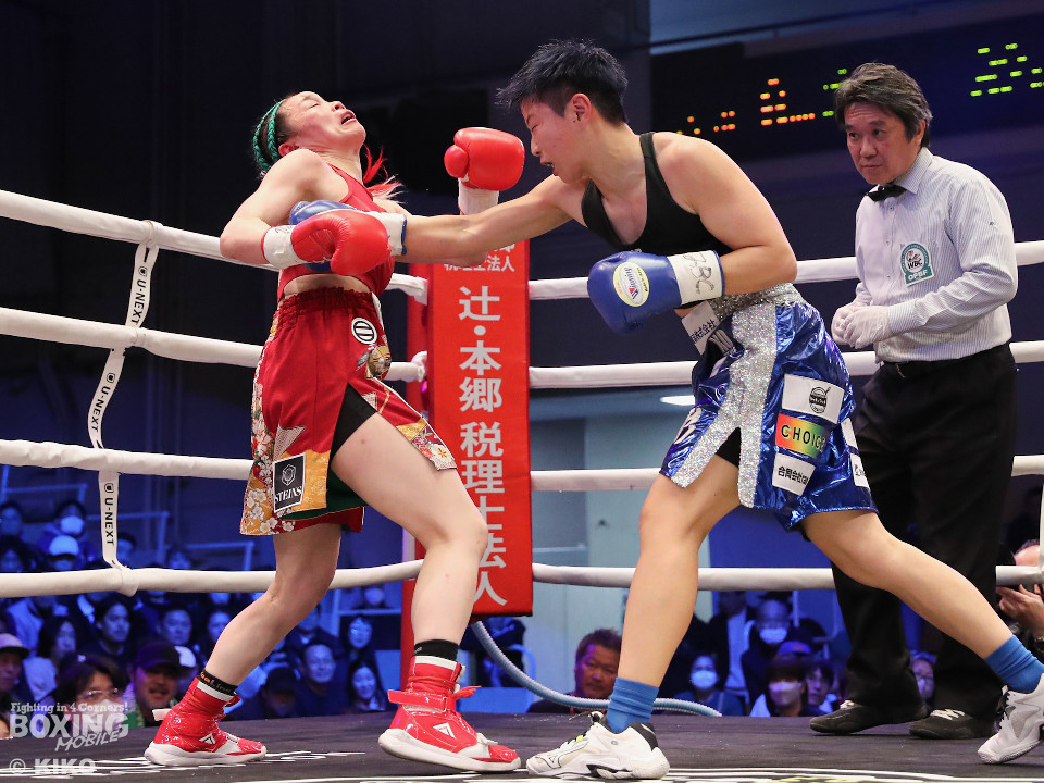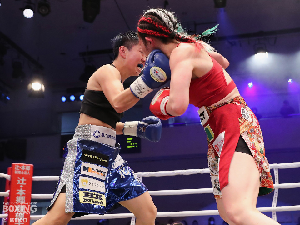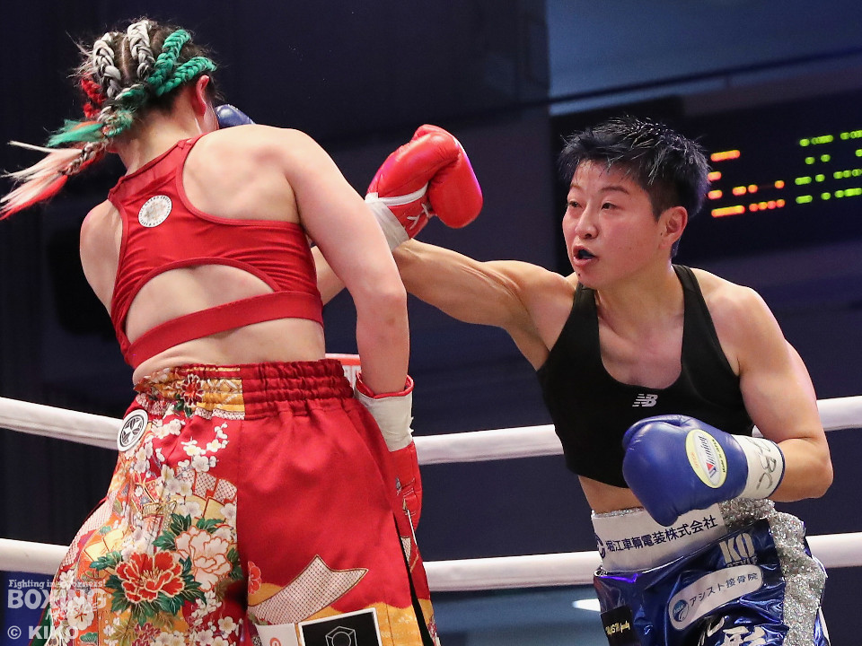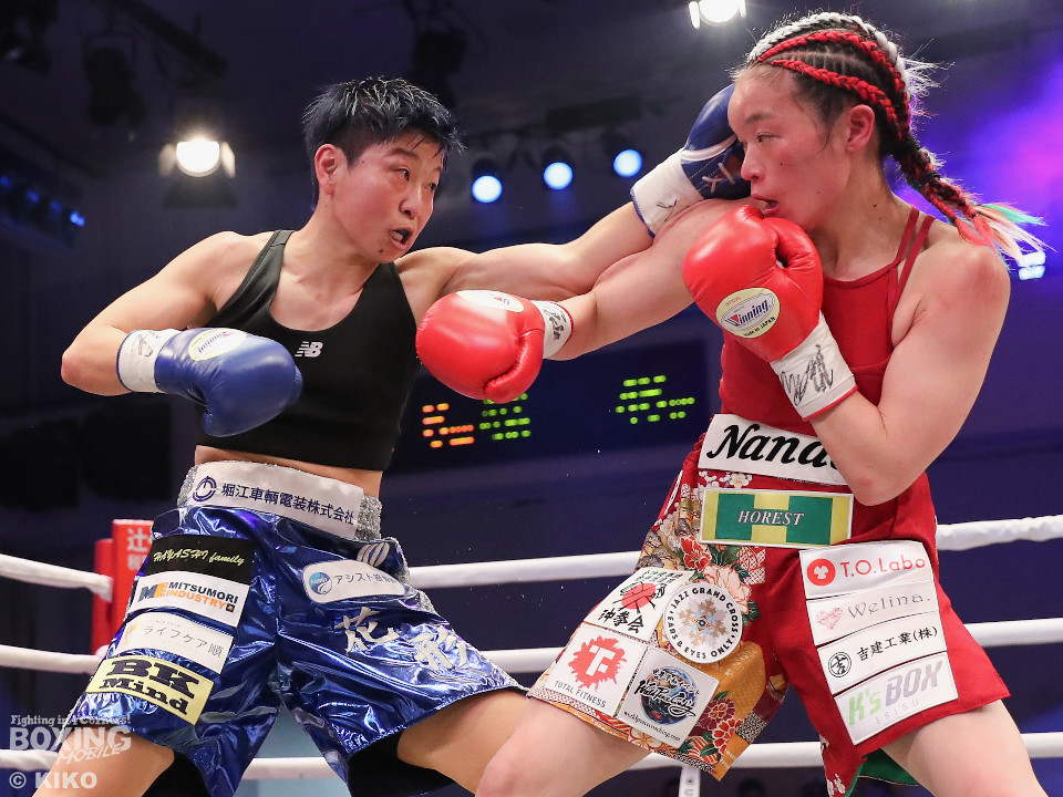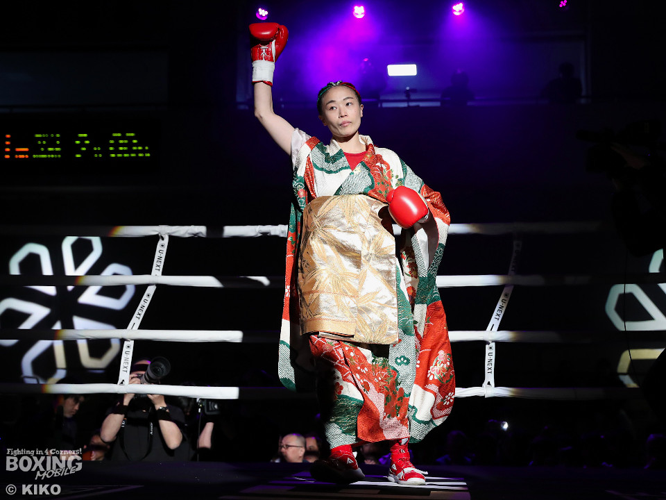 試合:空位のOPBF東洋太平洋女子フライ級王座をかけて、日本王者の山家とOPBF4位の柳尾が1年3ヶ月ぶりに拳を交えた。柳尾がステップインから左右フックで先制攻撃。サウスポー山家は頭がぶつかり前頭部を腫らした。2回、山家は左から切り込むが、打ち終わりを狙われ思い通りの展開を作れず。3回、山家はジリジリと距離を詰めてワンツーを繰り出すが、柳尾は足を使いながら決定打を回避。4回、柳尾は右アッパーで顔を弾くと距離を意識したボクシングを展開。前半終了時の公開採点は、40-36×3で柳尾がリード。5回、柳尾は右ボディストレートを突き刺すと機動力を活かしてポイントを加点。6回も柳尾のラウンド。ワンツーで顔を弾くとパンチをまとめた。8回、逆転を狙う山家は手数を増やすが、柳尾は気持ちで引かず打ち合った。試合終了のゴングが鳴ると勝利を確信した柳尾は雄たけびをあげた。リベンジを果たした柳尾が新王者に輝いた。